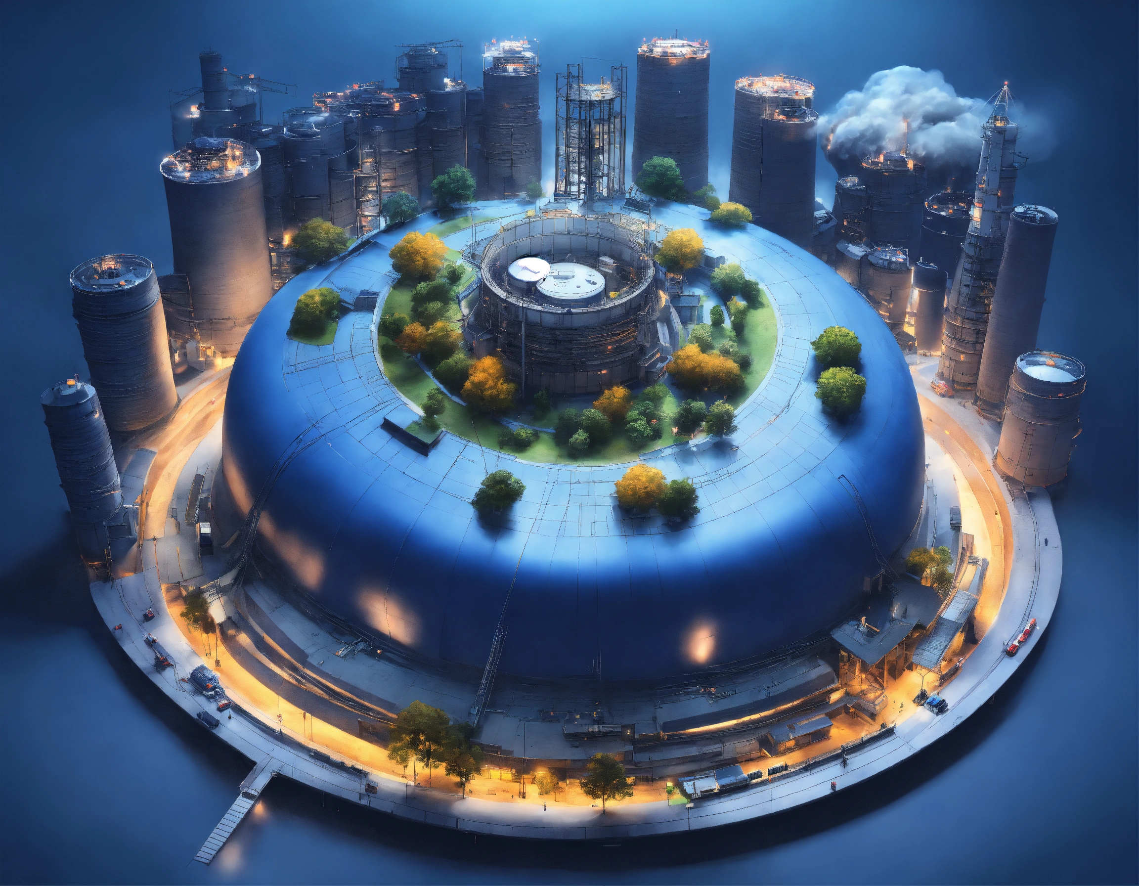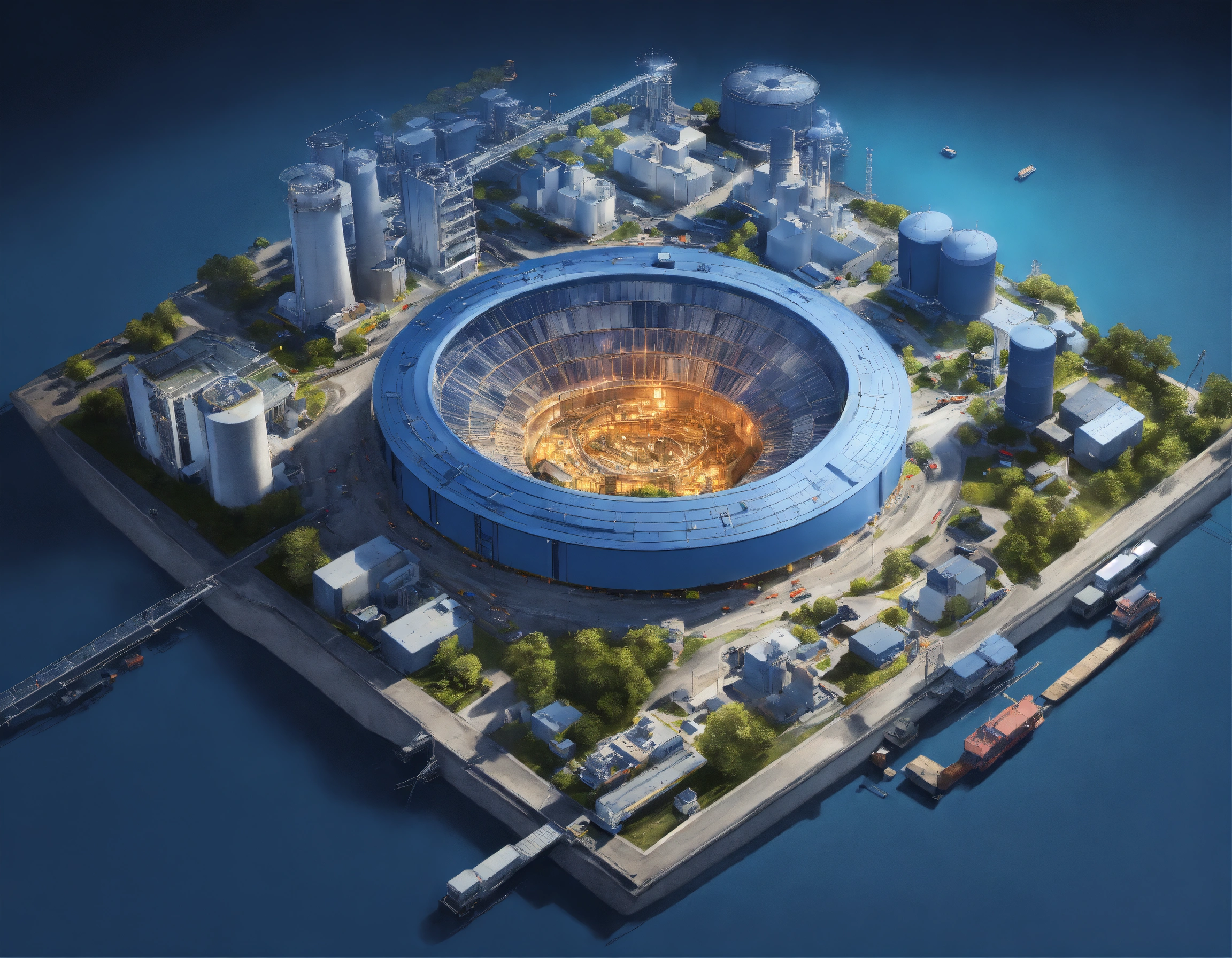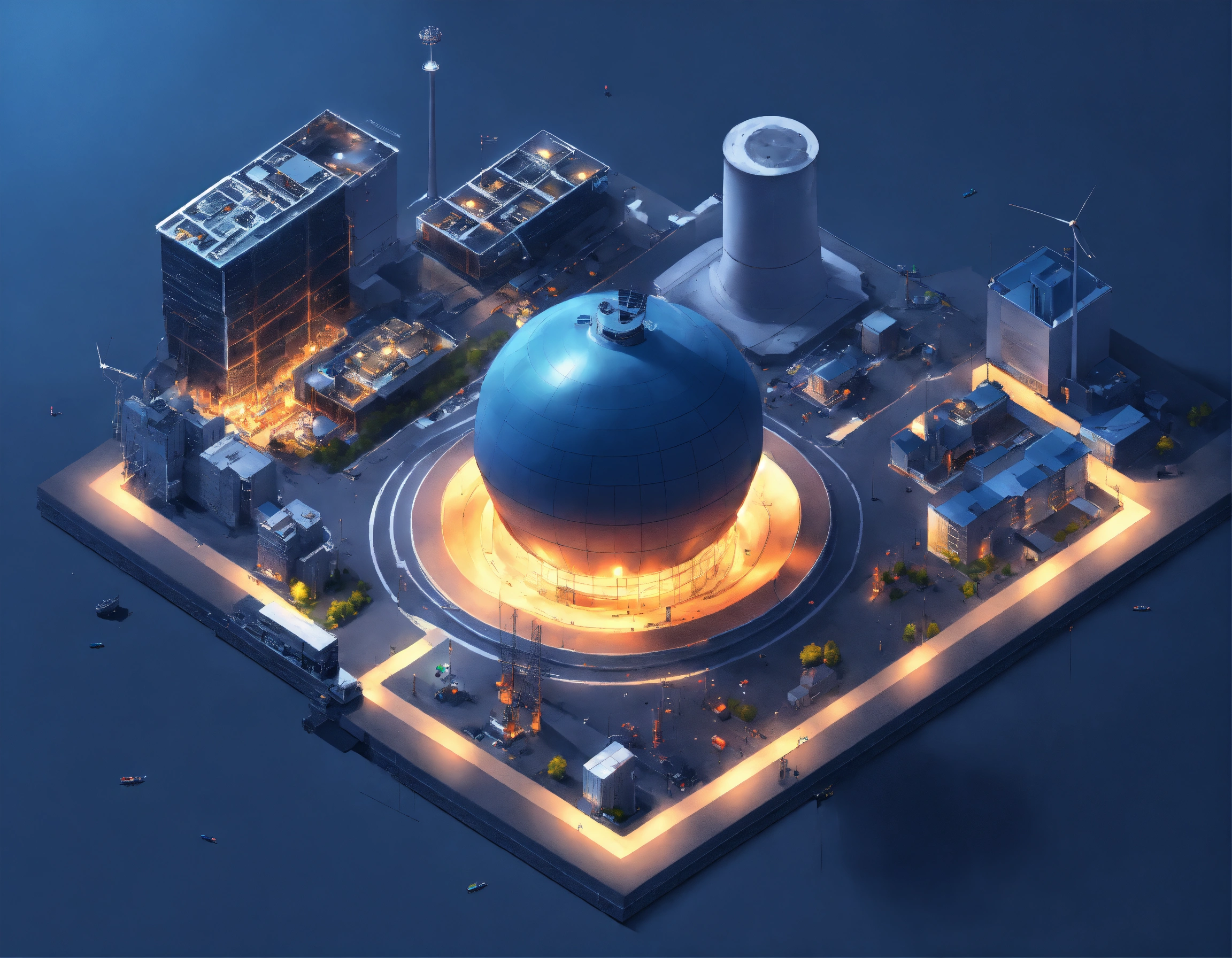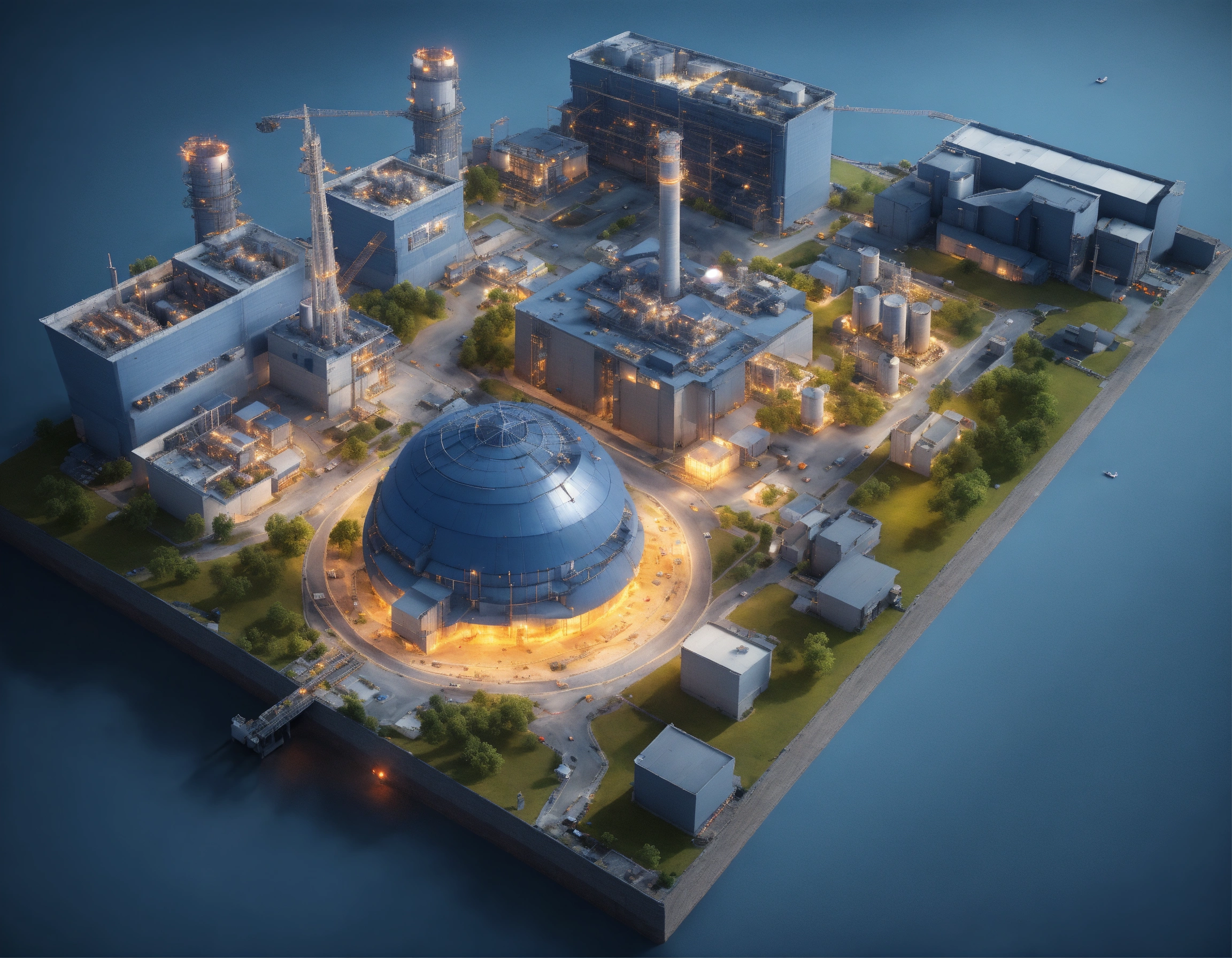 Top view, people are building a nuclear power plant, an atom appears, and it creates cities around. people and families go everywhere. photorealistic style, dark blue, blue colors