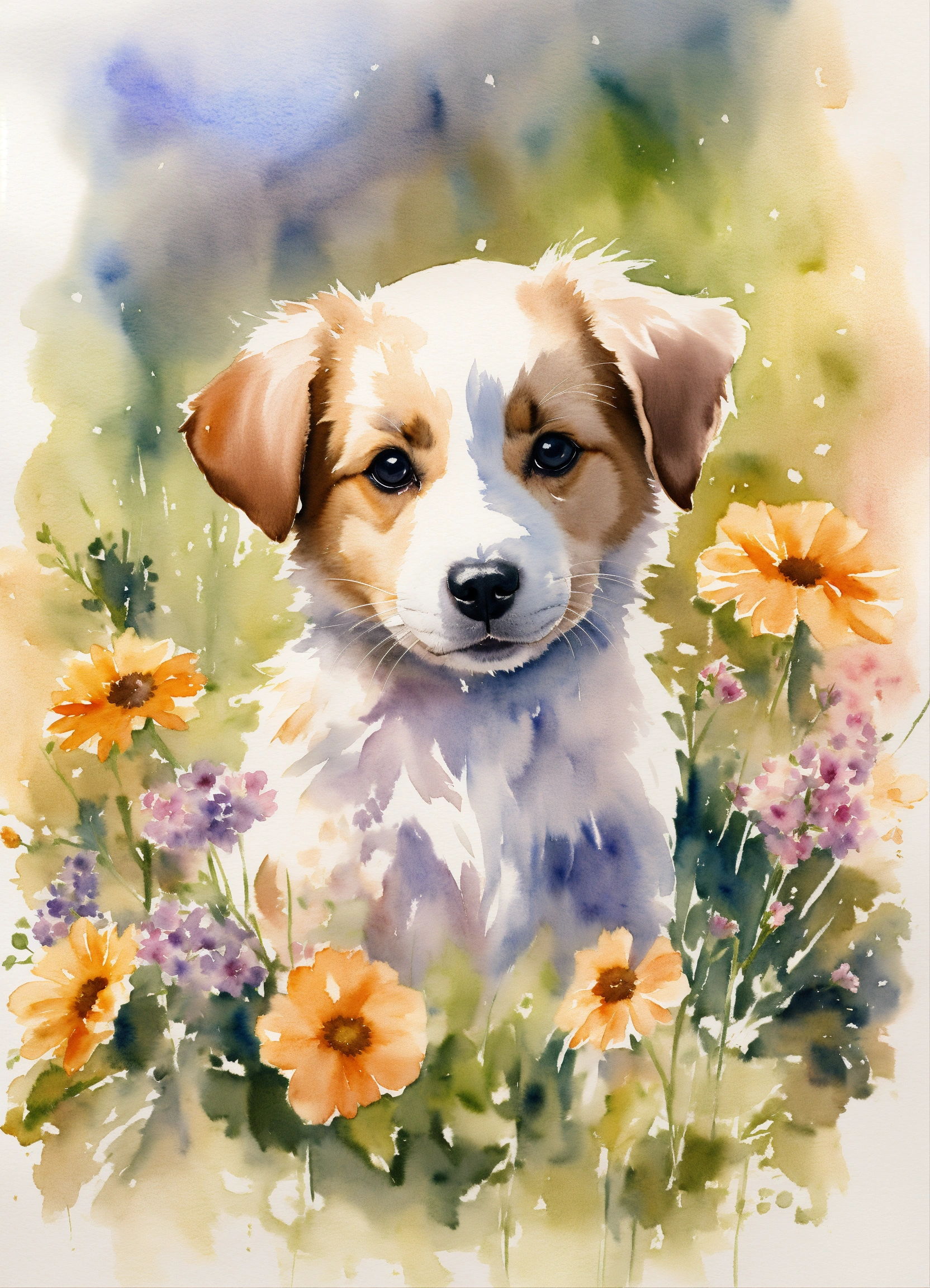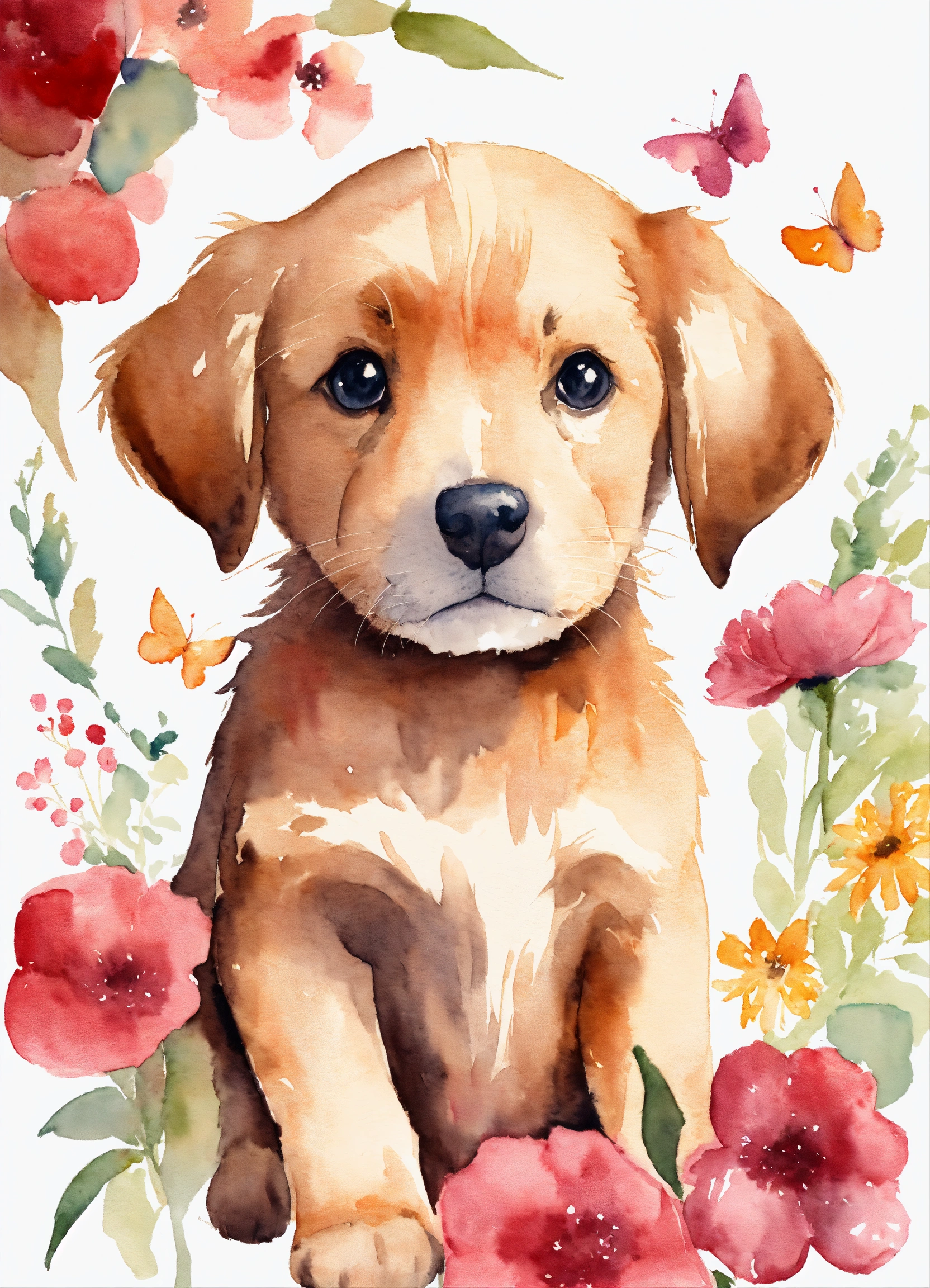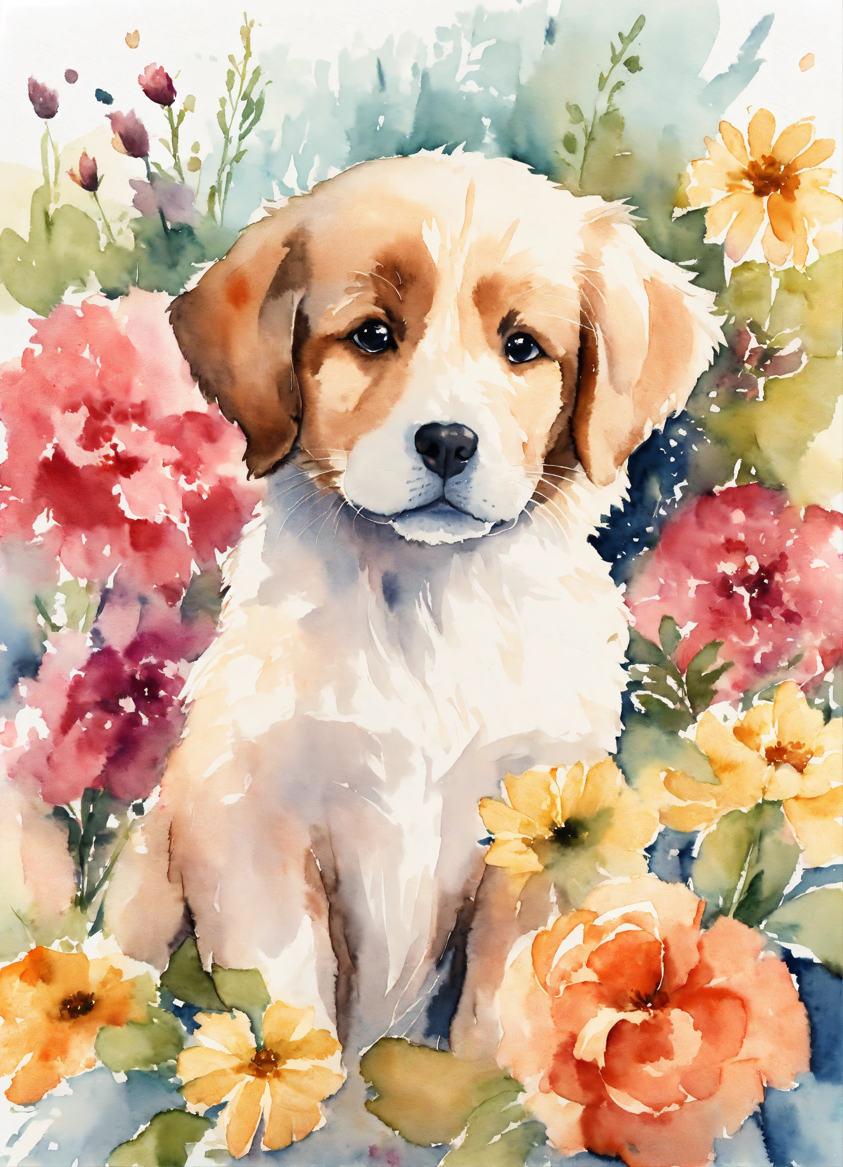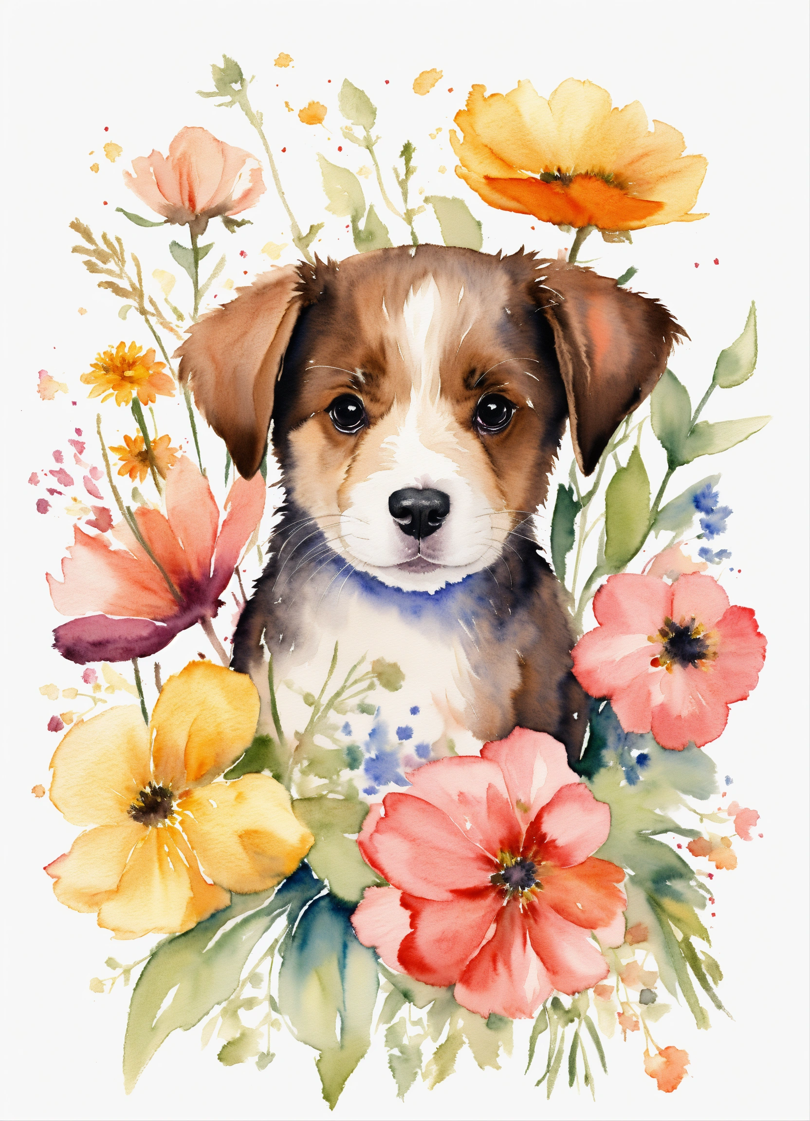 Watercolor drawing of a cute puppy with flowers on a white background