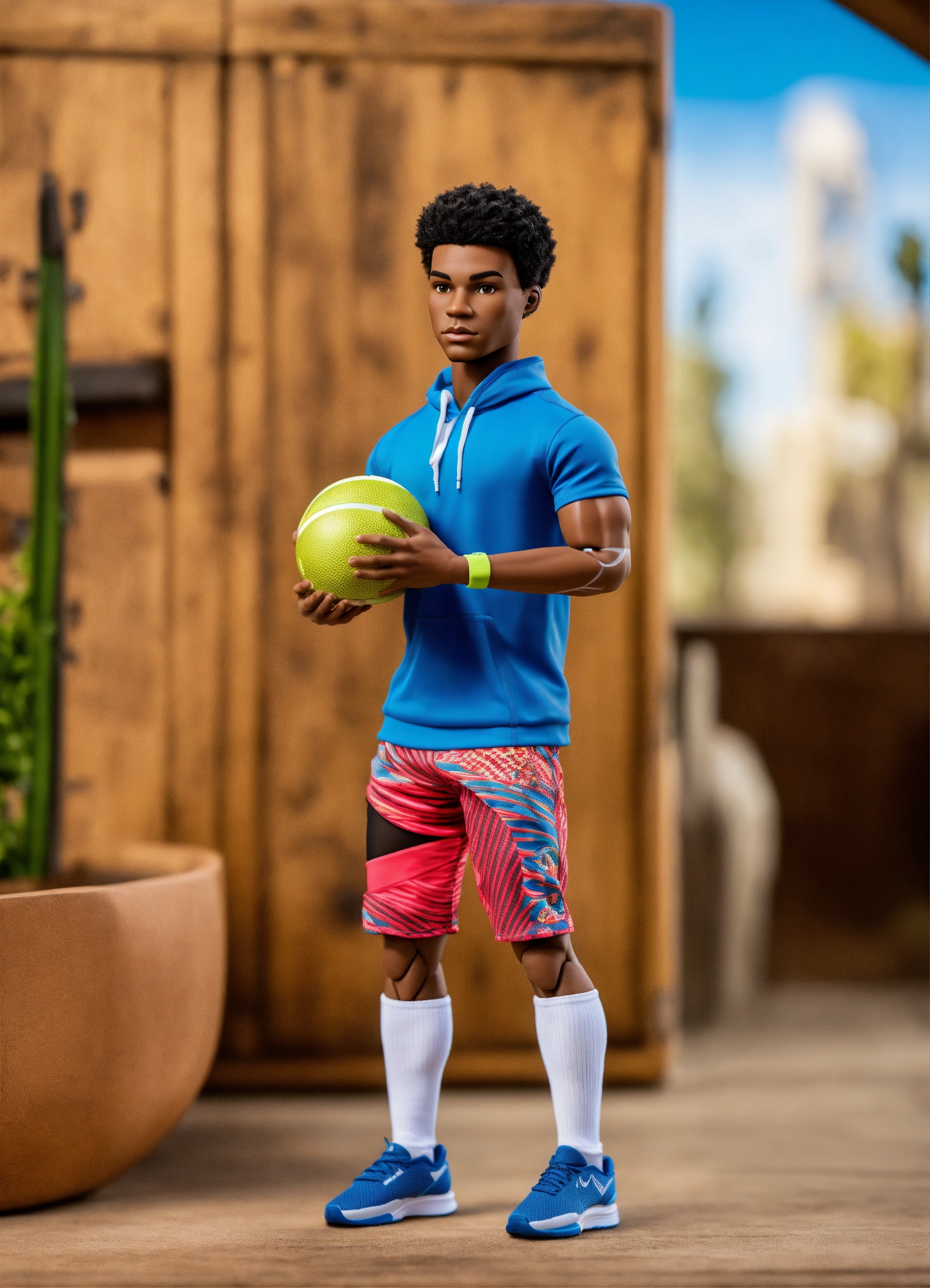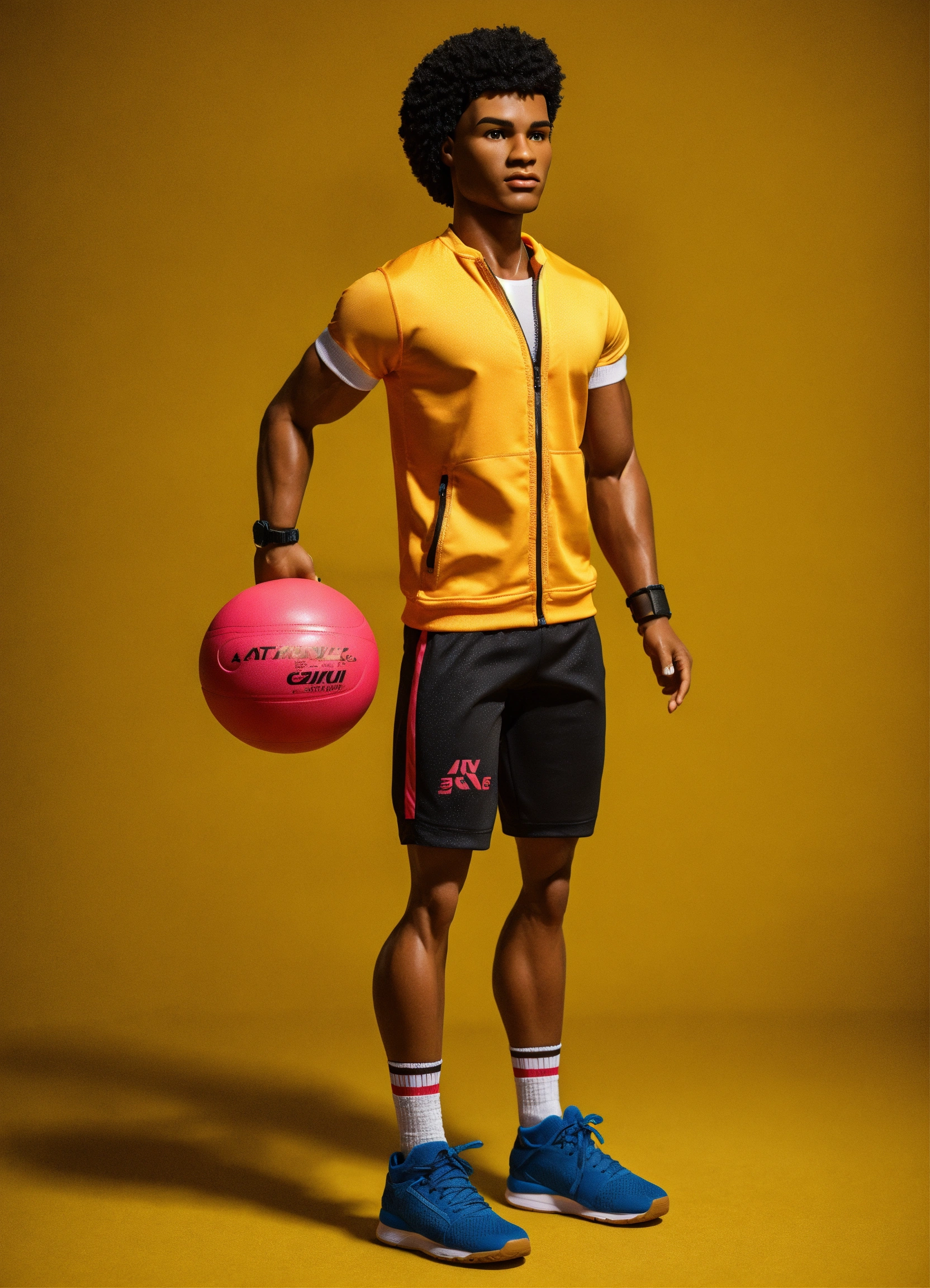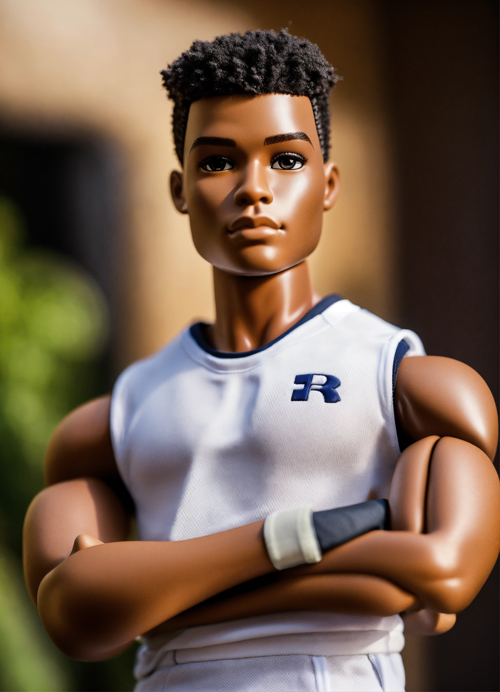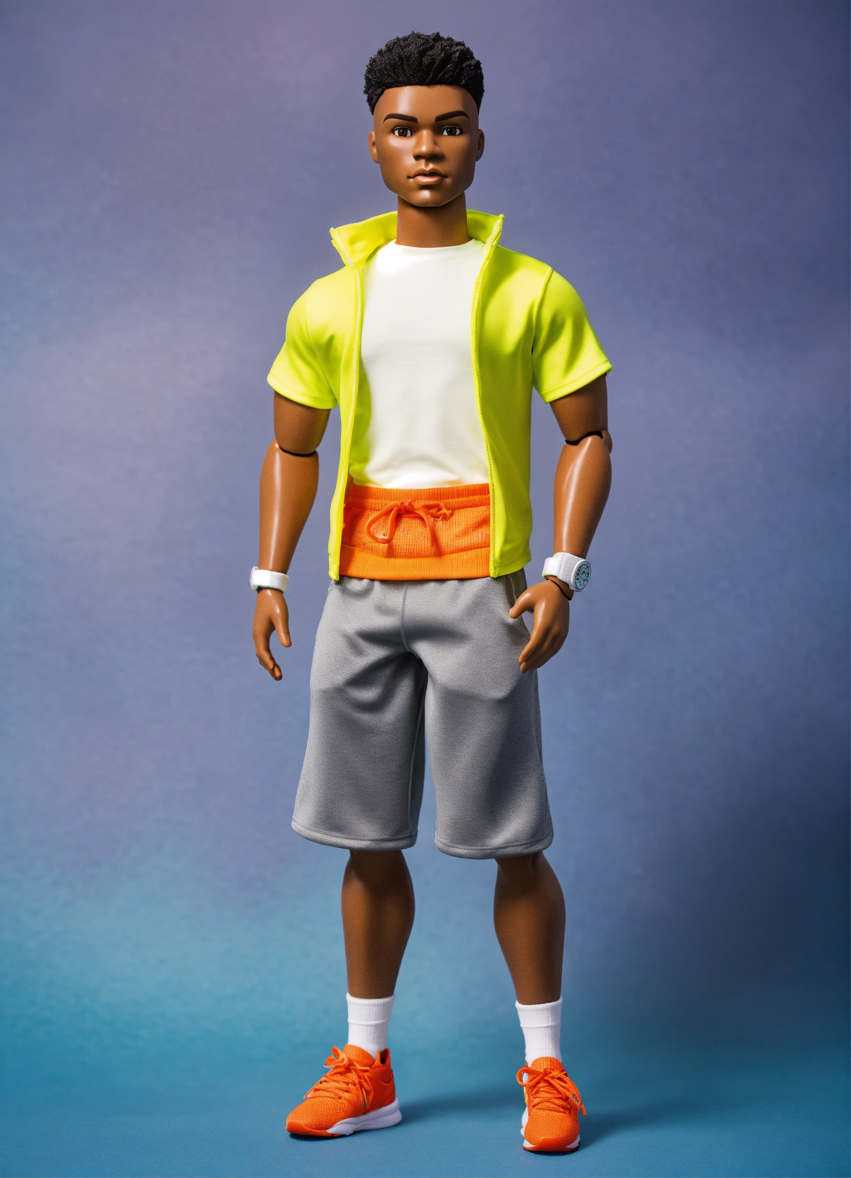 Design an athletic african american ken doll in workout clothes. in a barbie box. the doll should have a lean build and be wearing a stylish and functional workout outfit. the outfit should include a sweat-wicking shirt, breathable mesh shorts, modern sneakers, white crew socks, and any additional accessories that would enhance the doll's athletic appearance. please ensure that the doll's features and clothing accurately represent and celebrate the diversity and athleticism of african american individuals.