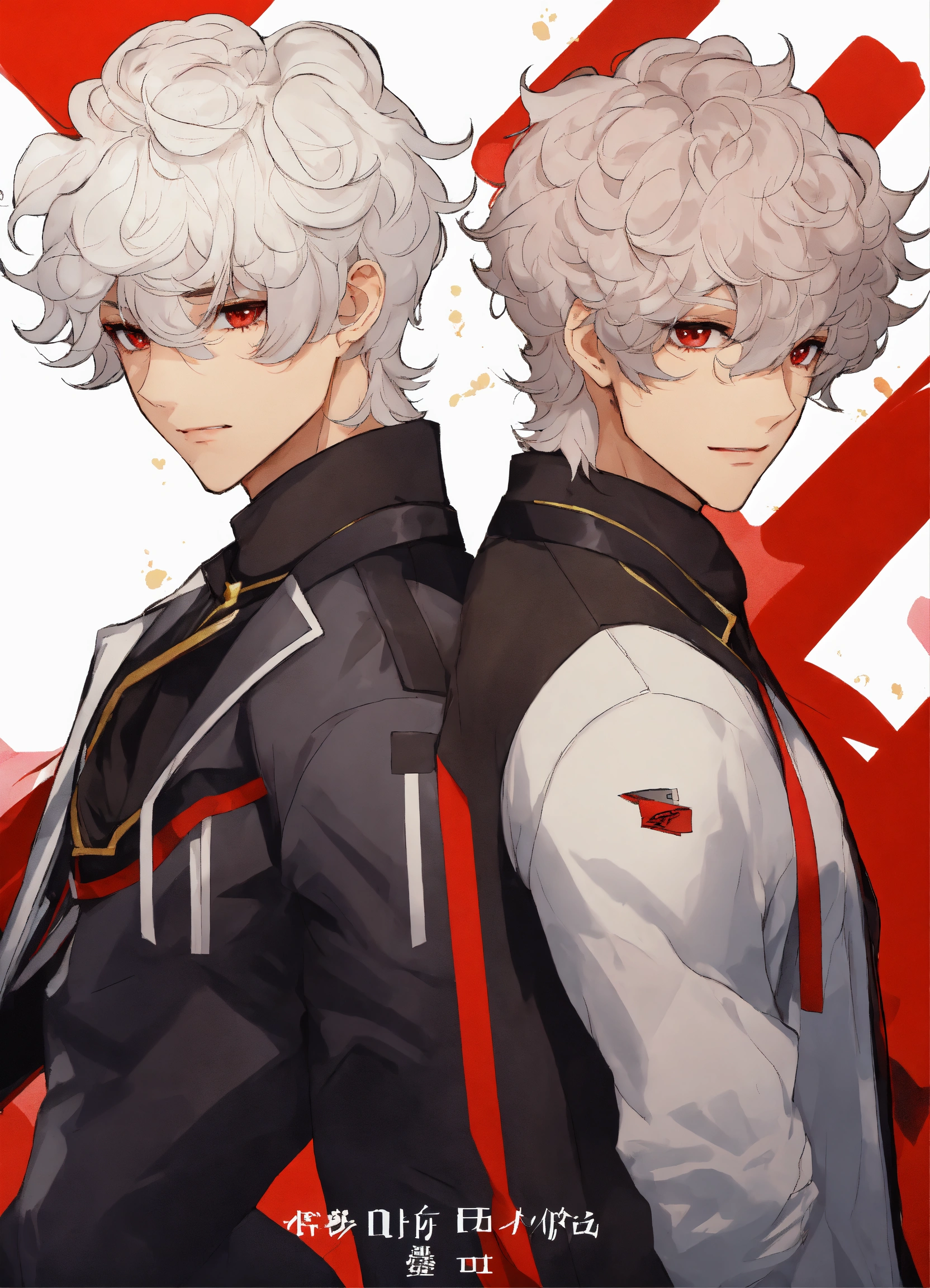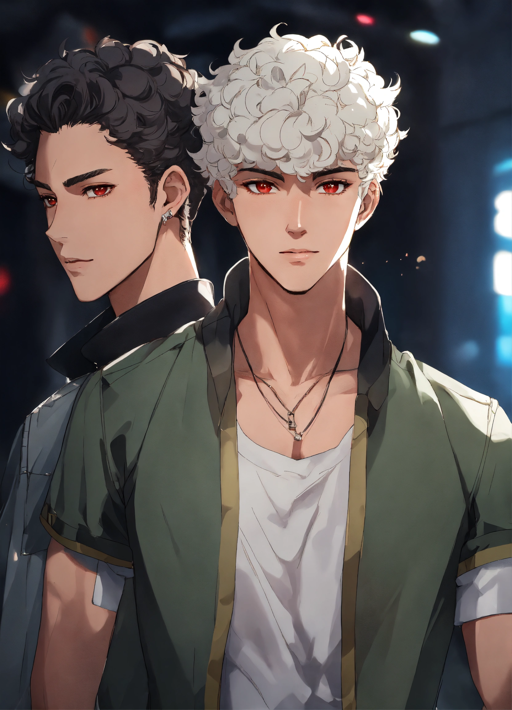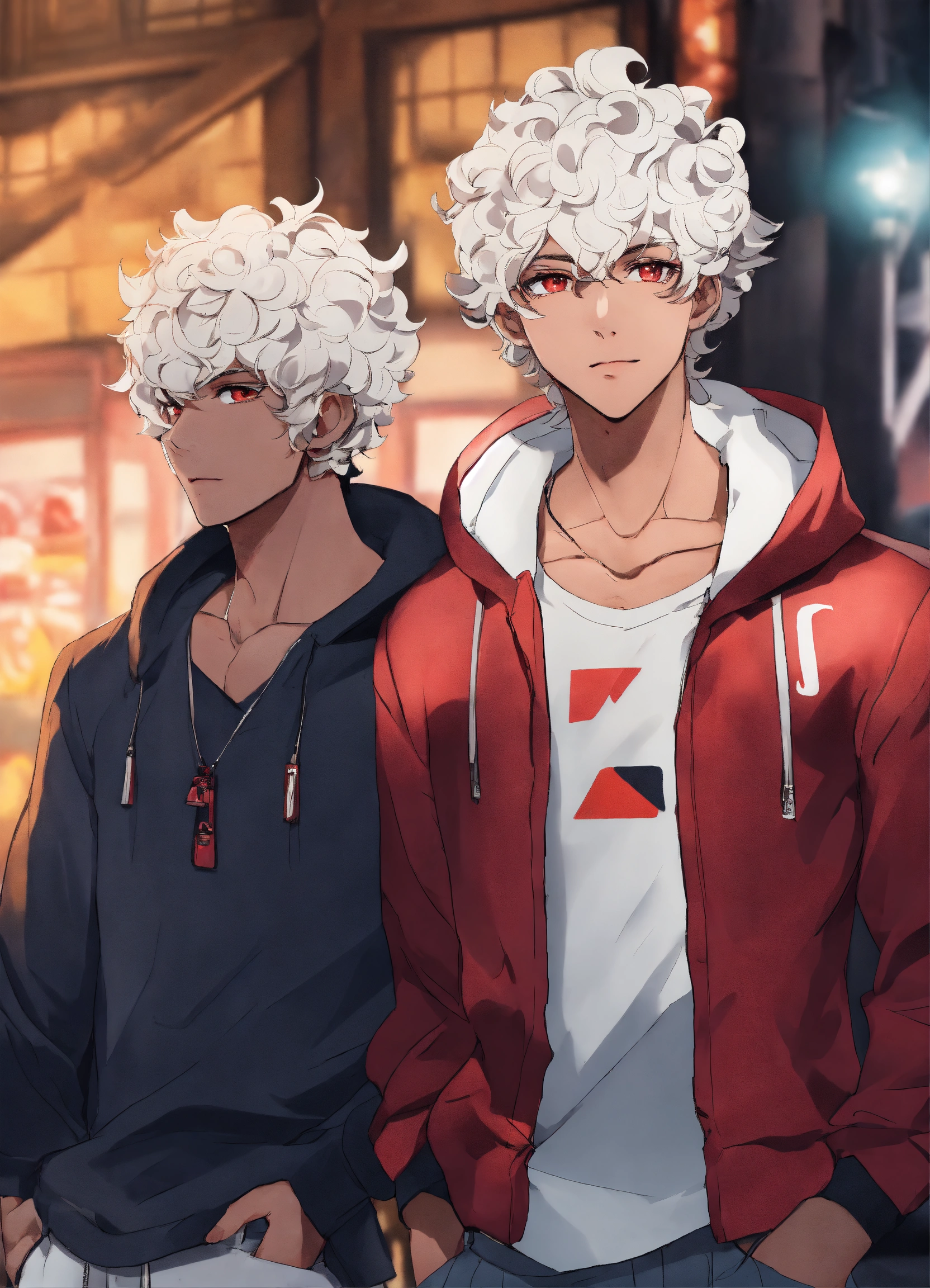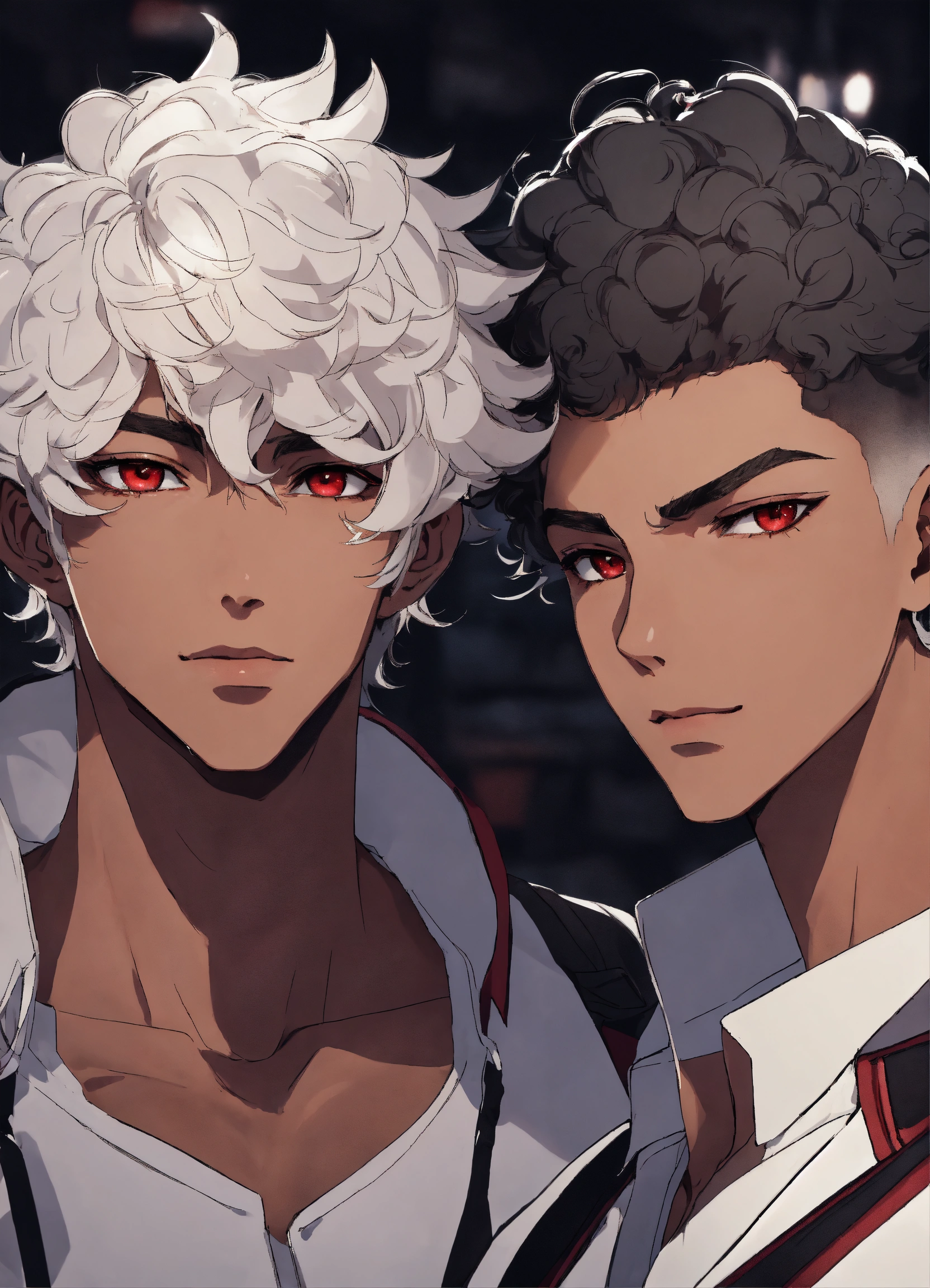 2 men 20 years old, twins, white short curly hair, medium dark skin, sharp facial features, scarlet eyes, height 180 cm, athletic build, anime reskin style