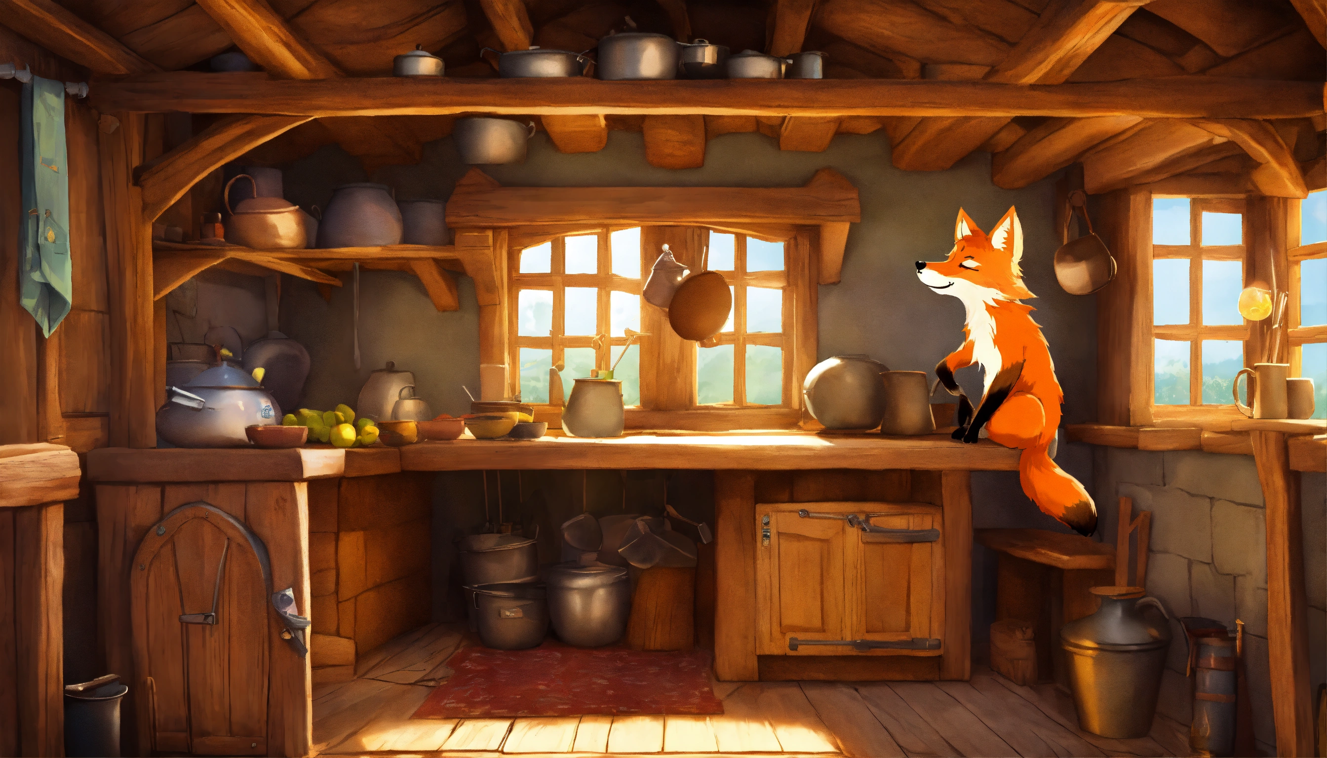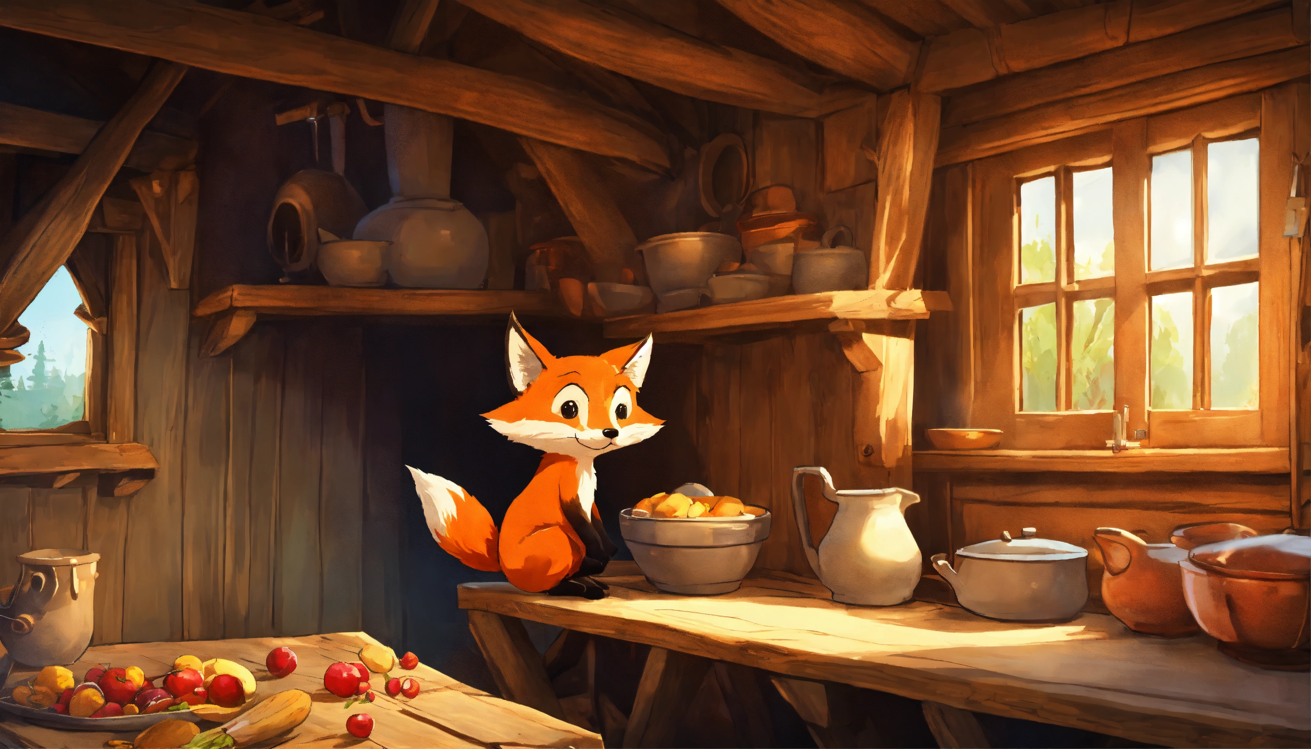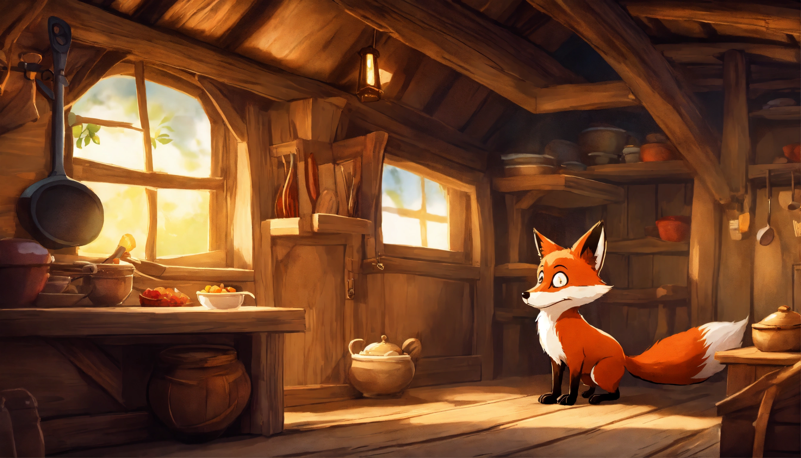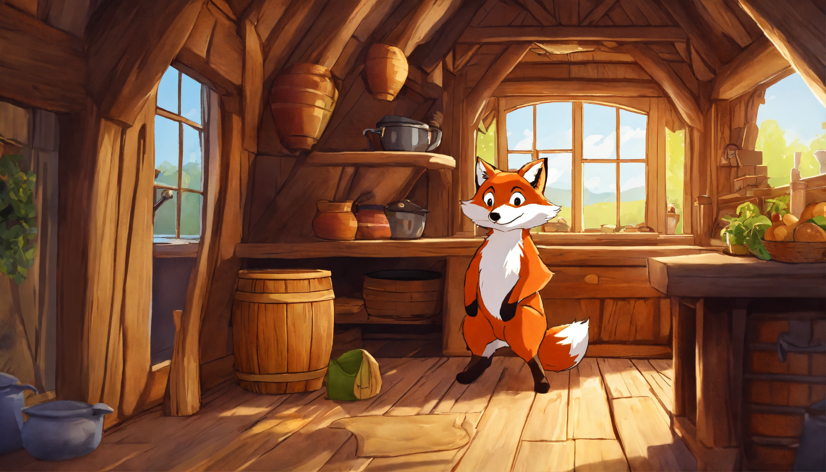 A cartoon-style fox climbs into a wooden medieval hut in the kitchen through the window