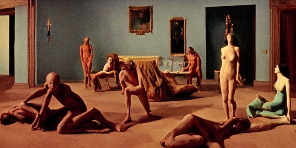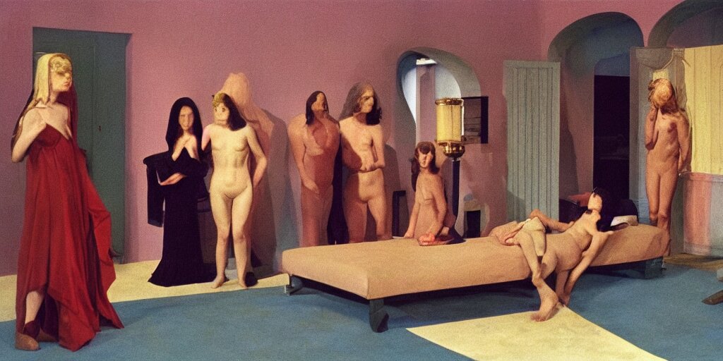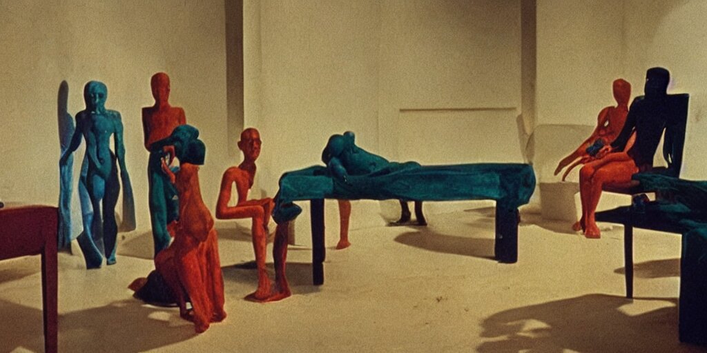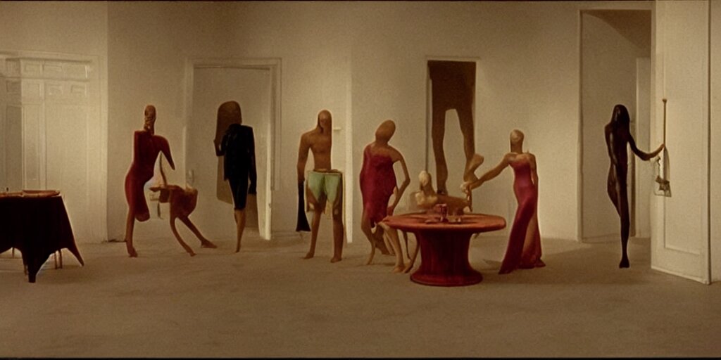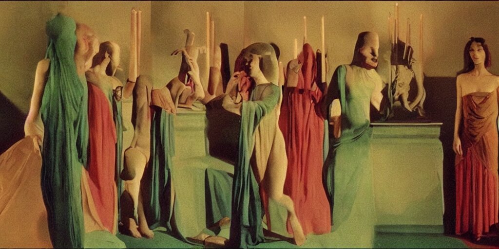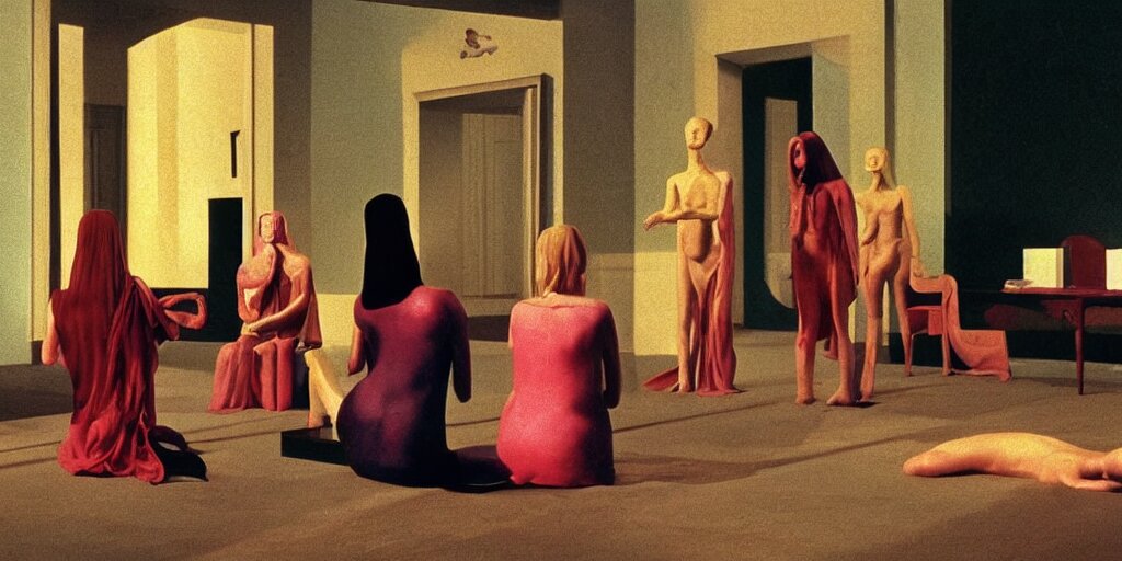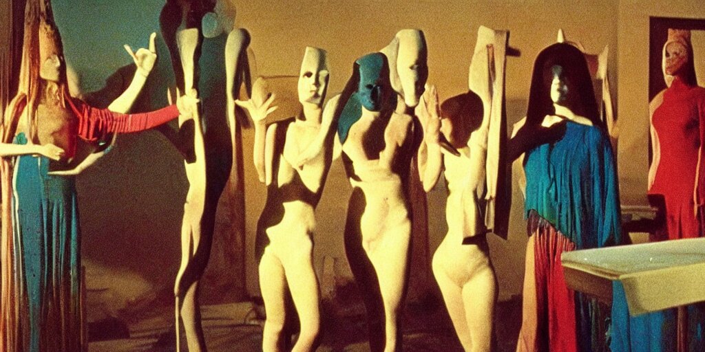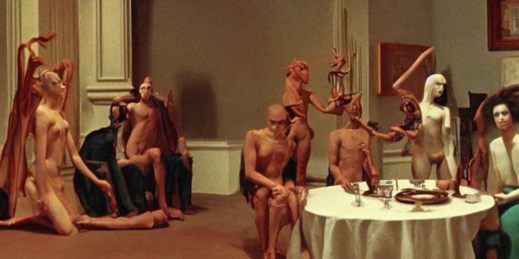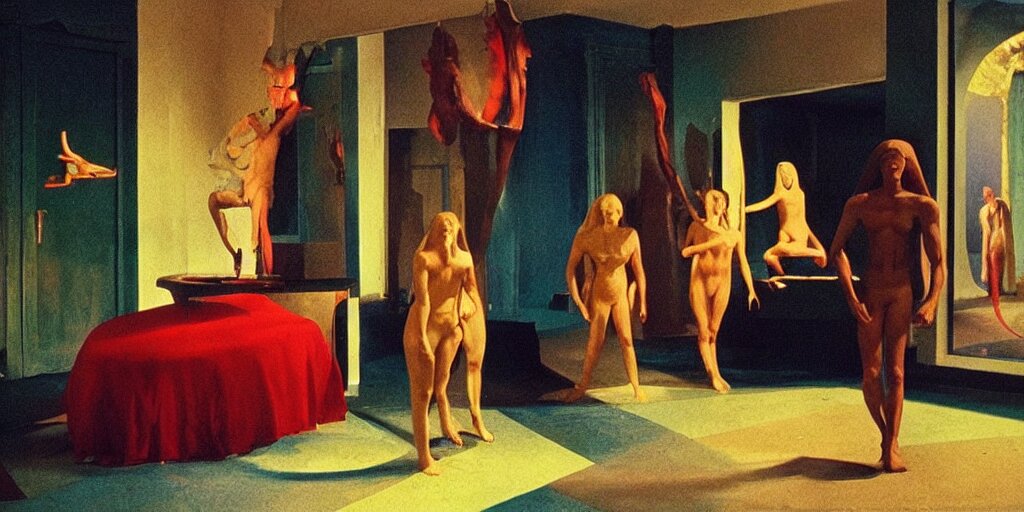 Four humanoid and chimeric creatures in an occult ritual : : still from a neoclassical 7 0's art house movie by luis bunuel and david lynch, absurd comedy : : close - up, cinestill 8 0 0 tungsten, high quality, triadic color scheme : : interior and exterior design by chirico and edward hopper