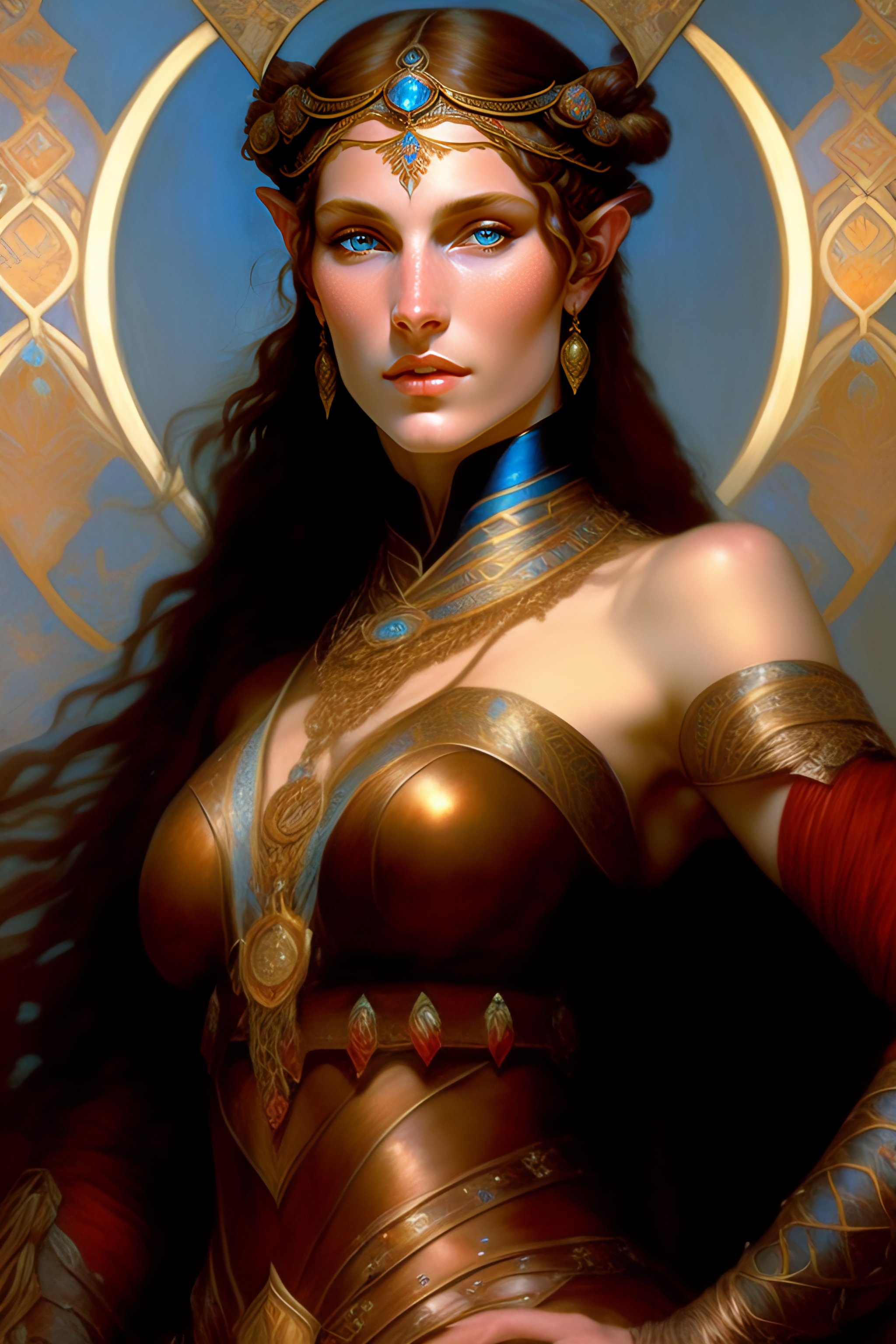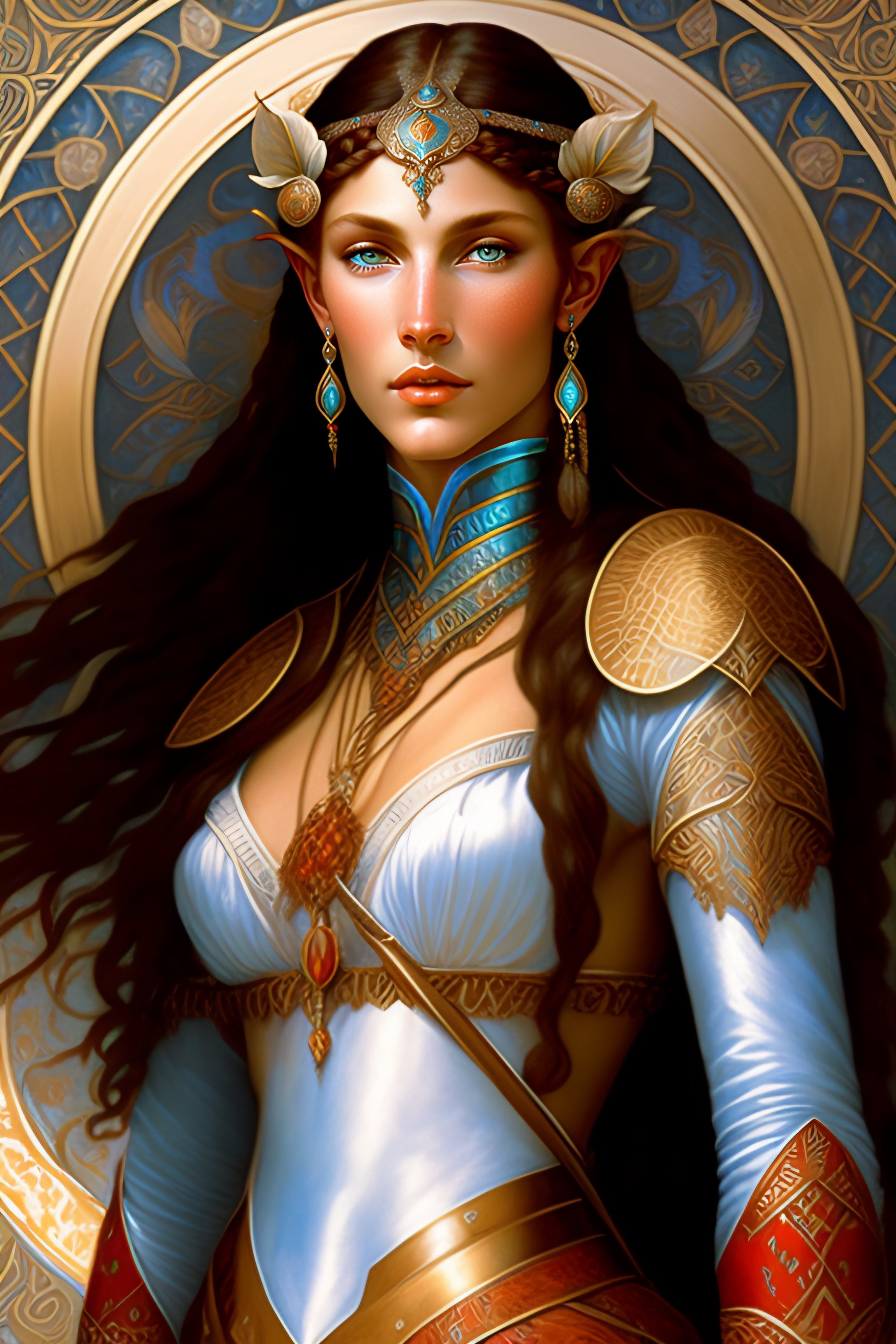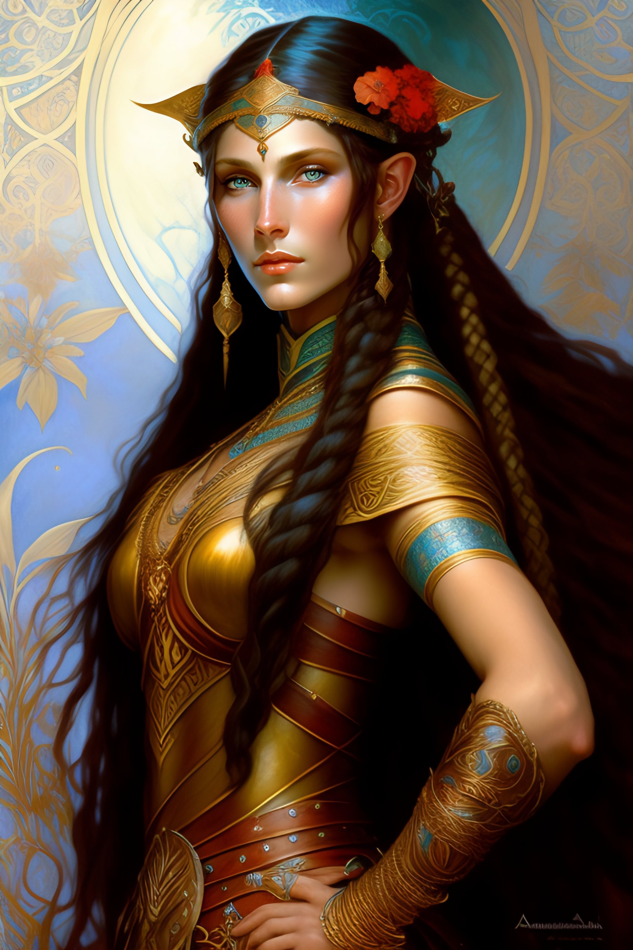 Portrait of a elf woman with dark brown skin, pale blue eyes, freckles, high cheekbones, red hair in intricate braids, wearing light leather armor, art by alphonse mucha, stylized, intricate, elegant
