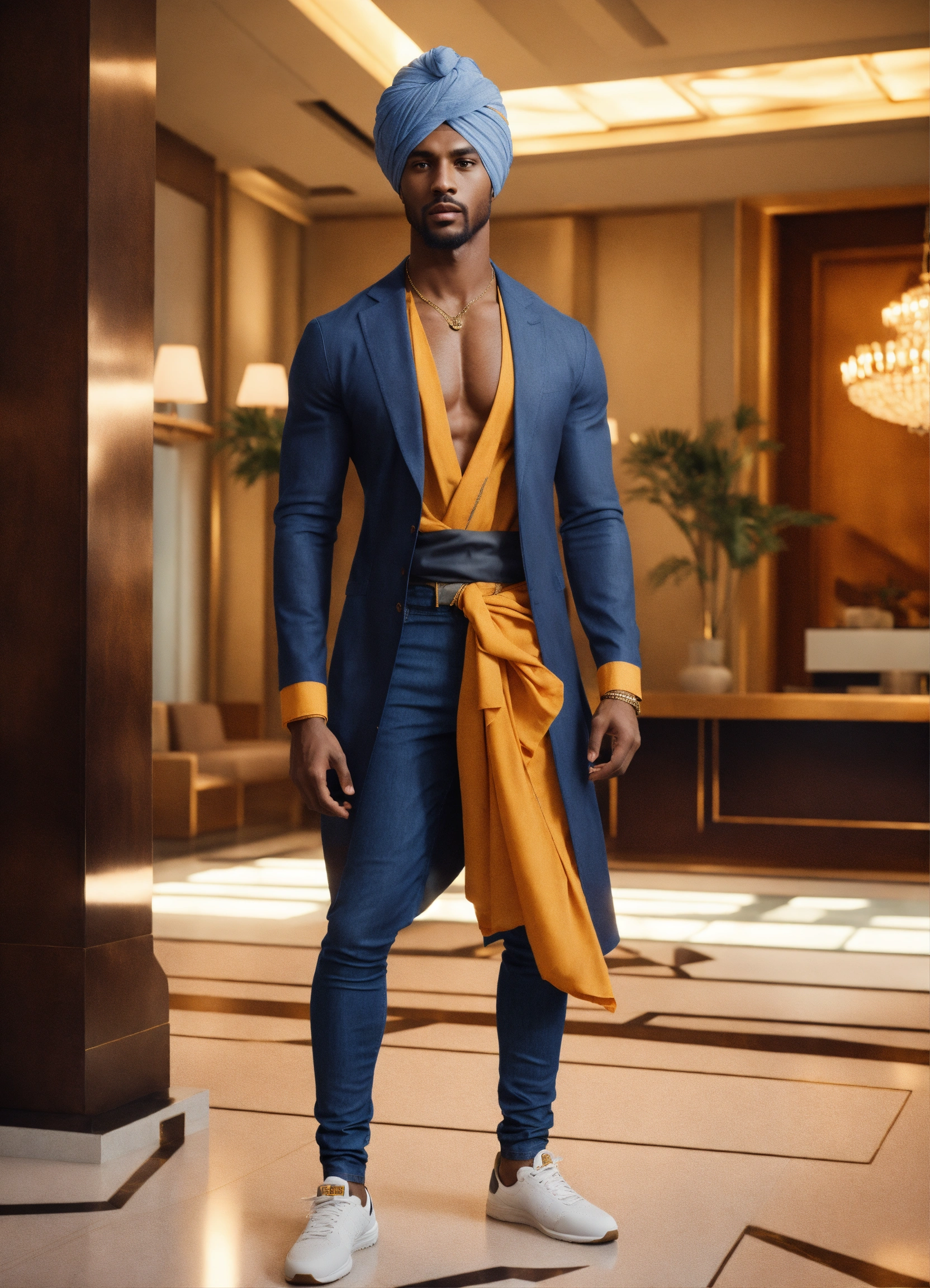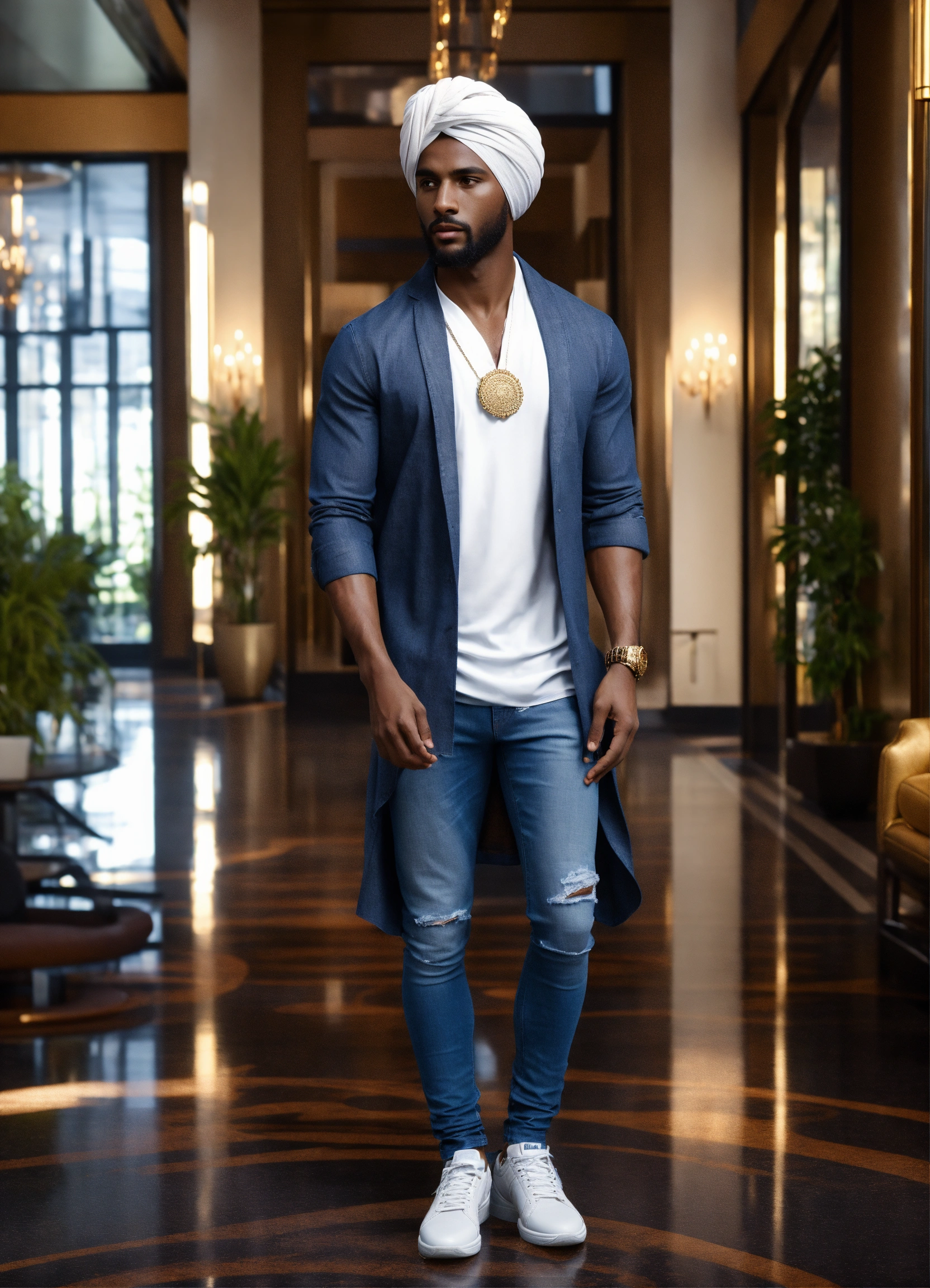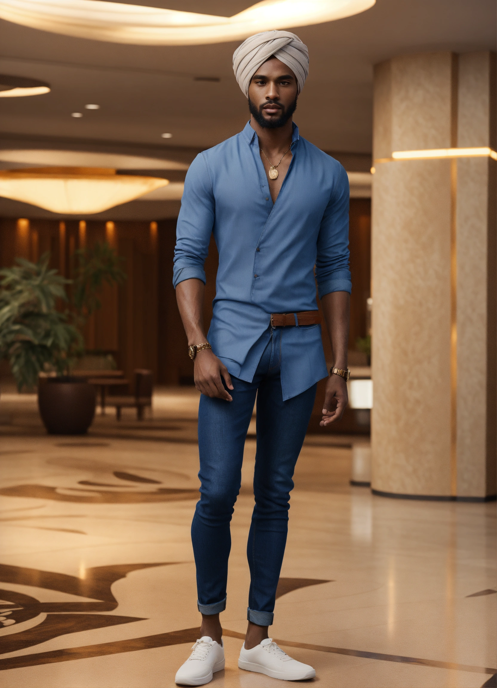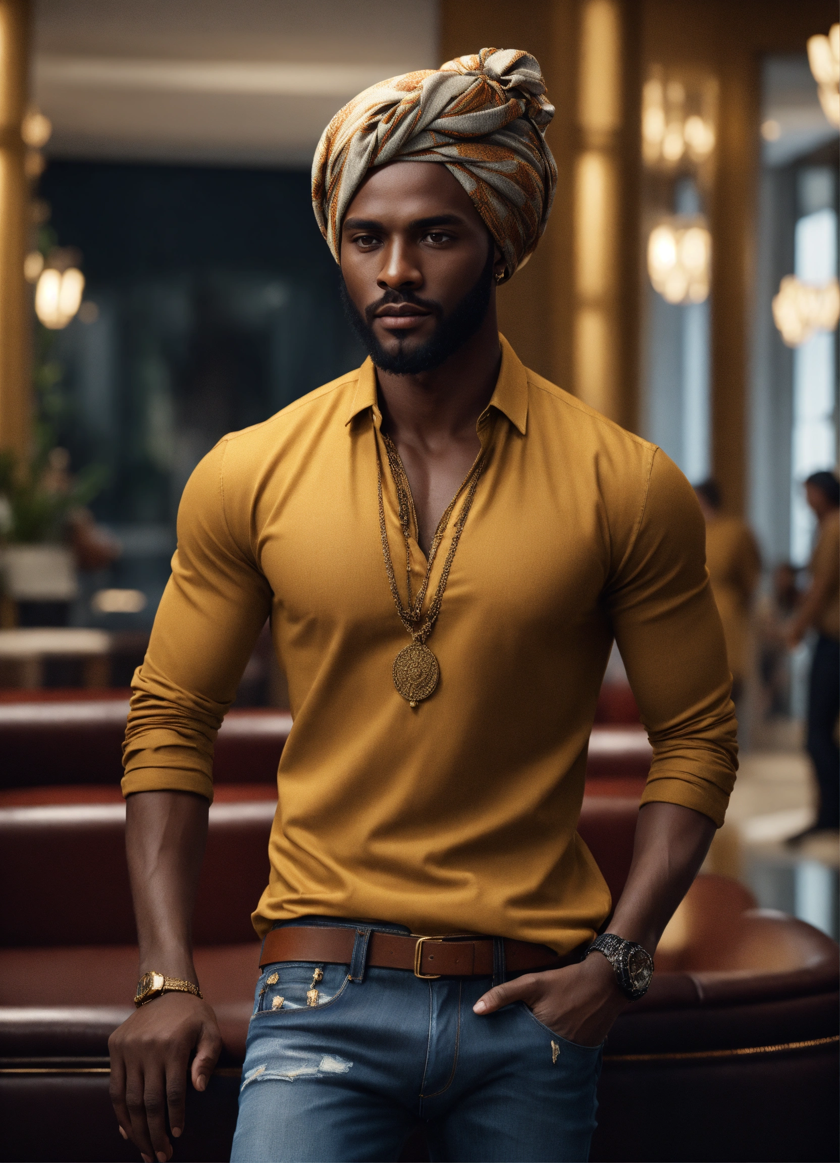Handsome ethopian male, tall athletic build, haute coture shirt, jeans, casual shoes, hair wraped in turban, in upscale lobby, serious demeanor, 8k, unreal engine.