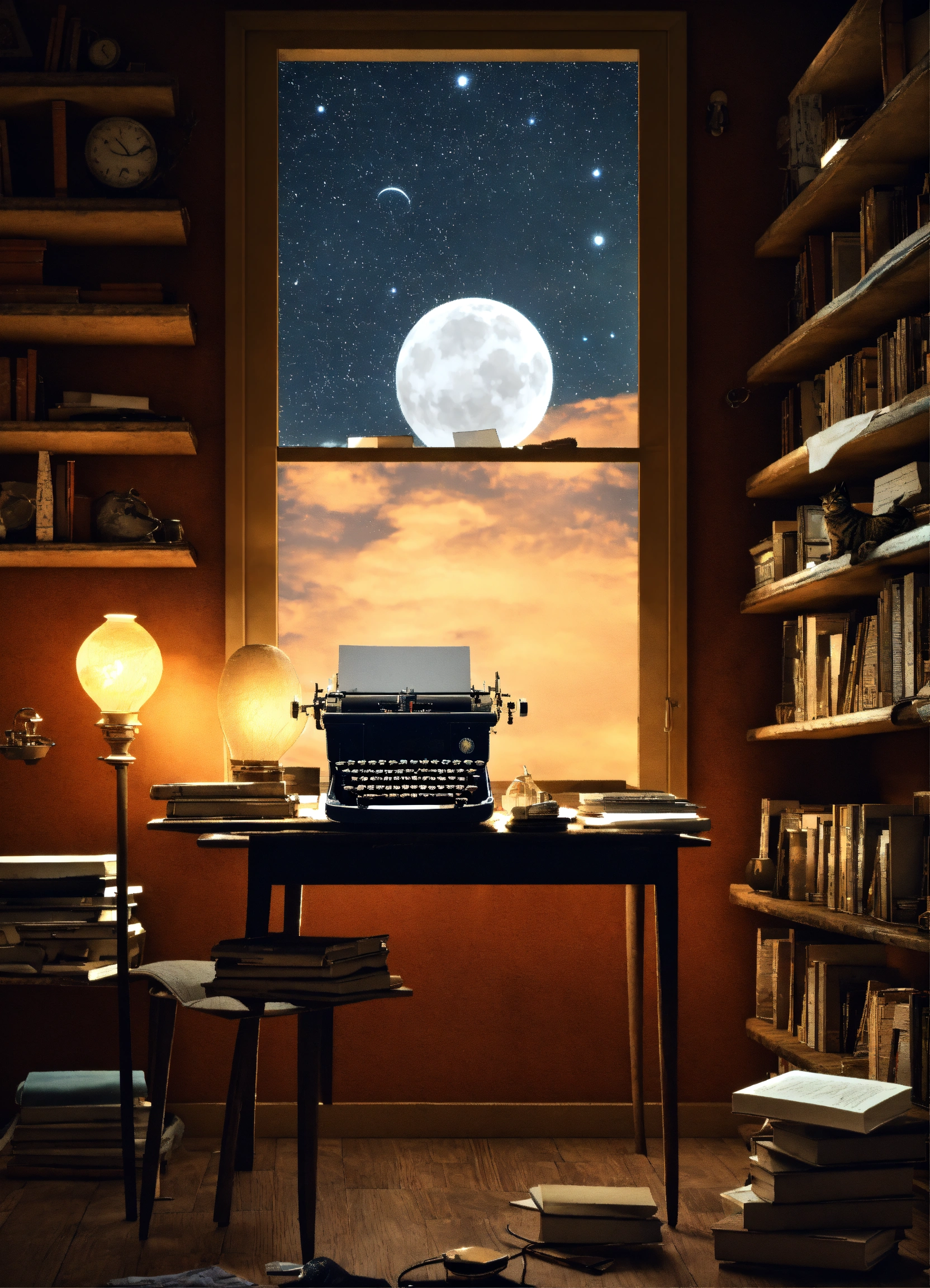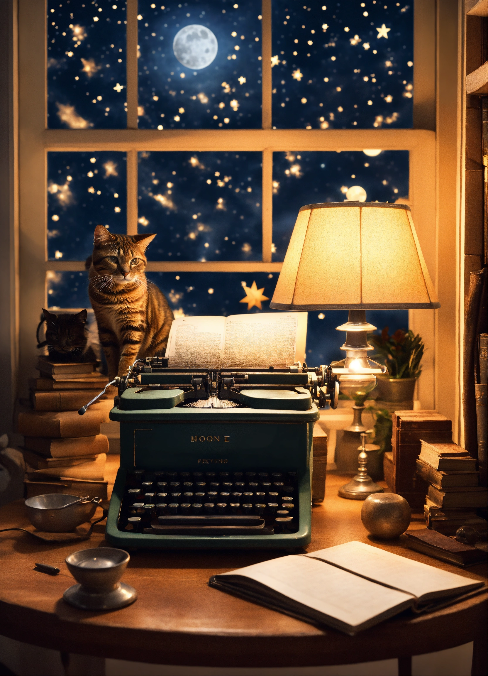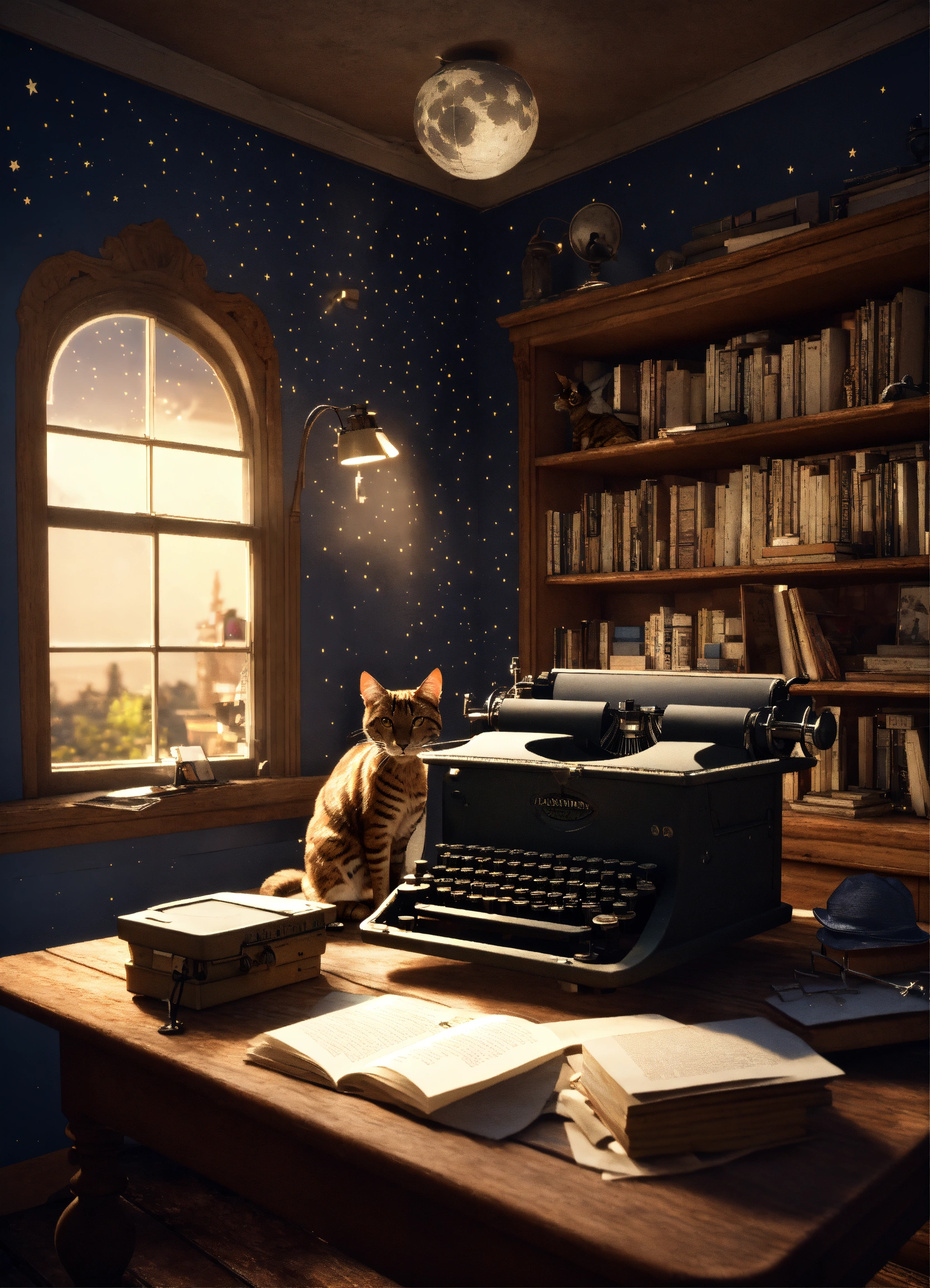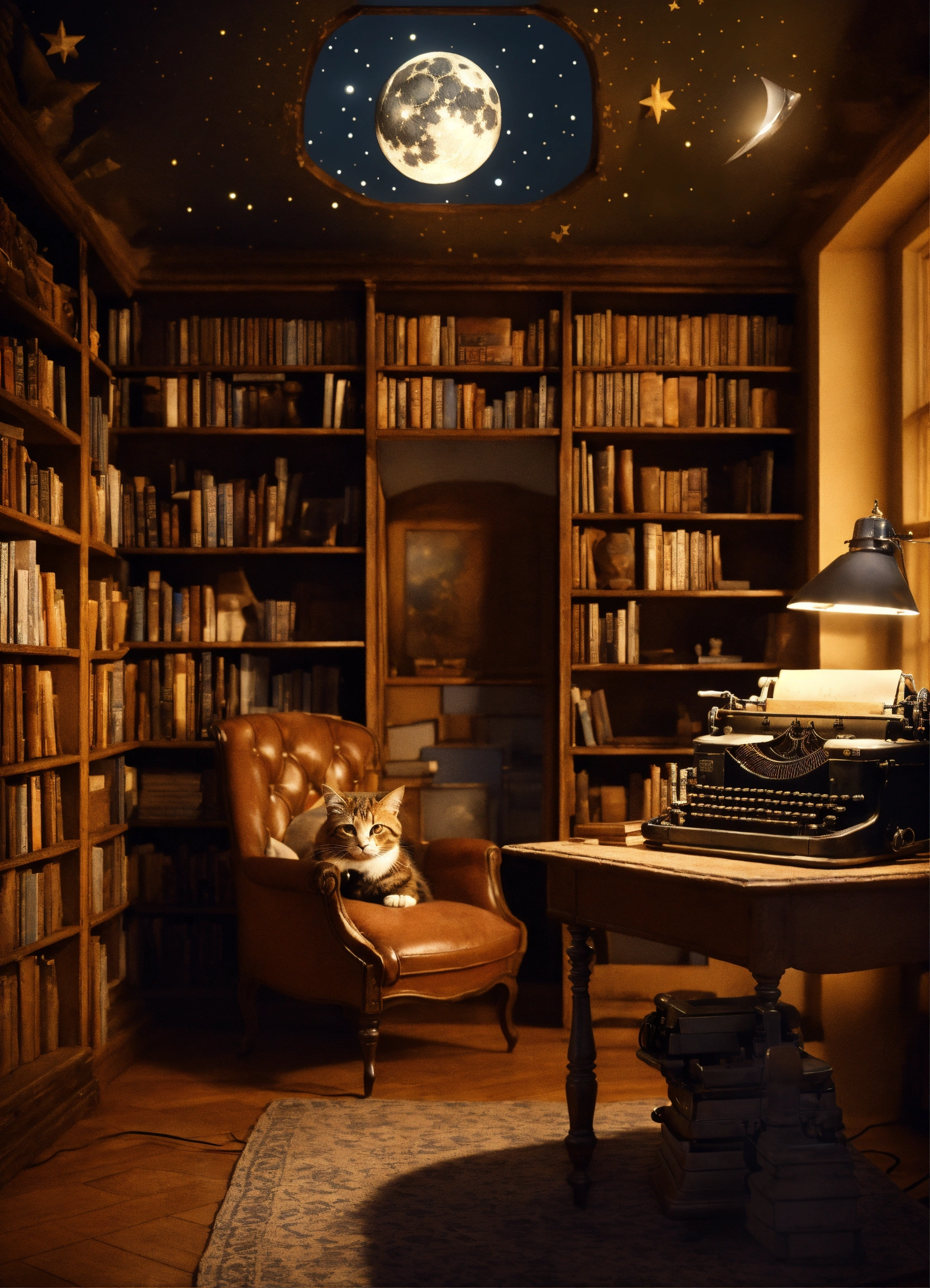 Create a figure of an old typewriter, in 3d, with blank paper, on an old table, full of books, a brown cat, and the room space full of shelves, with an old lamp falling from the ceiling on top of a hat, french type. the bedroom window was open, showing a starry sky and a beautiful, silver moon.