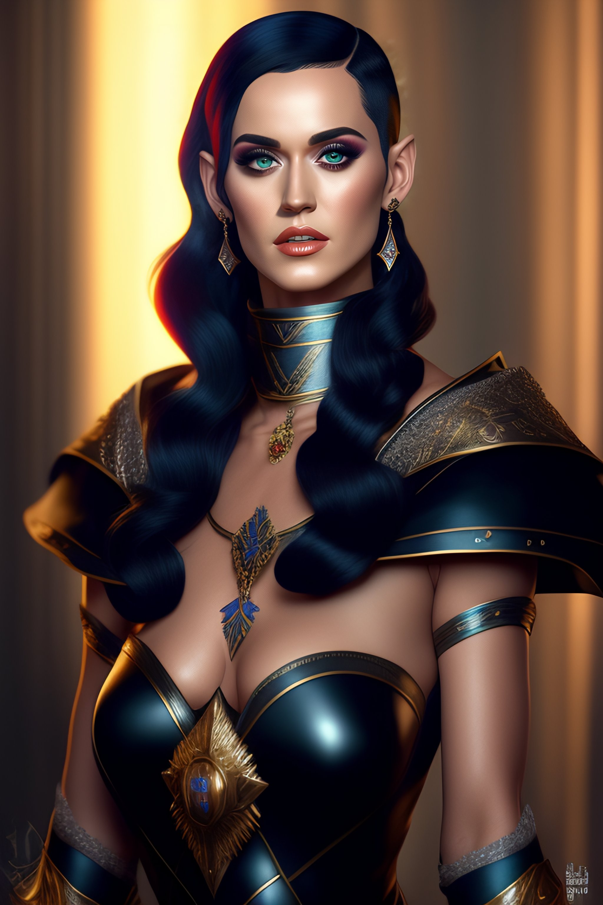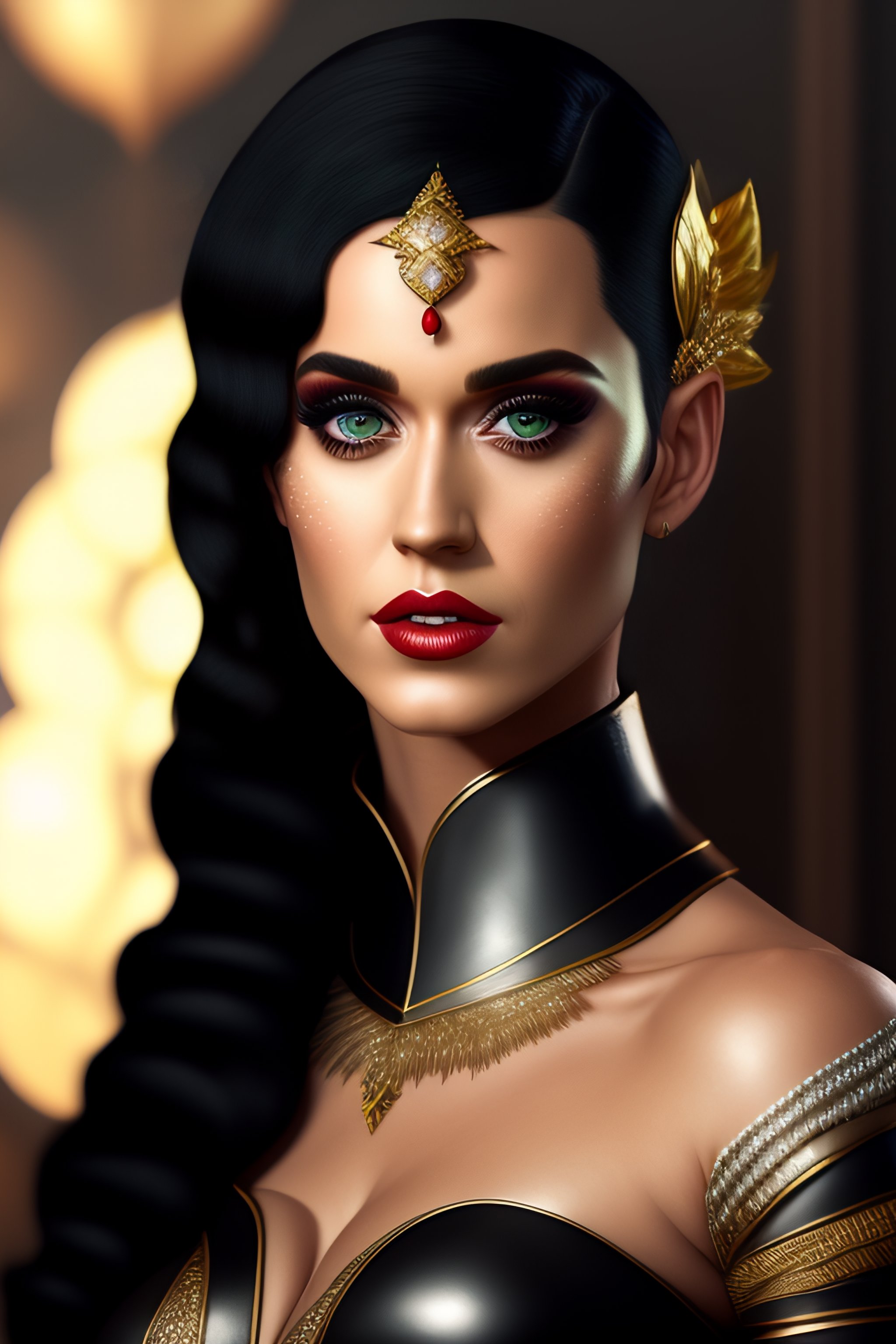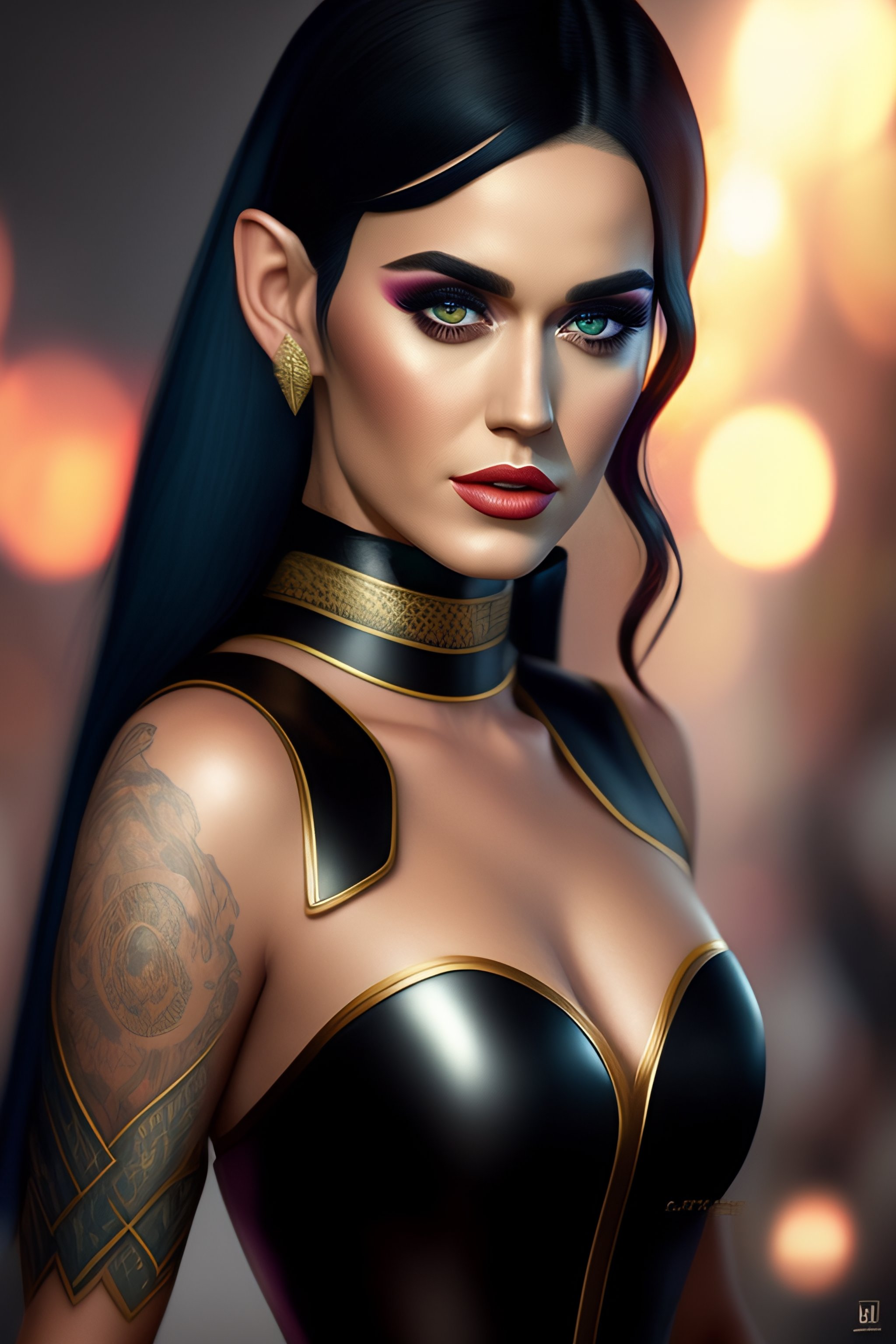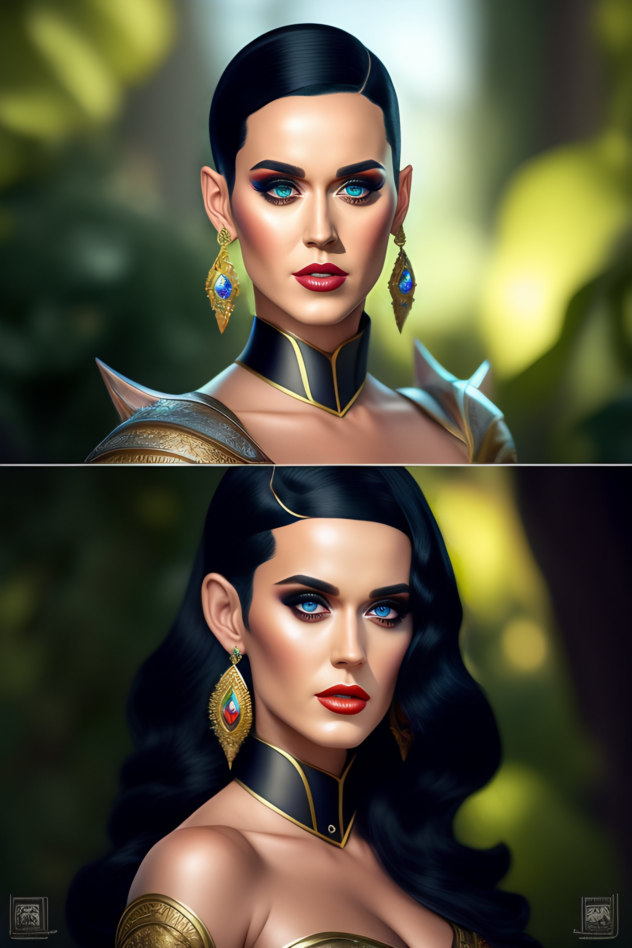 Photo of katy perry as an elf woman with short black hair and long pointed ears in the style of stefan kostic, realistic, sharp focus, 8 k high definition, insanely detailed, intricate, elegant, art by stanley lau and artgerm