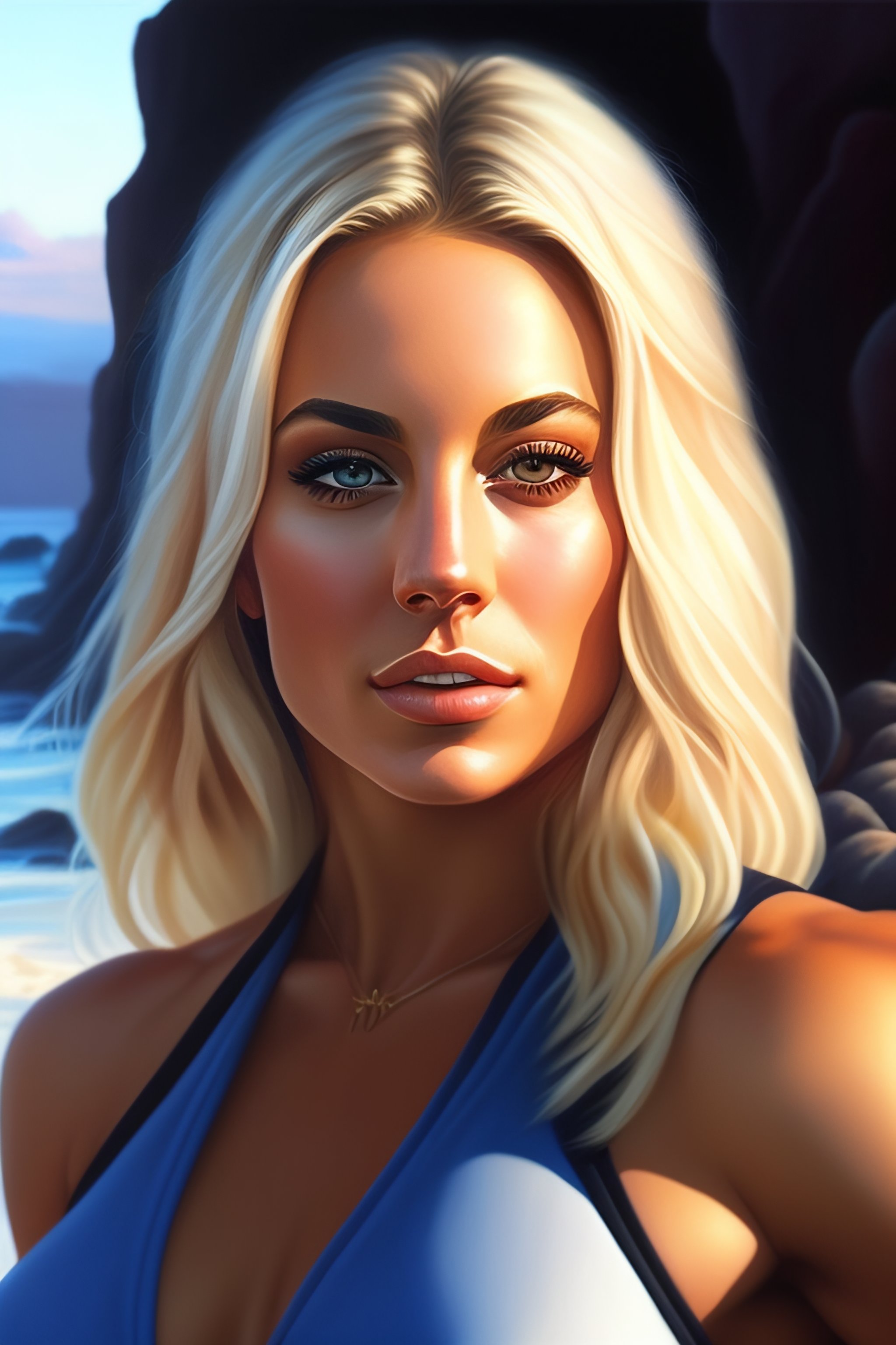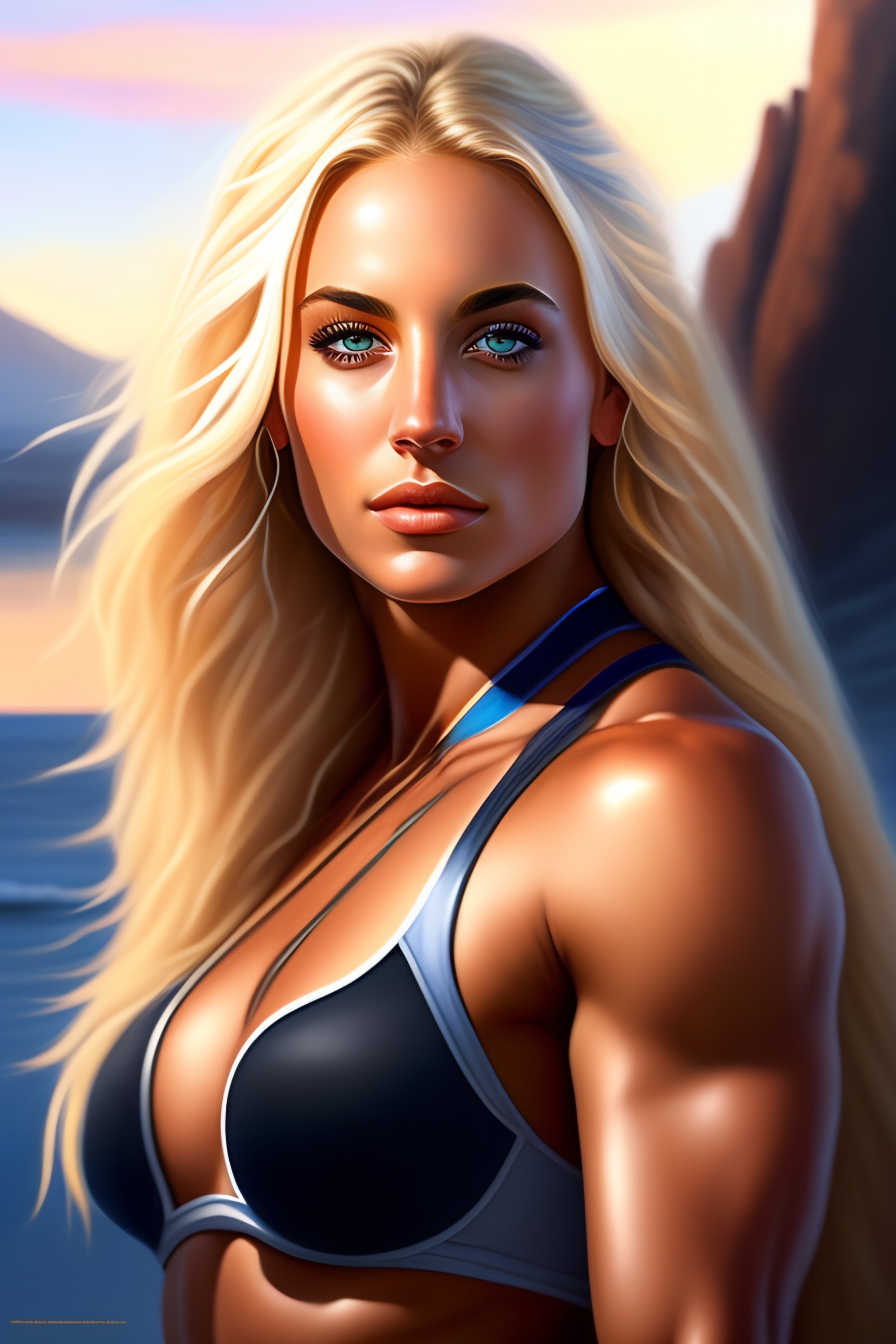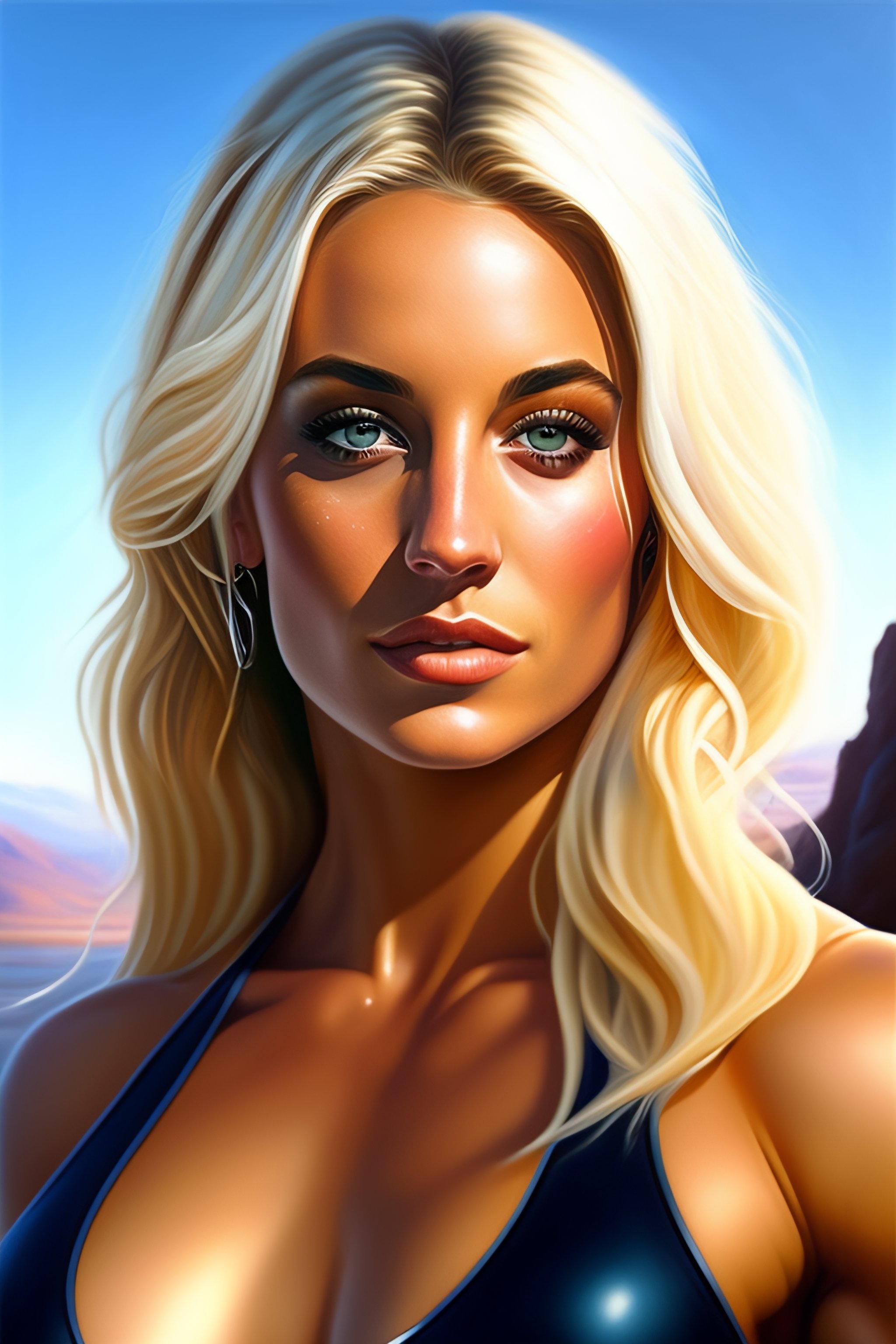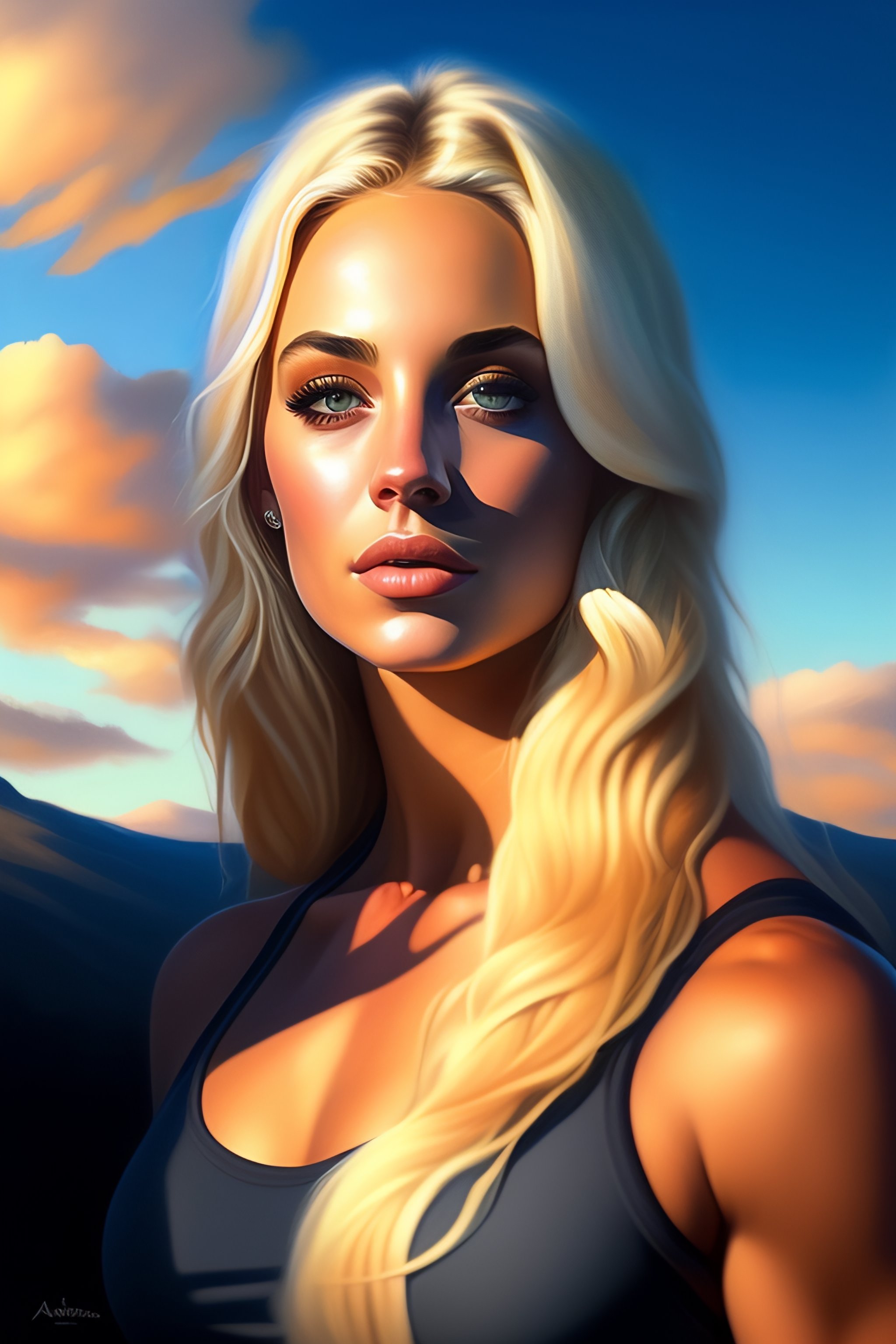 Girl looks like kaley cuoco with pale white skin and long blonde hair, muscular upper body, beautiful highly detailed face, complementary lighting, backlit, black eyeshadow, blue eyes, adventure, dramatic lighting, landscape background, beautiful painting by artgerm and greg rutkowski and raymond swanland