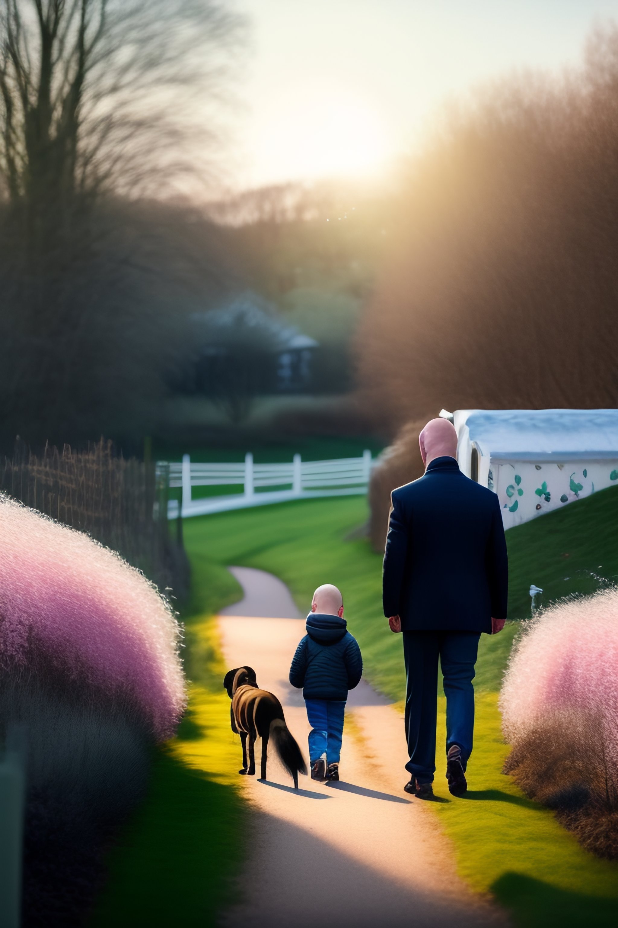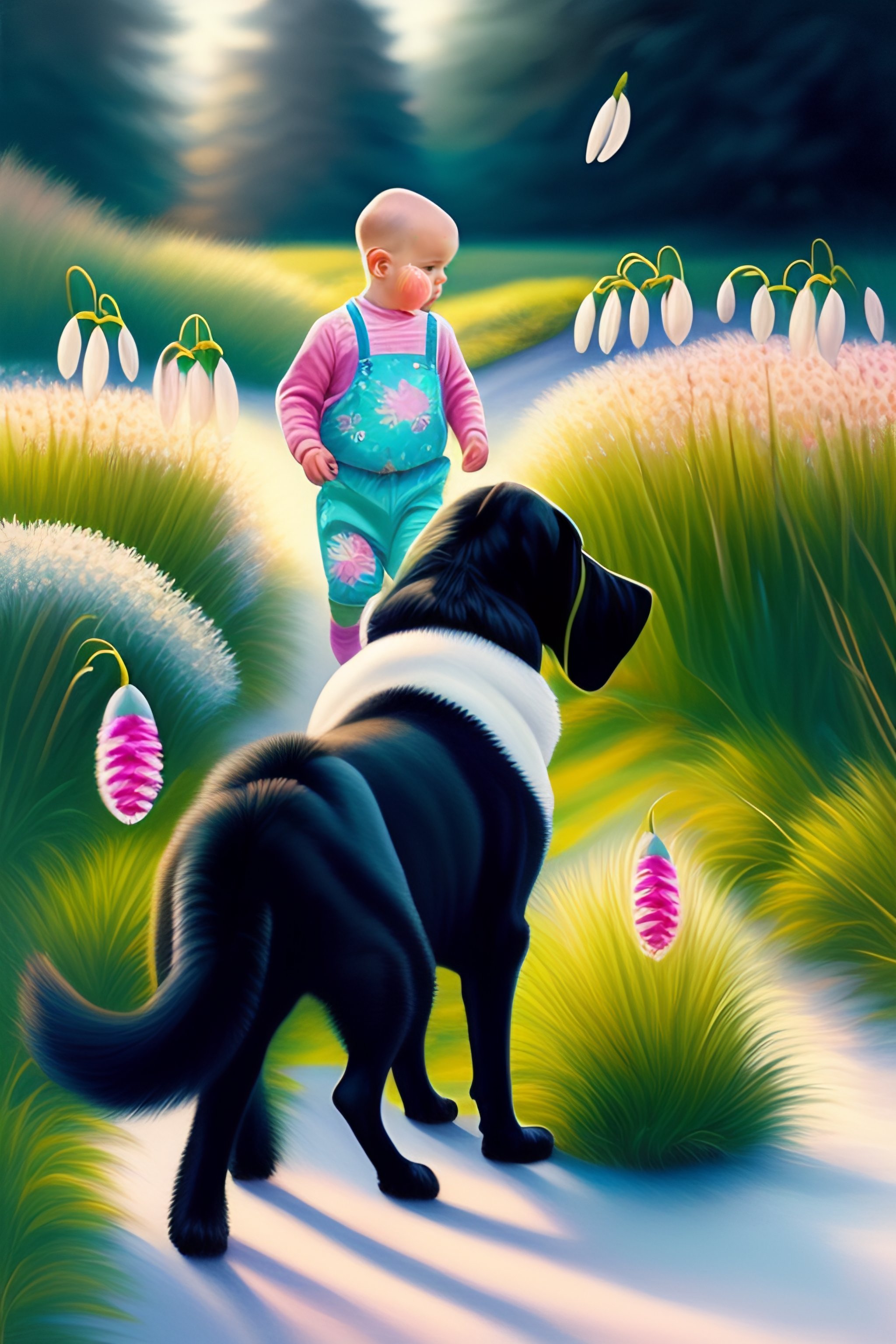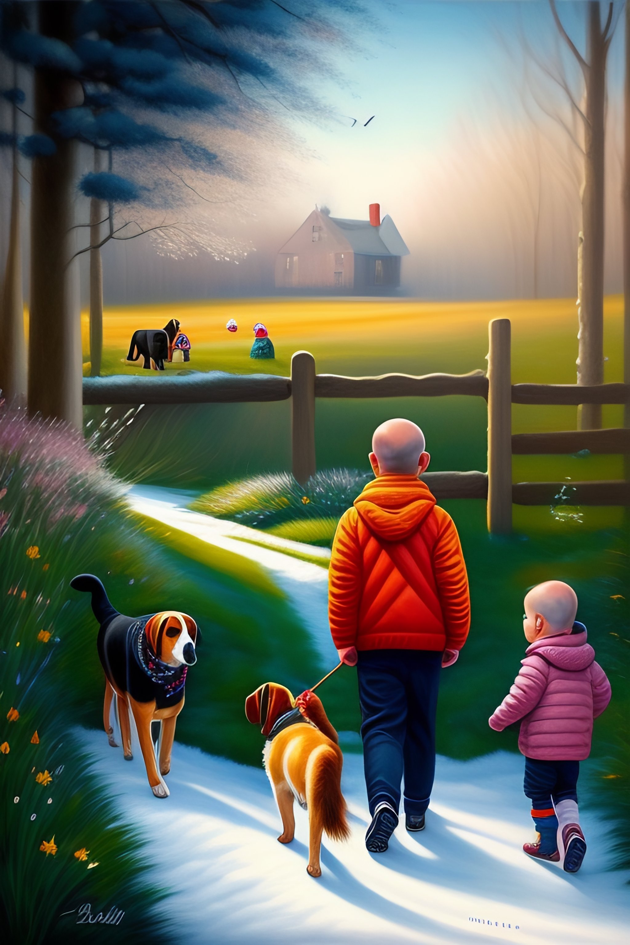 Old bald man, spring birthday party, invitation card, snowdrops, children, black labrador, trampoline, painting