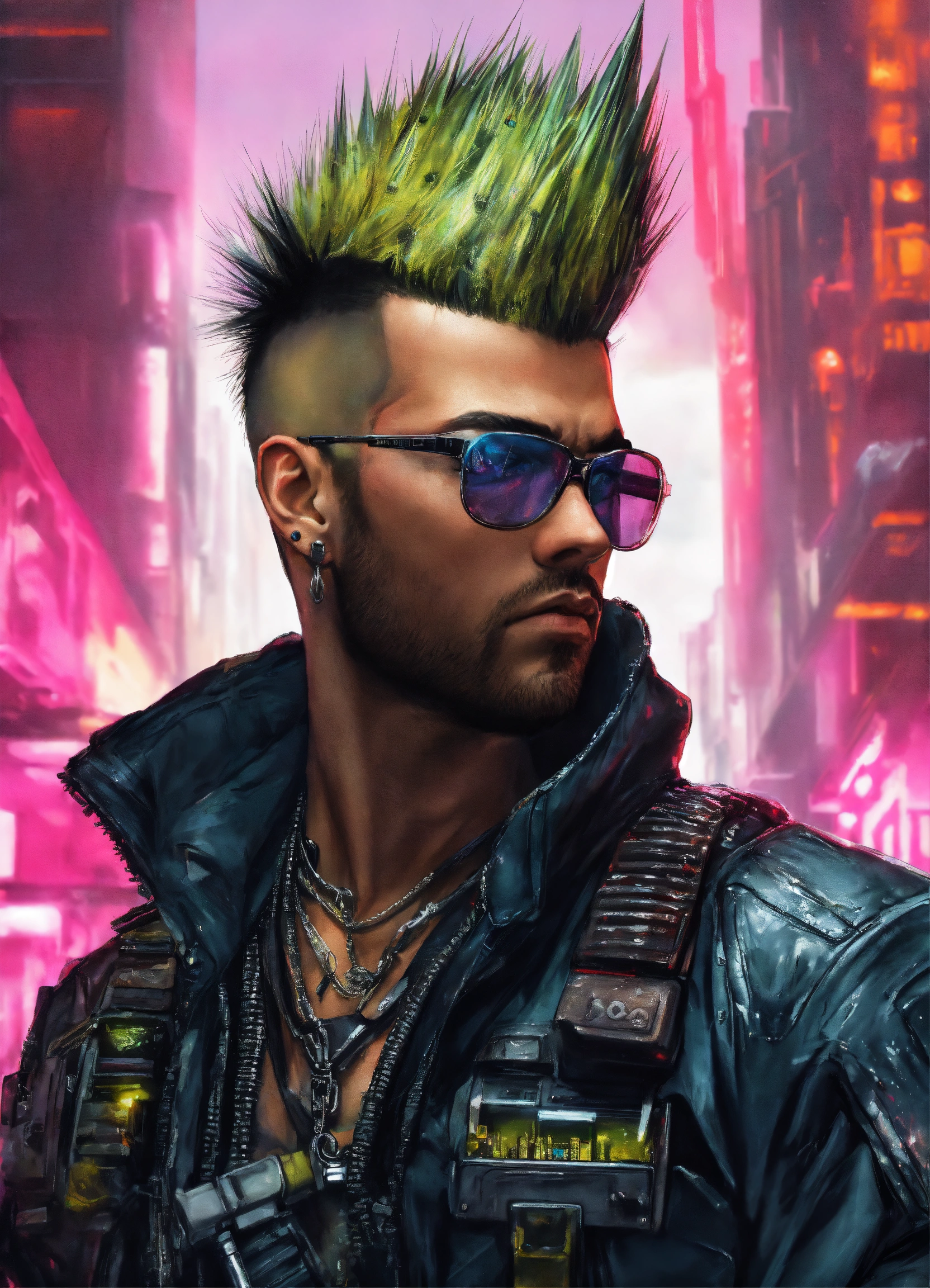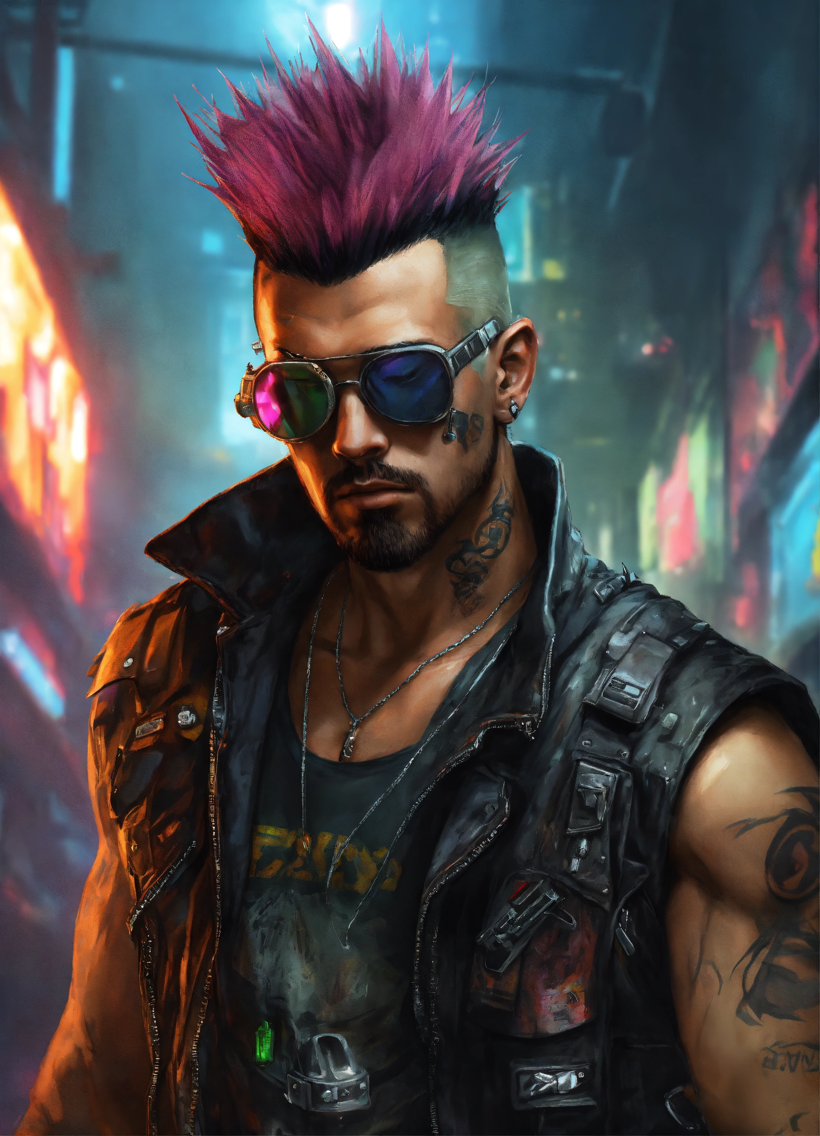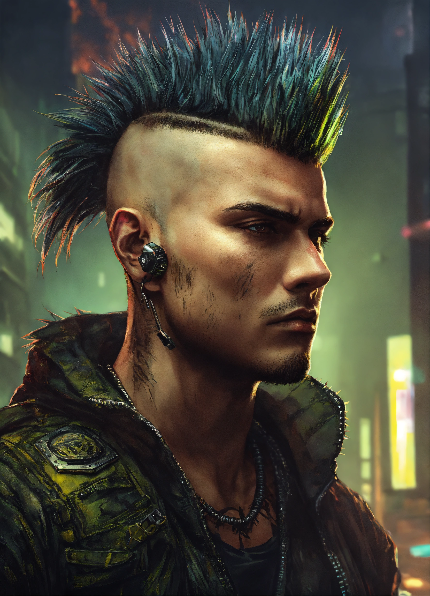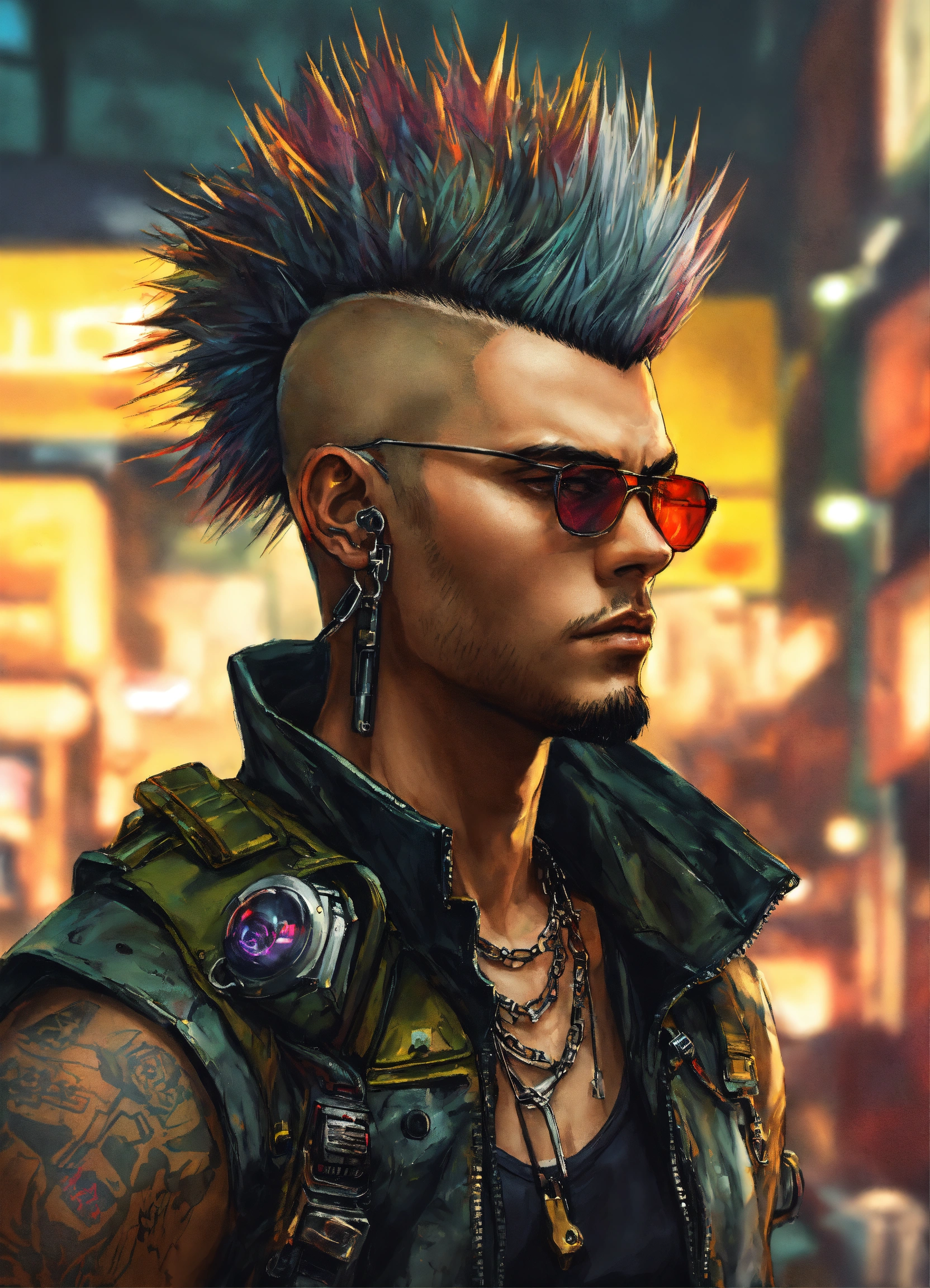 Cyberpunk mean gang member with spikey mohawk hair wearhouse gritty realistic comic book style