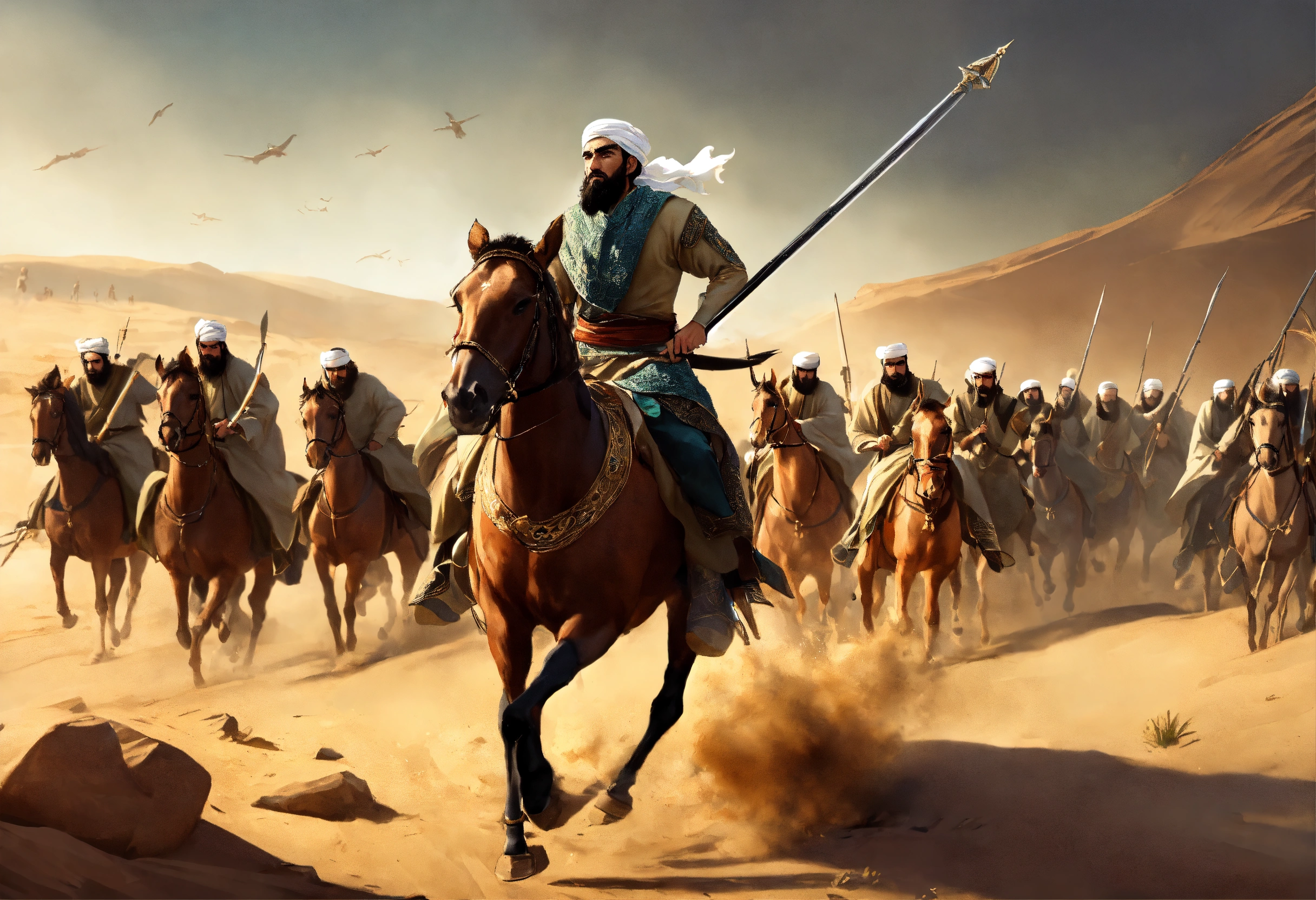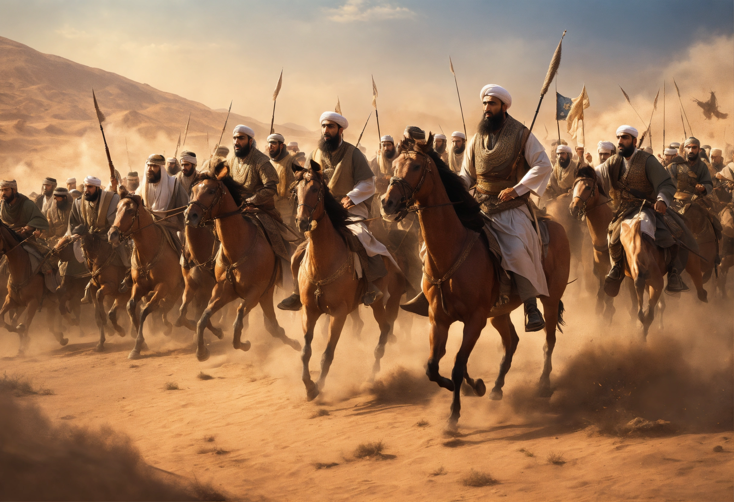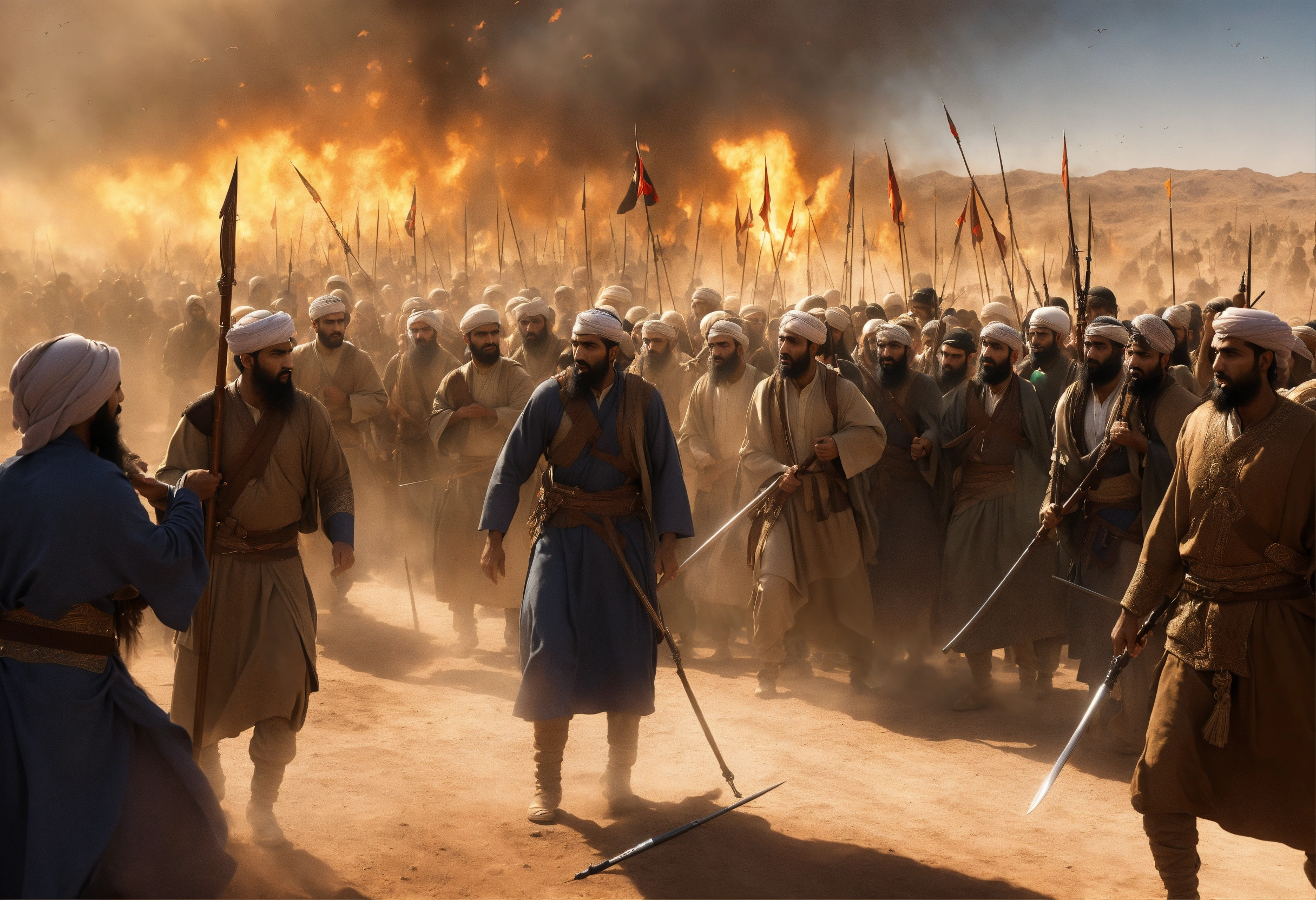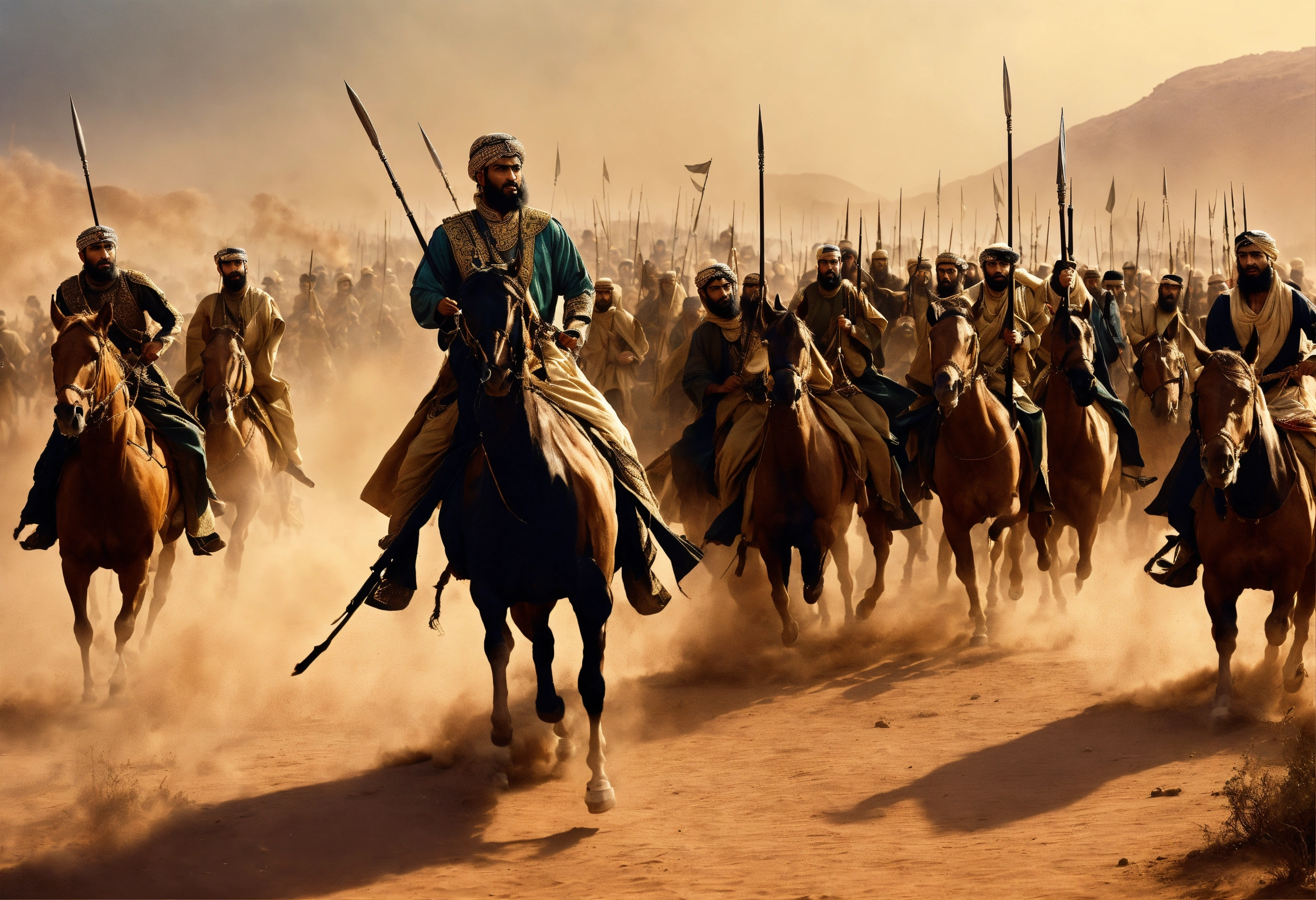 Illustrate the dramatic moment when the muslims unexpectedly come face to face with the quraysh army. showcase the quraysh leaders, abu jahl, abu lahab, and others, with an intense atmosphere.