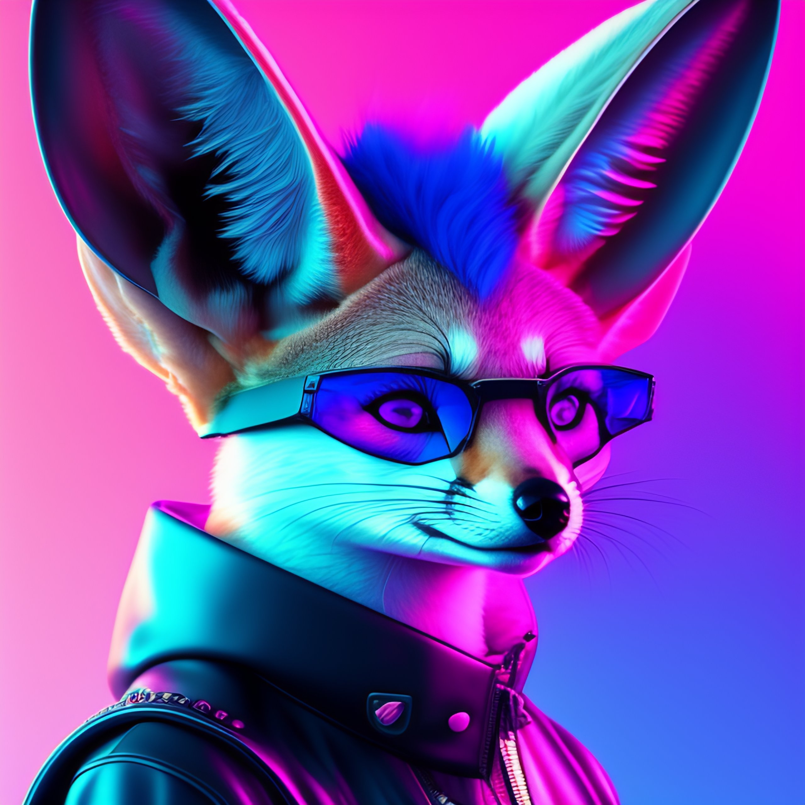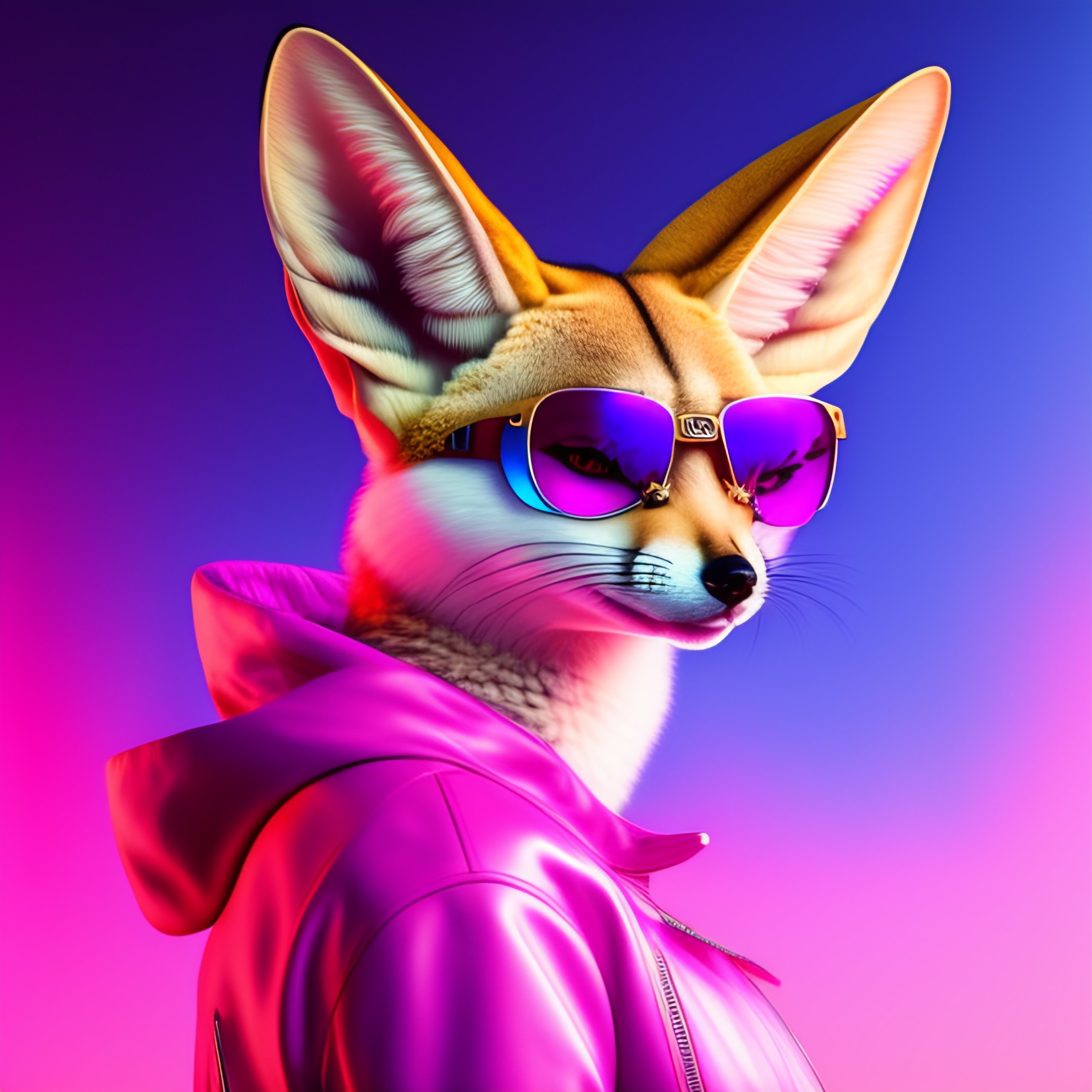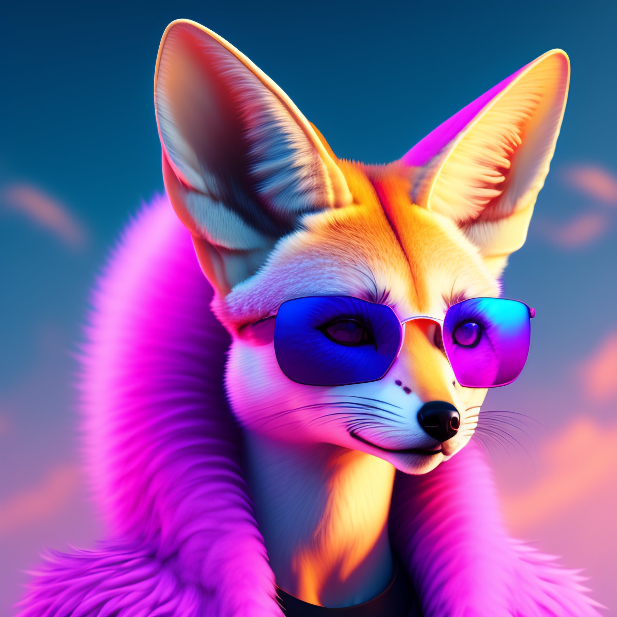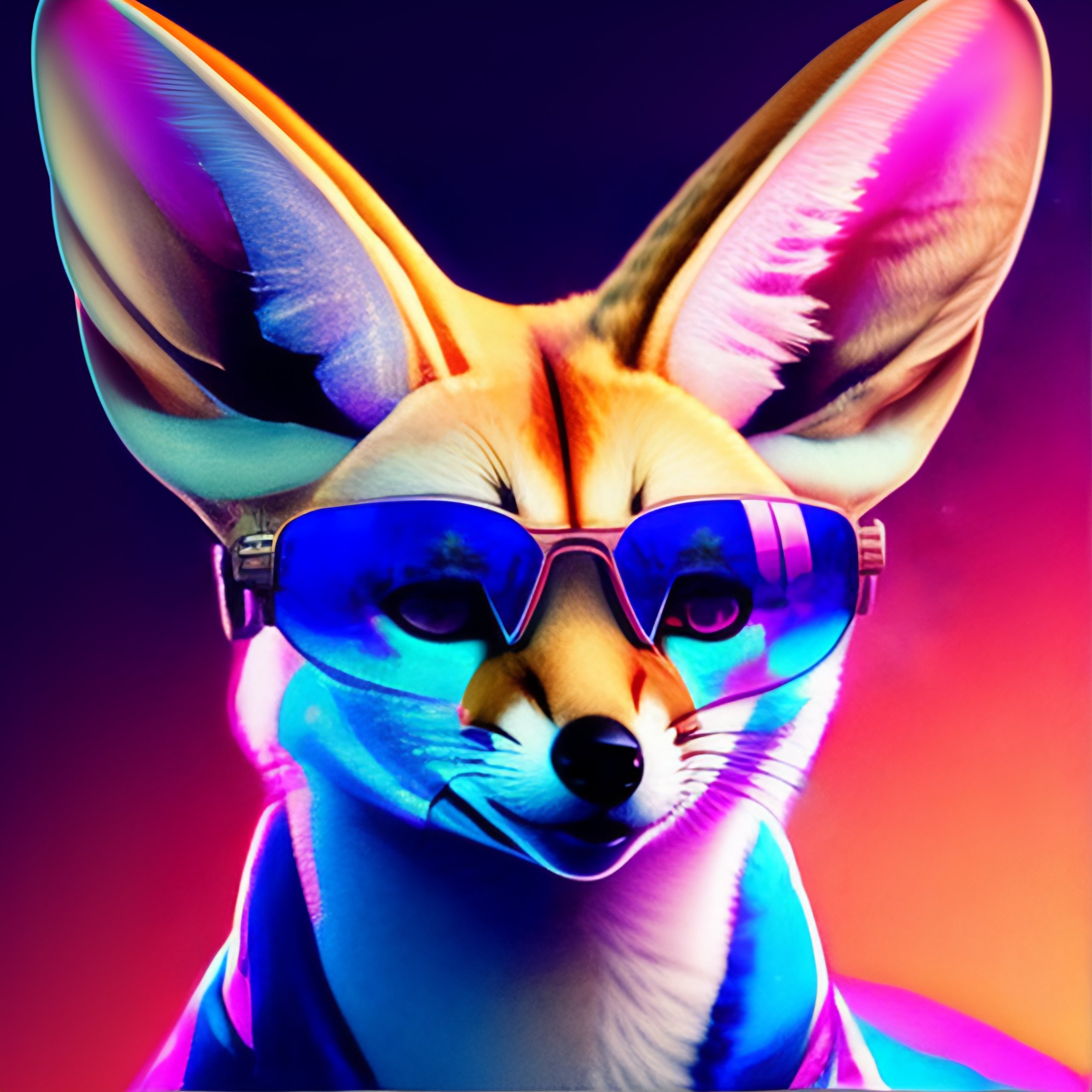 Fennec fox, pink and blue mohawk hairstyle, furry, aviator sunglasses, synthwave style, portrait, artstation, award winning, dramatic lighting