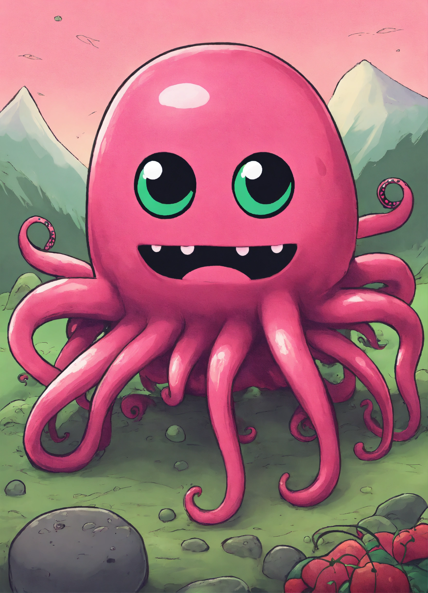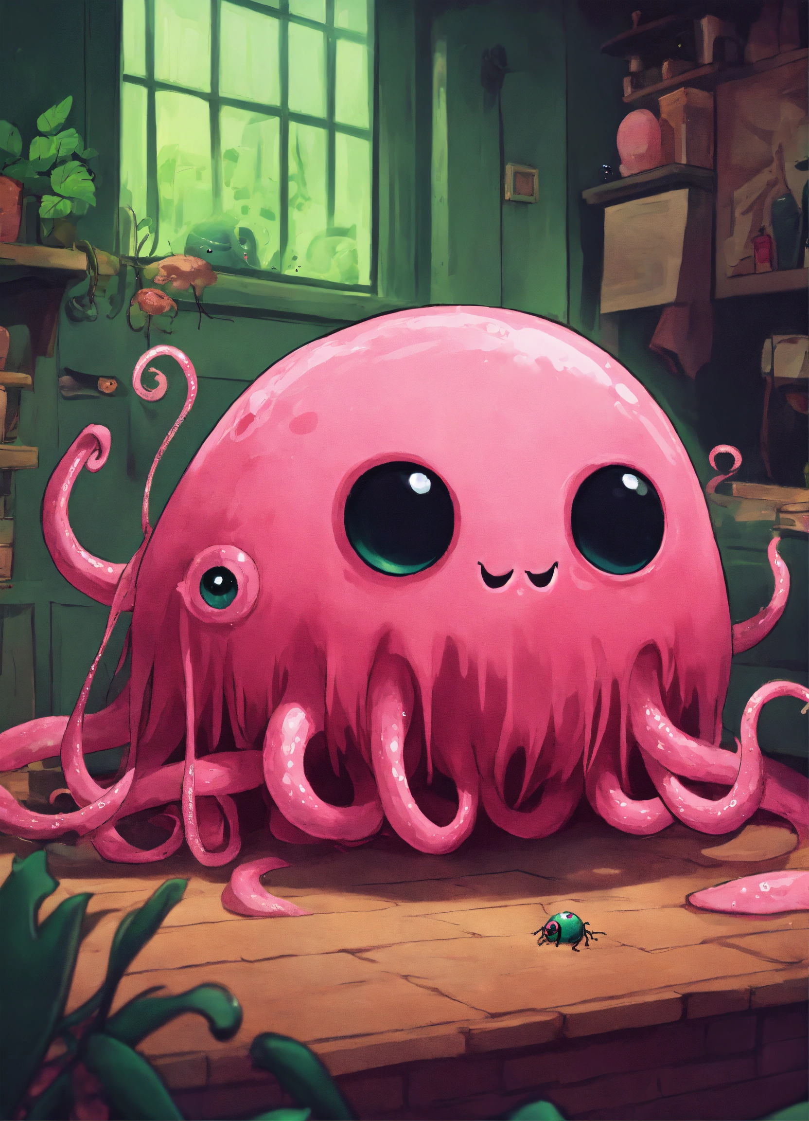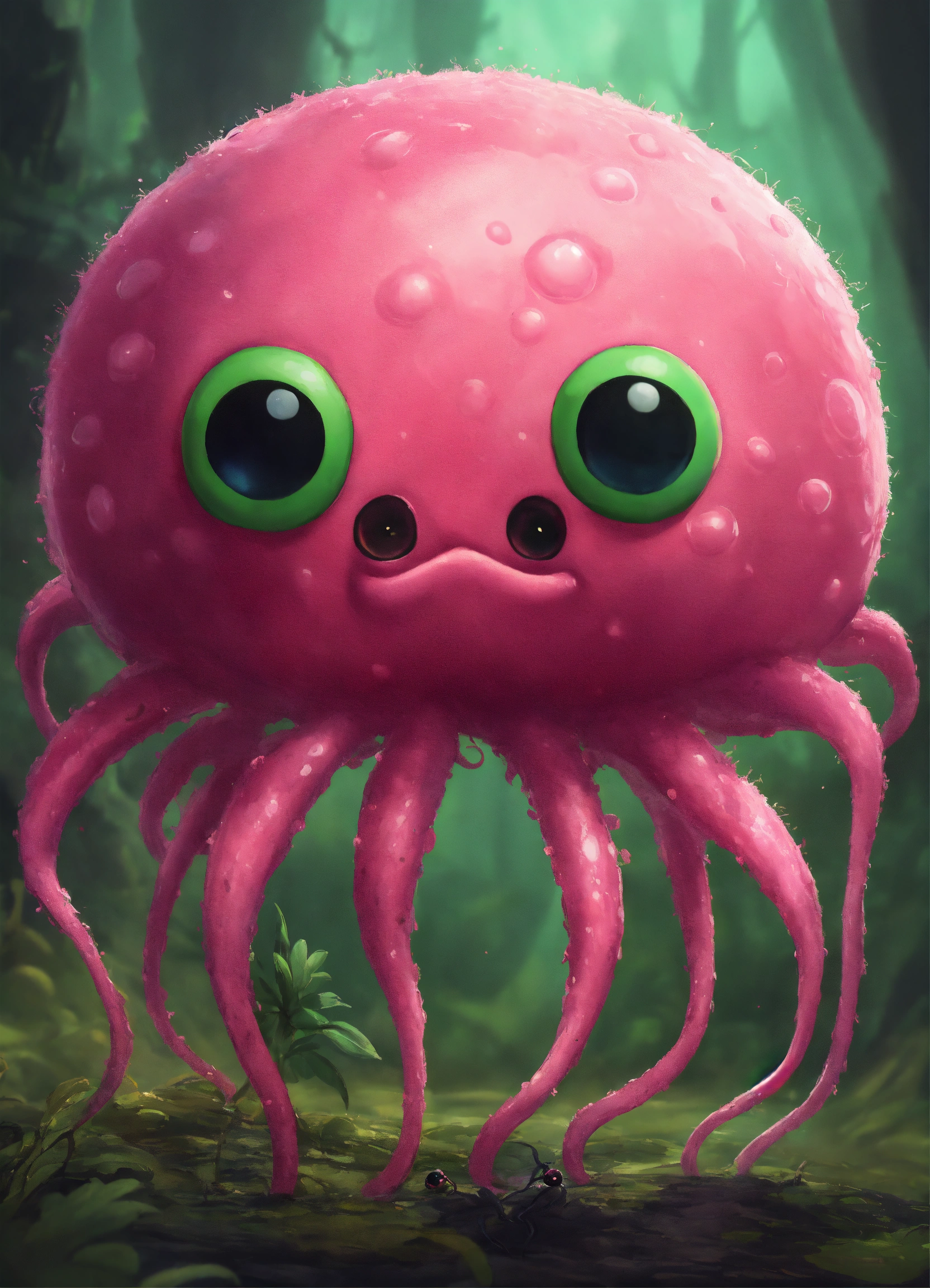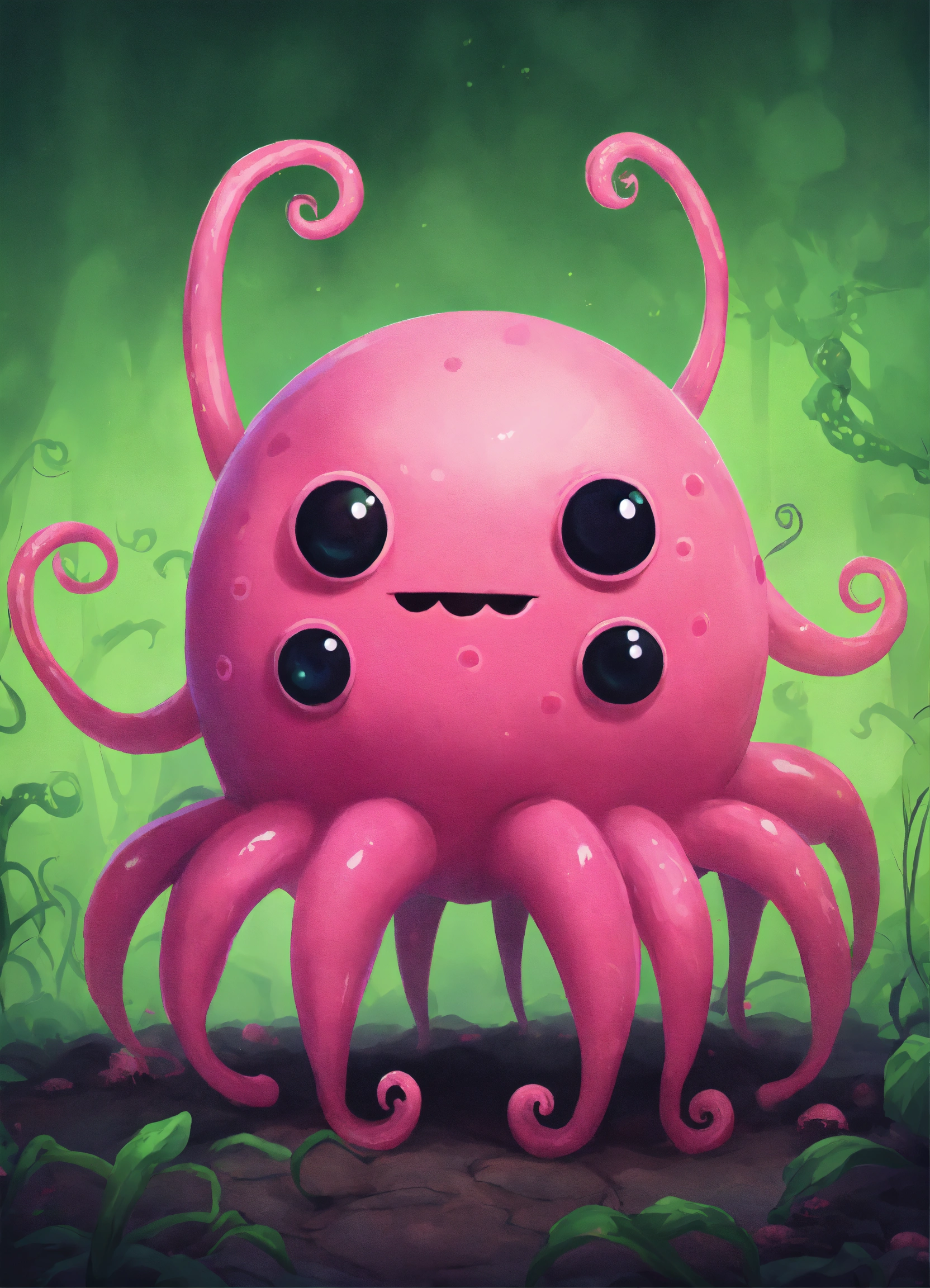 A kawaii pink blob monster with skinny green tentacles, it has five eyes, a black spider is crawling on it