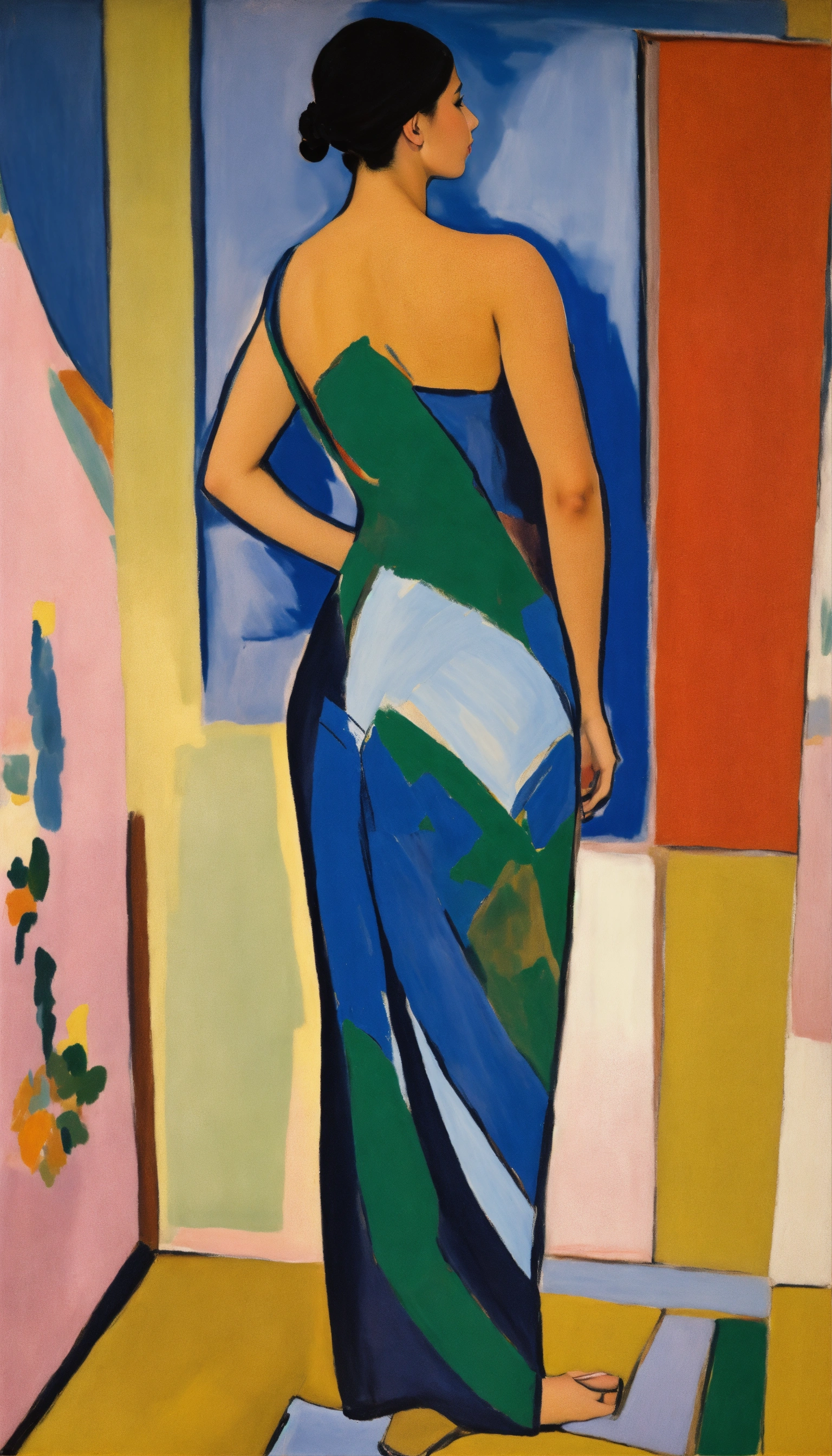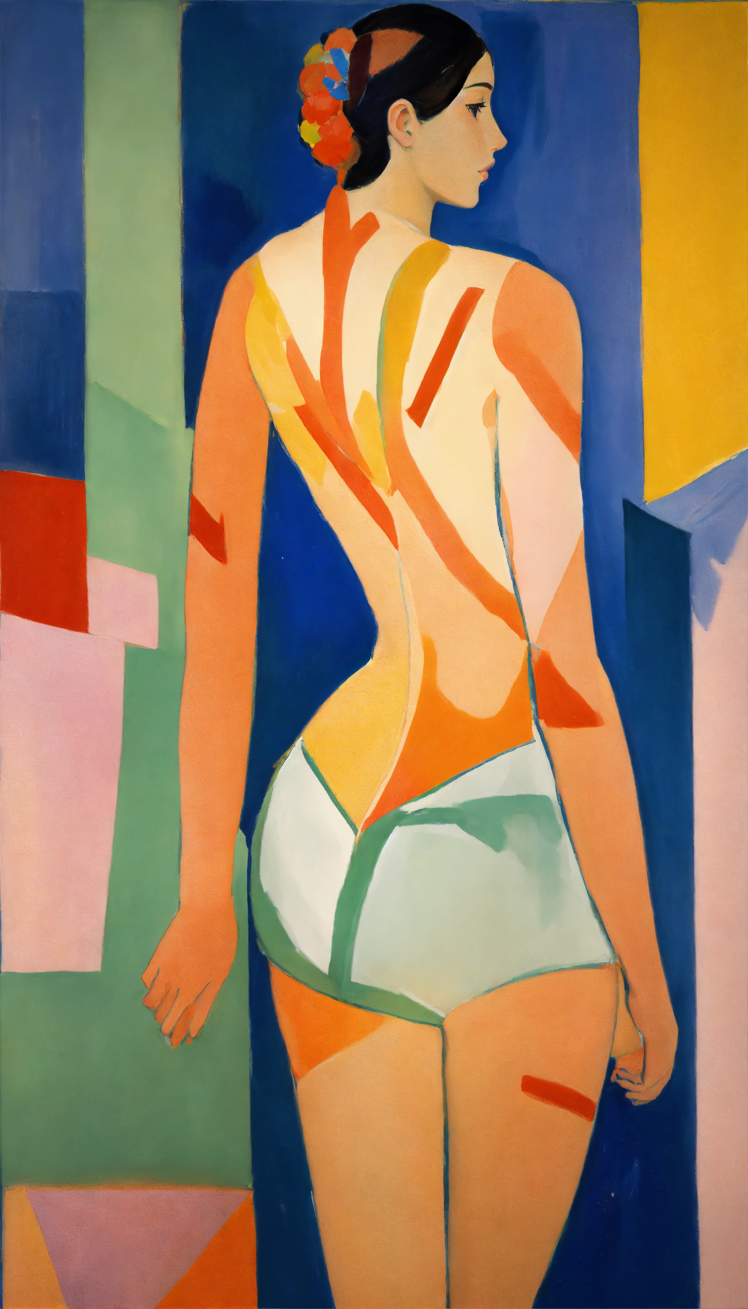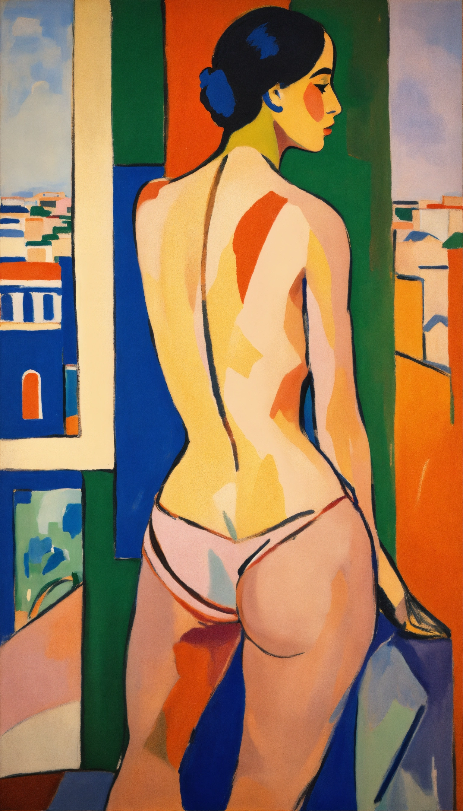 Young adult woman posed with her back facing the camera and looking over her shoulder, hellenic body, full body, painted by henri matisse kirchner, fallus, color blocks, skin, flat color, bare, dynamic pose, loosely realistic, skin is colored with simple abstract shapes, city, 24mm lens