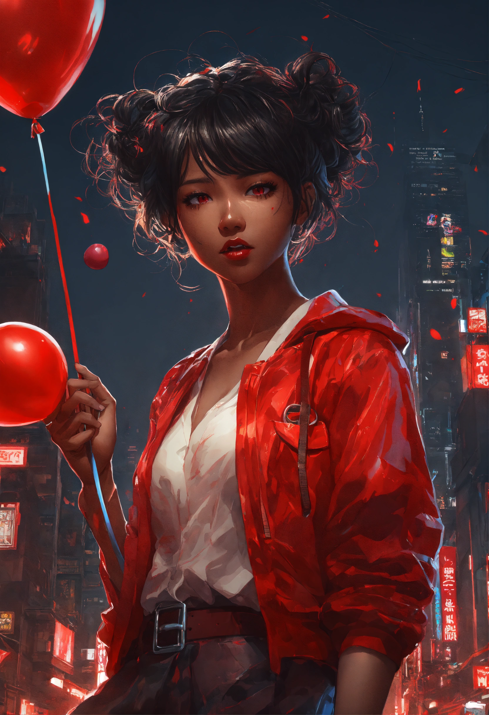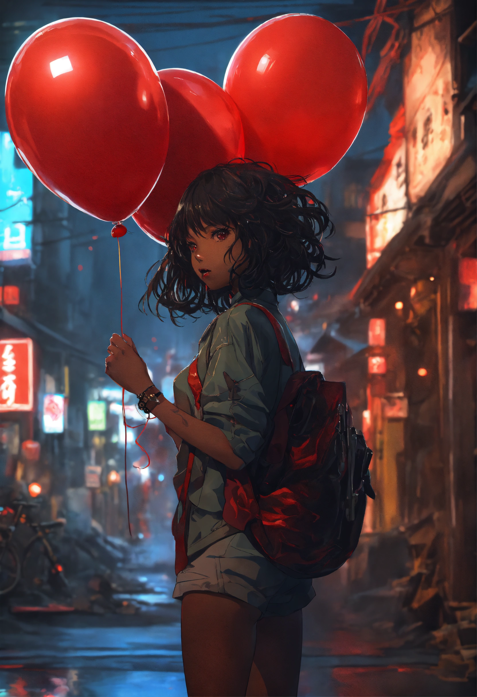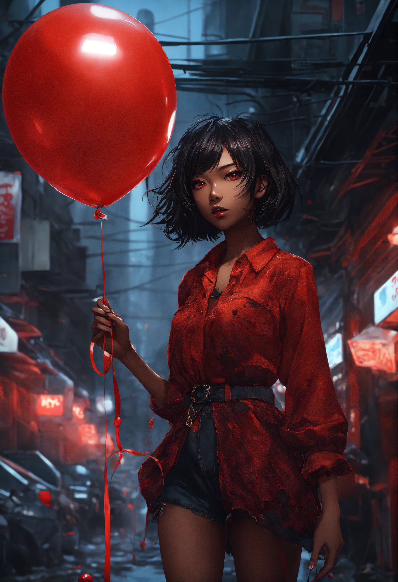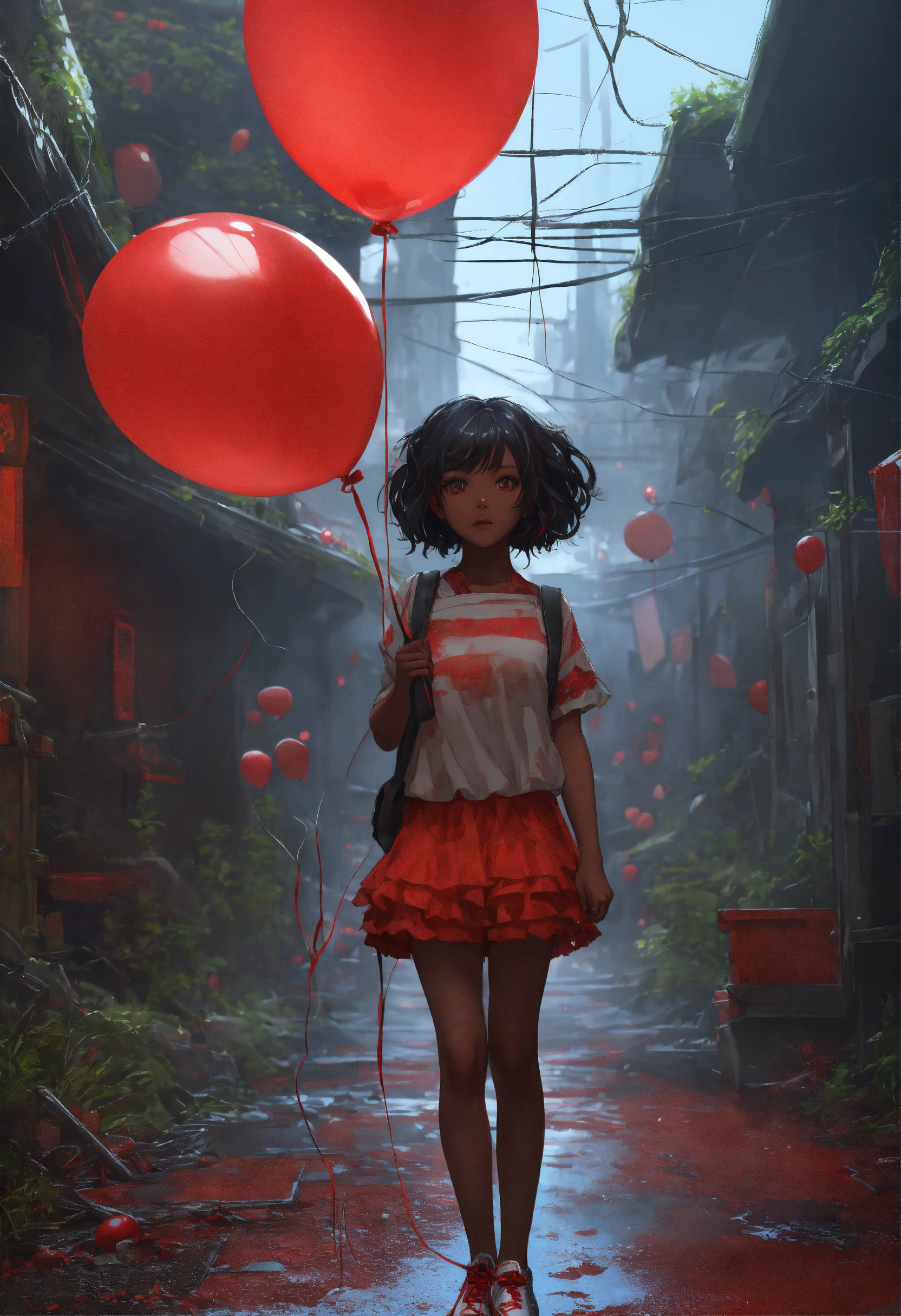 Dark aesthetic, a creepy figure of asian girl dark skin, messy hair, thin legs, holding a red balloon, scary, creepy, awesome fantasy illustration, dark details, attention to detail, fantasy, gamma monet murata artgerm katsuhiro otomo, highly detailed and intricately sharp focus, trending on pinterest vogue italia unreal engine 5, 4k uhd image