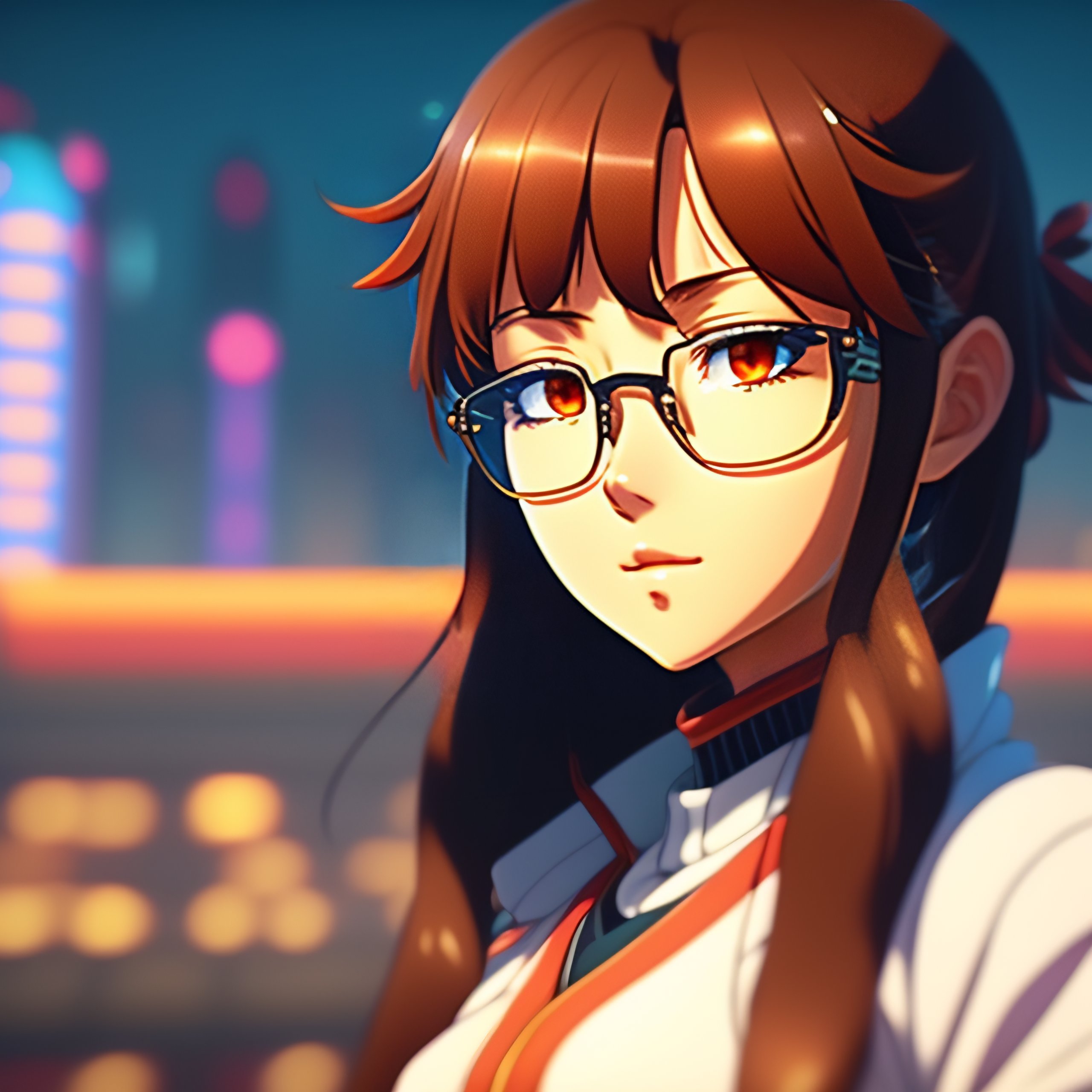 Anime girl with brown hair and brown eyes and round glasses, cyberpunk room landscape on the background, deep bokeh, close-up, anime masterpiece by studio ghibli. 8k, sharp high quality classic anime from 2000 in style of hayao miyazaki
