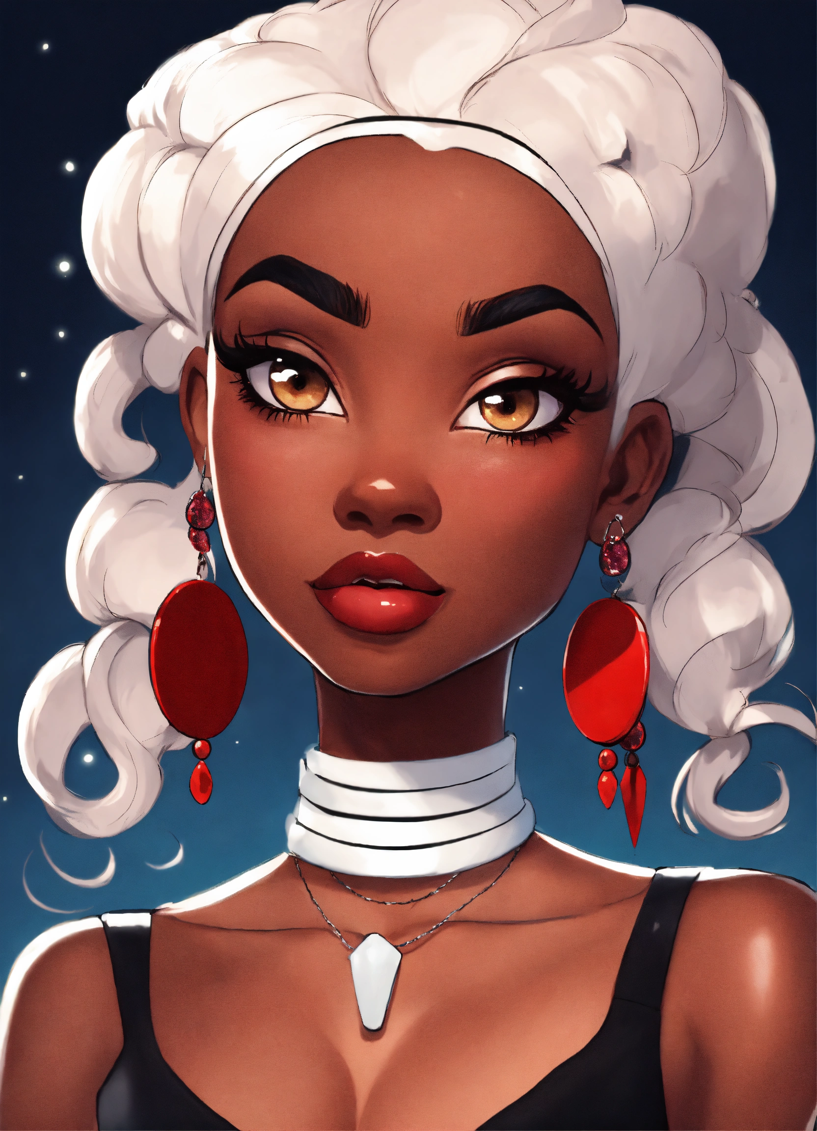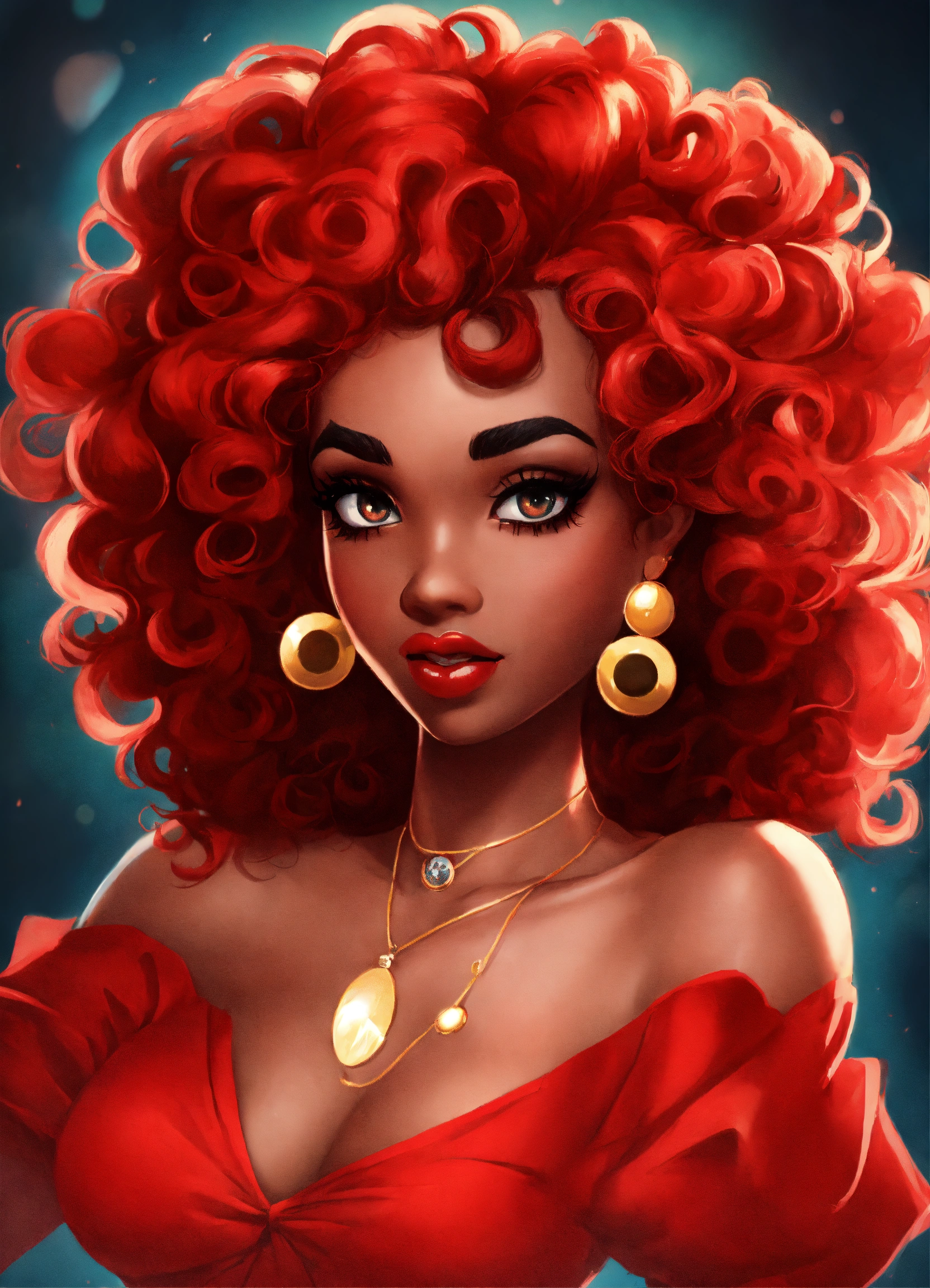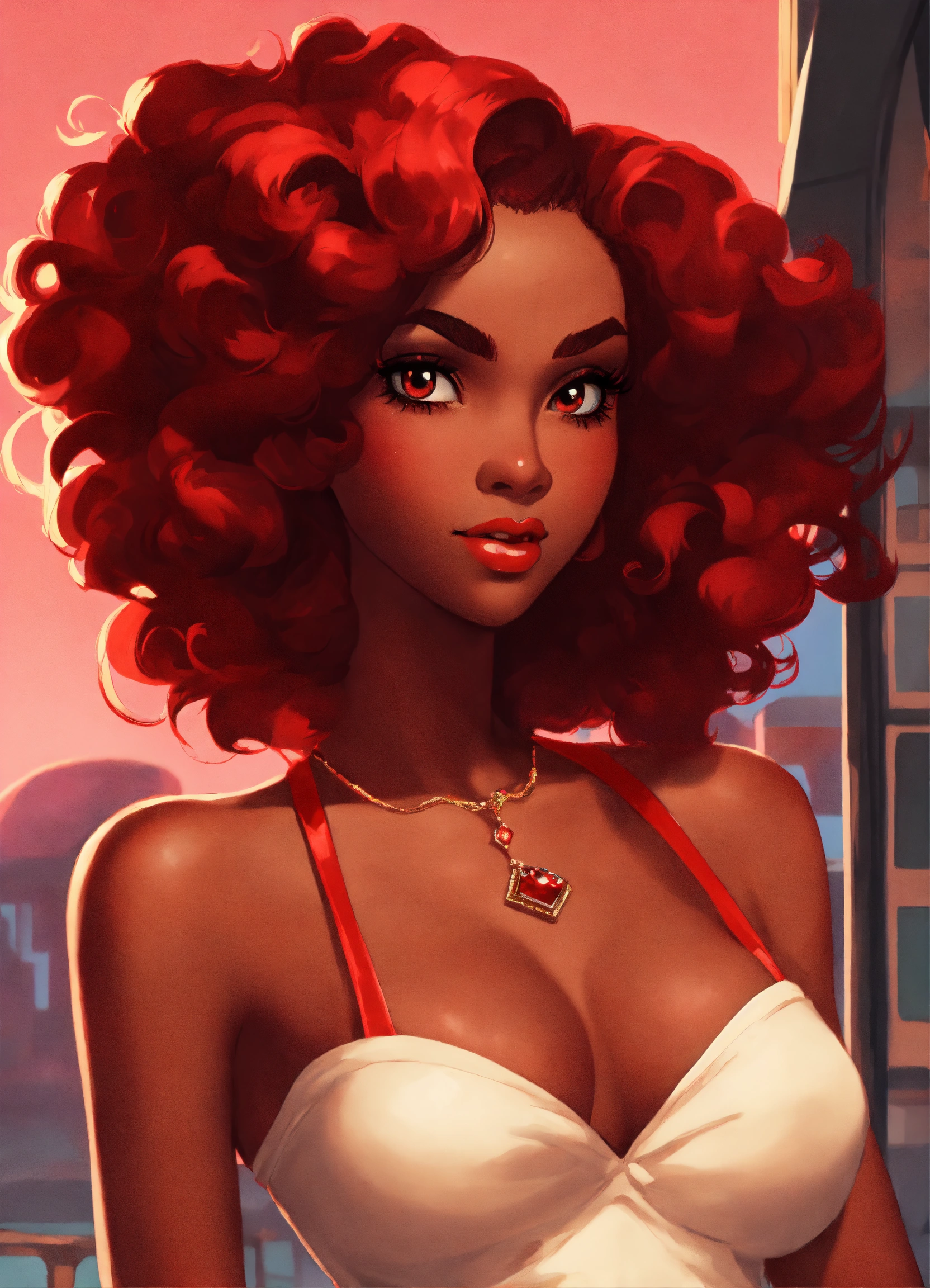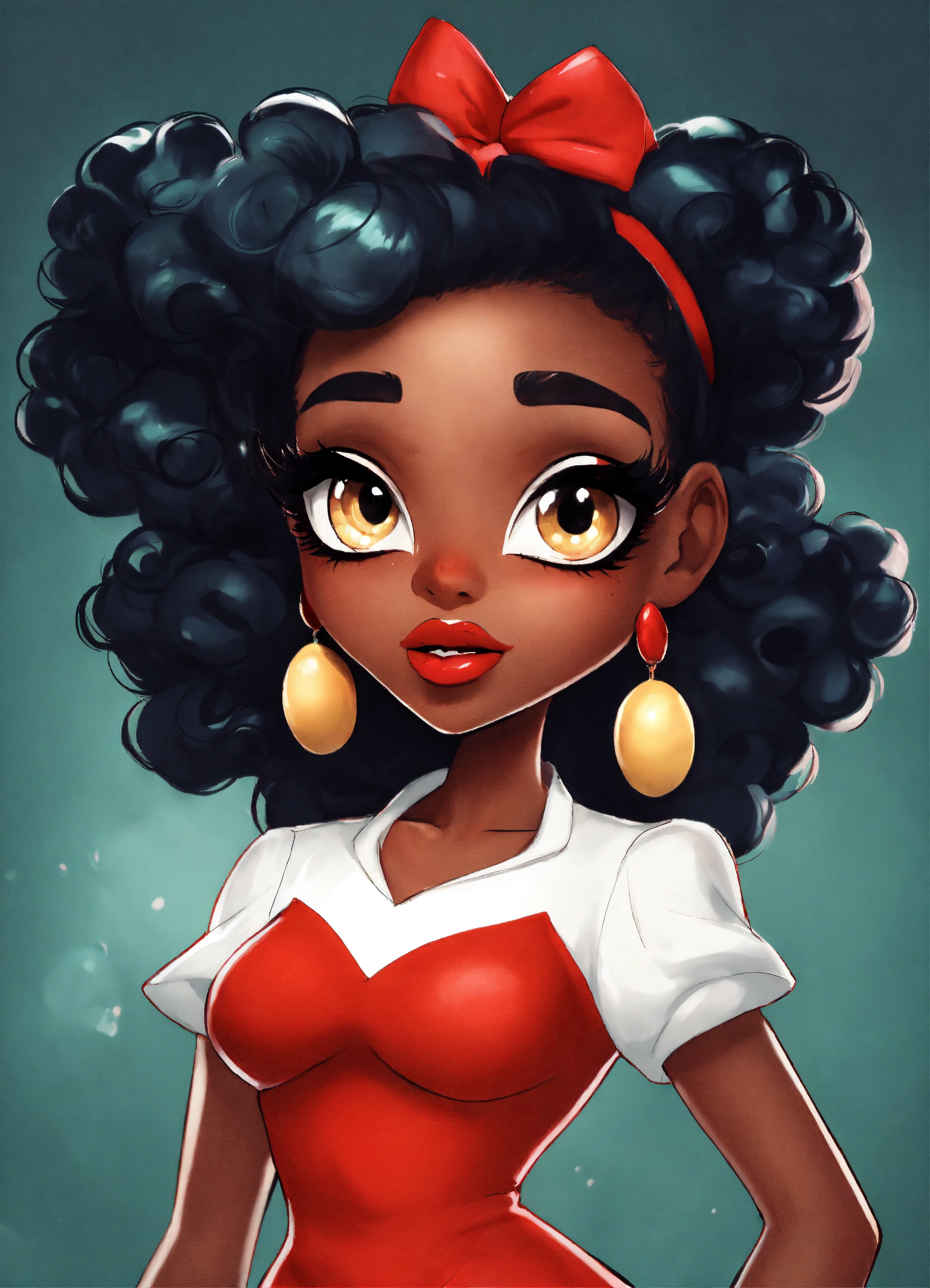 Create a stern powerpuff girl meets betty boop inspired black female character in white with oversized red flowing hair and big gorgeous eyes, retro 1940’s anime