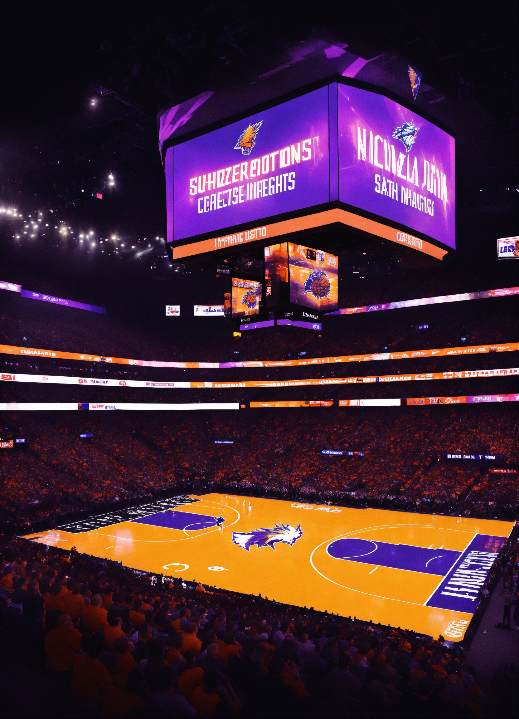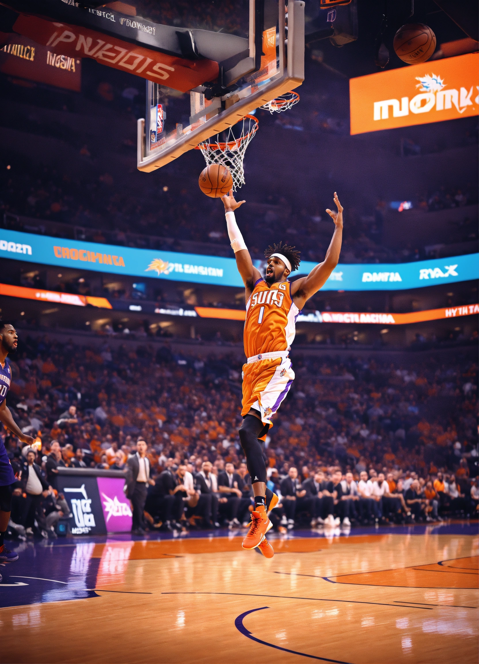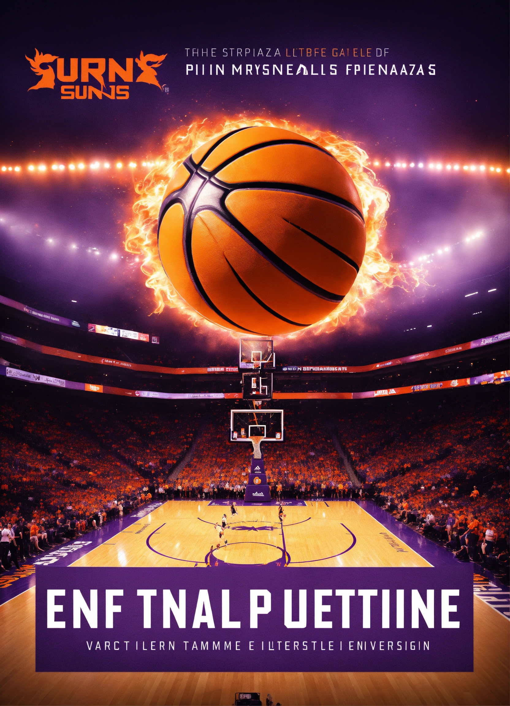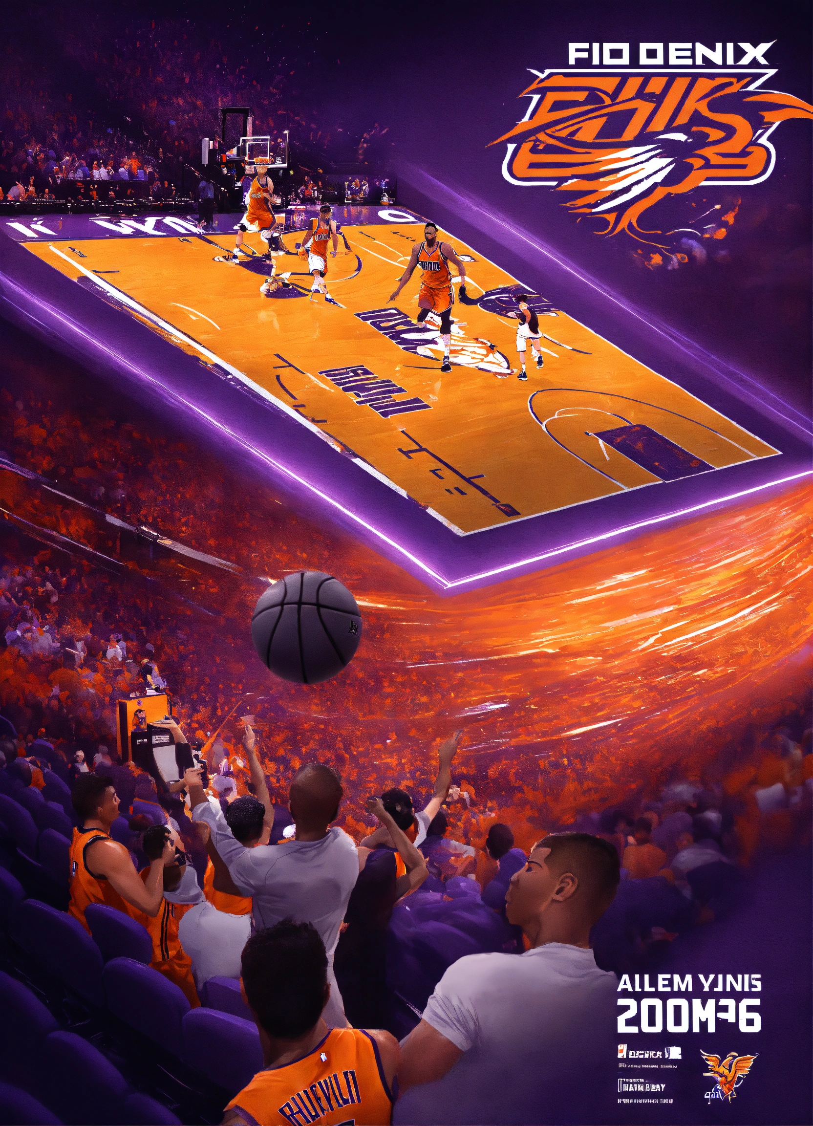 Design a cinematic poster that captures the magic and excitement of a phoenix suns game. combine dynamic player images, electrifying crowd shots, and data visualizations to illustrate how data-driven insights contribute to creating unforgettable entertainment experiences.