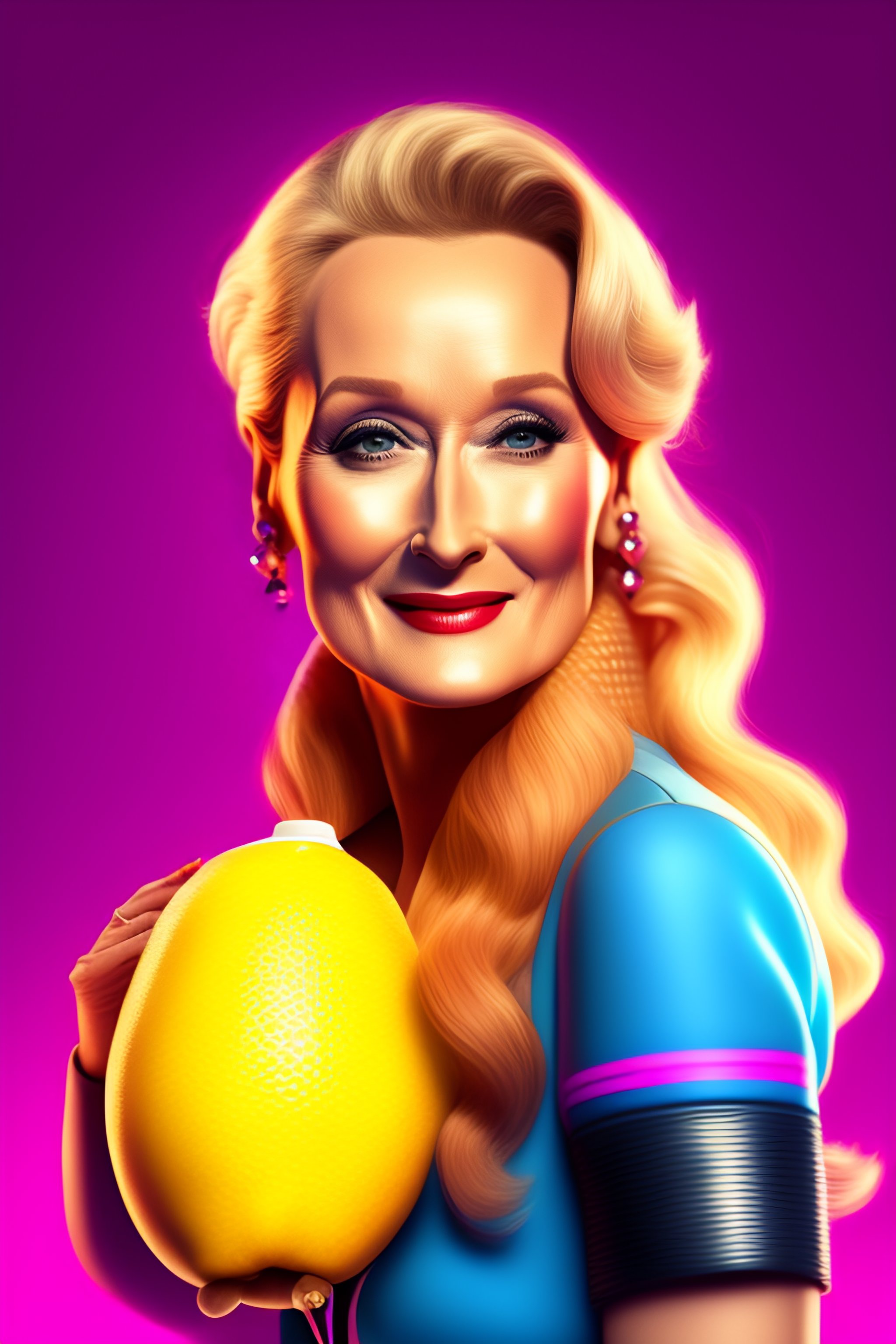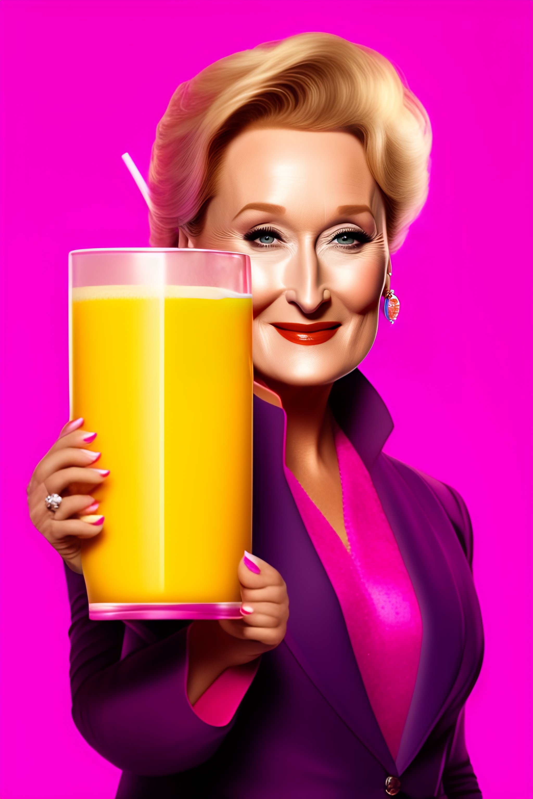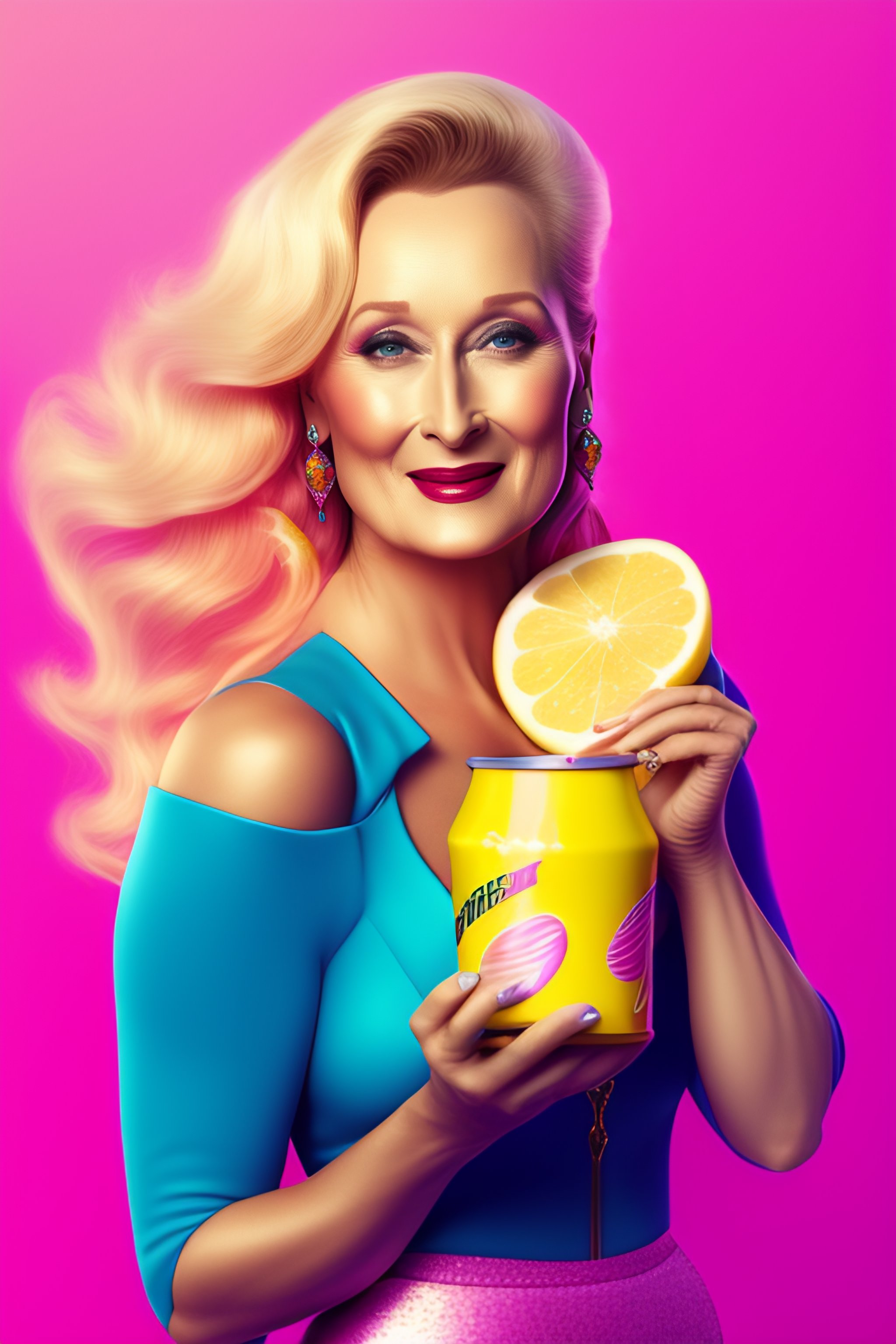 Baby baby meryl streep drinking a lemon energy drink with a pink background, moonwalker, render, rembrandt, cgsociety, artstation trending, highly detailed