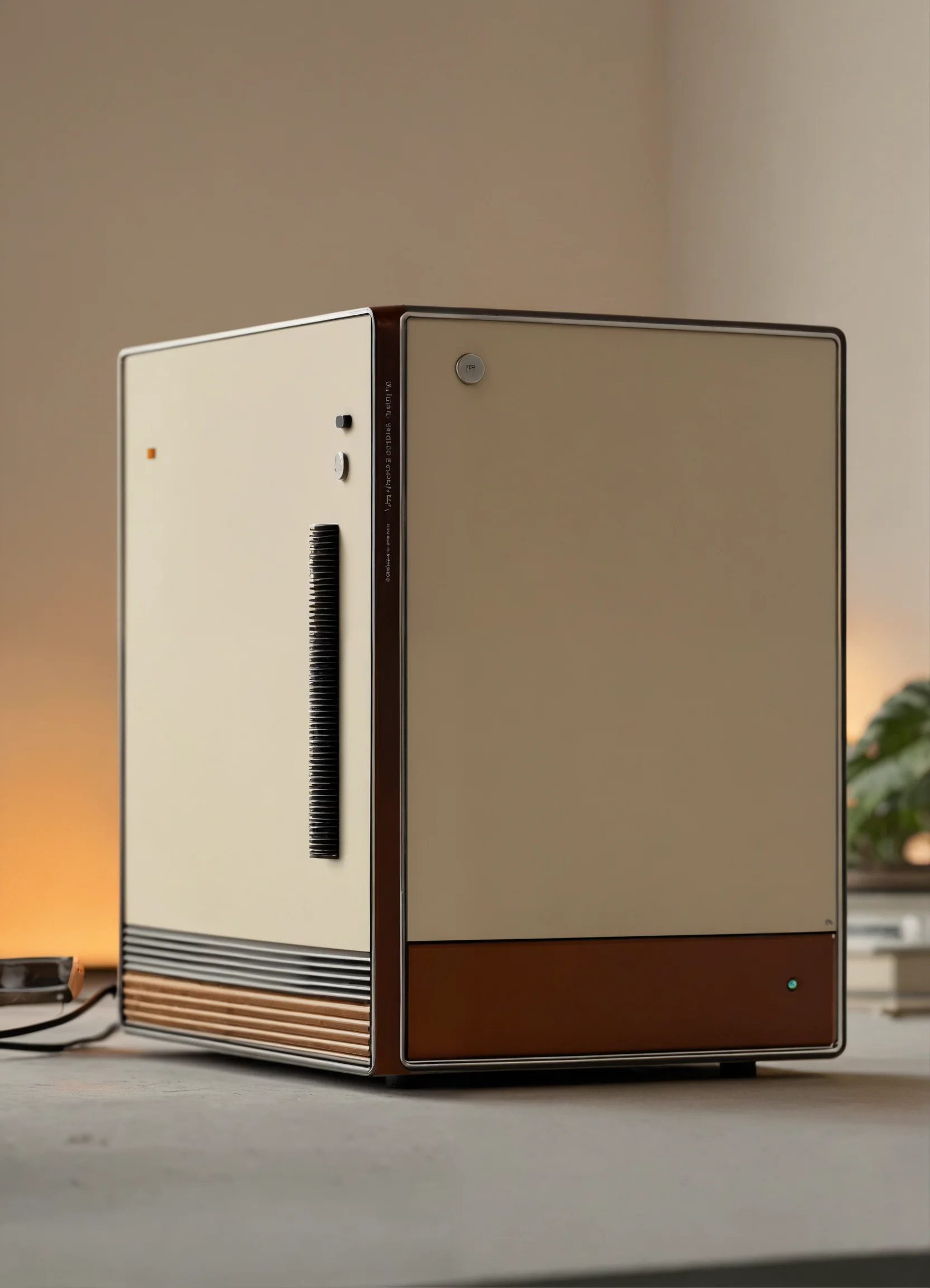 A stunning minimal pc case designed by dieter rams, braun. product ad with retro industrial design inspiration, warm retro natural lighting.