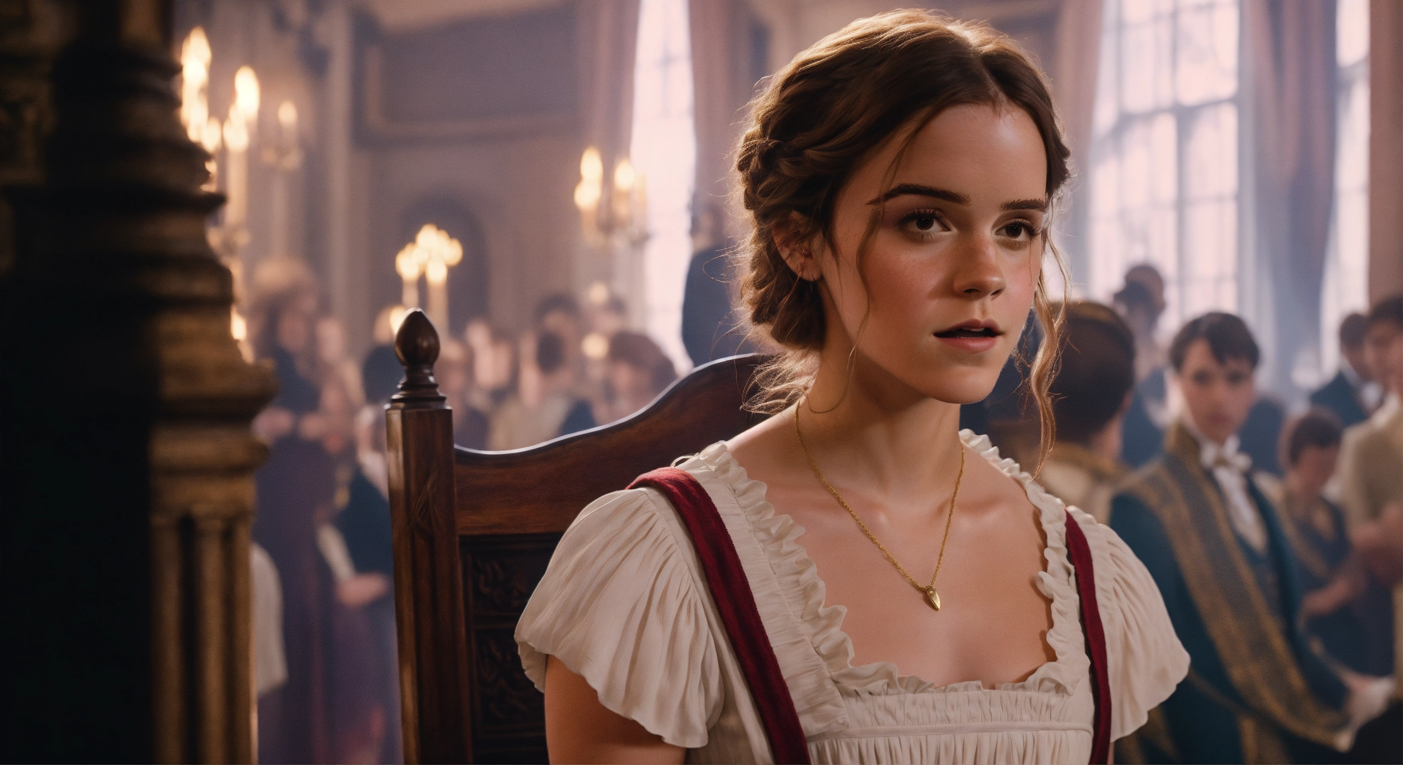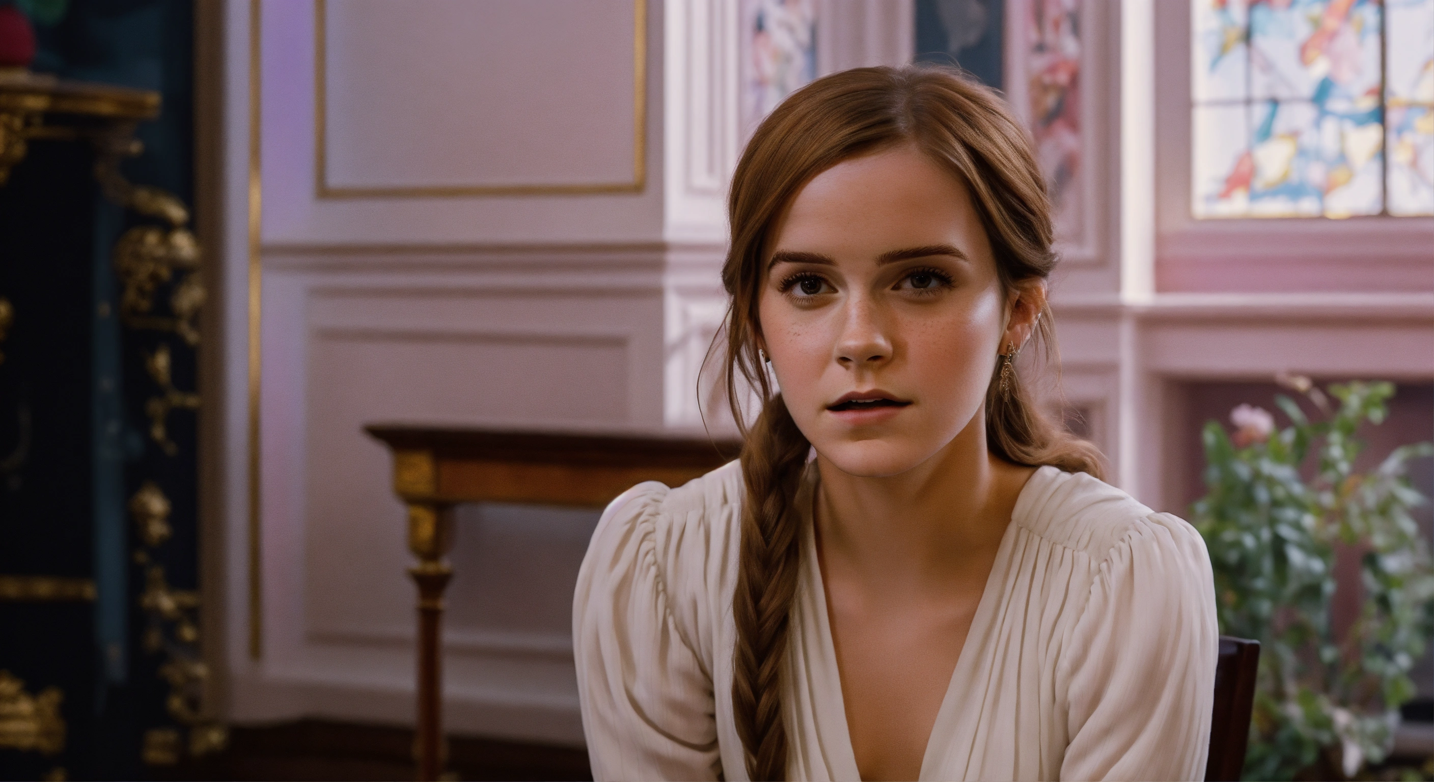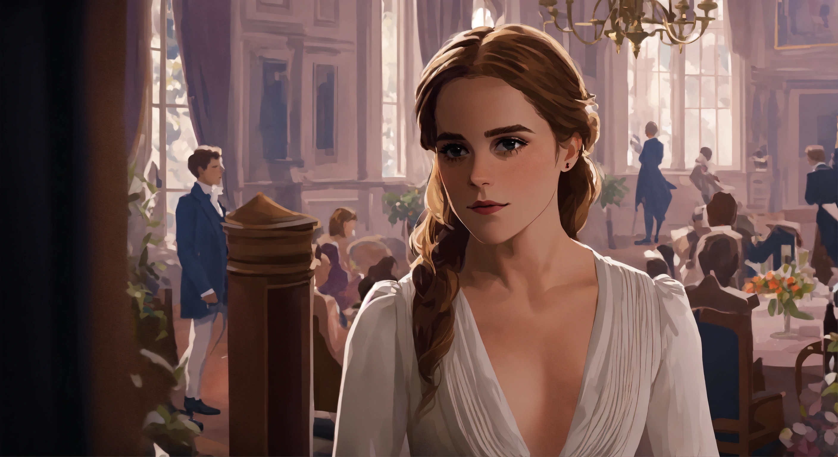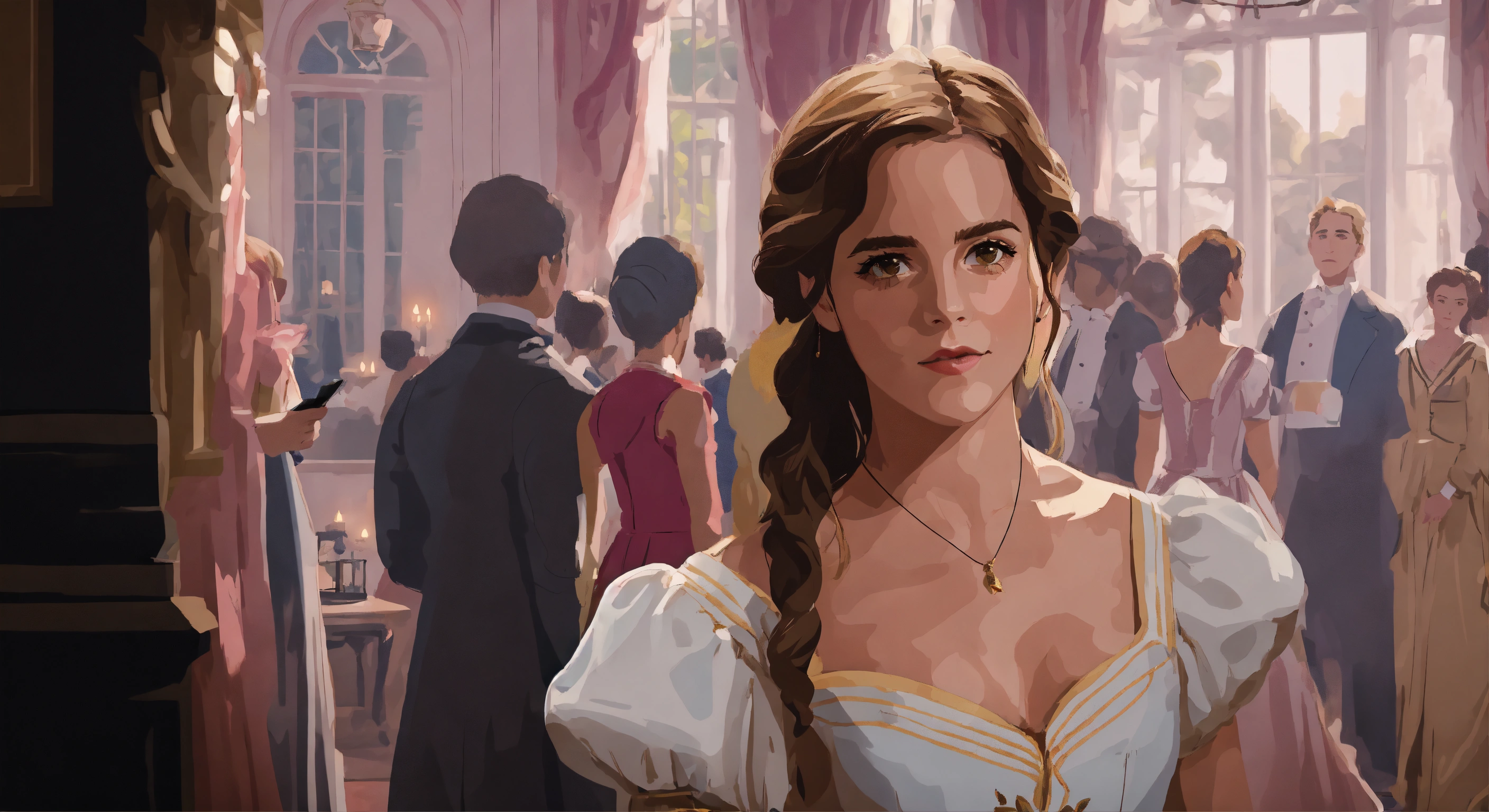 Movie scene of emma watson as hermione granger in a white regency dress indoors a sophisticated country estate. flat design poster, not too complex, modern, 4k, epic composition, flat vector art illustration, very realistic, vibrant colours, long shot