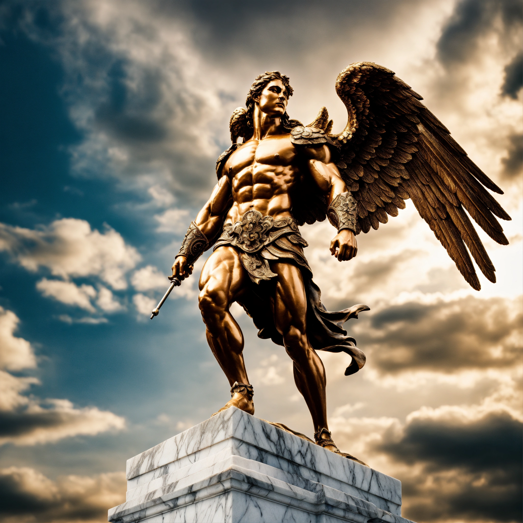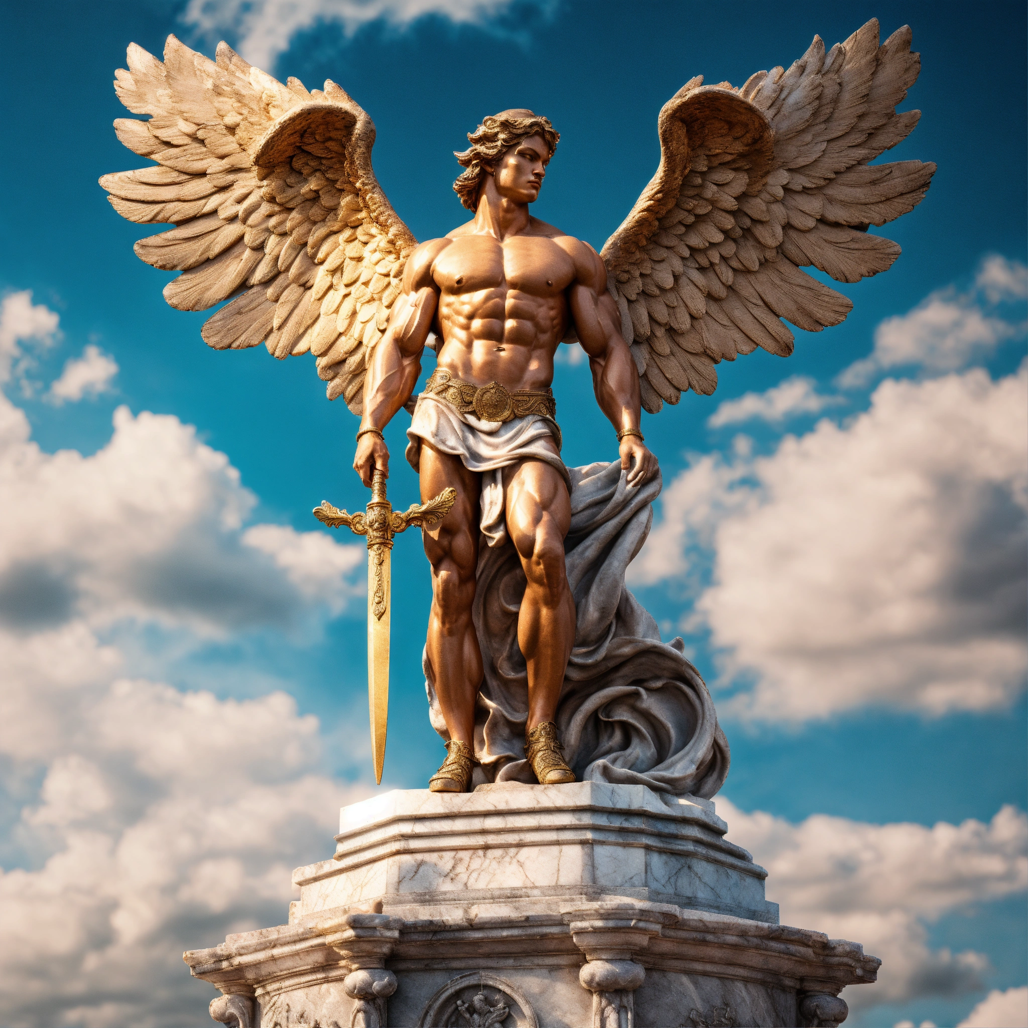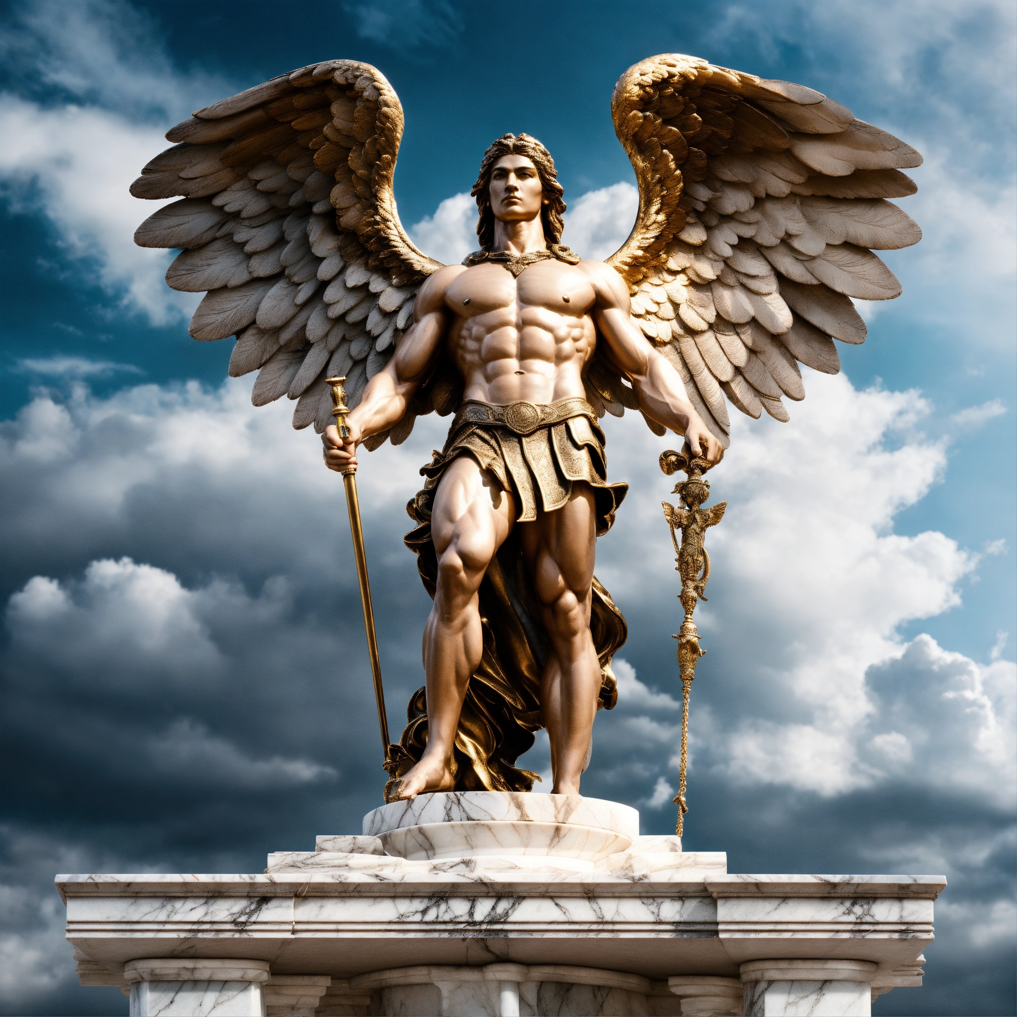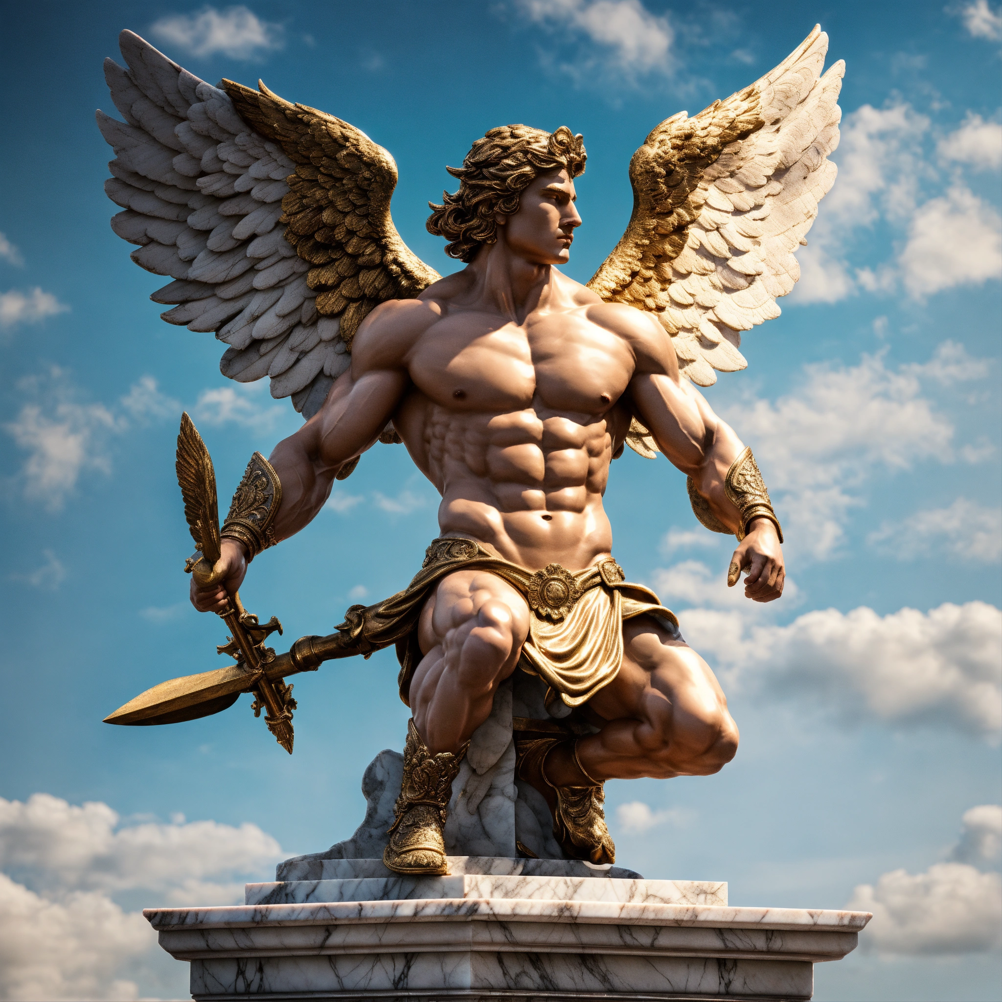 Full body sculpture of a muscular warrior celestial angel on top of a marble base ultra realistic ultra definition 32k photography style, sky background with clouds
