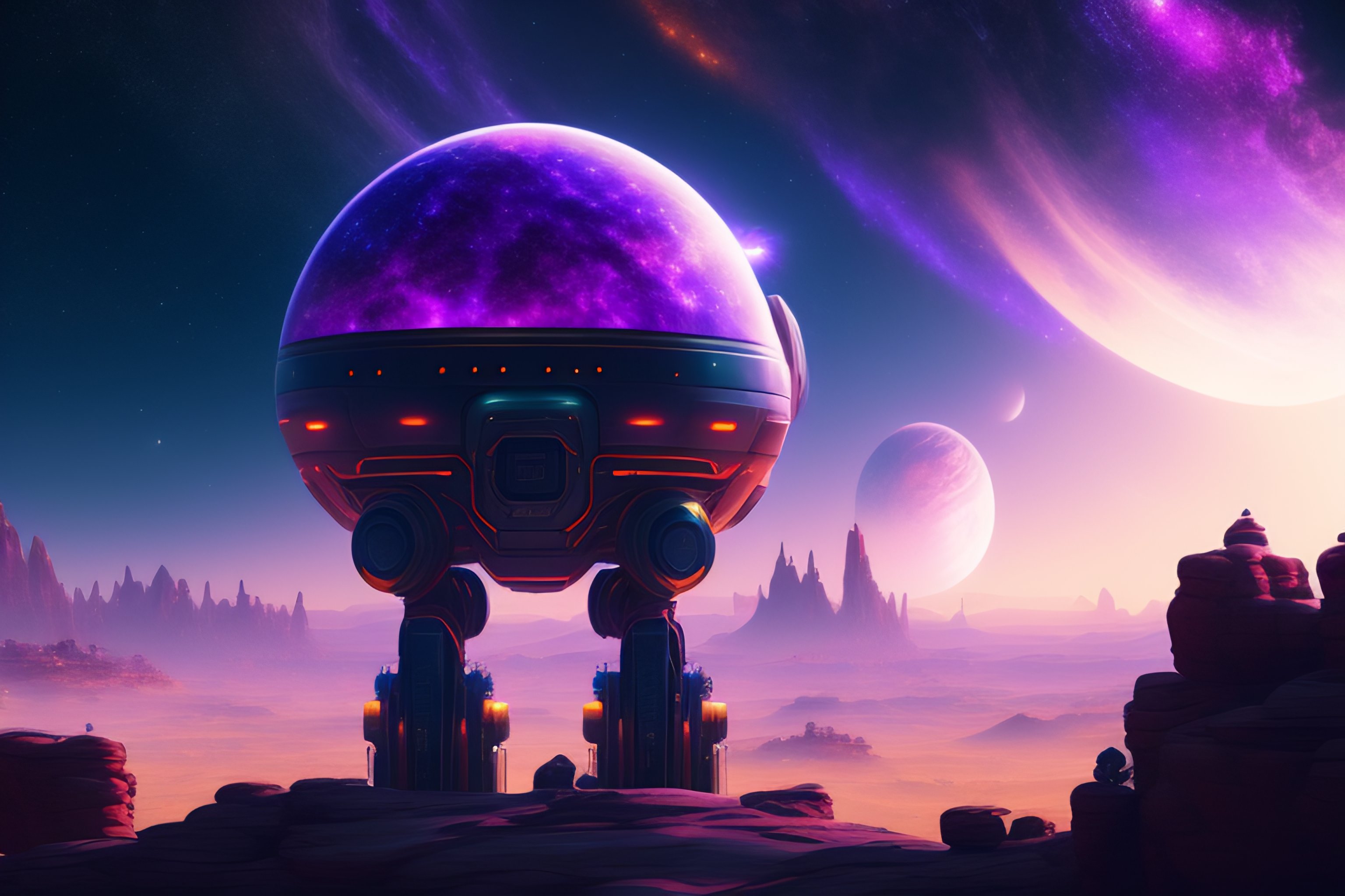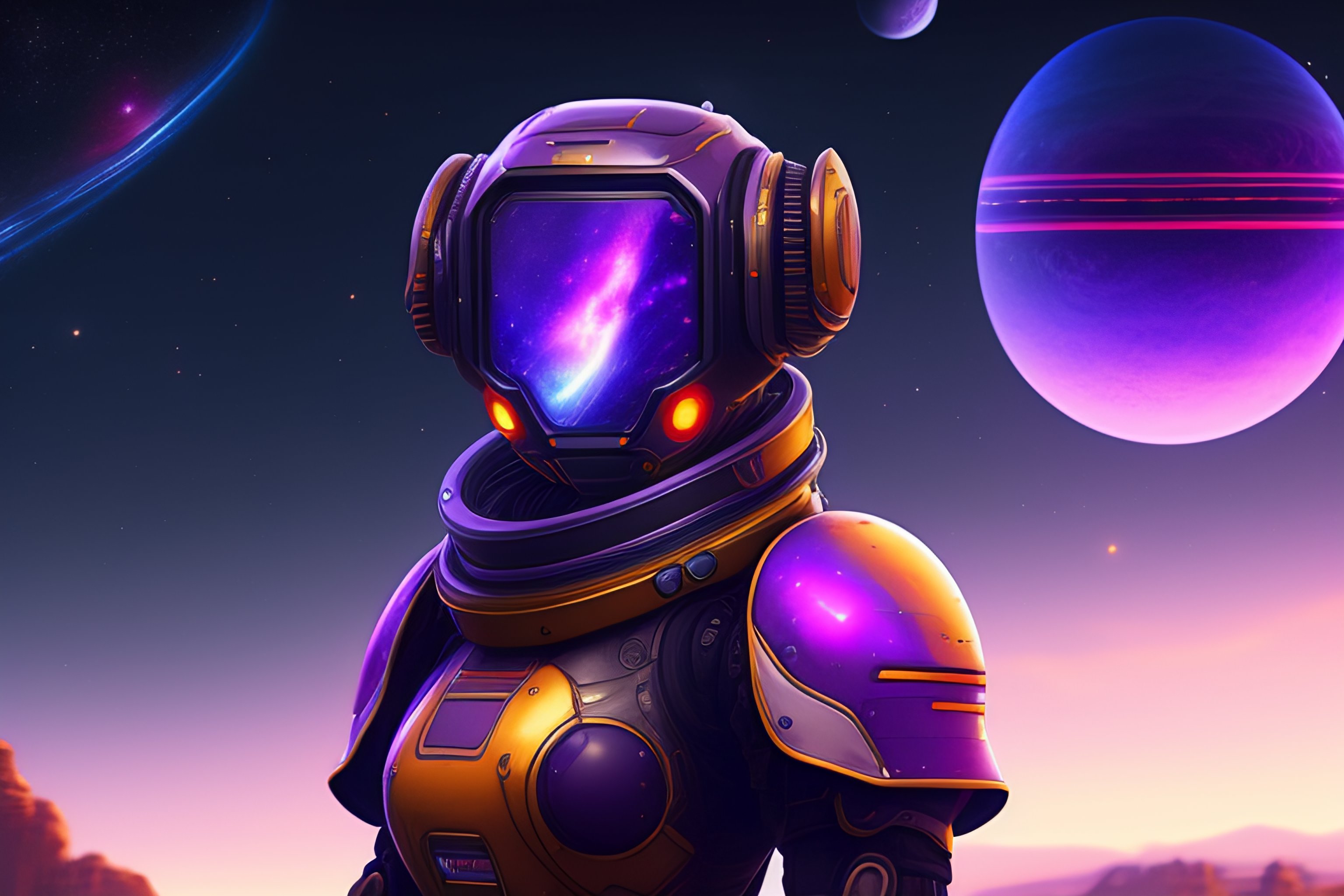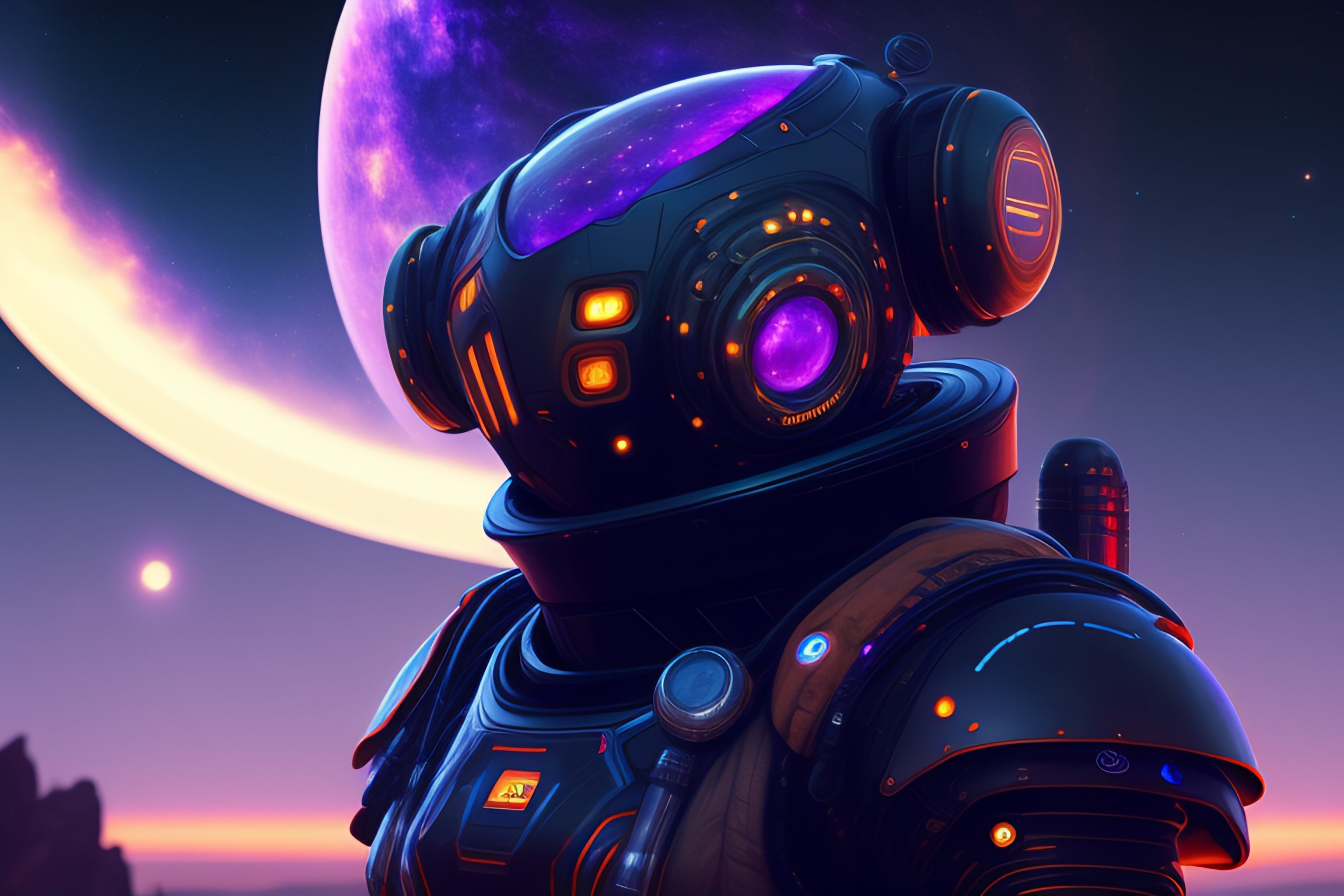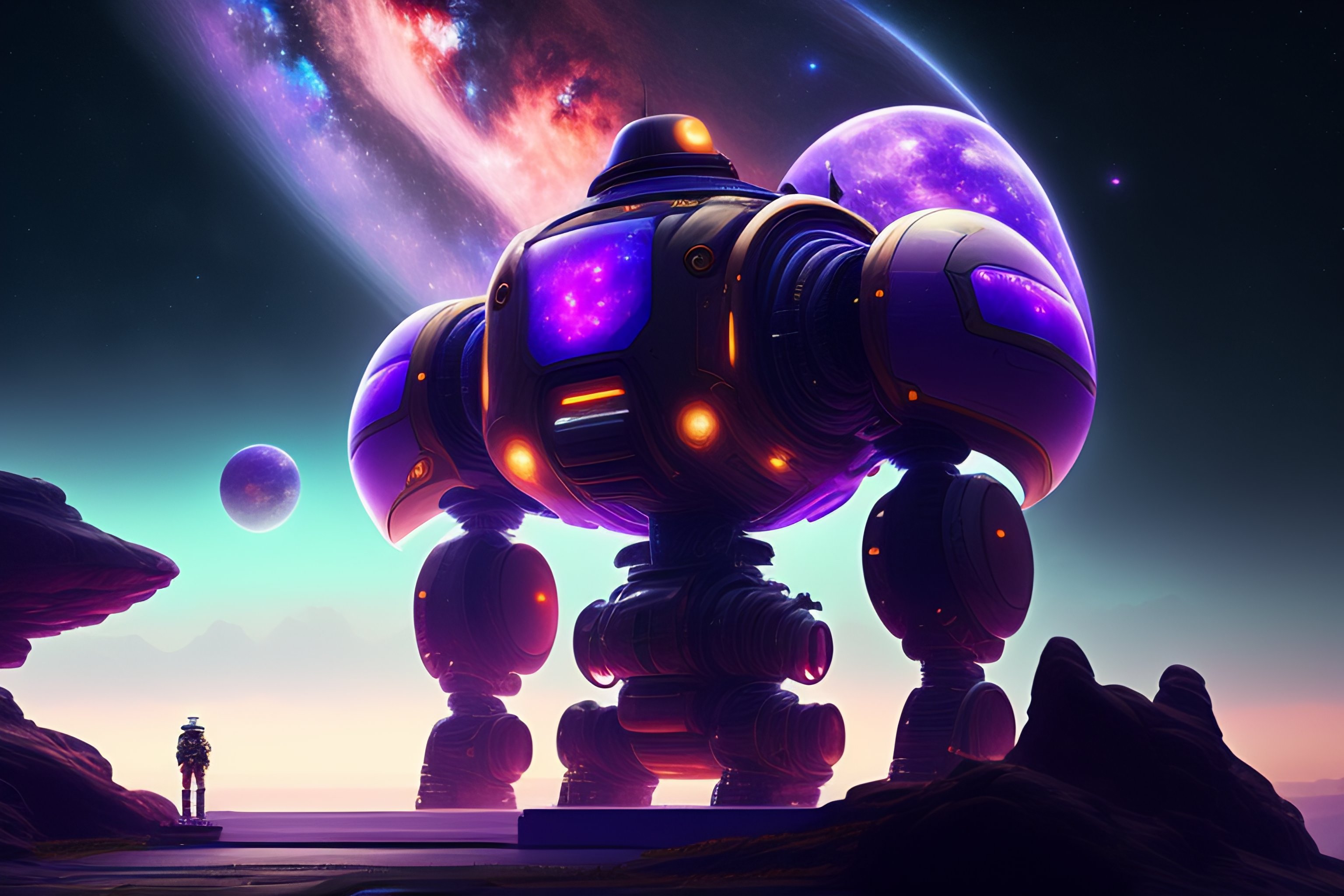 A friendly robot from apex legends in high resolution, very detailed standing in front of a purple galaxy and planets in the backround