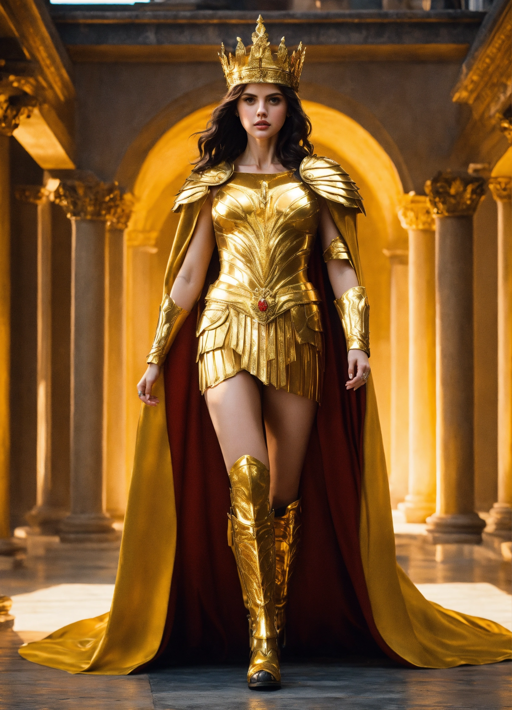 Alexandra daddario as greek goddess in full body golden armor with crown with silk golden cape