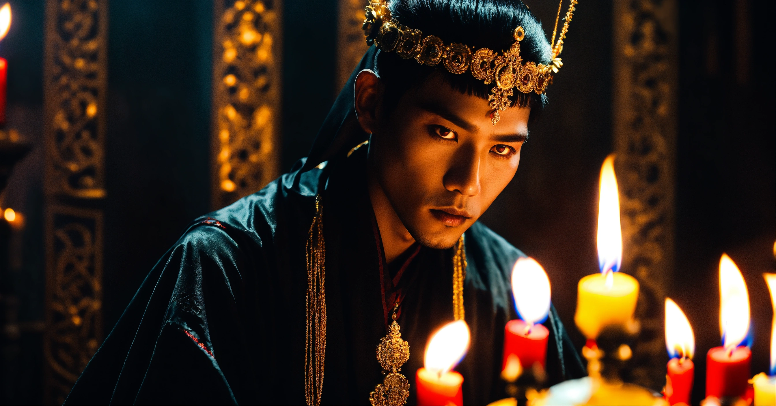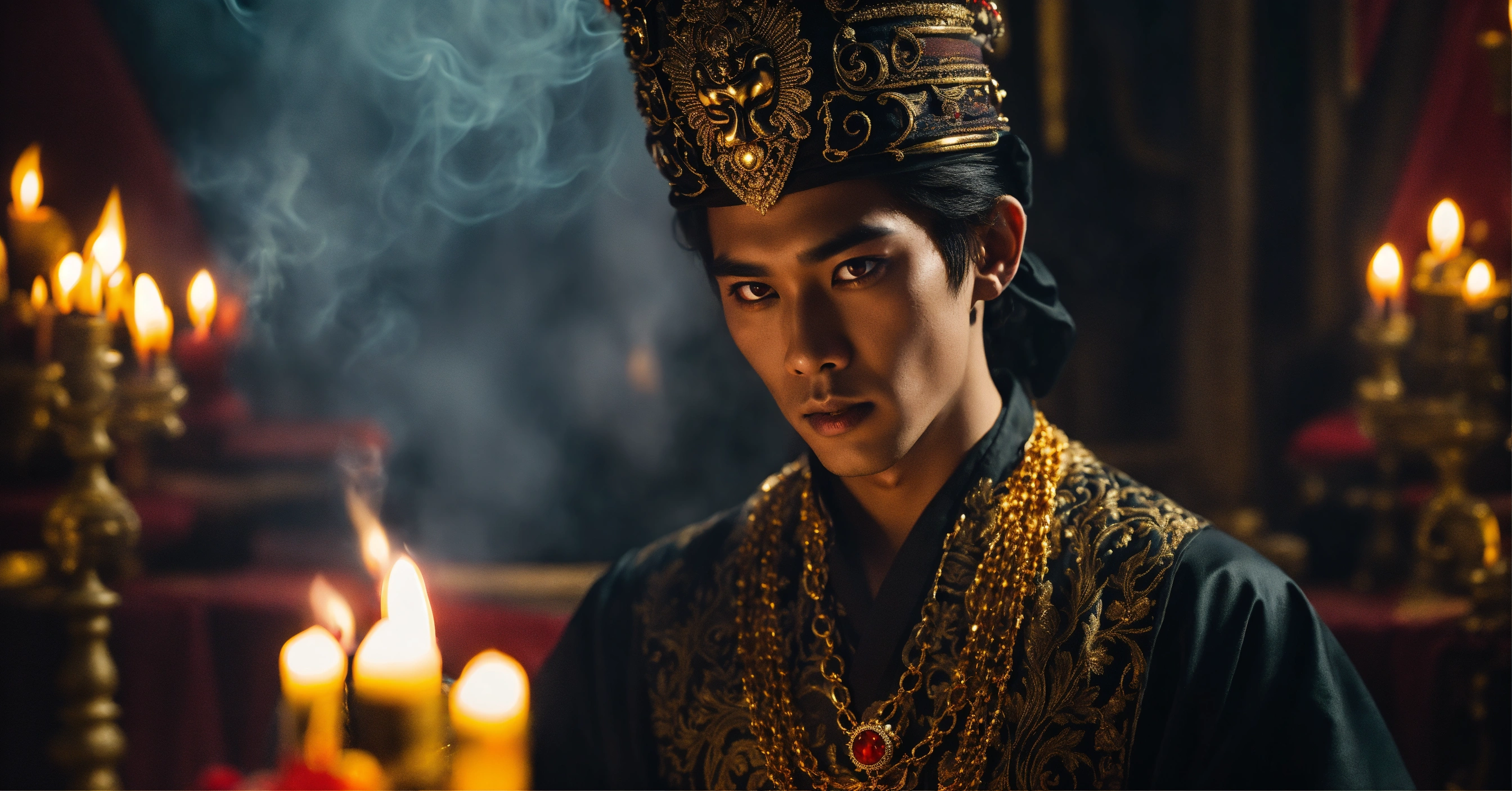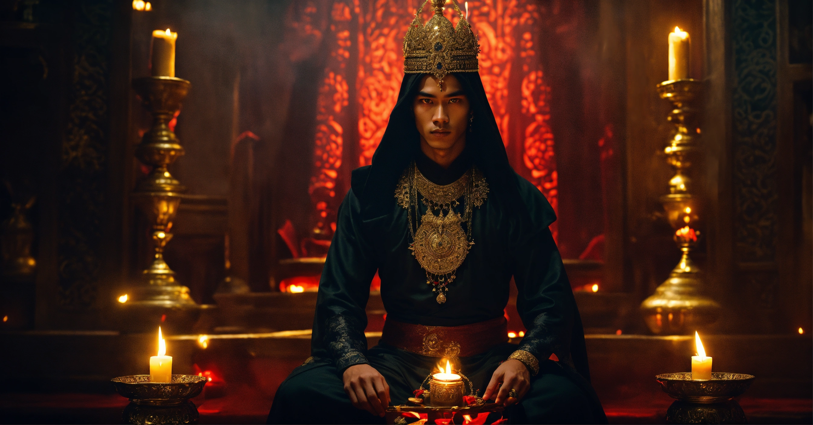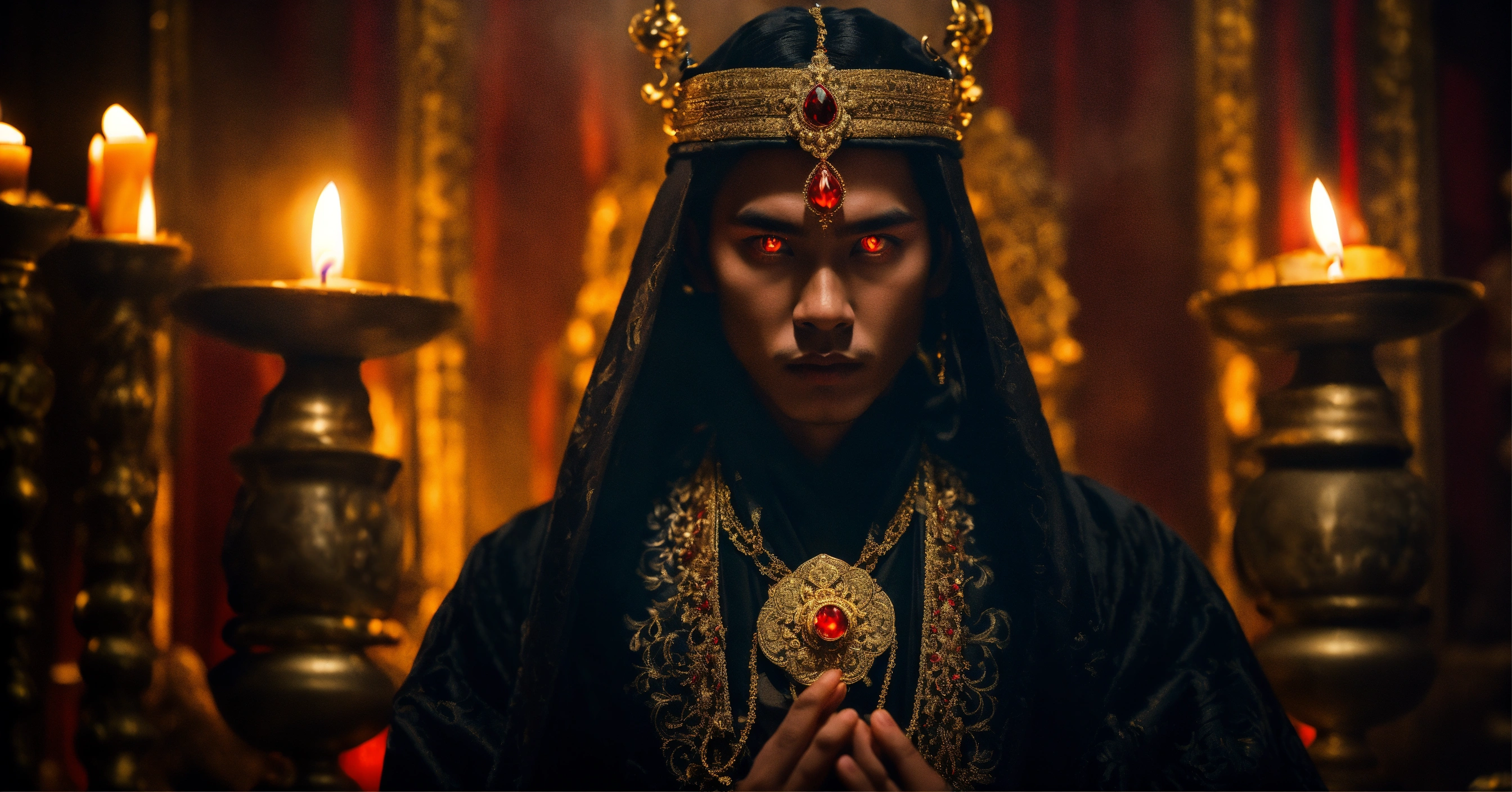 Dark, mysterious and dramatic portrait of a young handsome south east asian sinister sorcerer with glowing hypnotic red eyes wearing black elaborate ritualistic robes and ornate gold jewellery performing a ritual in a candlelit smokey secret chamber.