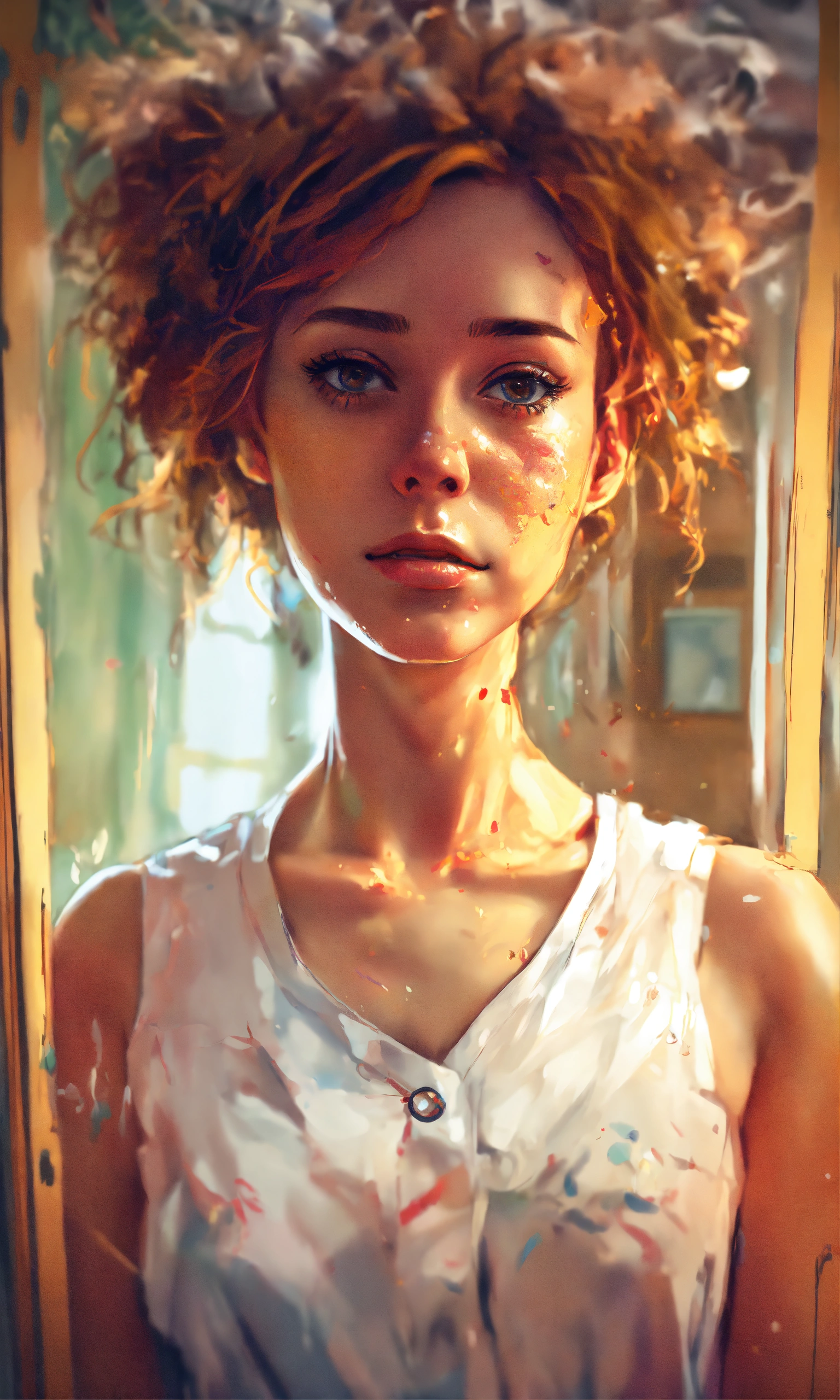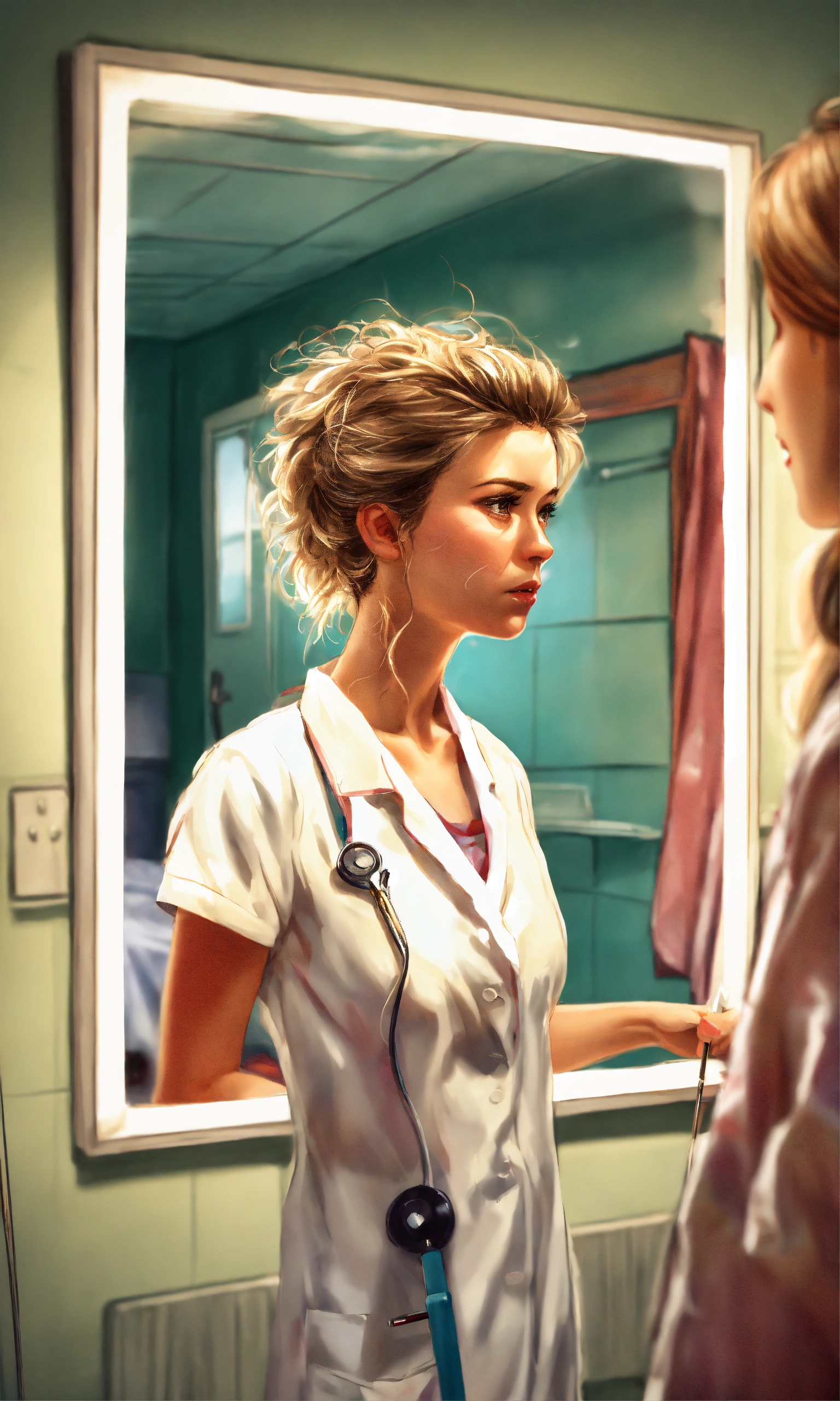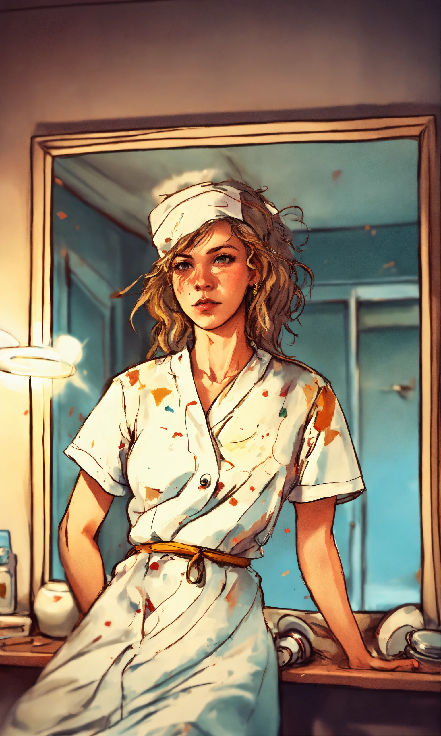 Patient looking herself in mirror, wearing white nursedress, messy hair, a caricatured, soft thin pencil style, saturated, colors, fractured, short focus, vanishing point, vignetting, light in contrast, highly detailed, hyper realistic, footage.