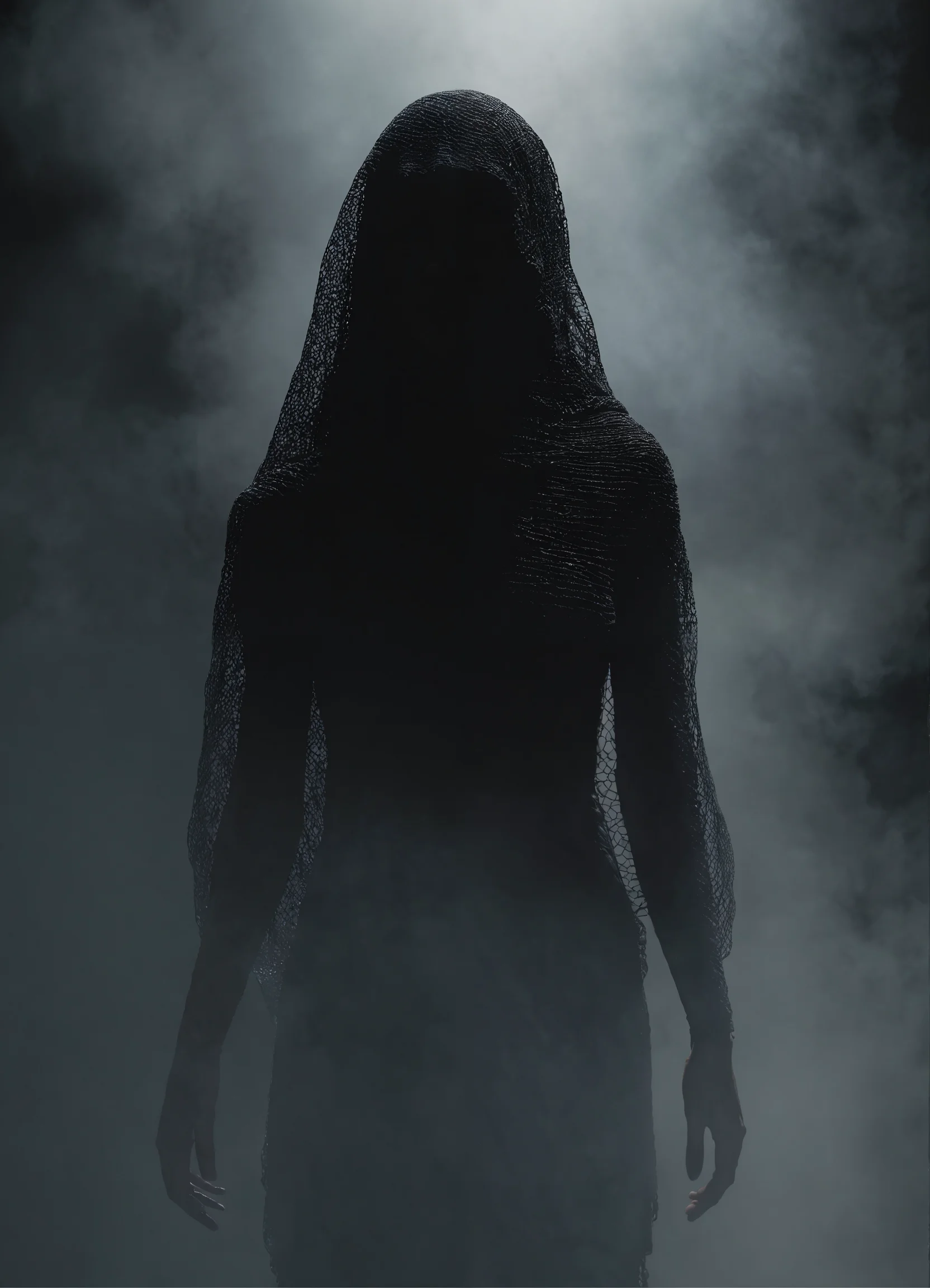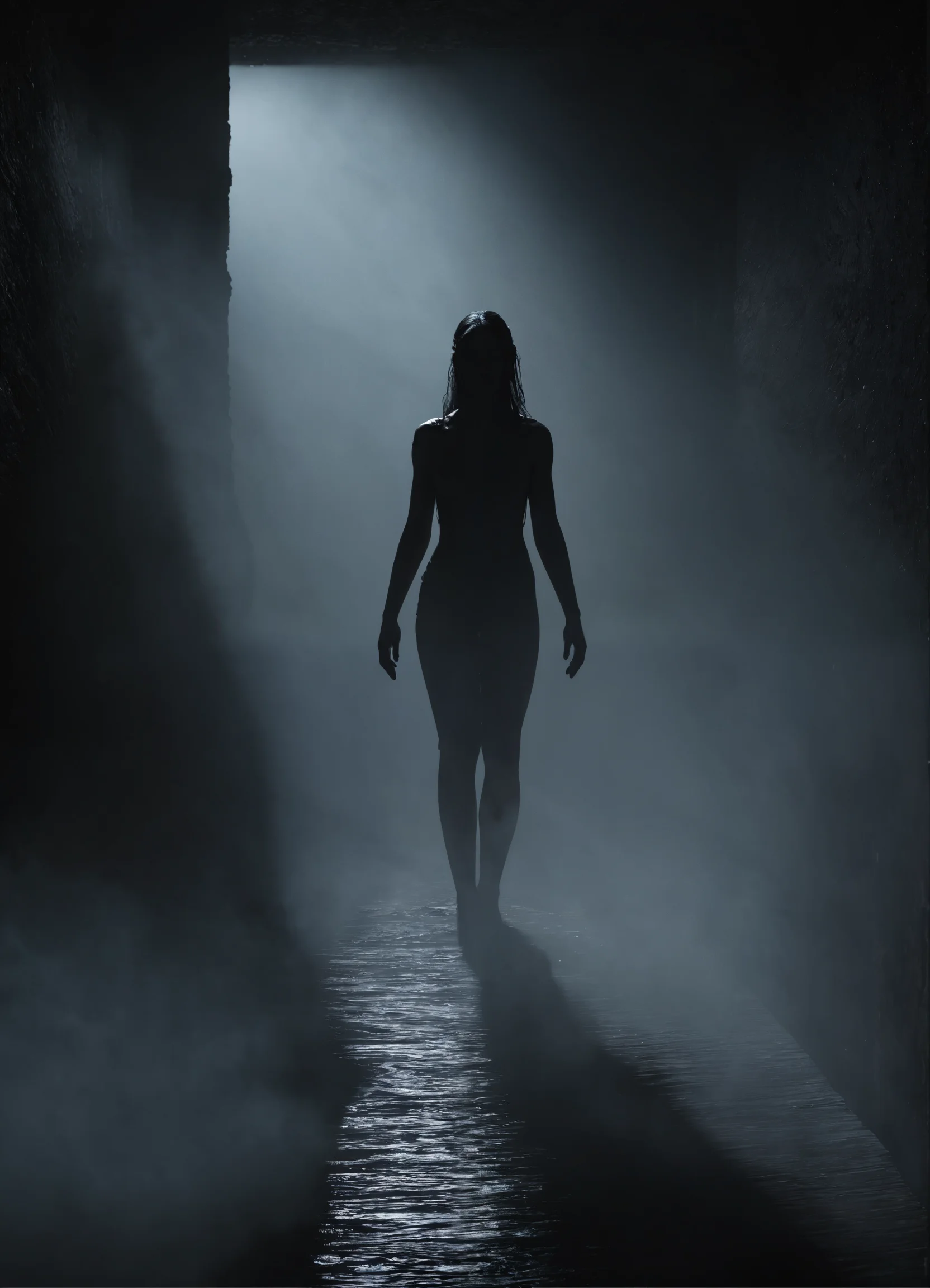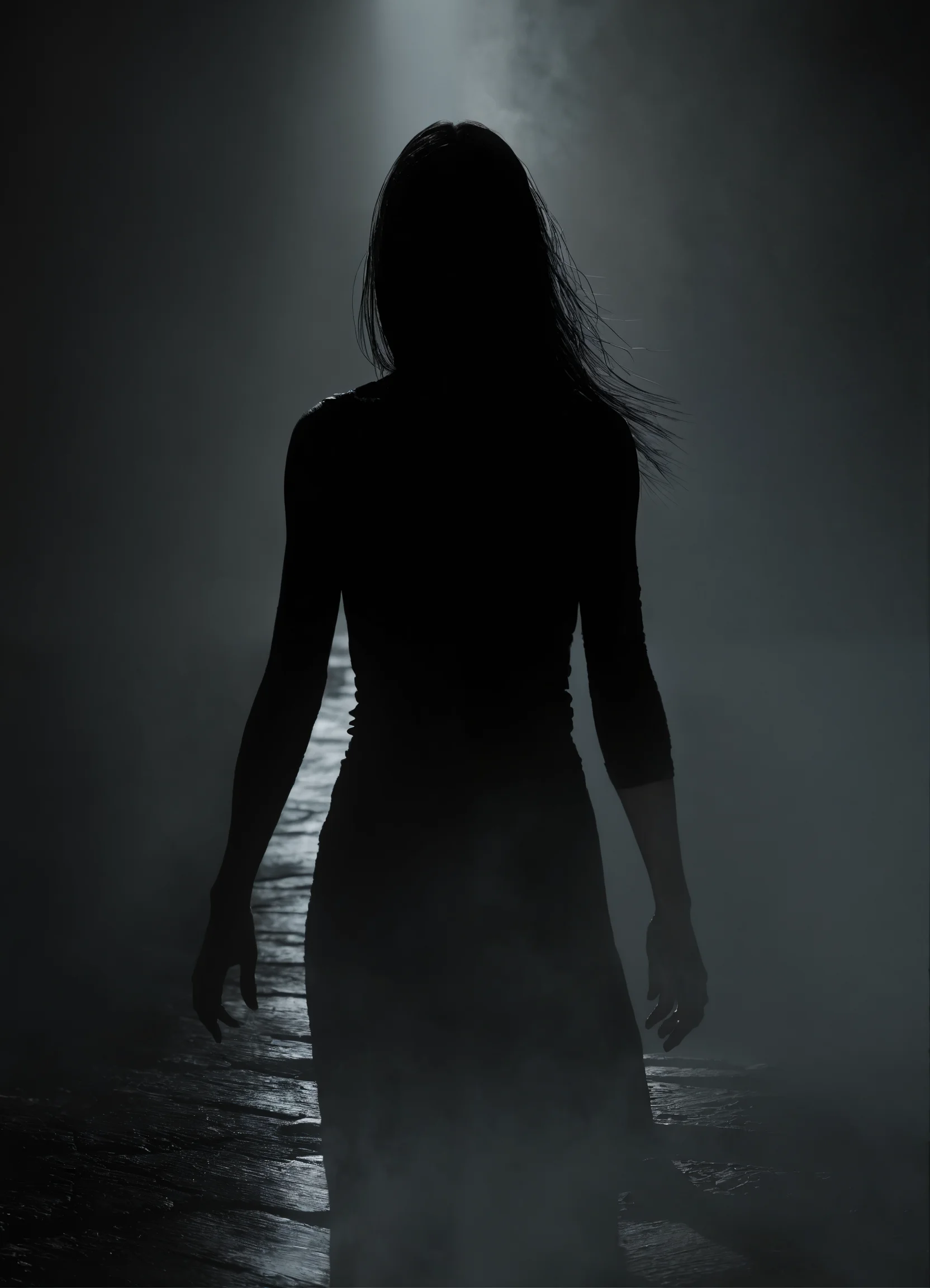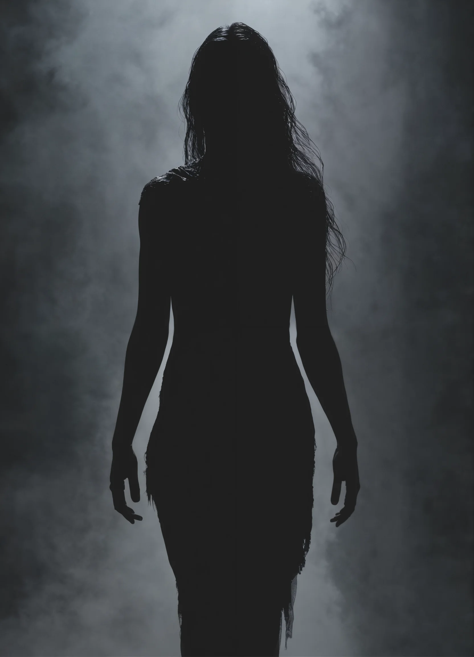 Shadowy figure of a woman emerging from the darkness, black and grey gradient, foggy, realistic, 8k resolution, unreal engine, cinematic