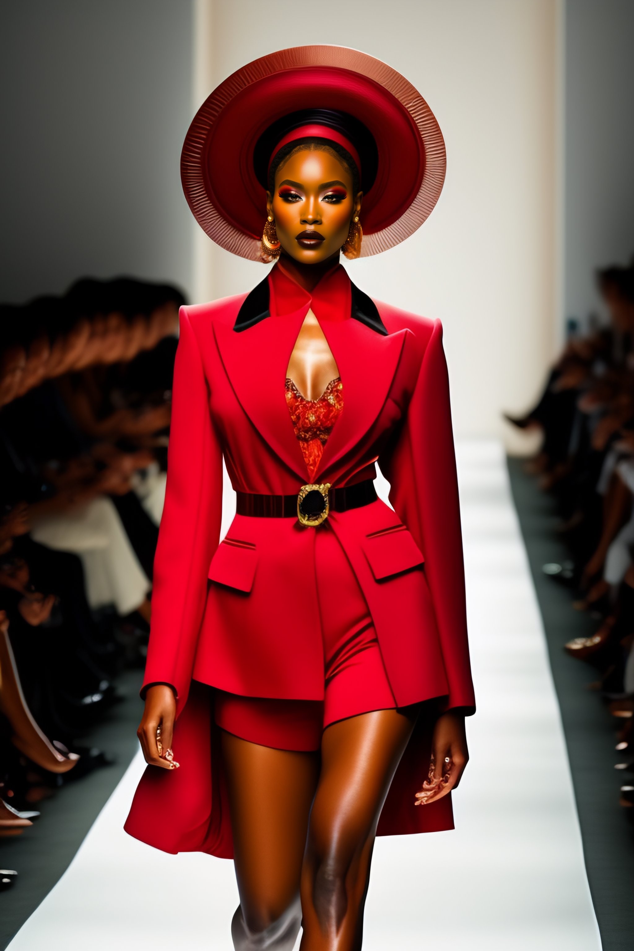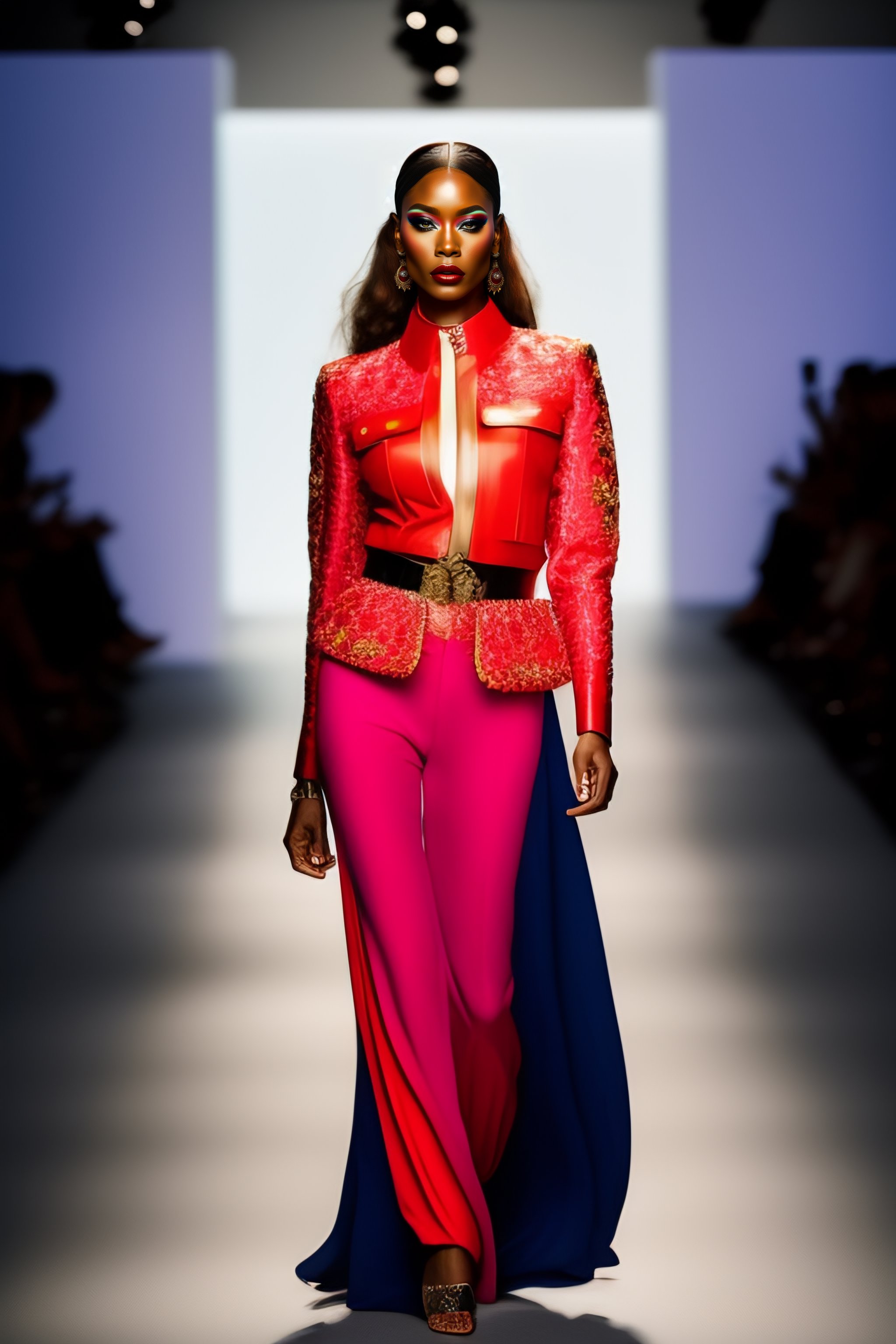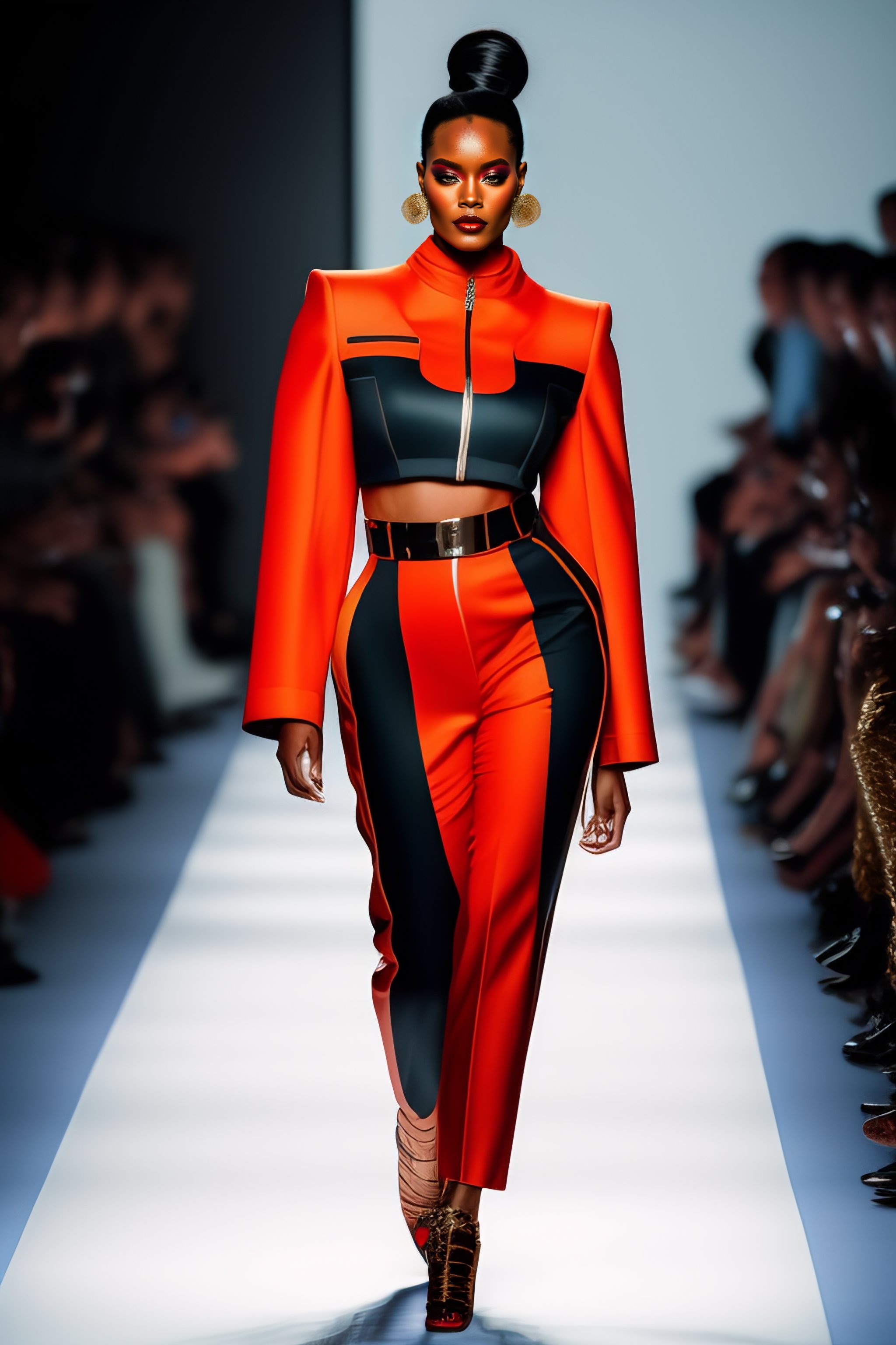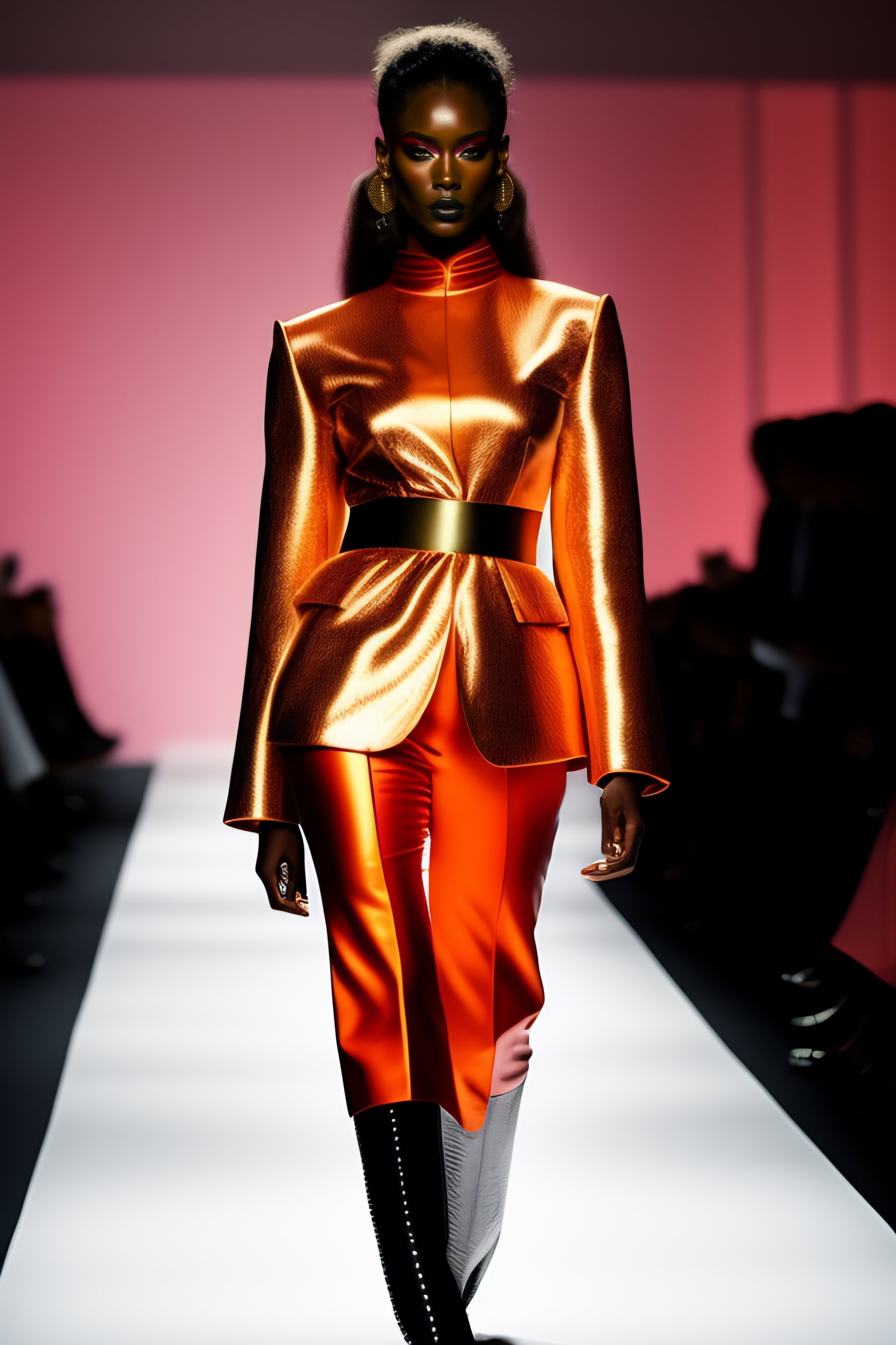 Fashion photography, a beautiful model wearing an absolutely hideous outfit on the runway in a fashion show