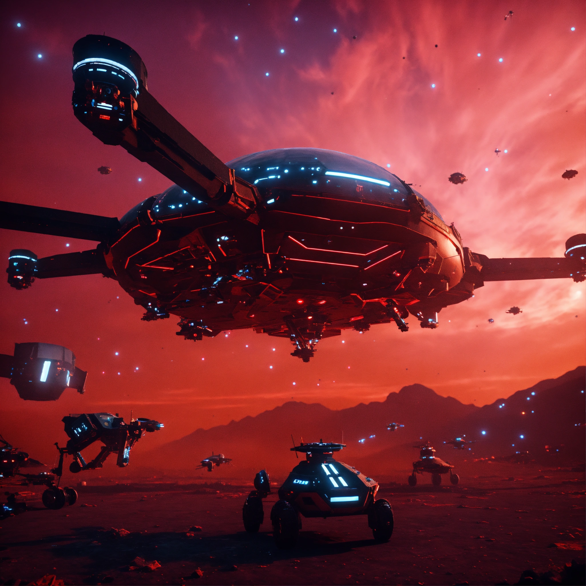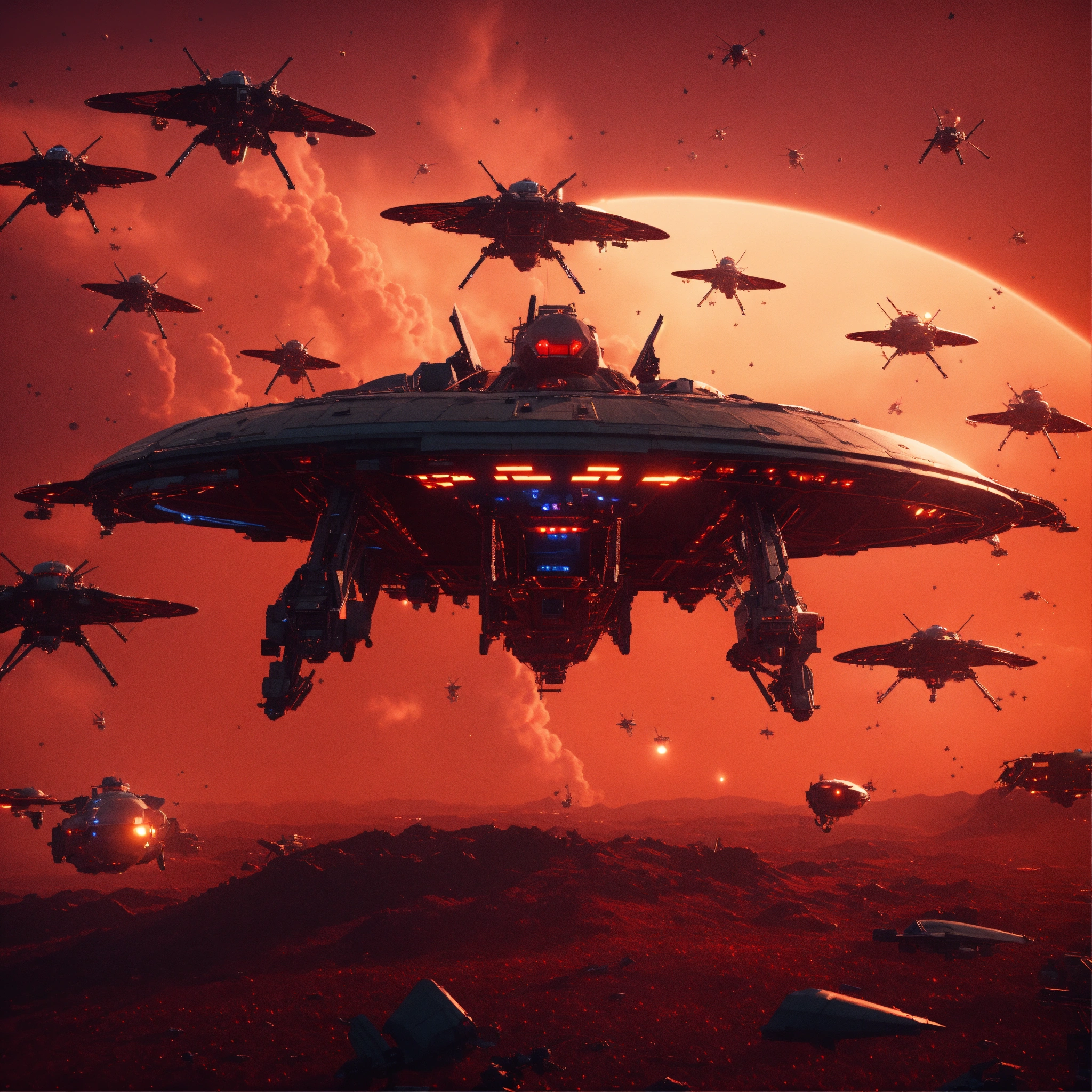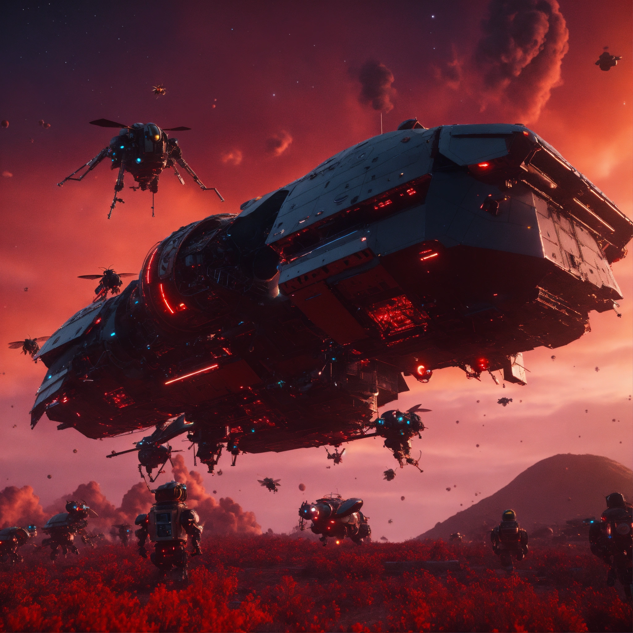 Large black mean faced bio-robotic hornets looking space craft are flying and attacking from above in a spaceship graveyard with red sky, realistic, 8k, unreal engine, pixar