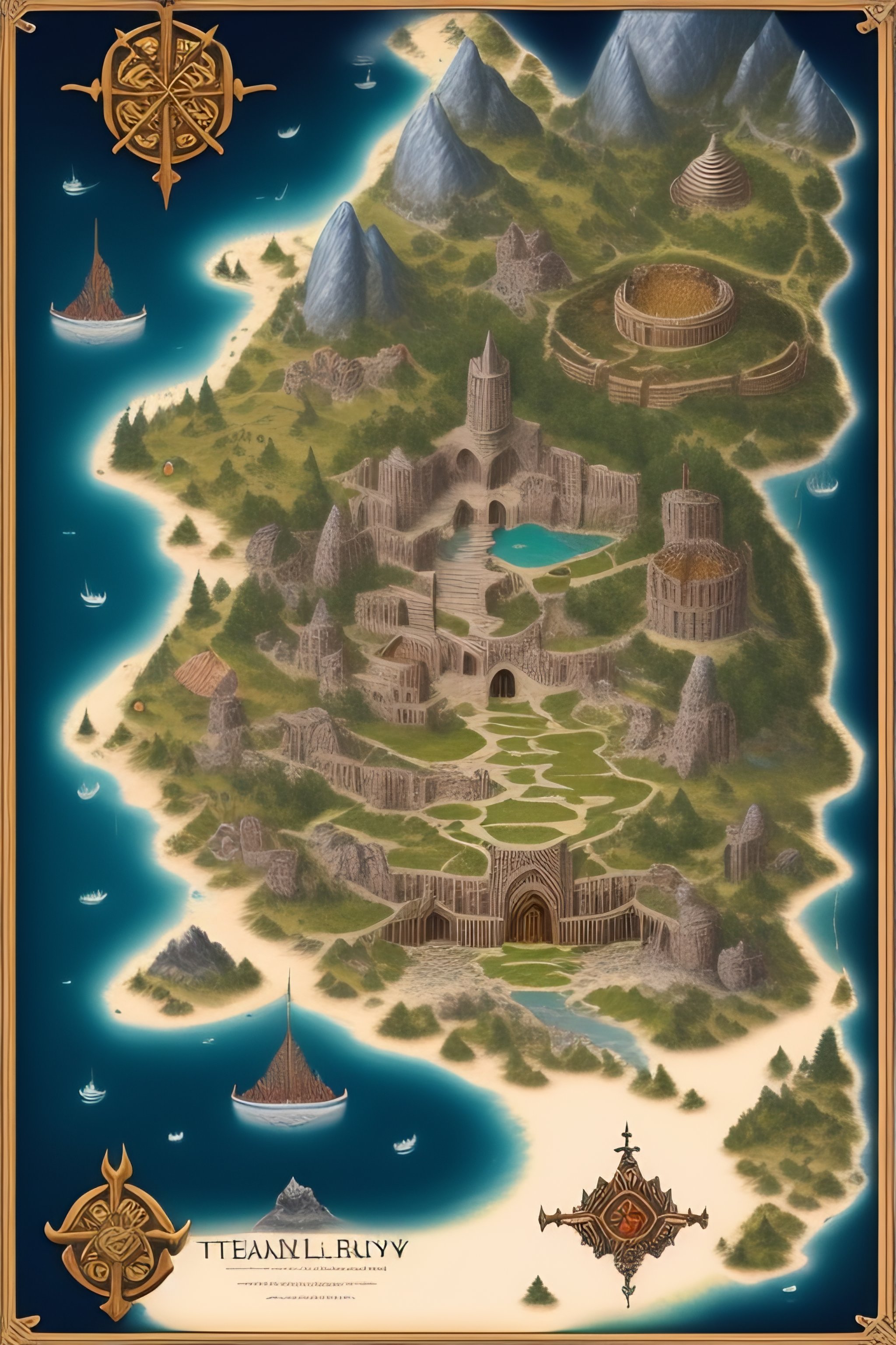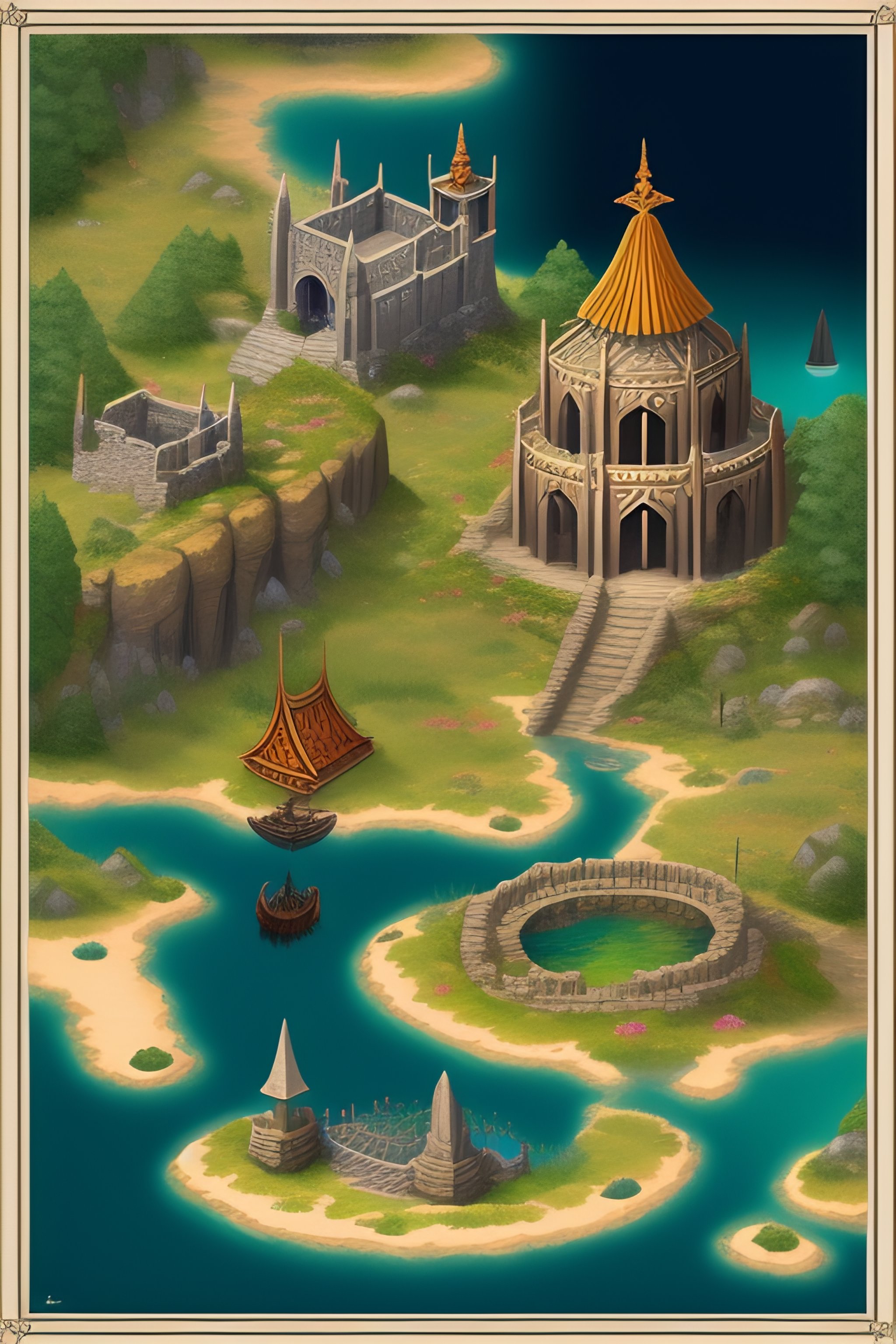 An illustrated fantasy map of a medieval country, temple, minimal, dungeons and dragons, ancient, ruins, lakes