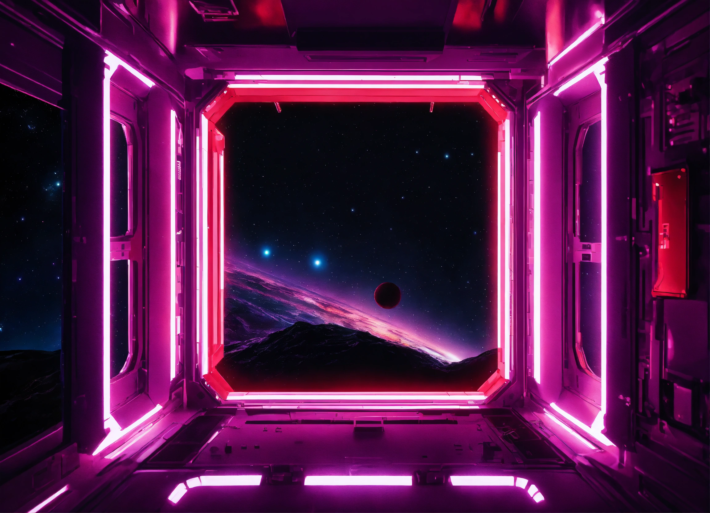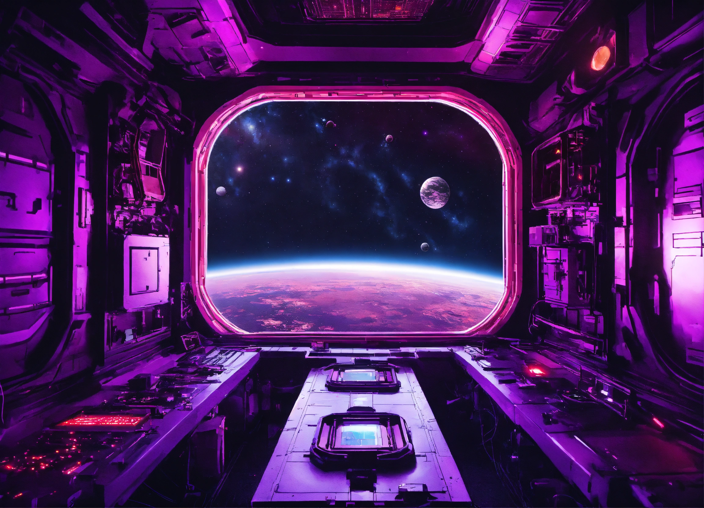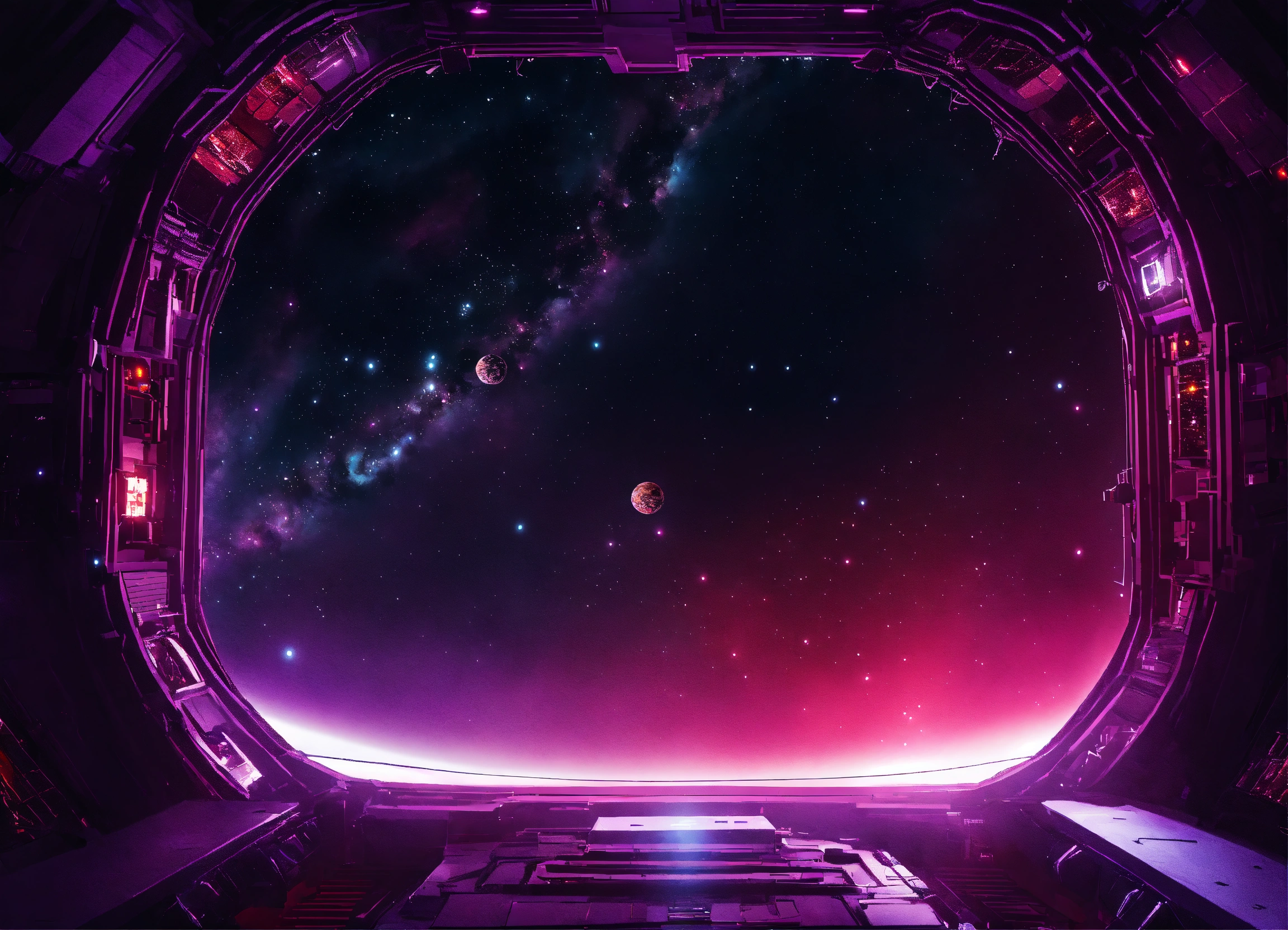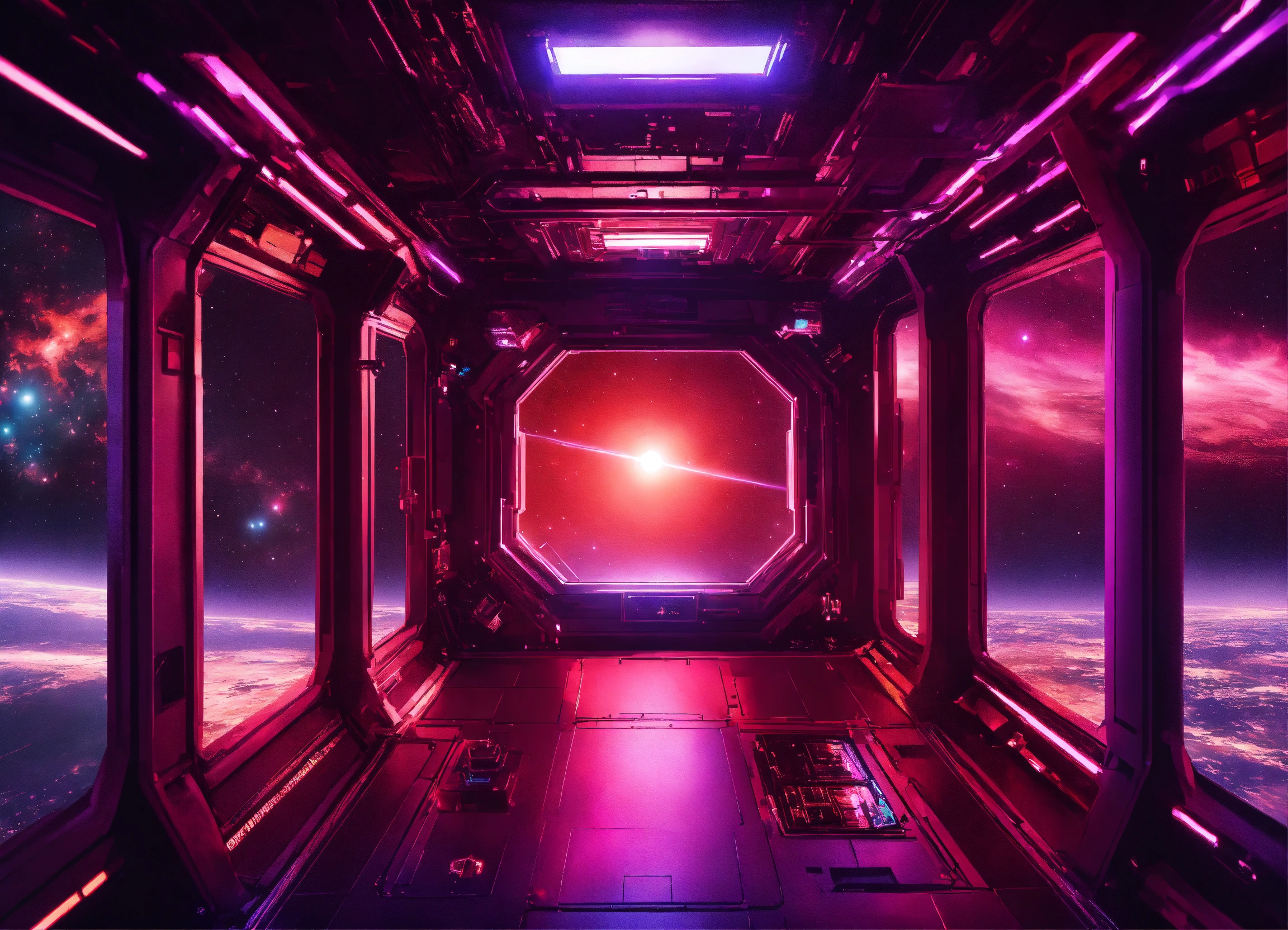 View of space from an entire purple red space station in dark space from top with glow and lights, many windows, background black