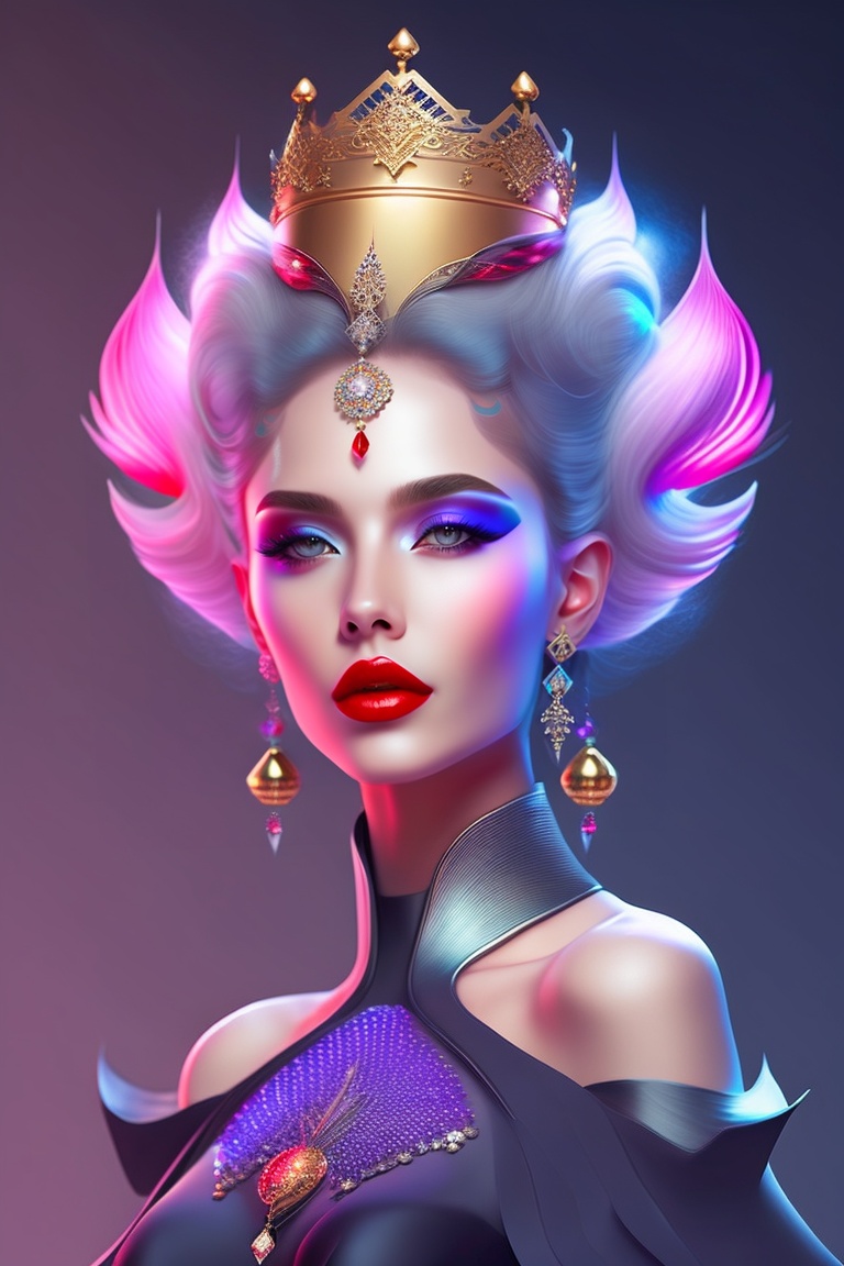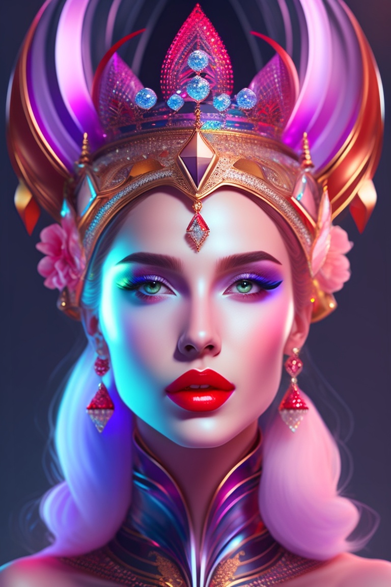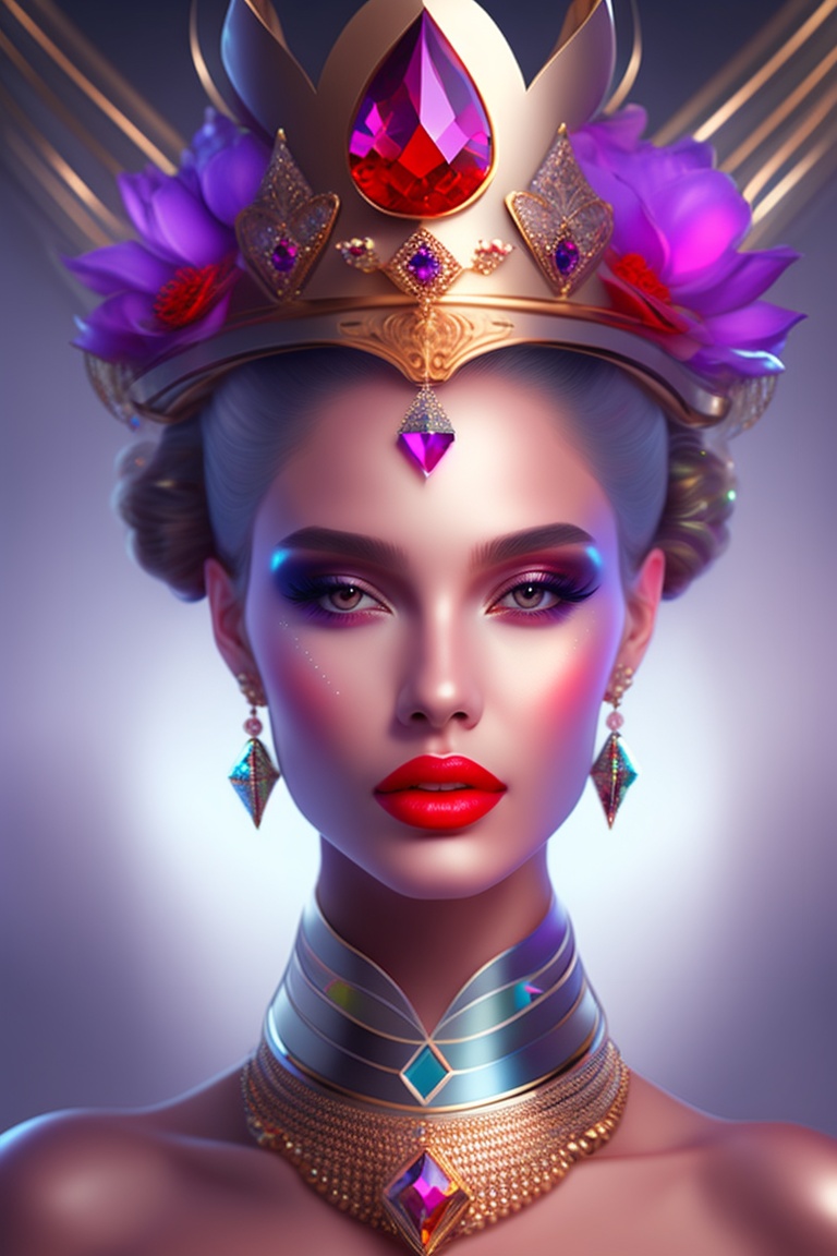 Artistic ai her beautiful crystal crown fanky design, lord of universe, red lips and cute face, beautiful violate eyes, alien looks with futuristic and accurate form