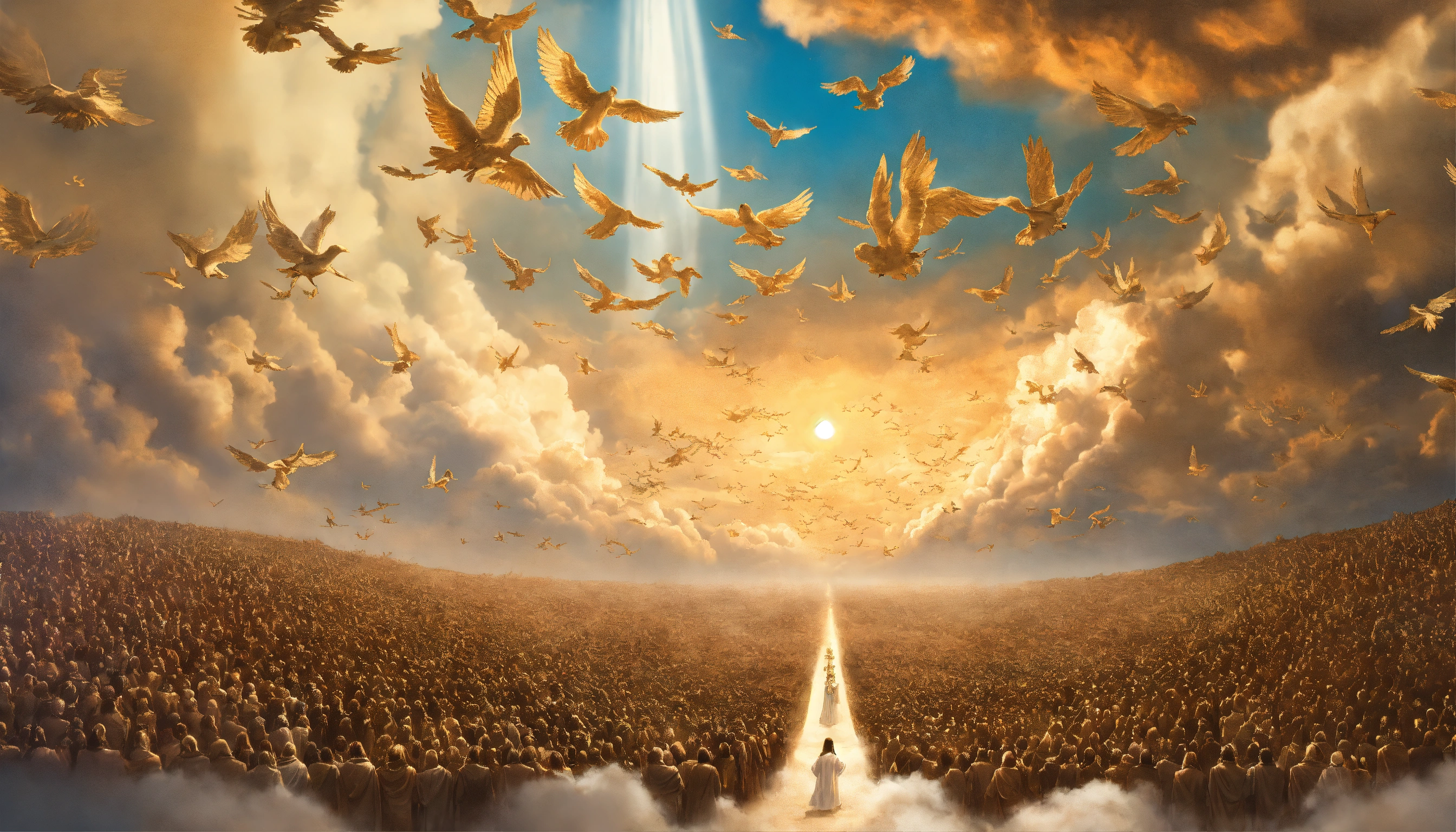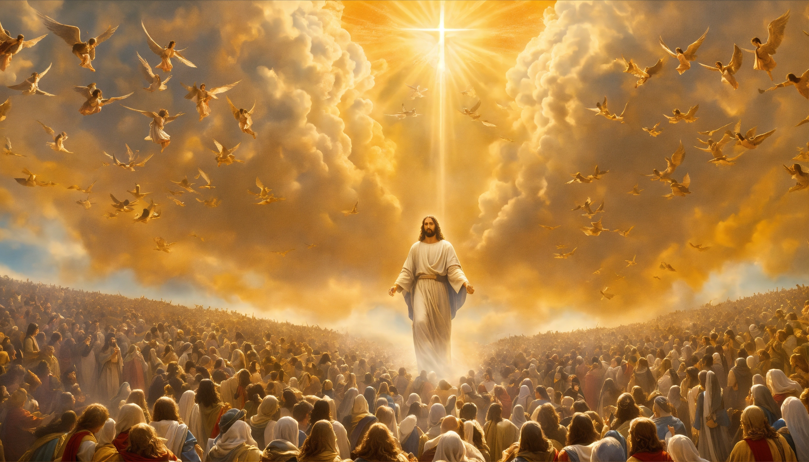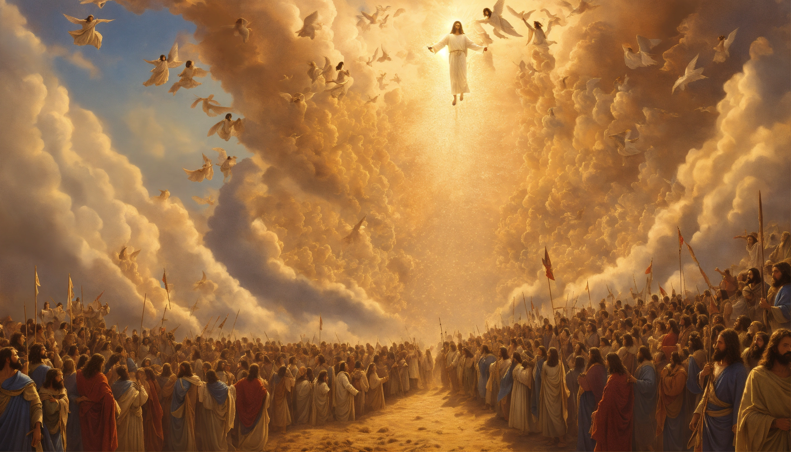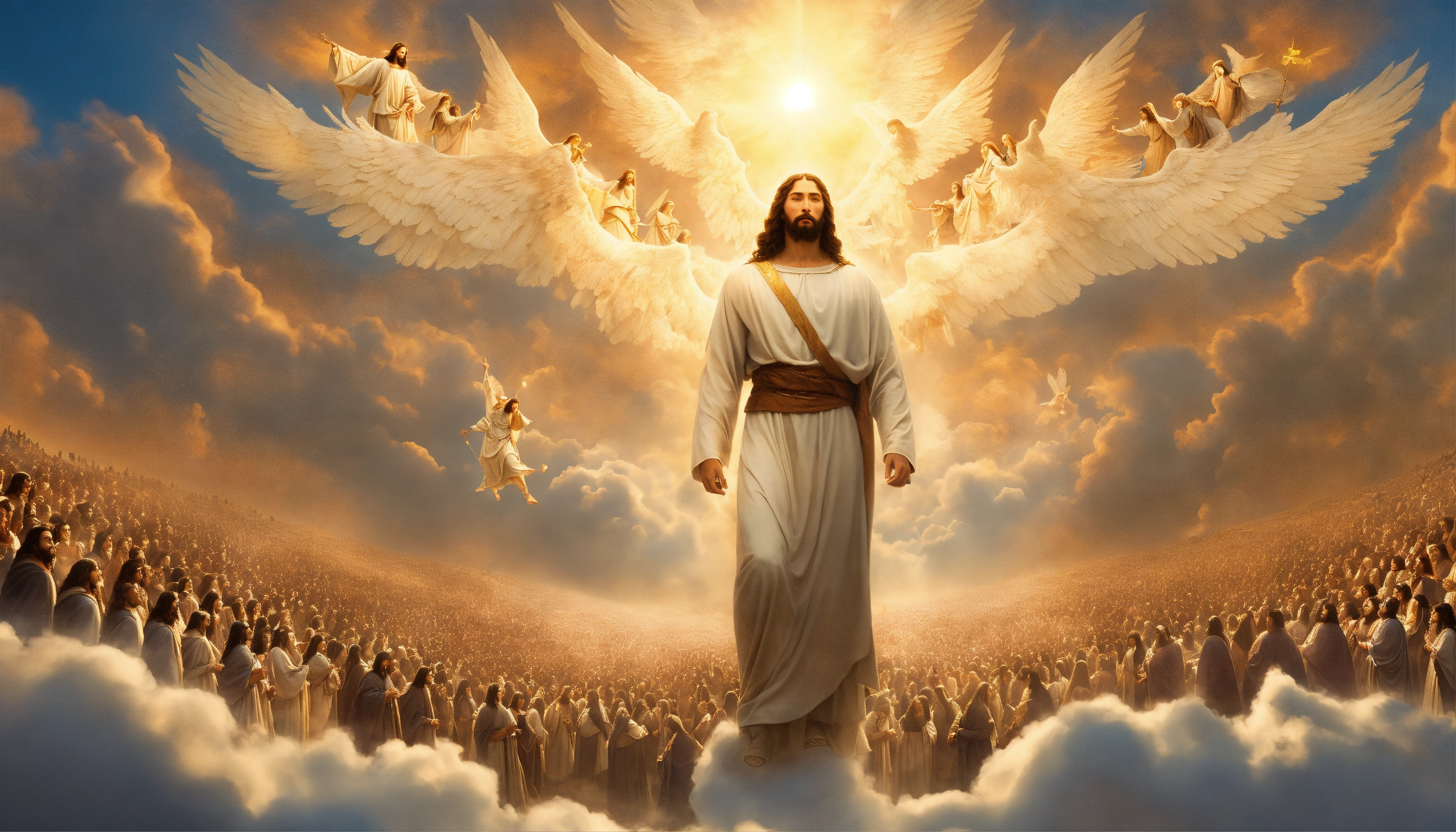 Jesus on the clouds with 100 warrior angels following him, coming out of heaven with the earth below, sharp