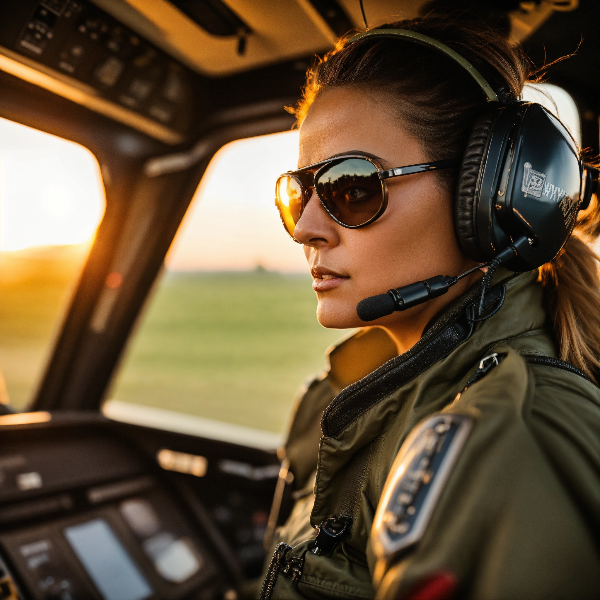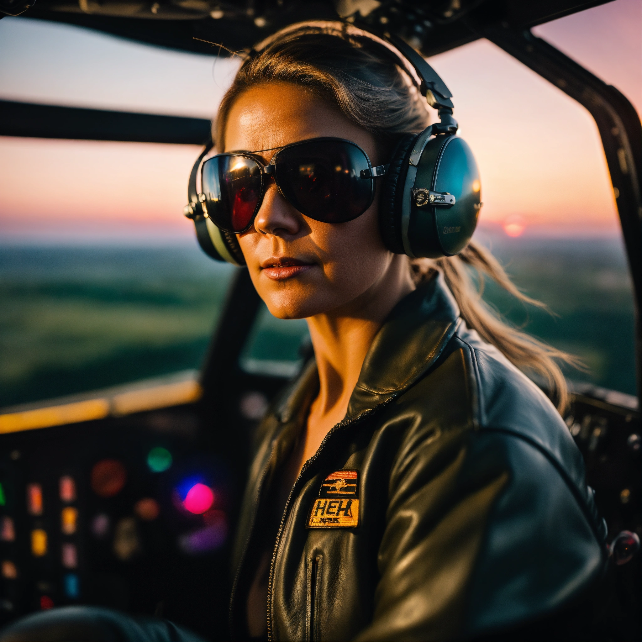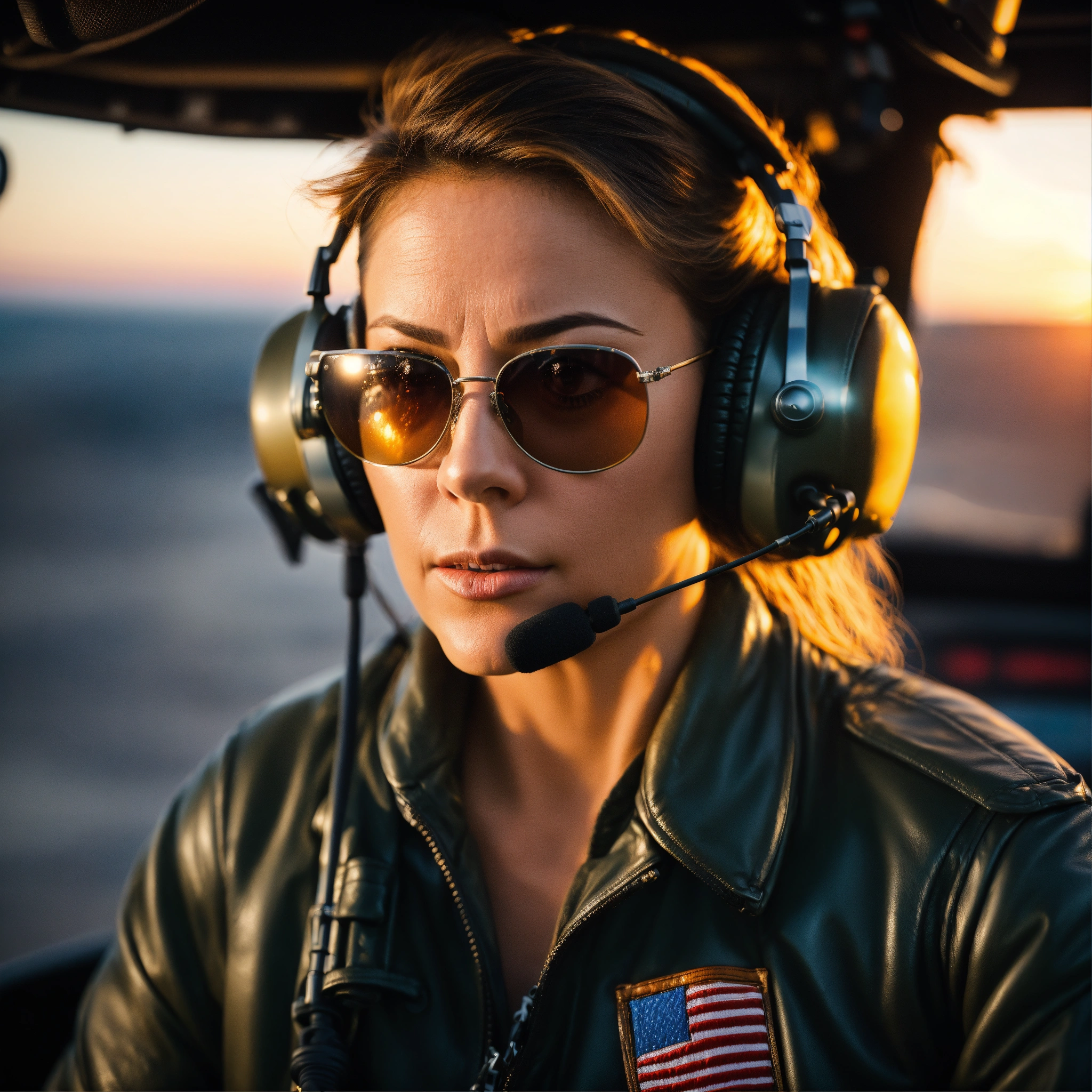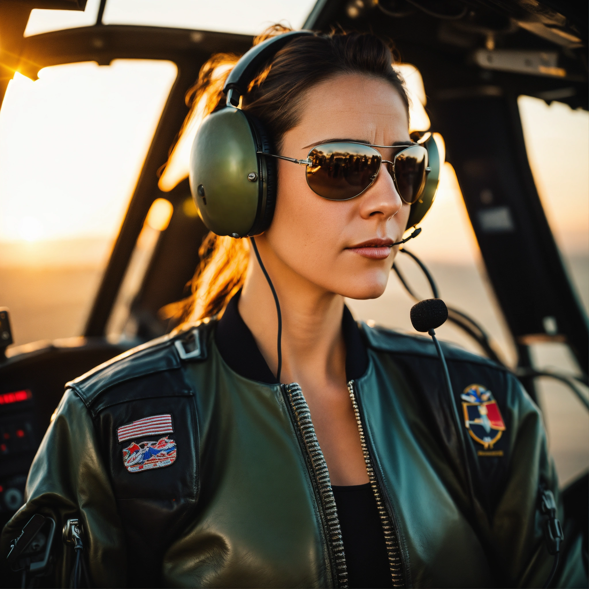 An athletic and toned middle-aged woman with a ponytail and a dominating and intent demeanor, wearing a leather bomber jacket, an oversized boombox headset with microphone and classic wayfarer sunglasses. military pilot, portrait inside of a helicopter cockpit with head turned towards the camera. sunset. bokeh, deep focus.