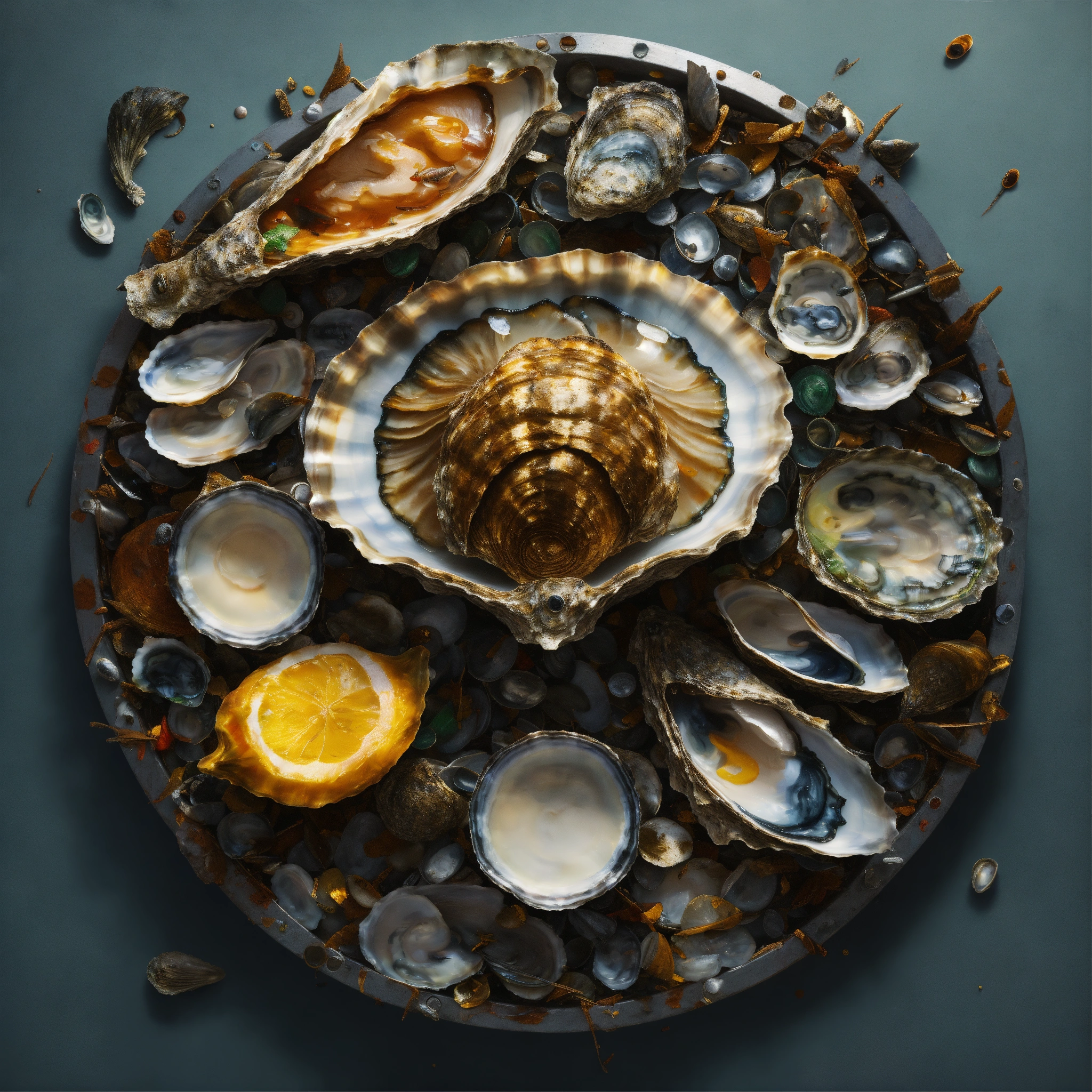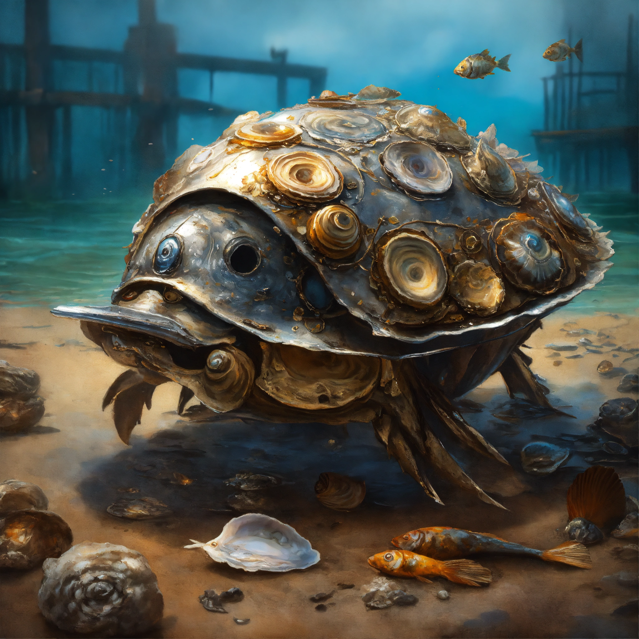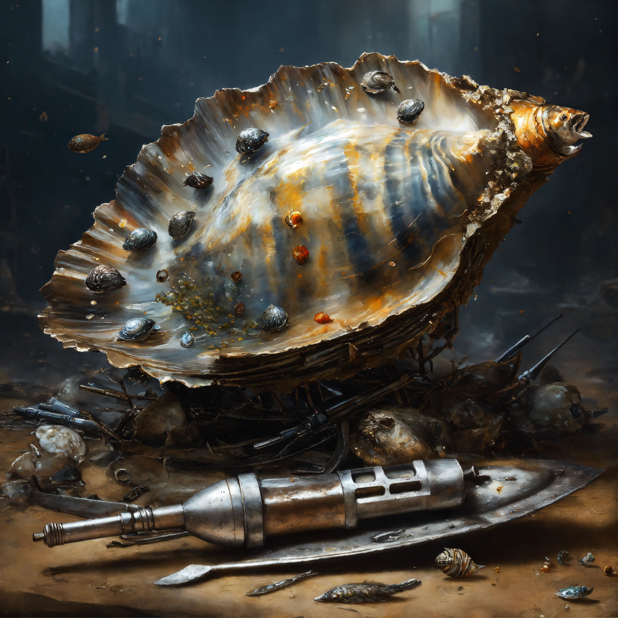 Concept art of an oyster, shell made out of scrap metal guns armor metal objects, surrounded by dead fish, oil painting style, highly detailed, brush strokes, 8k