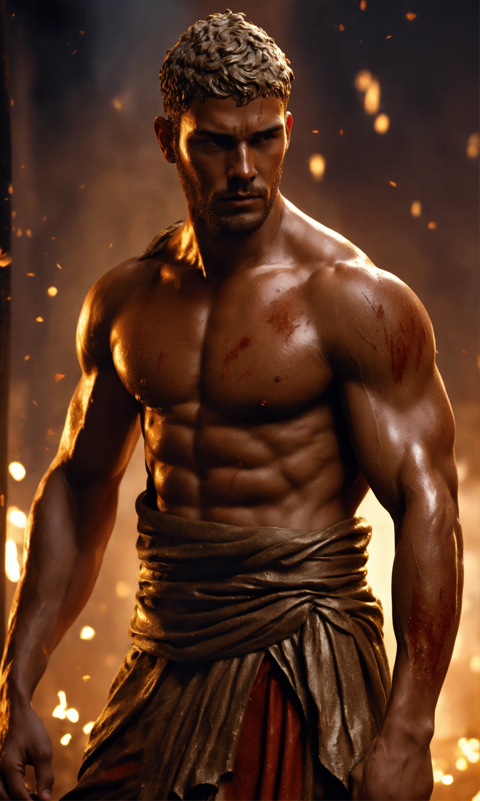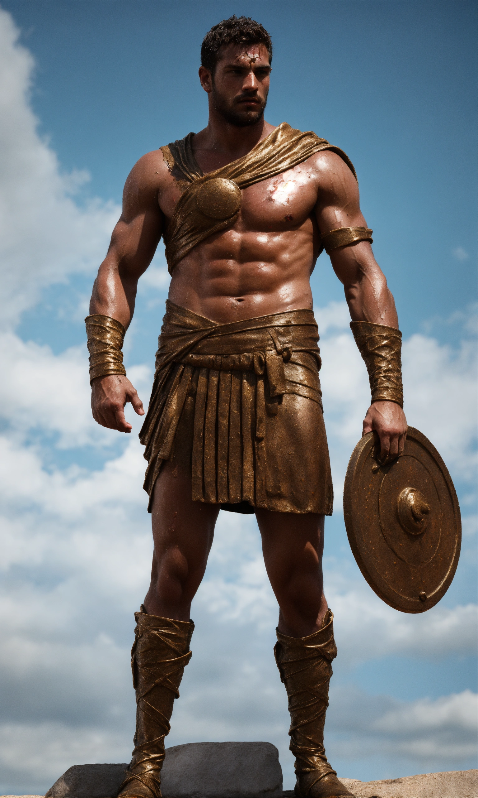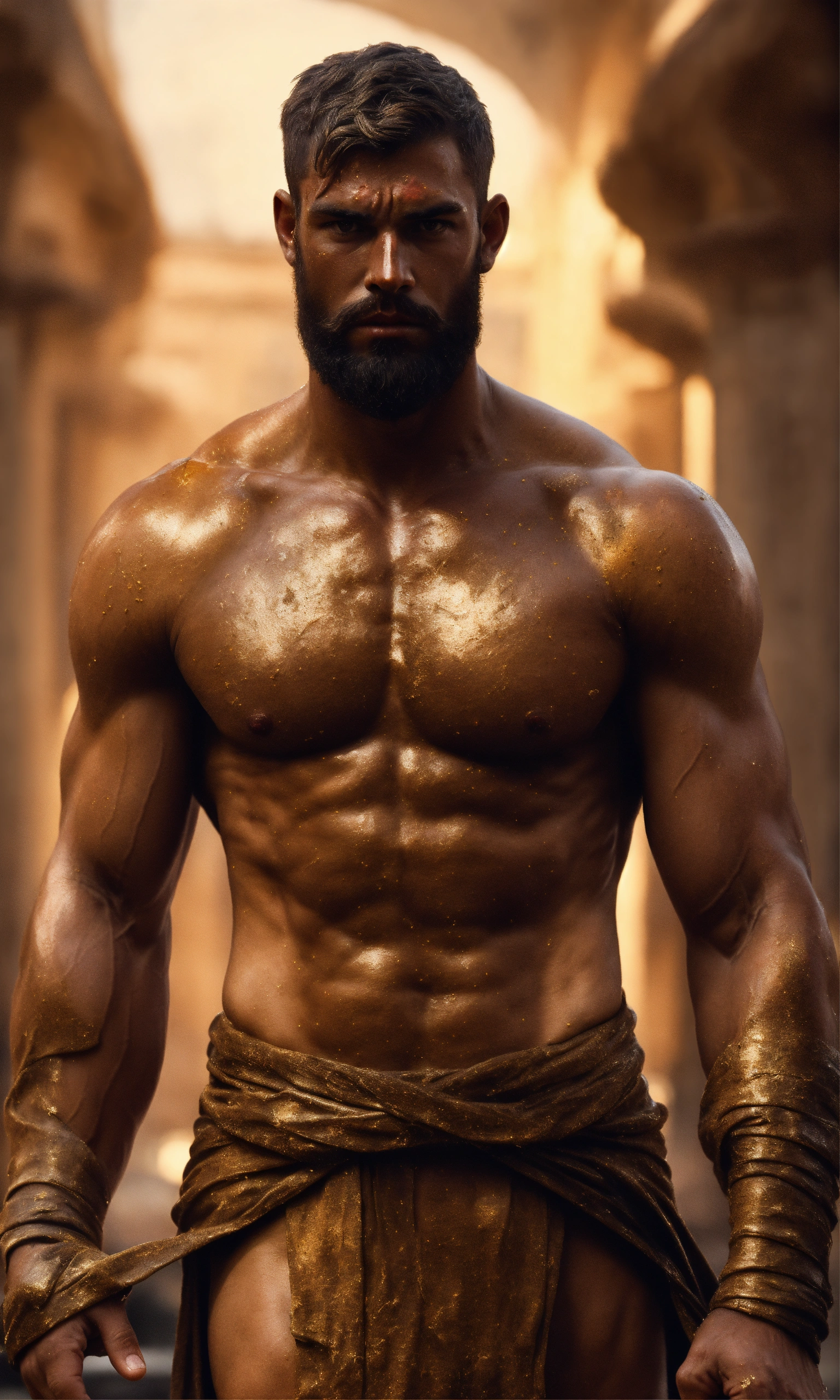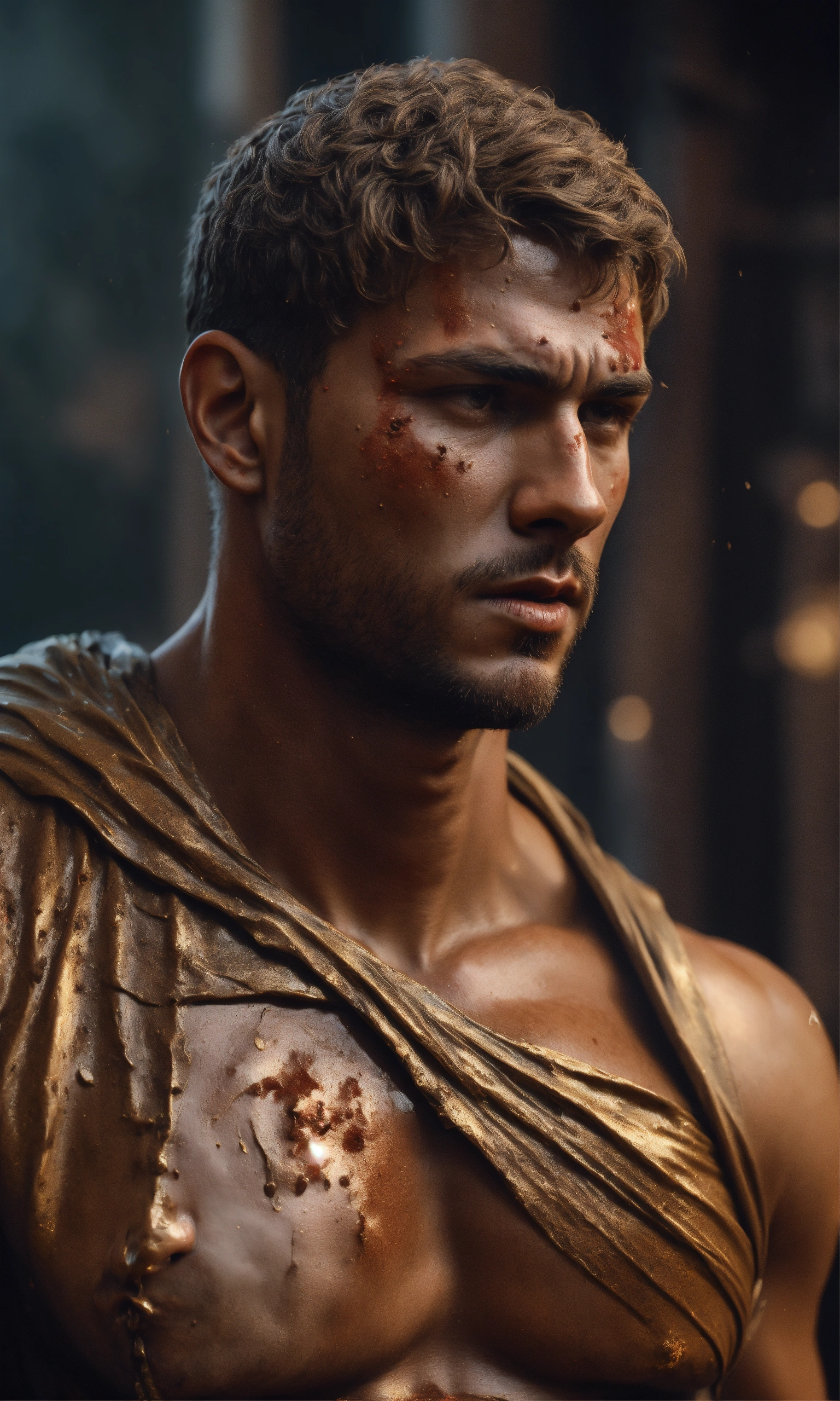 Doloren, god of endurance bronze is his colour. he is covered in ugly visible wounds and scars. he is an athlete in a bronze toga. lean, handsome. he is taking part in sport. he has an pained, determined look on his face. he is clean shaven. 4k ultrarealistic. fantasy.