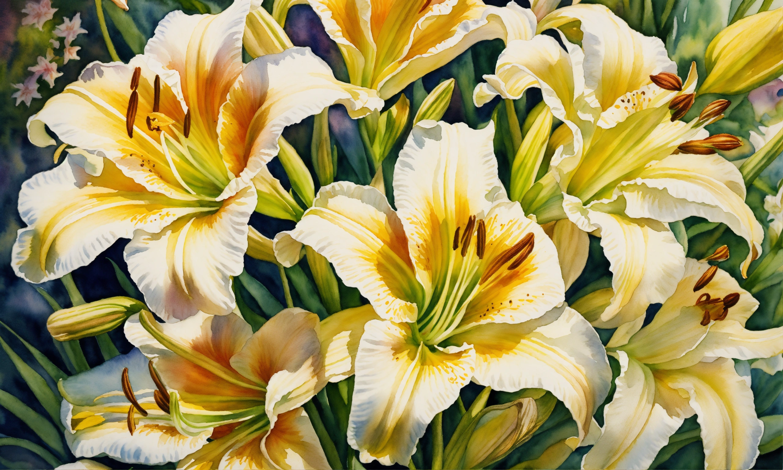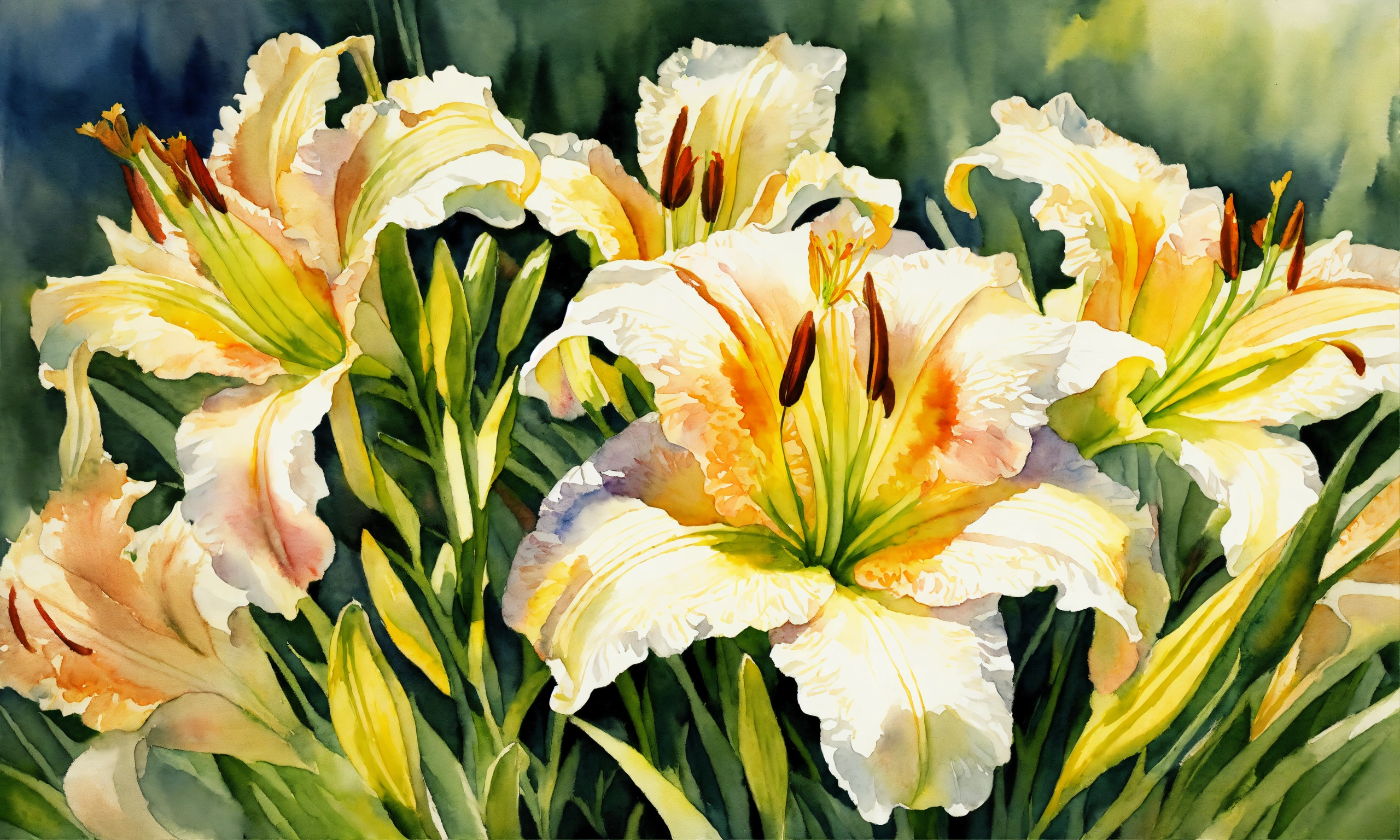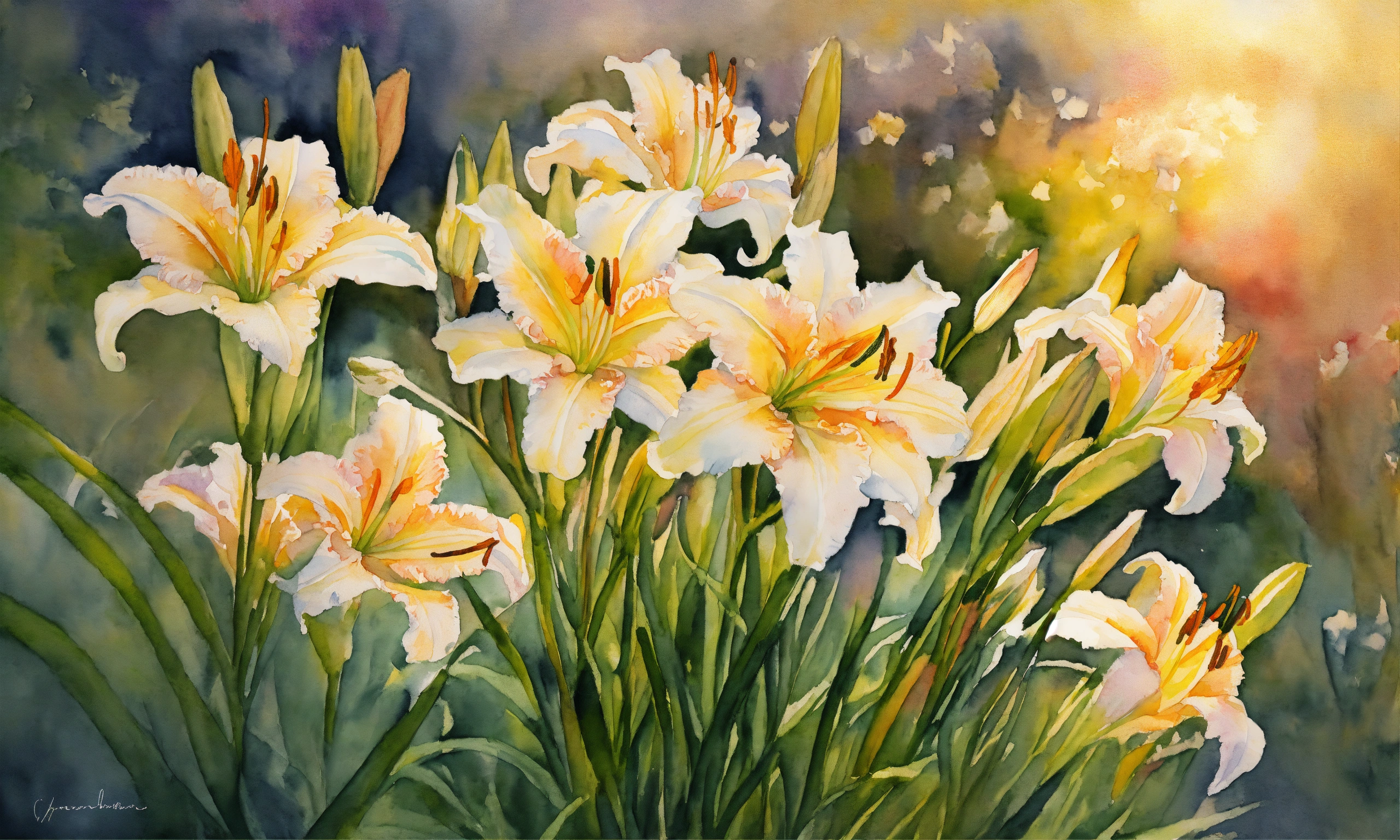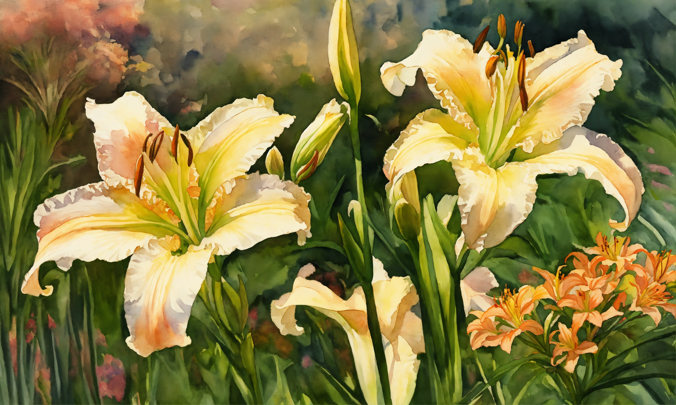 Watercolour painting, pastel colours, warm light, intricate and detailed, beautiful garden, 8k, ultra-detailed, sharp focus, white daylilies