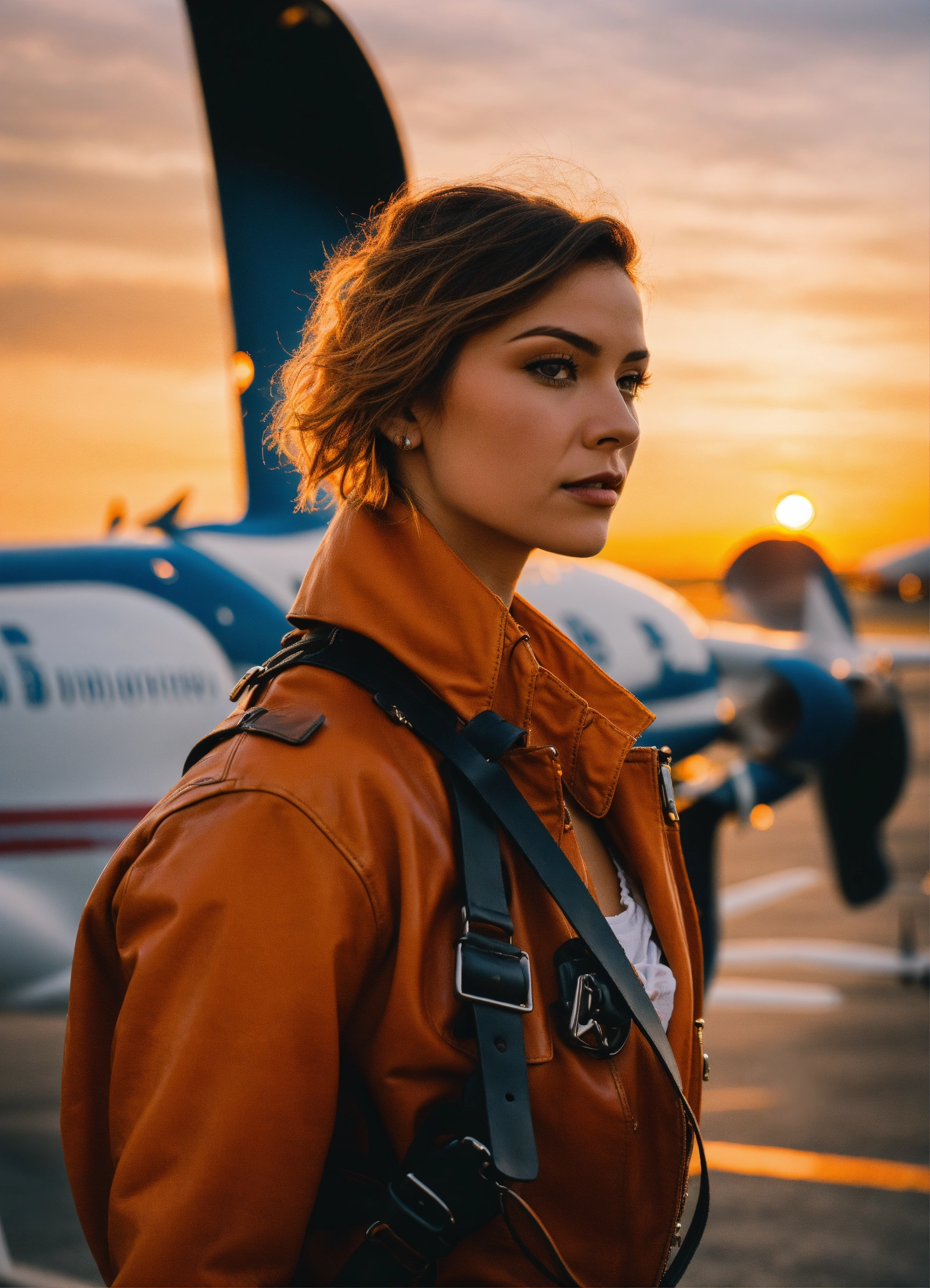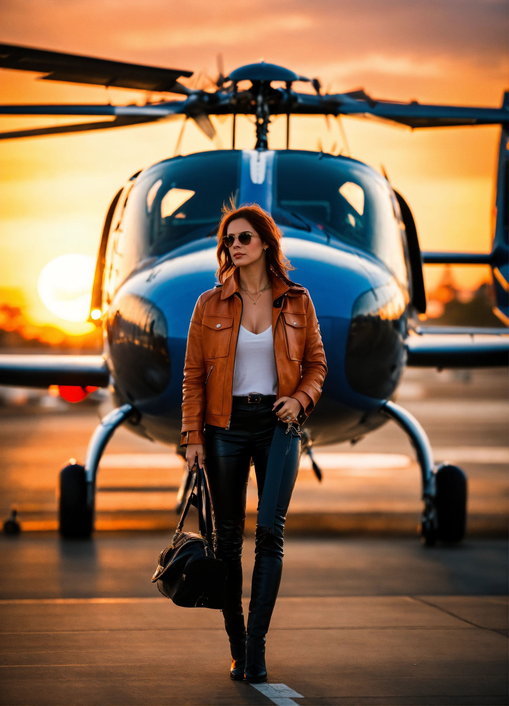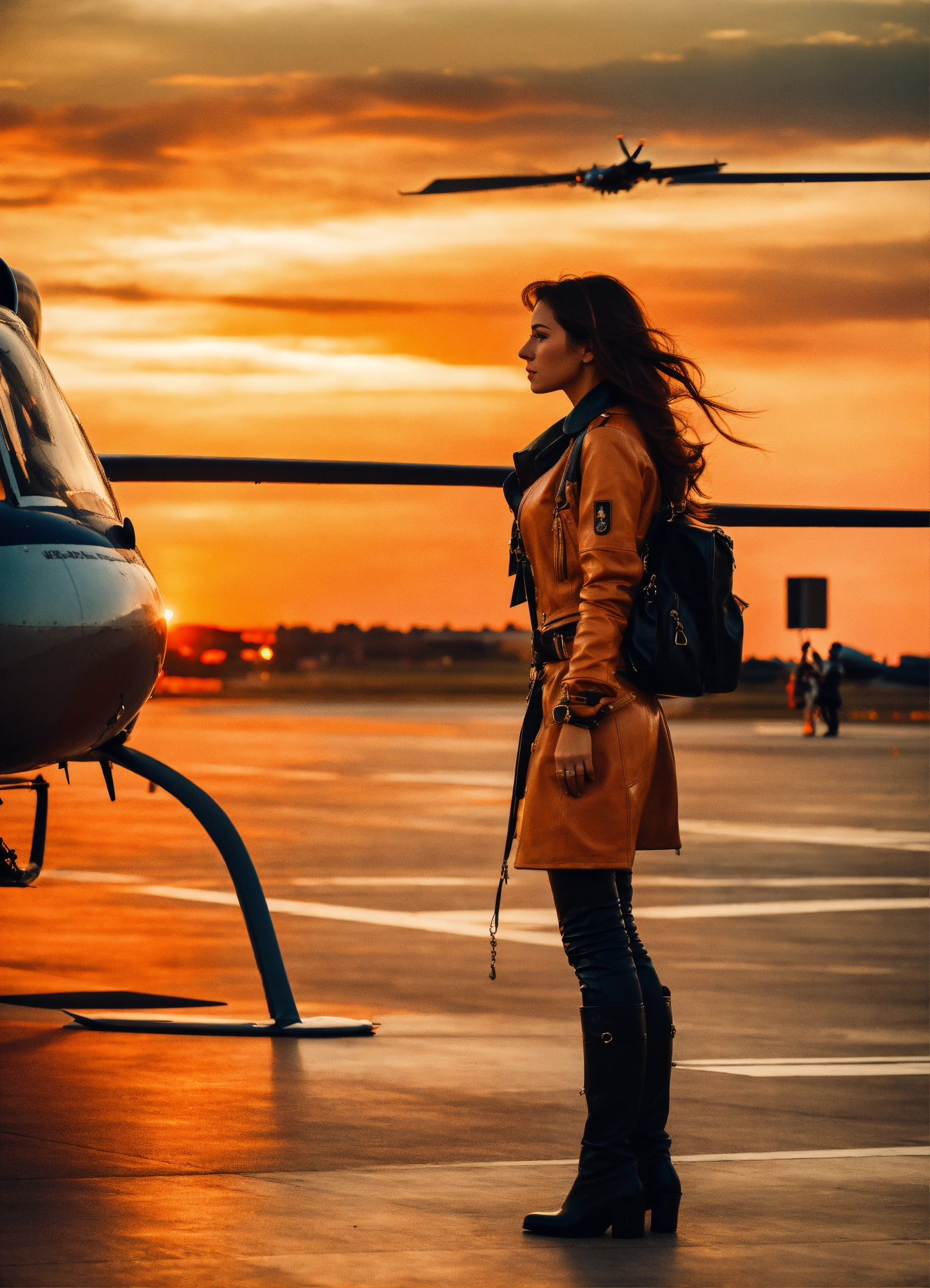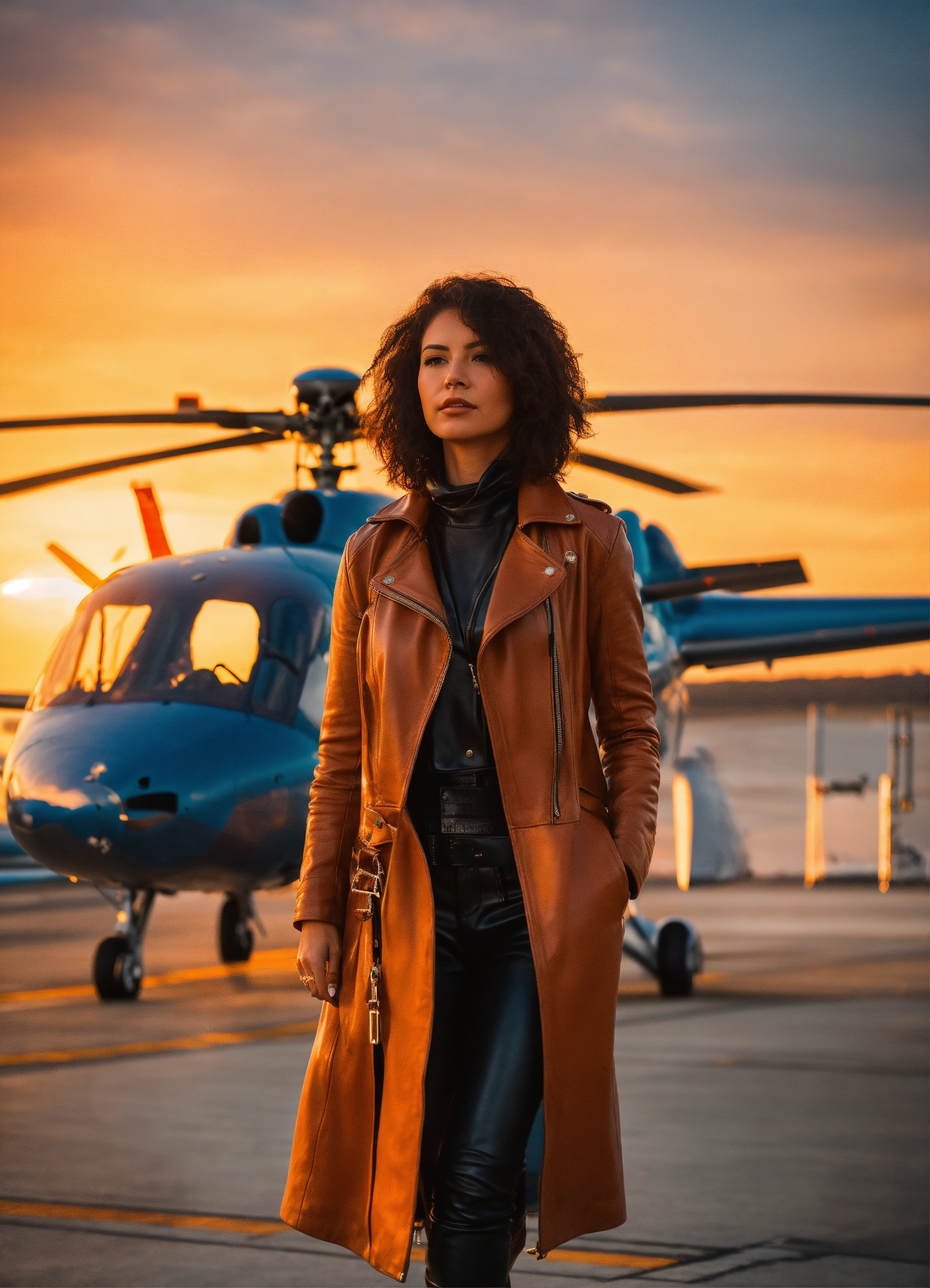 In an airport, you can see planes in the background, a woman dressed in leather, getting on a helicopter while looking at the camera, let it be a soft sunset, an orange light combined with blue