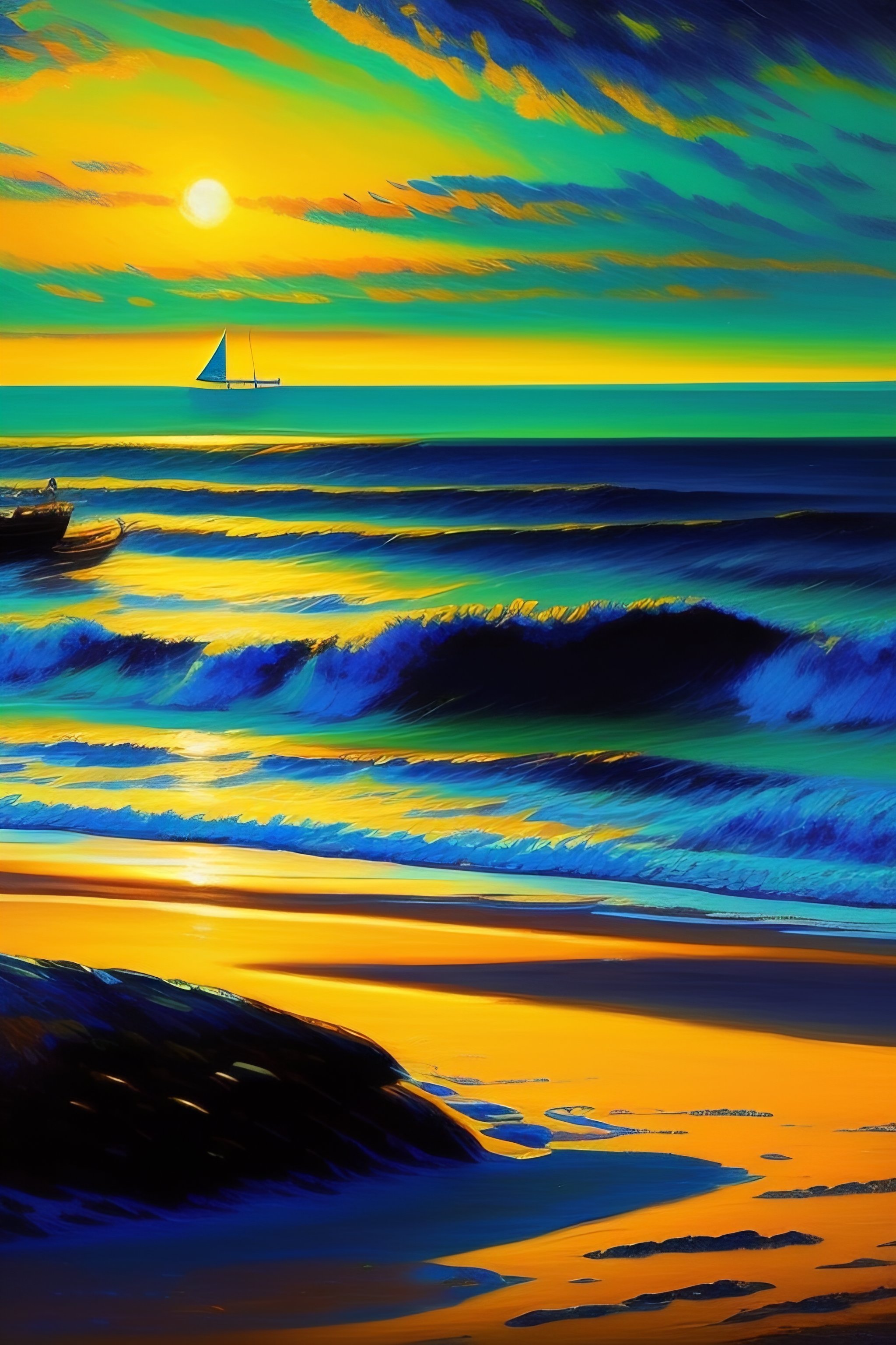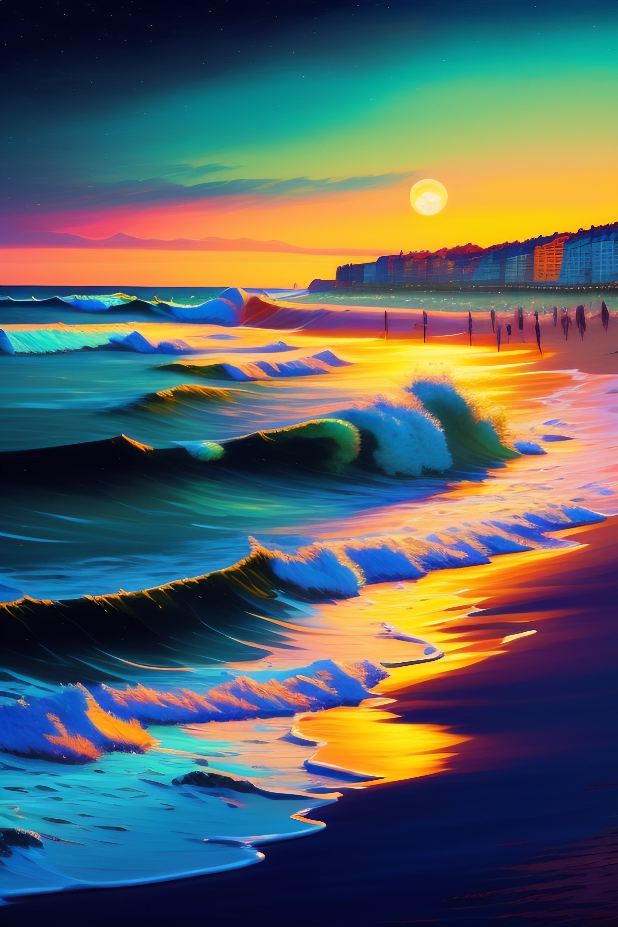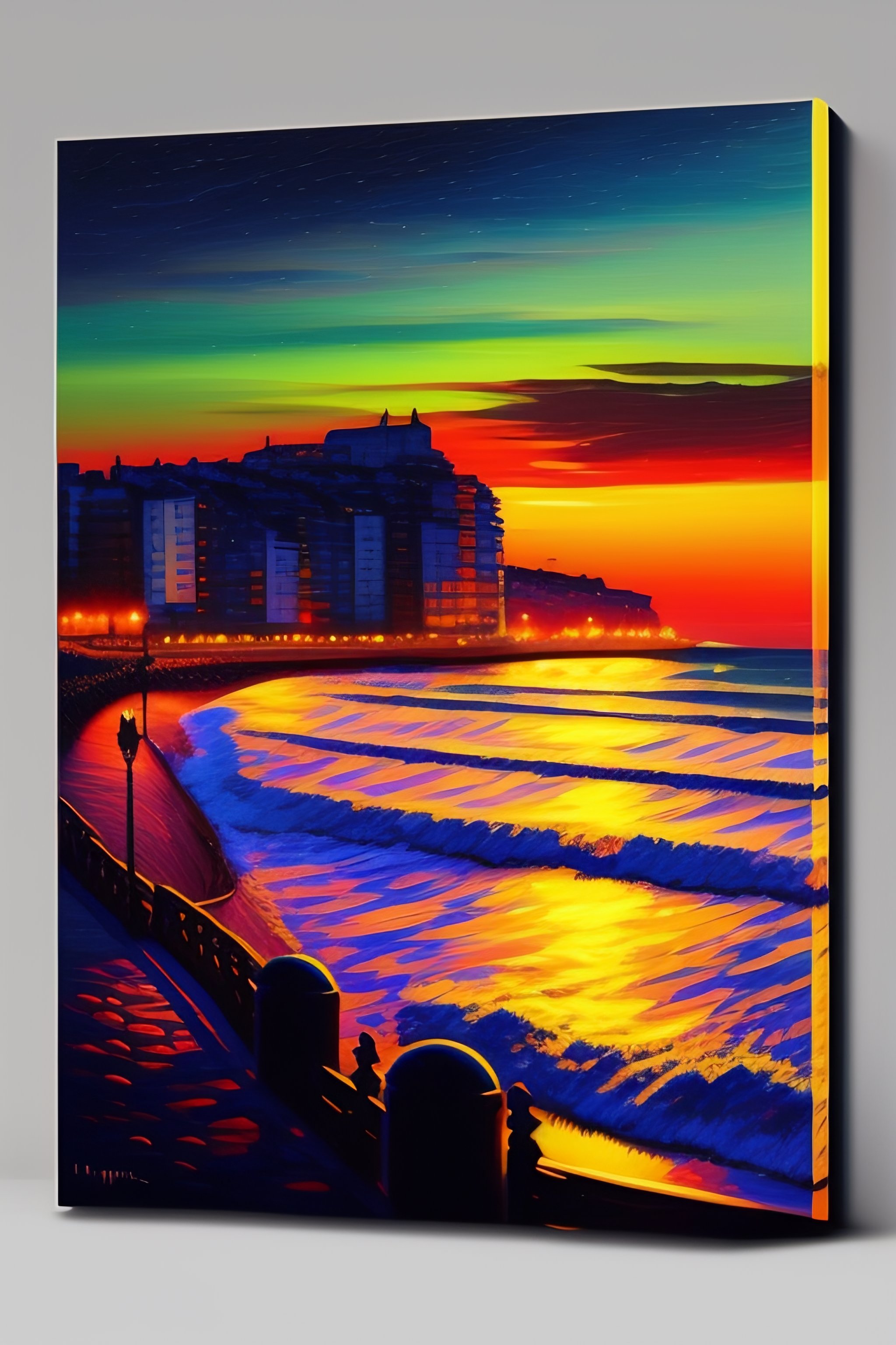 A sublime landscape of gijon city beach at night, on the style of monet and van gogh, trending on art station, award winning, hq, 1080p