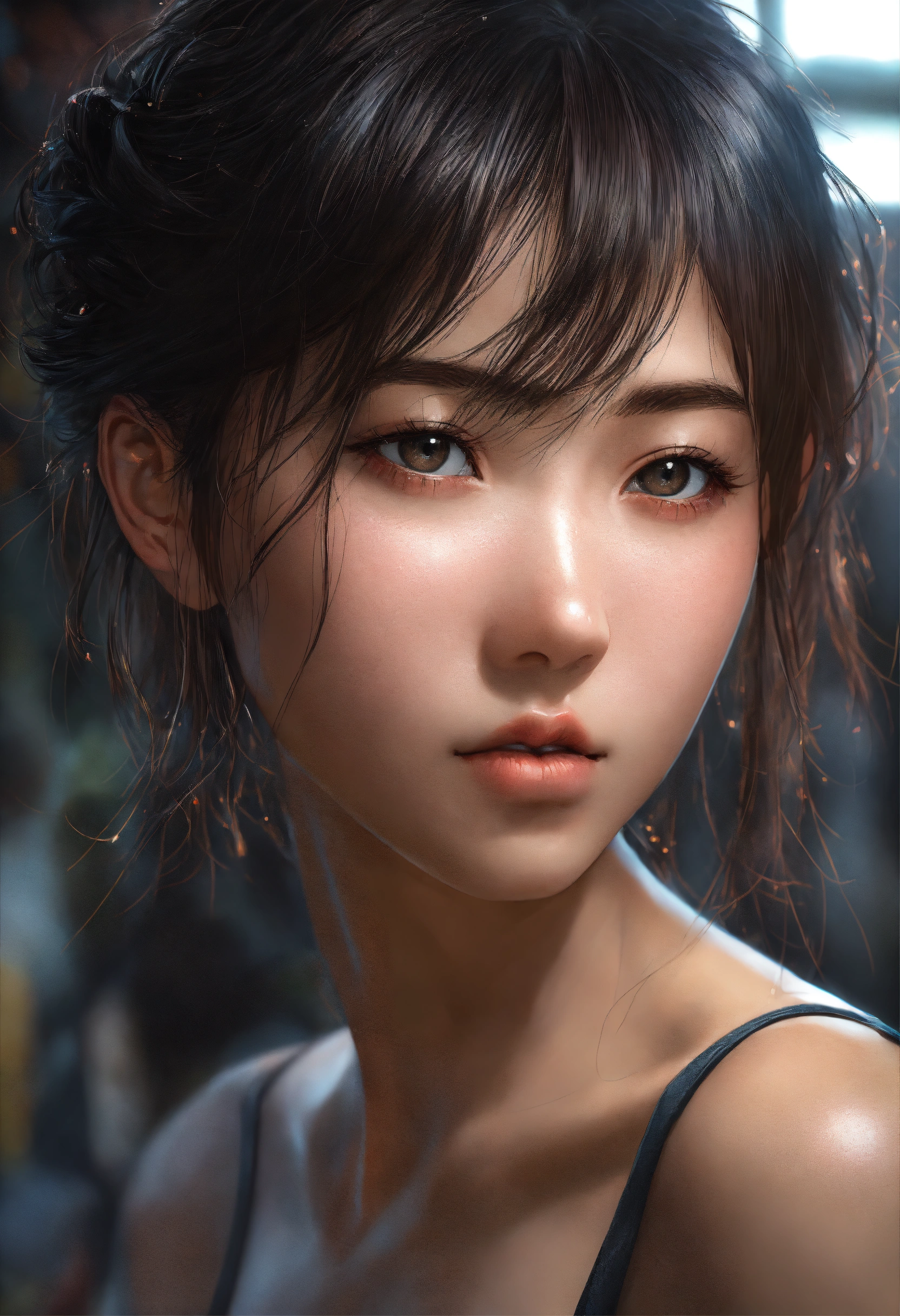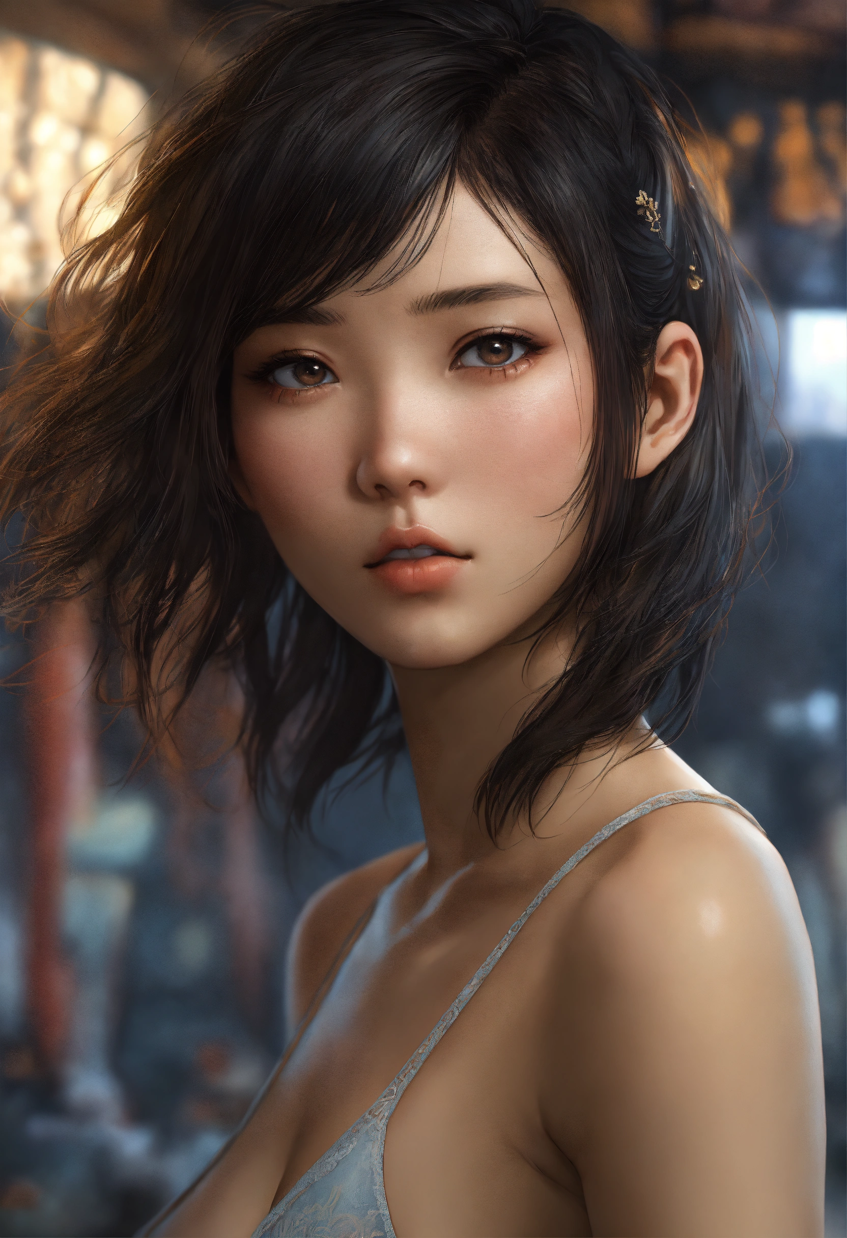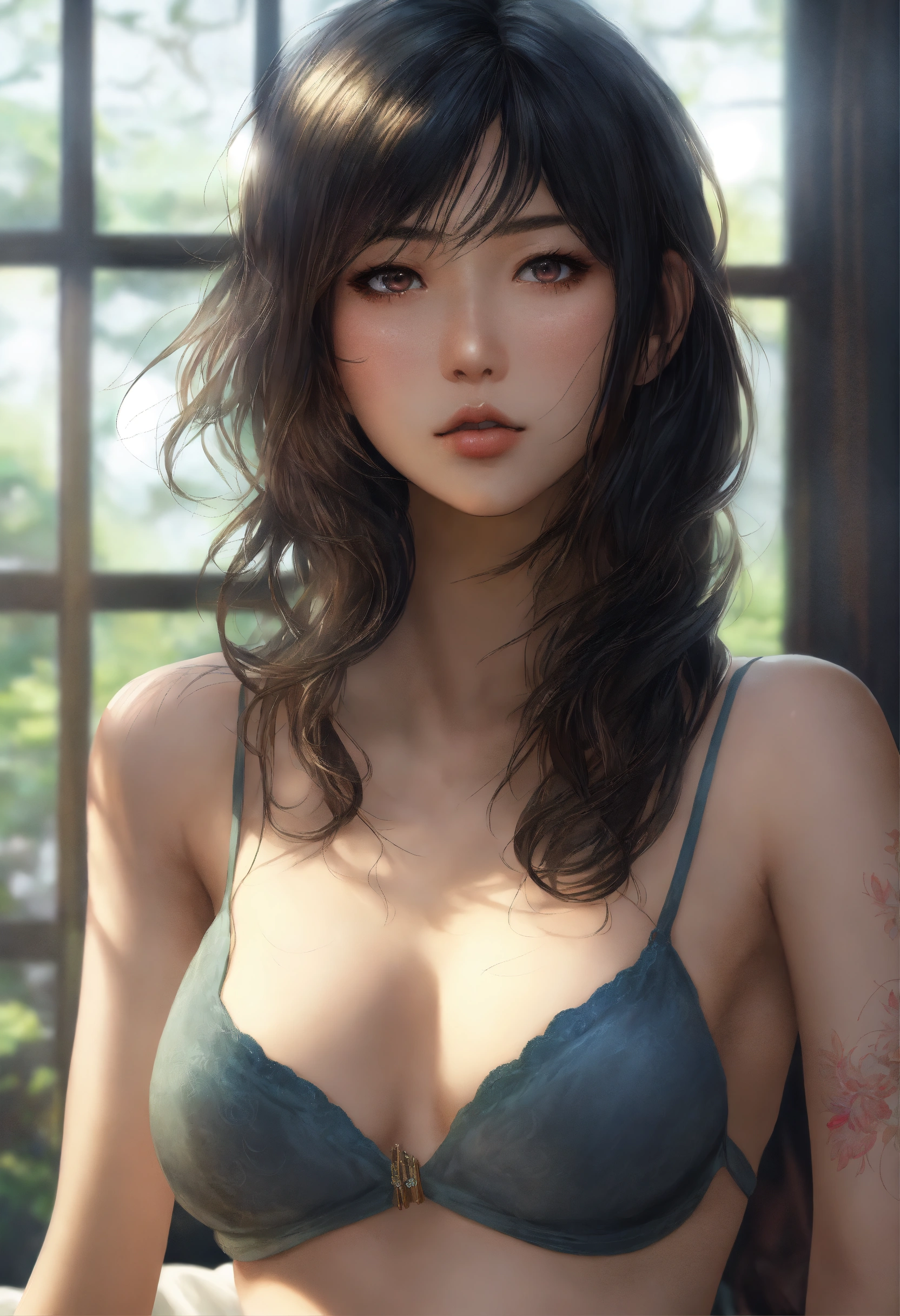 A beautiful asian girl, soft skin, messy hair, thin legs, black bra, monet range murata artgerm katsuhiro otomo, highly detailed intricately sharp focus, bedroom eyes trending on pinterest vogue italia unreal engine 5, 4 k uhd image