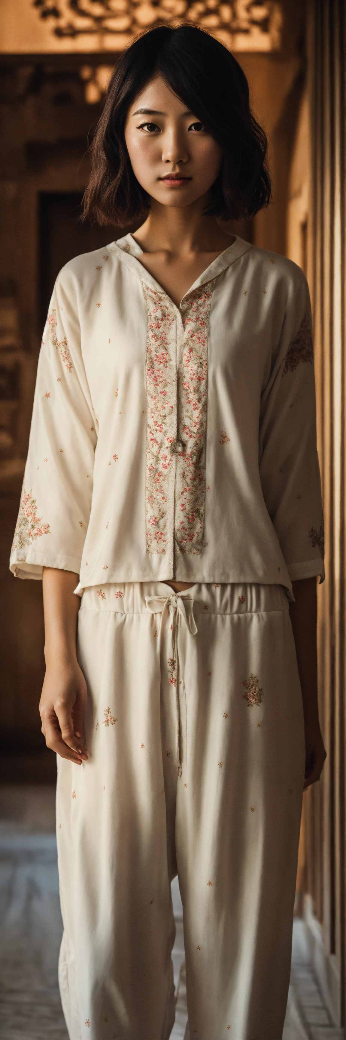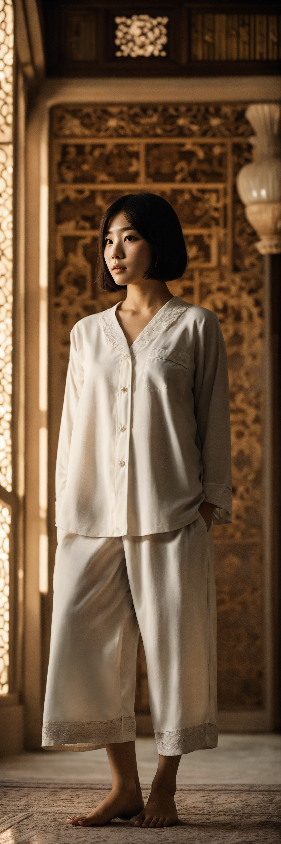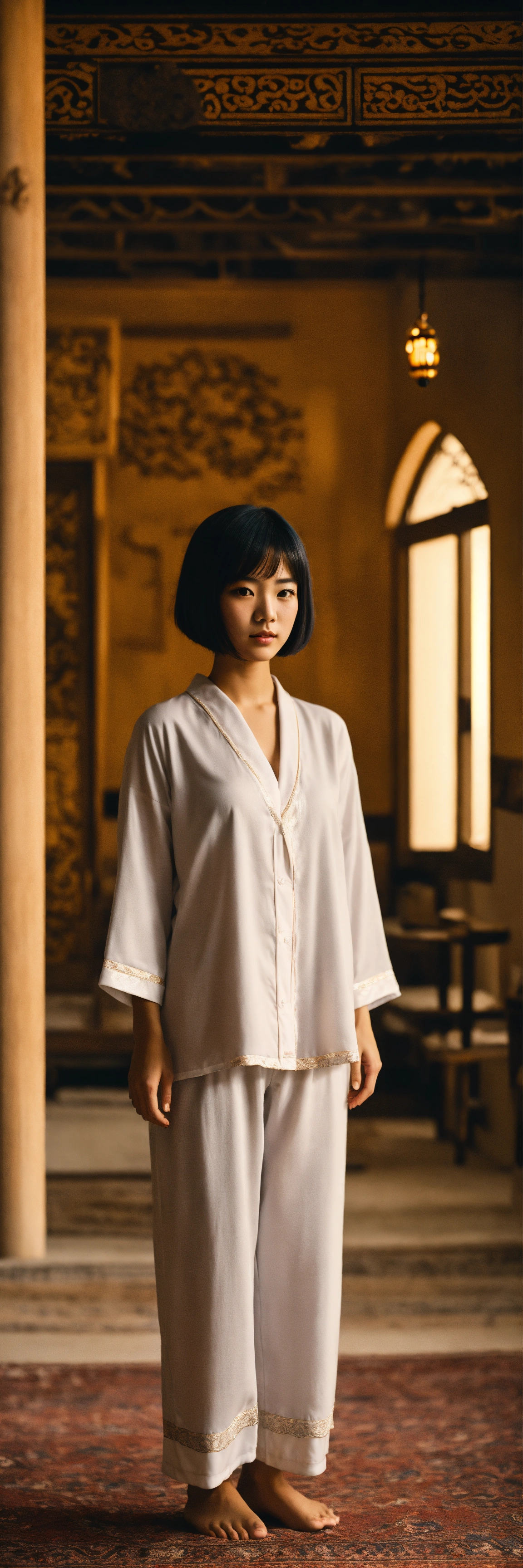 Portrait of an extremely beautiful japanese schoolgirl with bob cut hair, wearing white short european pajamas, standing in a vintage house in yazd with neutral tones, highly detailed, 32k resolution, cinematic lighting, dramatic lighting, vertical shot, iranian architecture, persian culture background.