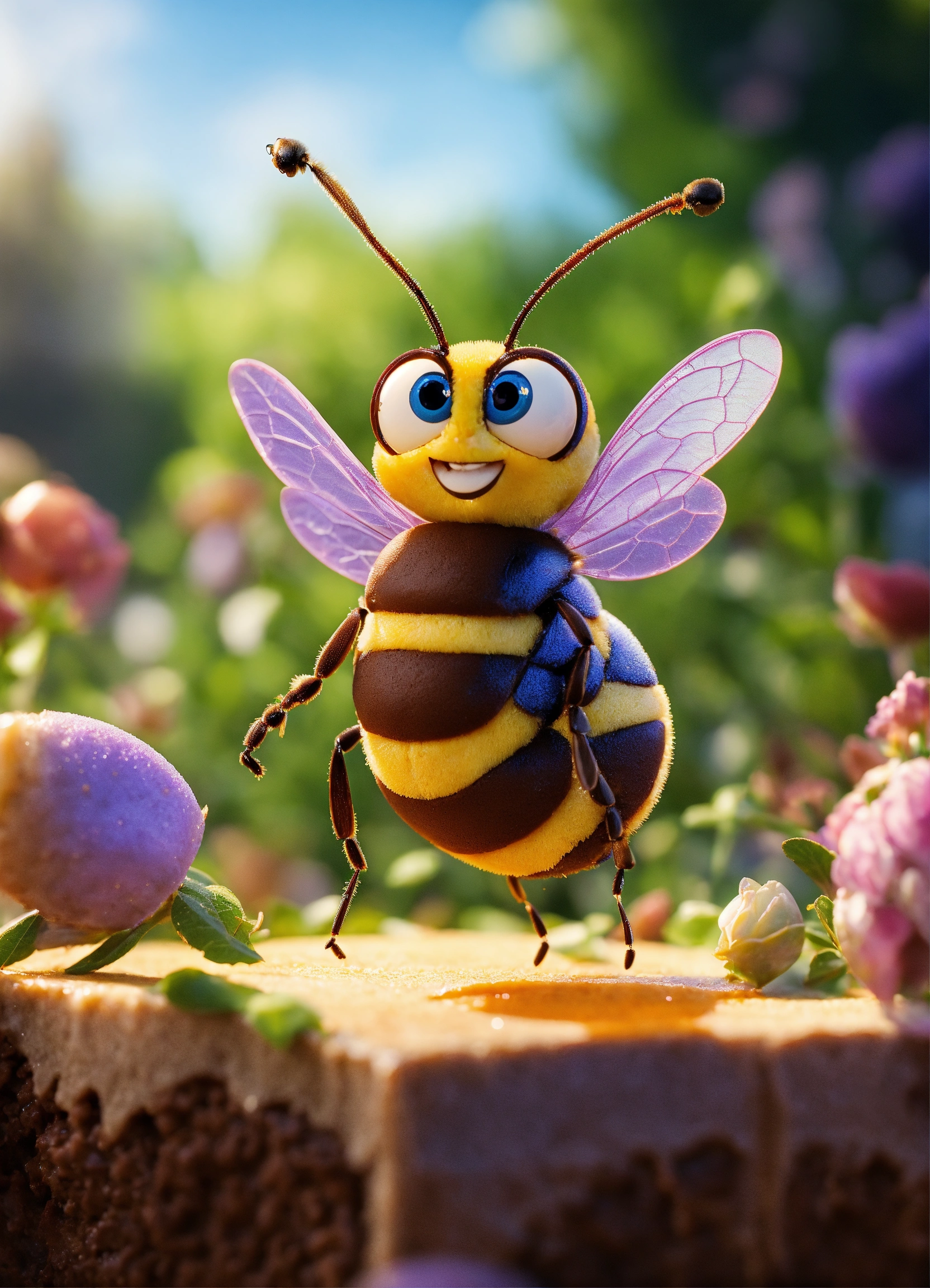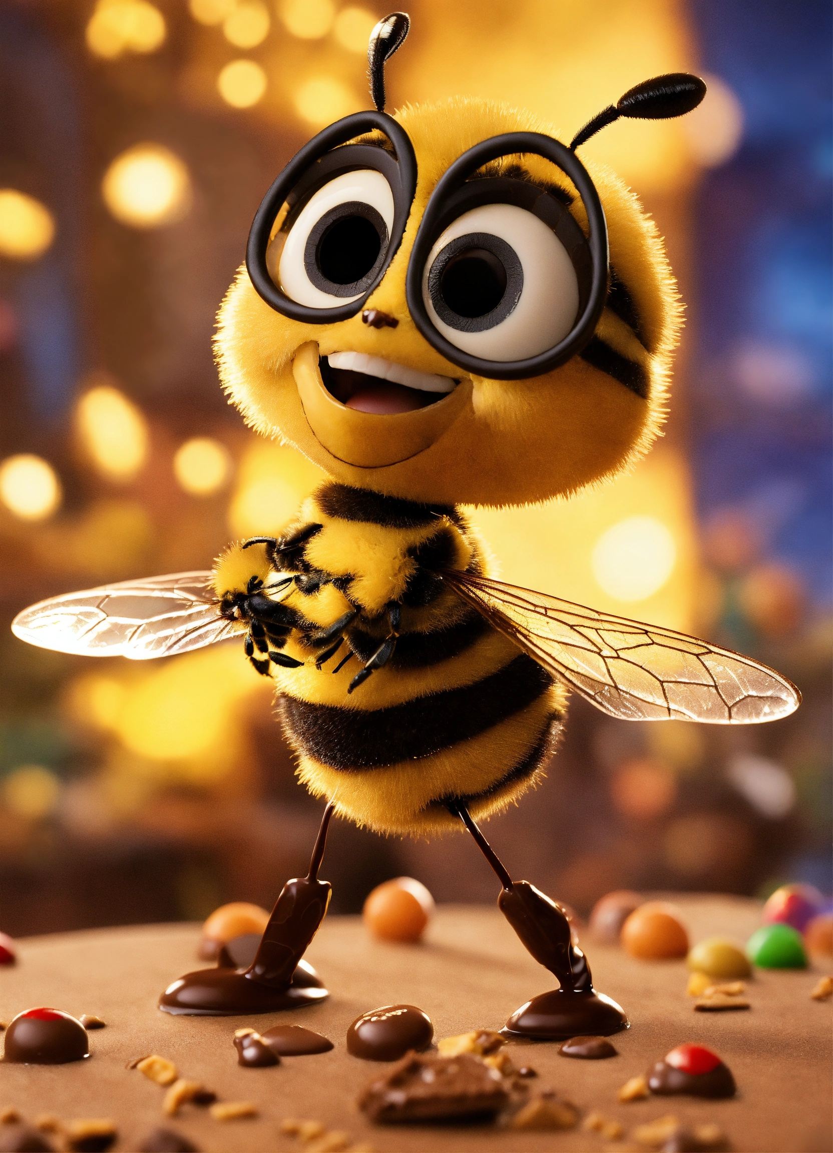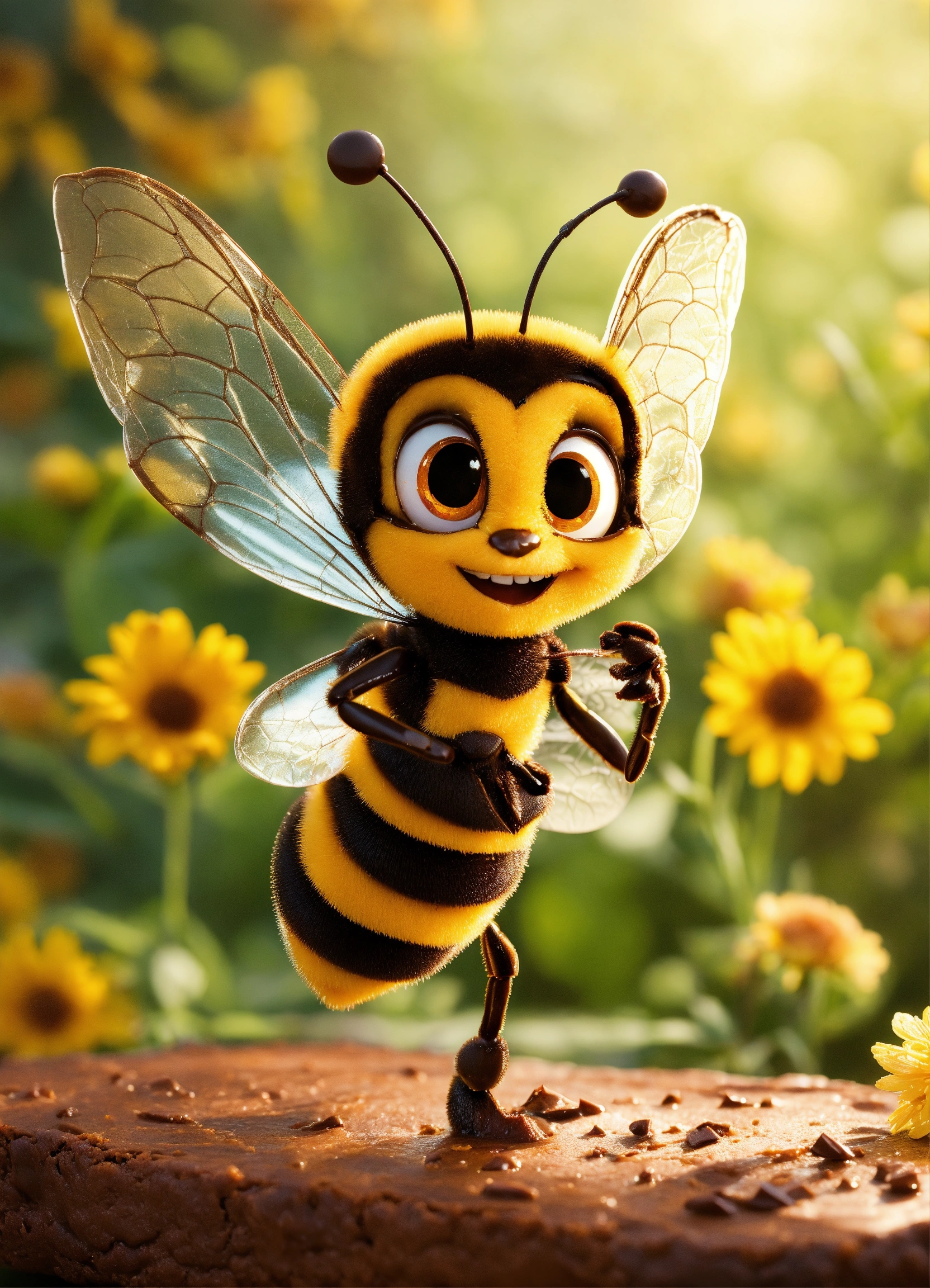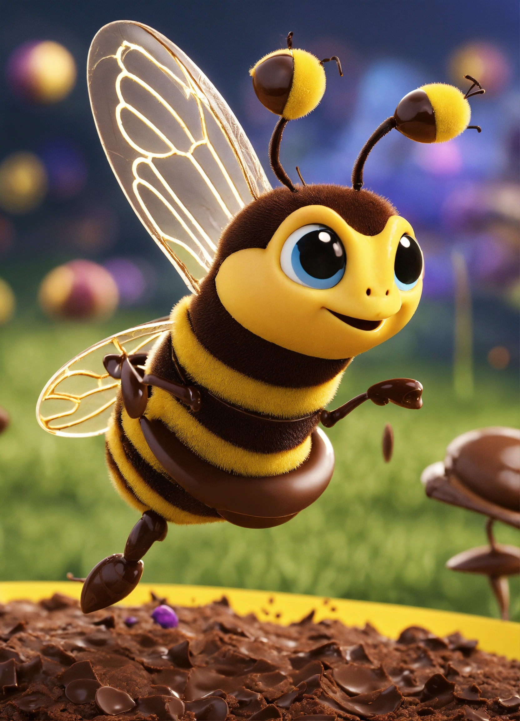 A 3d full body pixar bee dressing sports closed flying up a beautiful brownie of chocolate the lighting must highlight the action and the image must be captured using a sony alpha a9 ii camera with a sony fe 24-lens 70mm f/2.8 gm to ensure excellent detail and realistic photo quality, 8k, cmyk + --s 900 --style raw --ar 169