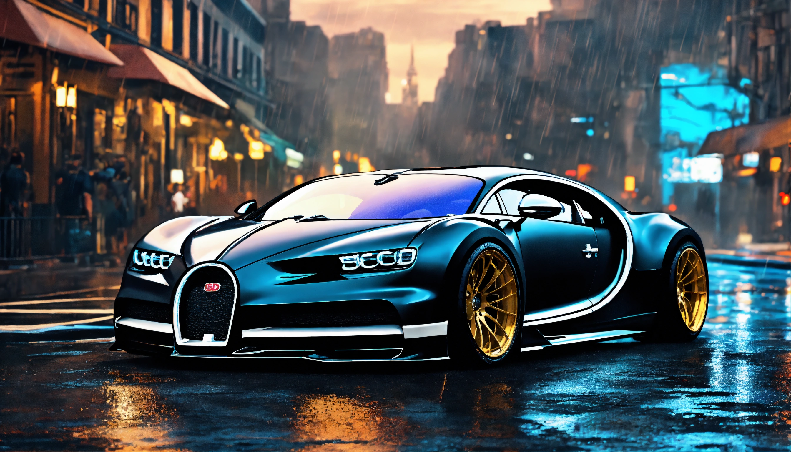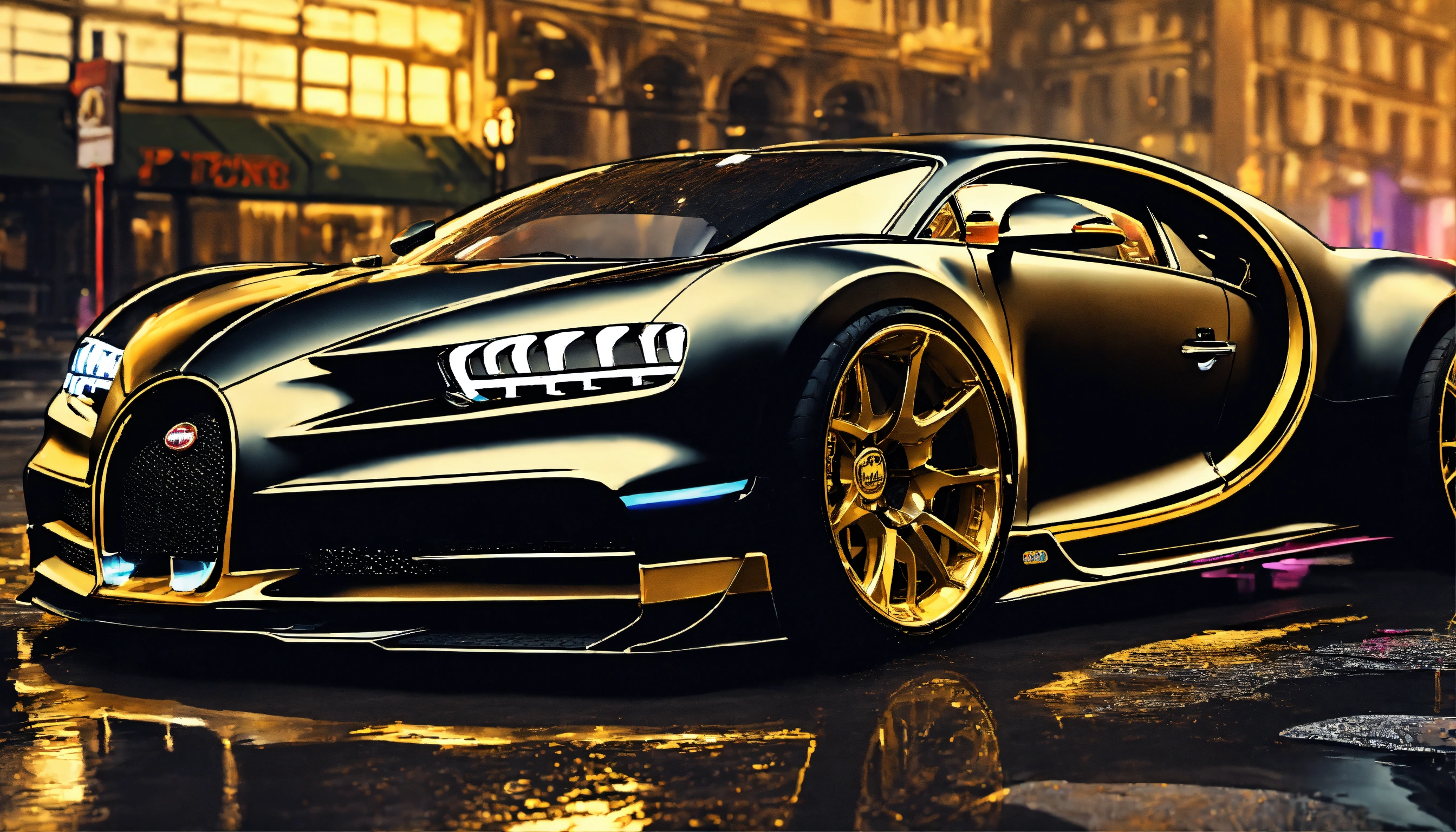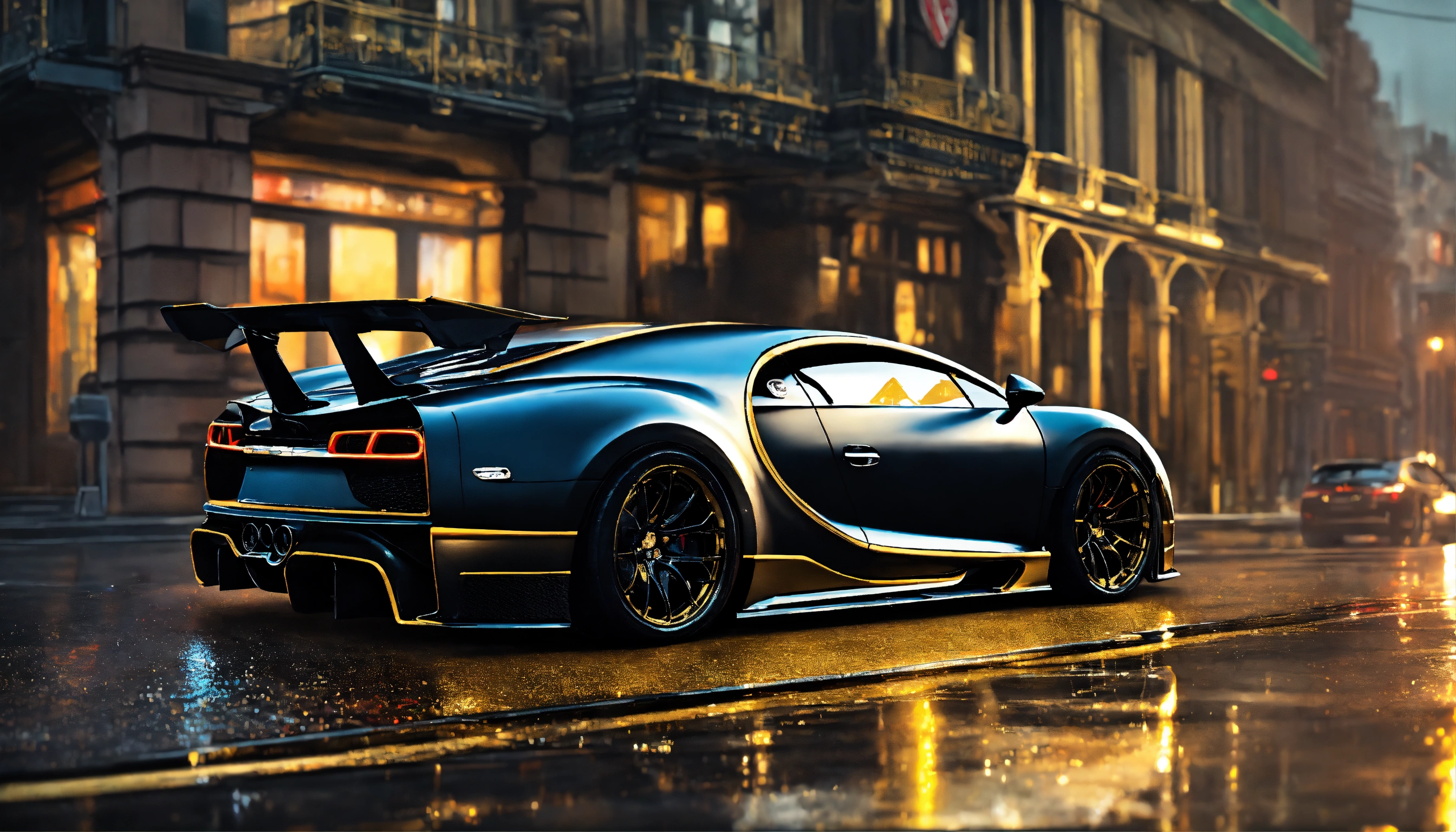 Motion art, matte black with gold details, highly realistic liberty walk tuning super widebody bugatti chiron, very intricate details, elegant, sharp edges, heavy rain, dark medievil city background, low saturation colors, highly detailed