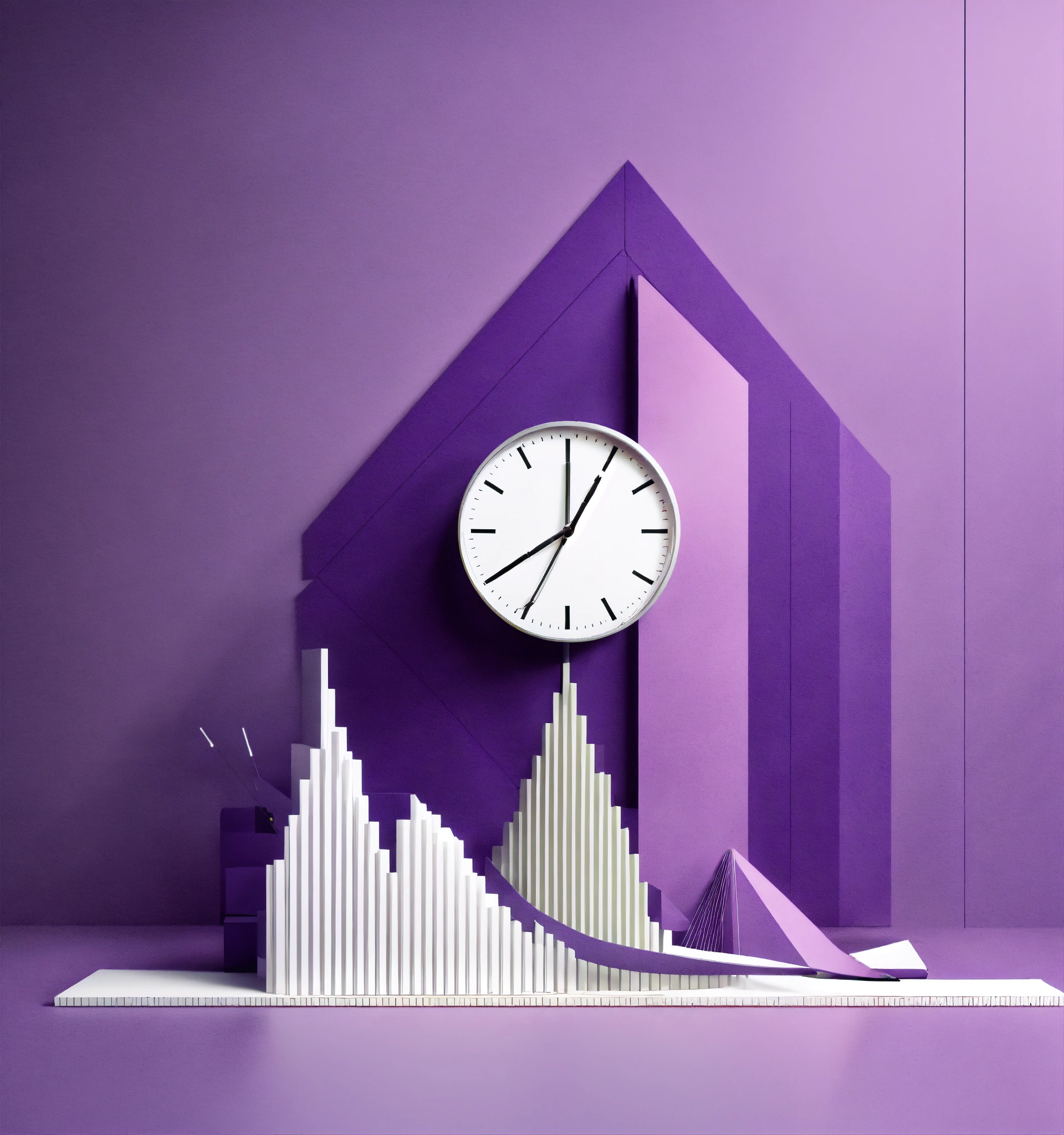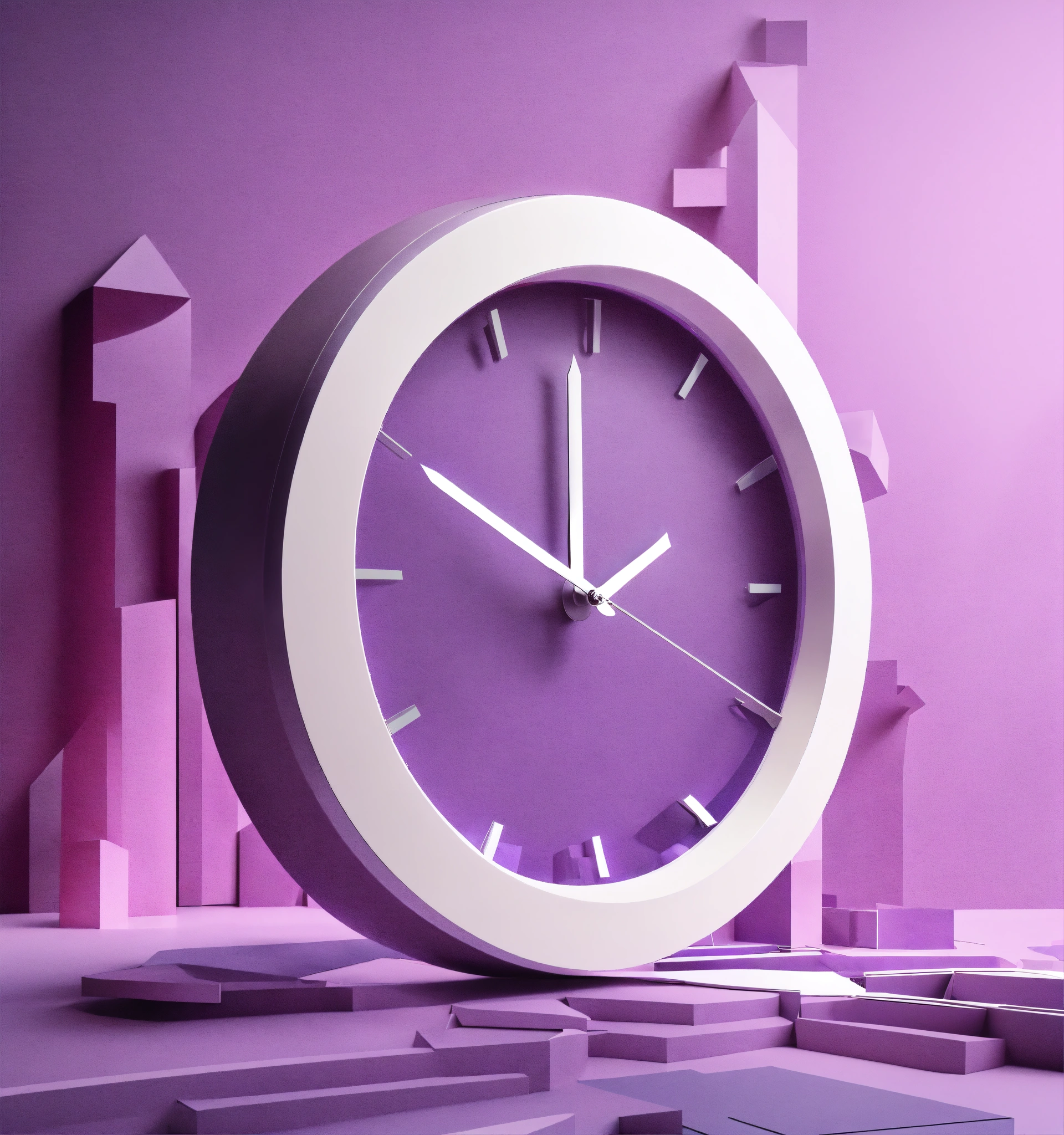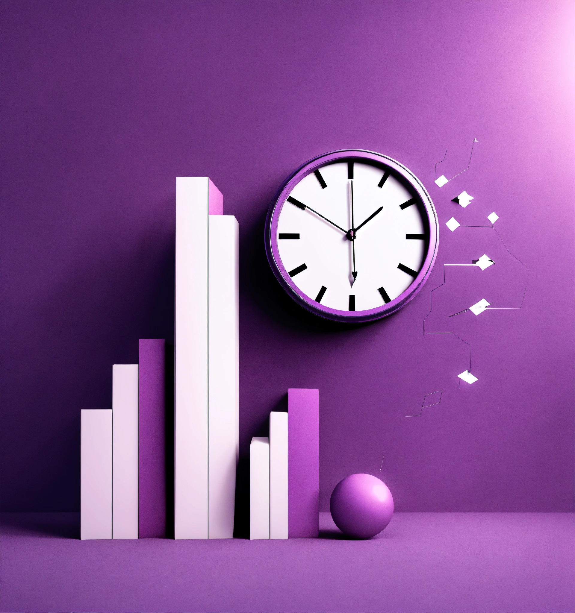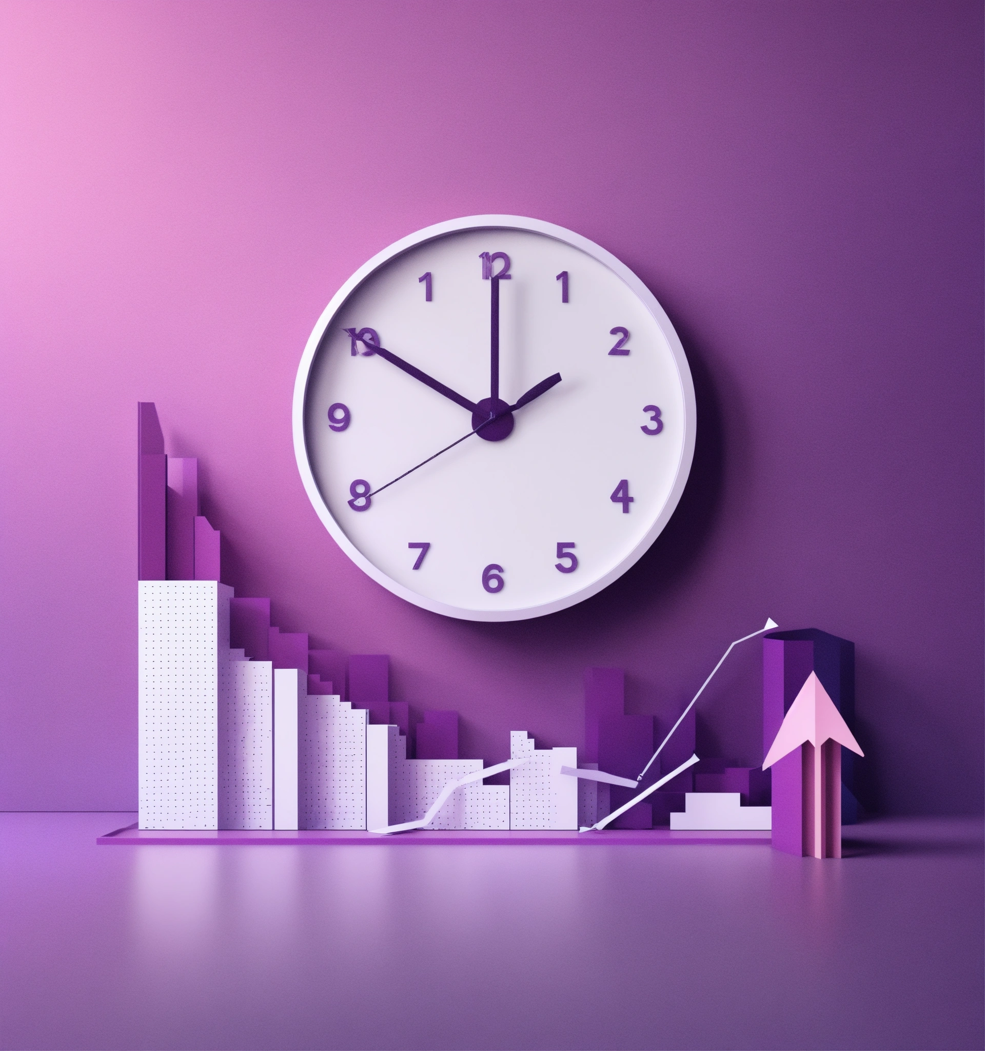 3d illustration of an arrow going up, increasing graph, and a round clock, minimalist elegant, purple and white tones