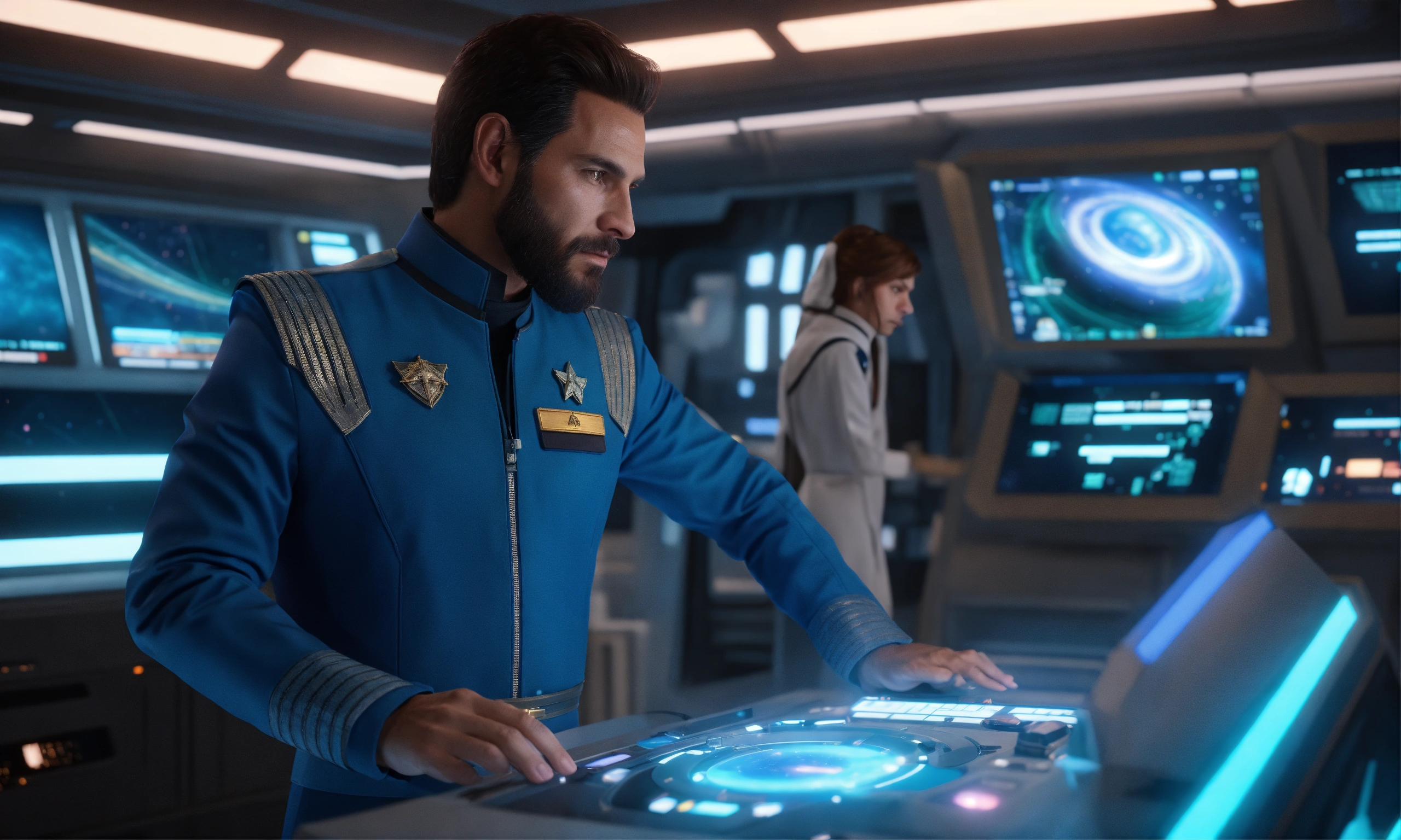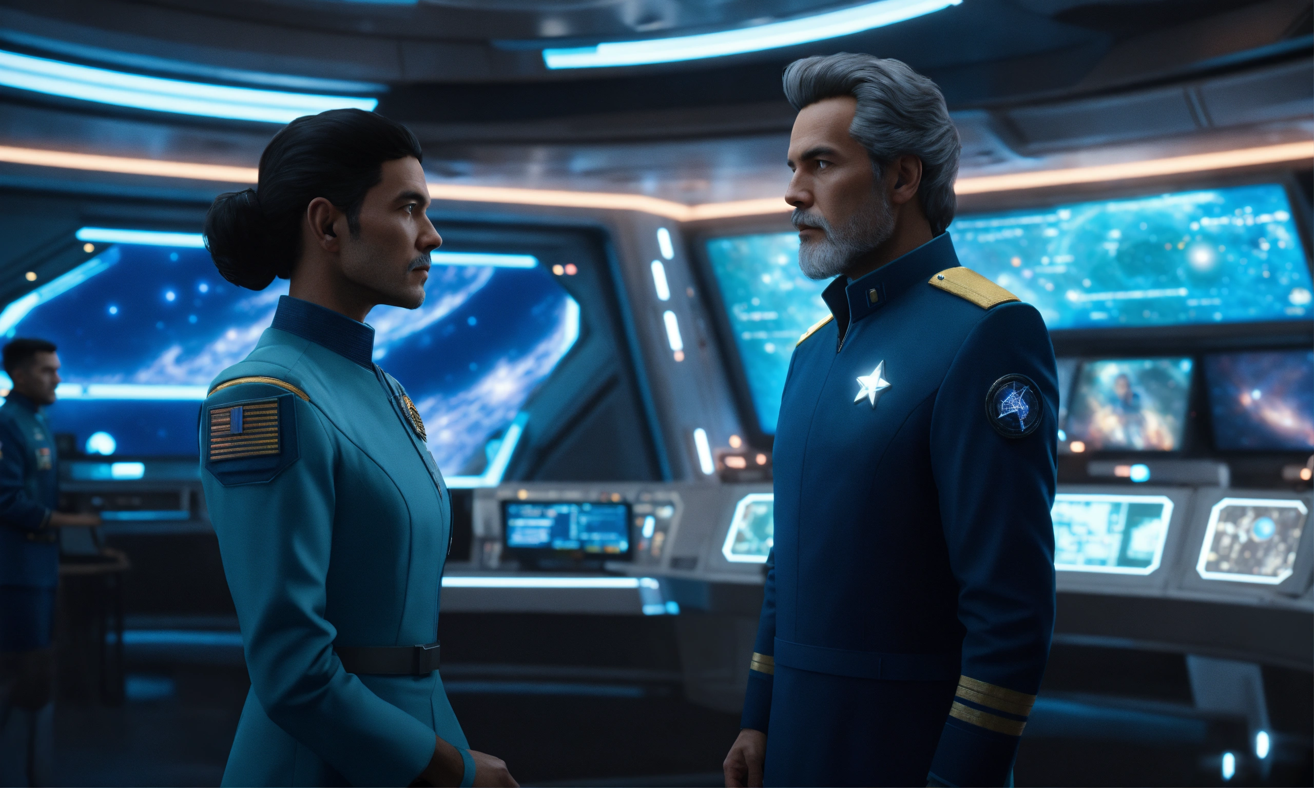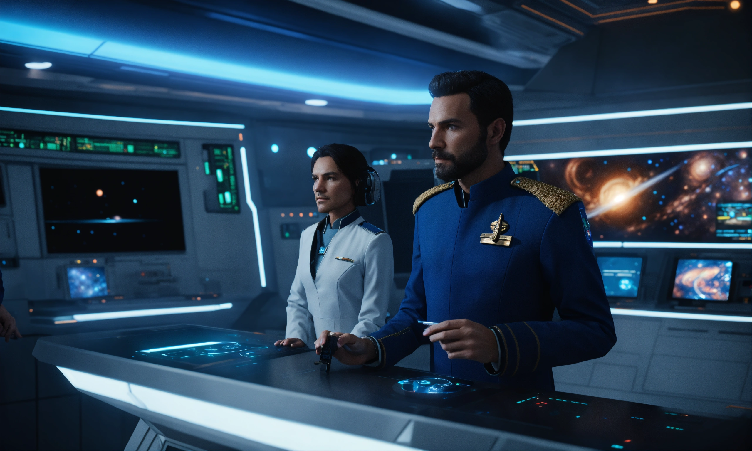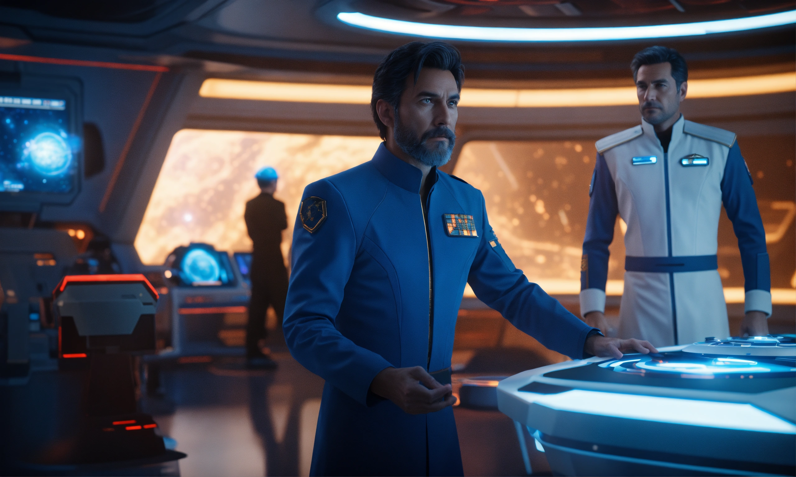 Rugged and scruffy galactic federation general standing at the command center controls in star fleet uniform on a white futuristic mothership next to a charming dark haired doctor in blue uniform shows him a hologram of a planet, realistic, unreal engine, sci-fi