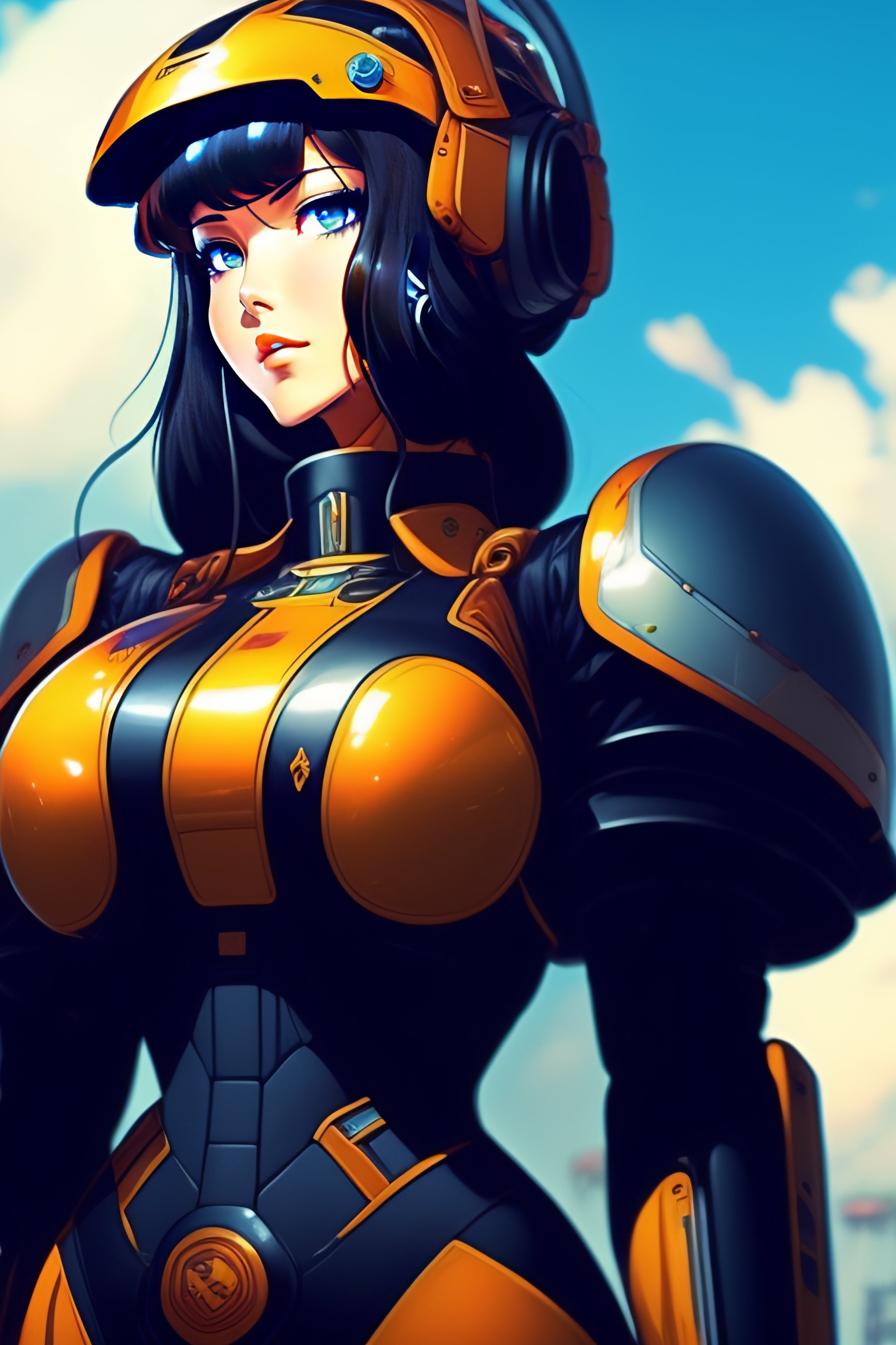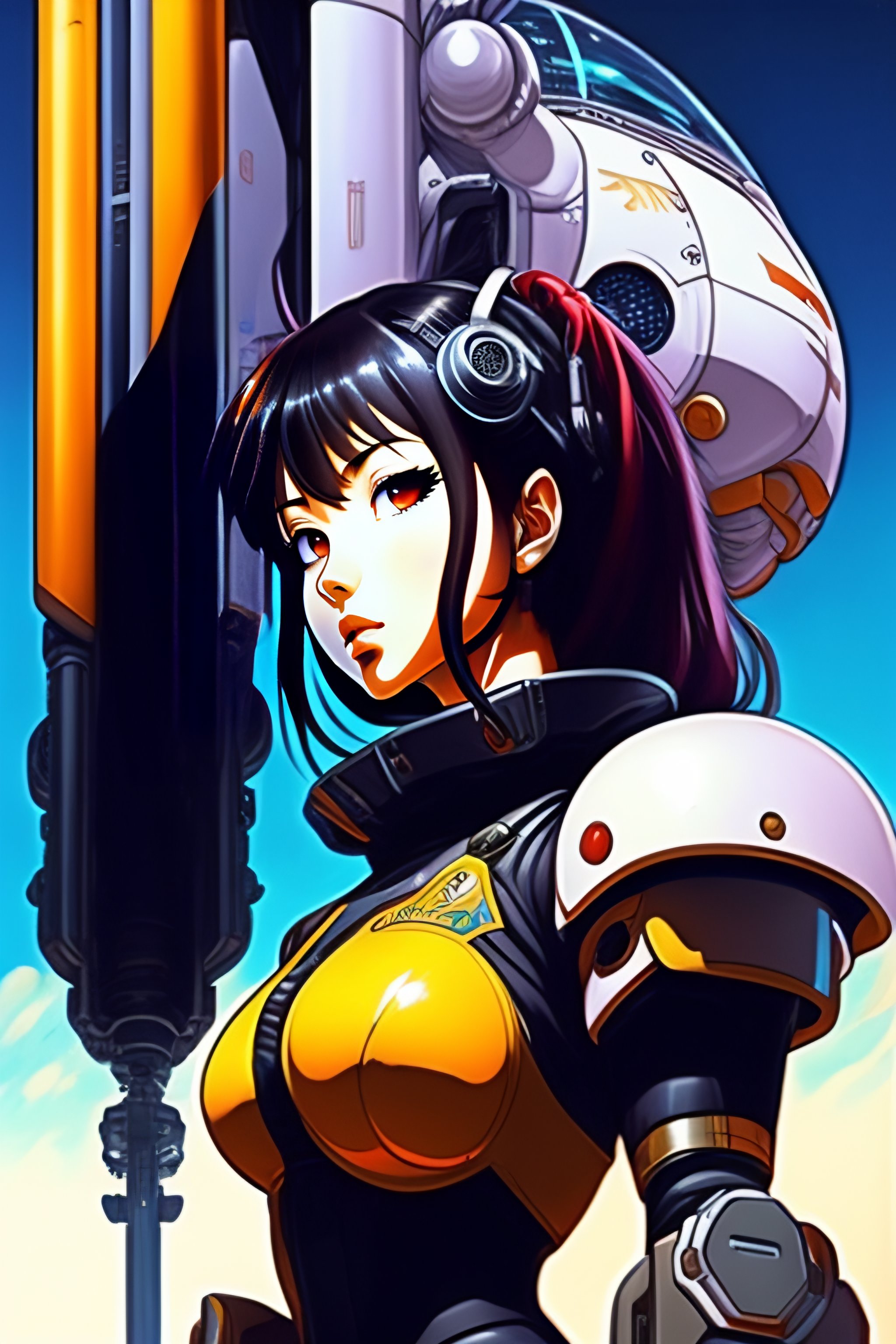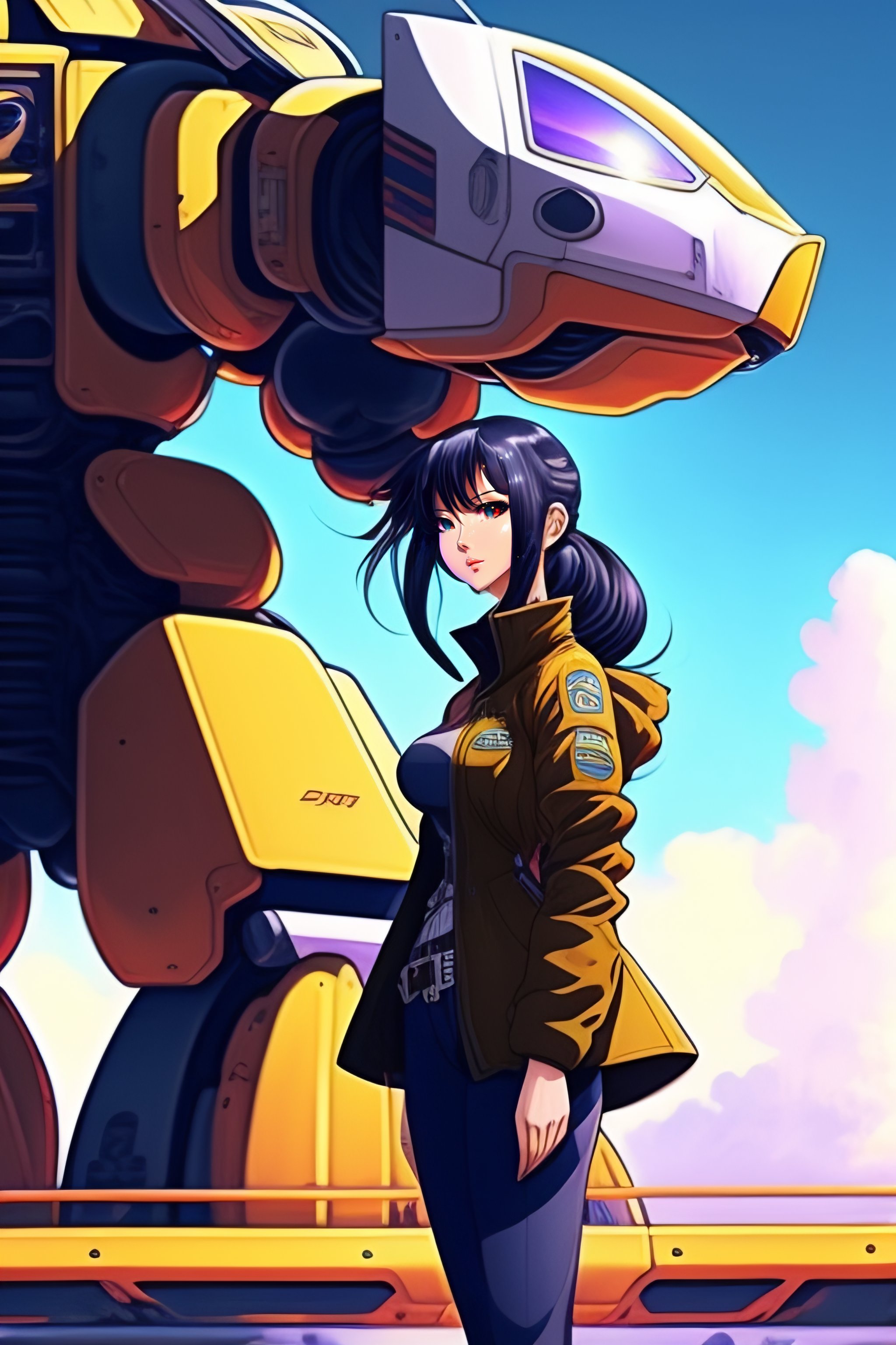 A woman standing next to a giant robot, concept art by masamune shirow, featured on pixiv, serial art, official art, toonami, anime aesthetic