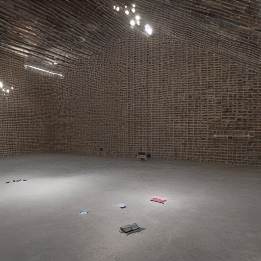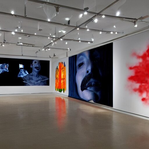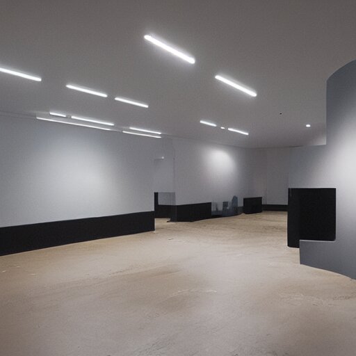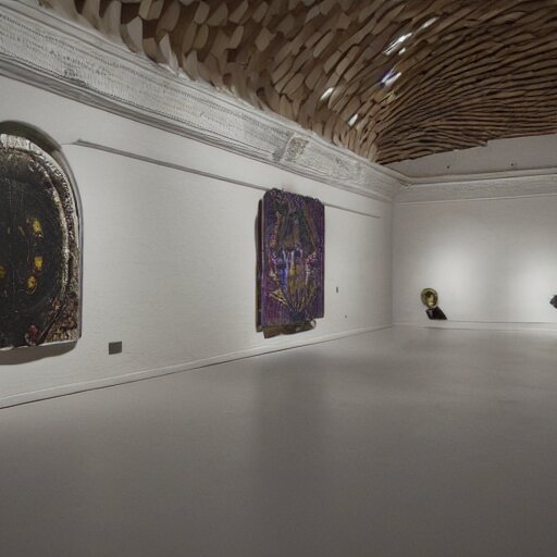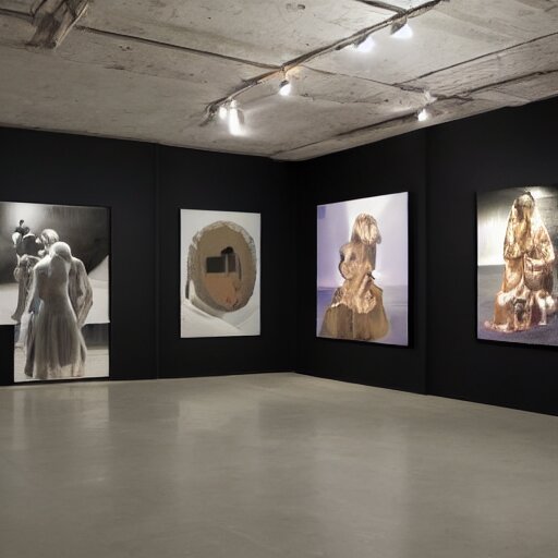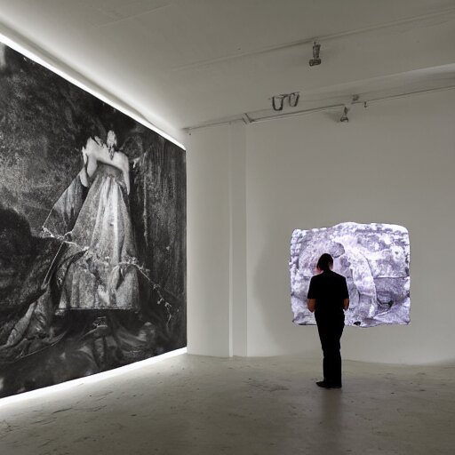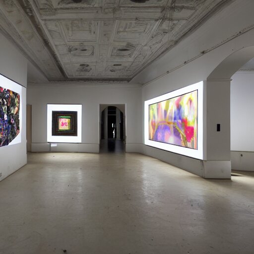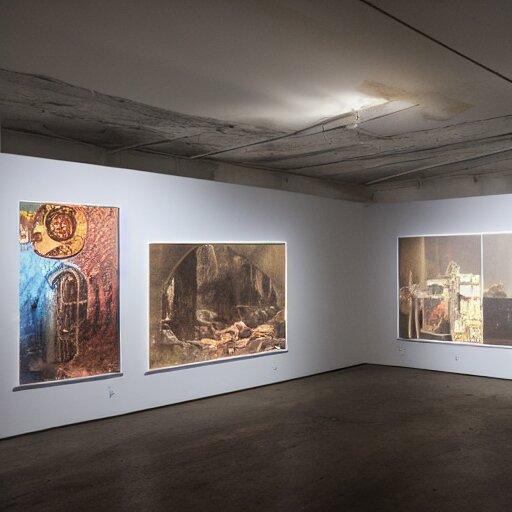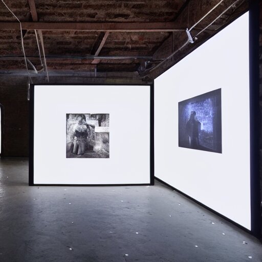Photo, gallery view: site specific installation, projectors, bricollage, on the meaning and status of relics, avantgarde, volumetric lighting, photorealistic
